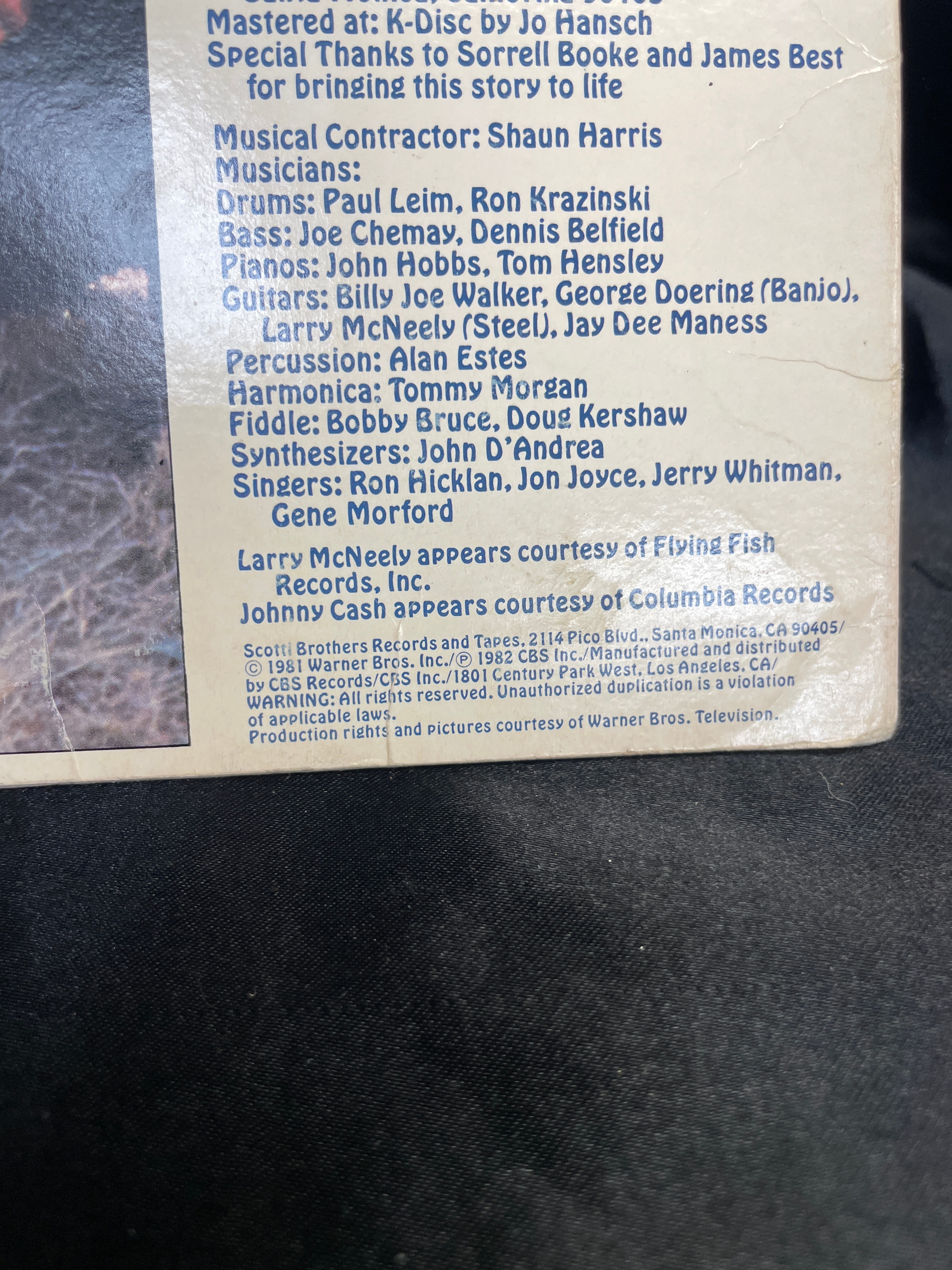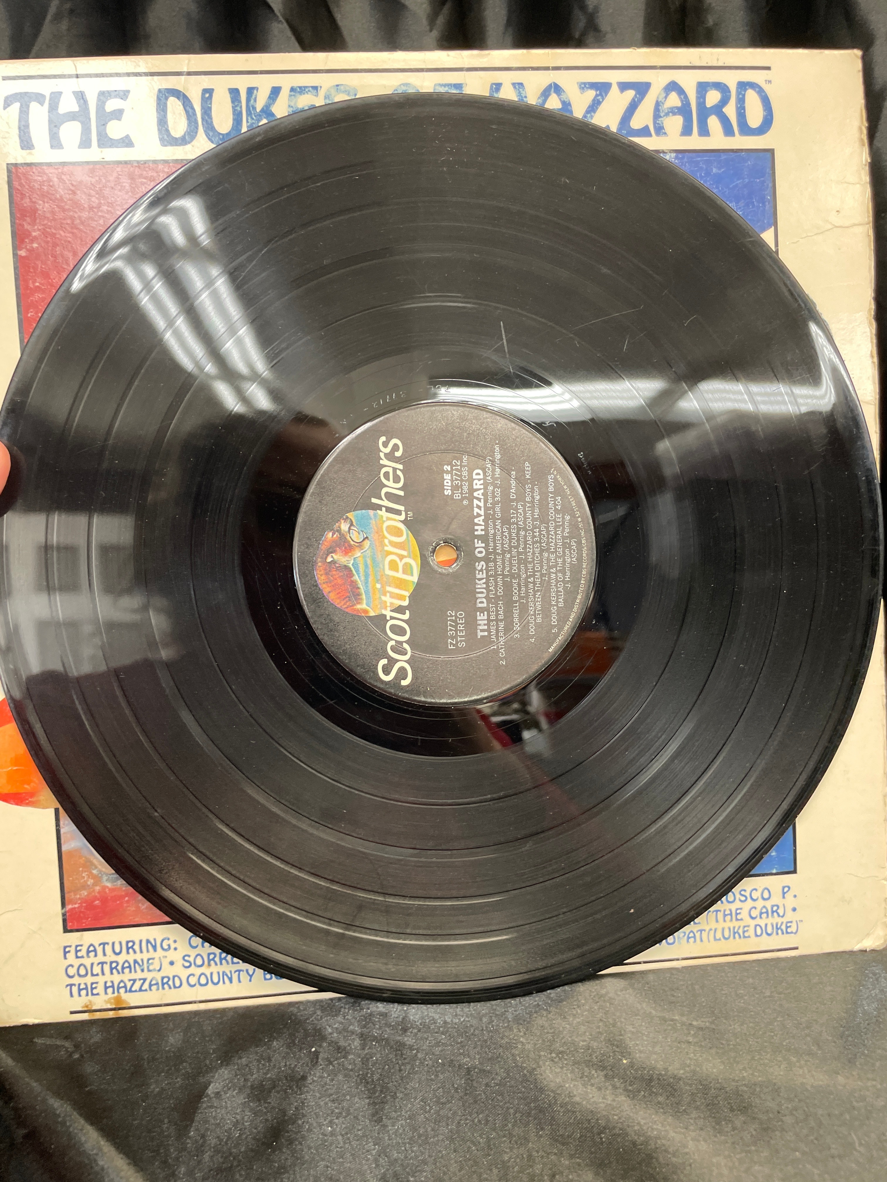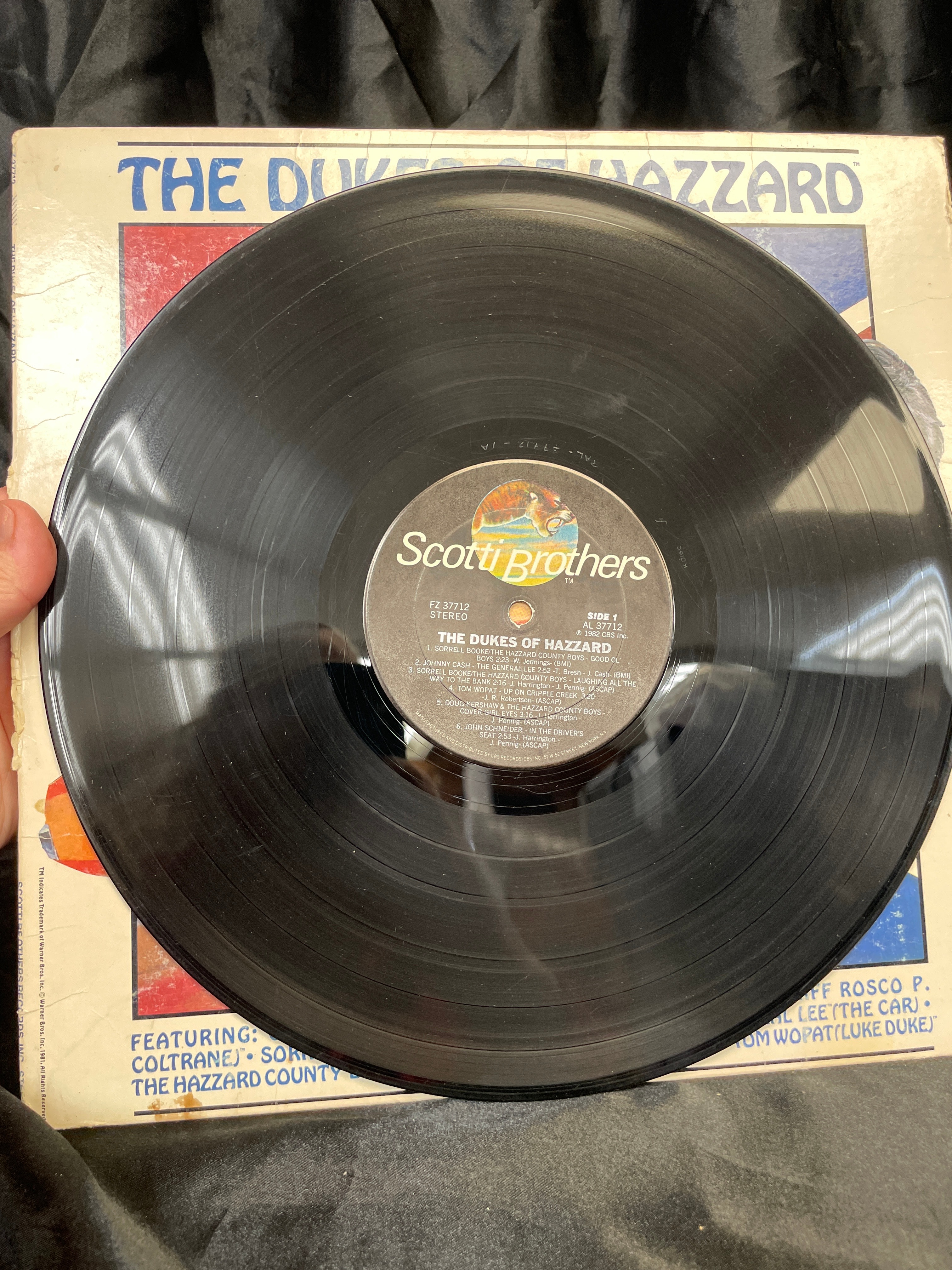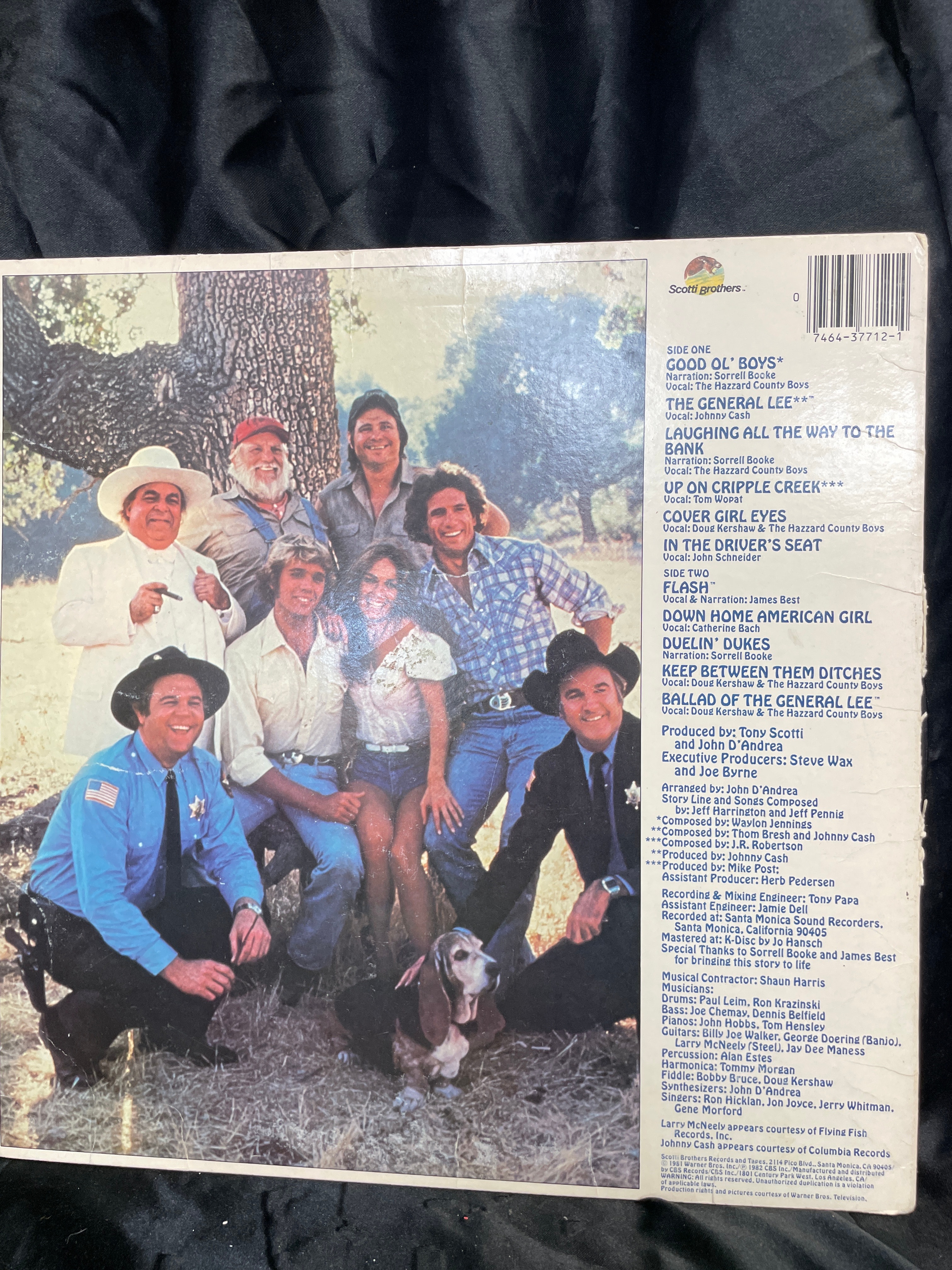 A vintage vinyl record album, “THE DUKES OF HAZZARD Original Television Soundtrack,” released in 1982 by Scotti Brothers Records and Warner Bros. Inc. The cardboard gatefold sleeve features colorful illustrations on the front, depicting main cast members Catherine Bach, James Best, Sorrell Booke, John Schneider, and Tom Wopat, alongside the iconic “General Lee” car, set against an American flag backdrop. The back cover presents a group photo of the cast, a full tracklist, and production credits, with a barcode in the upper right. The black vinyl record inside has “Scotti Brothers” labels, indicating “FZ 37712 STEREO” and “THE DUKES OF HAZZARD.”