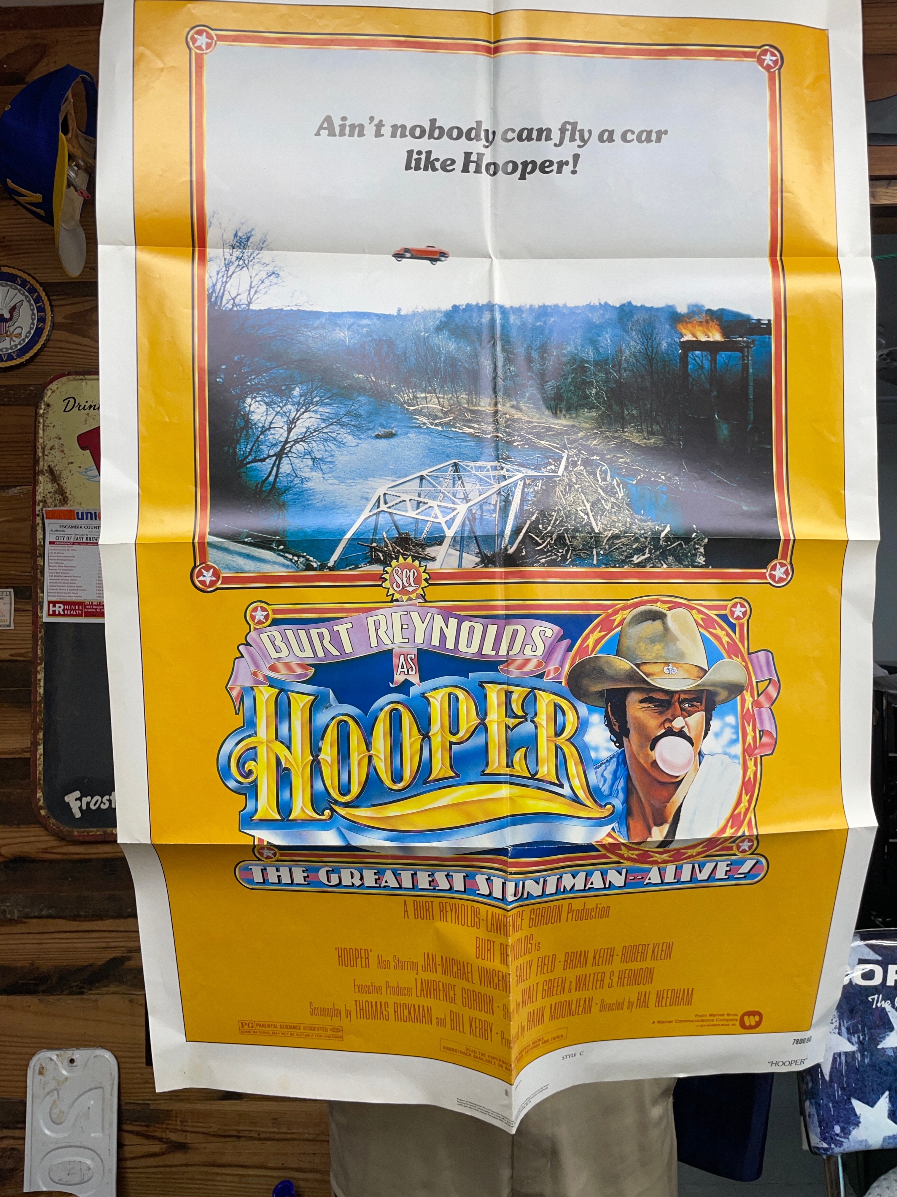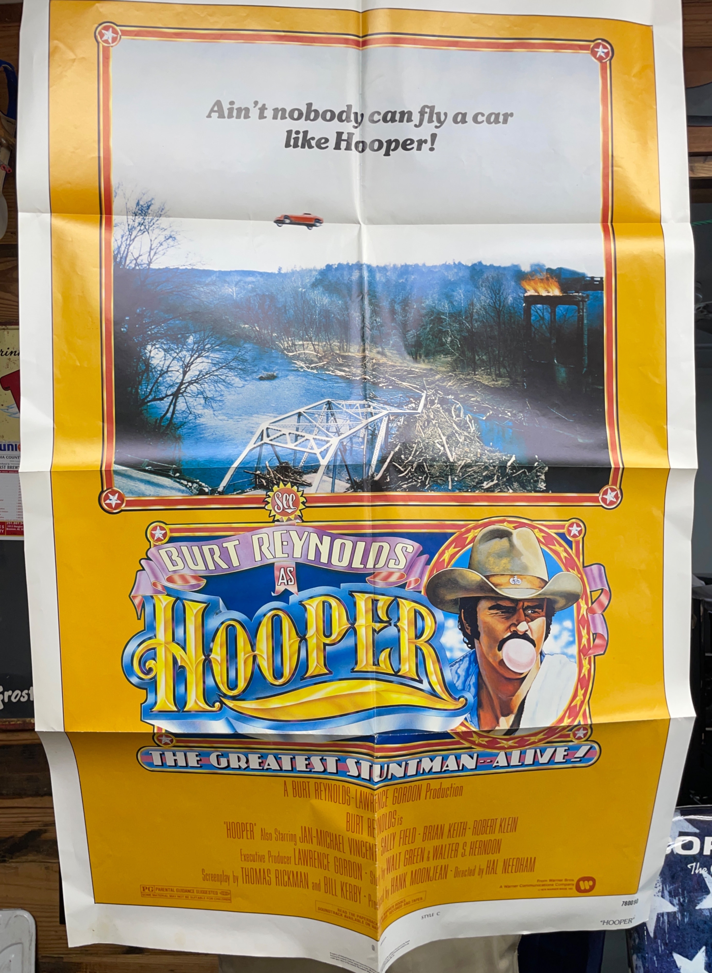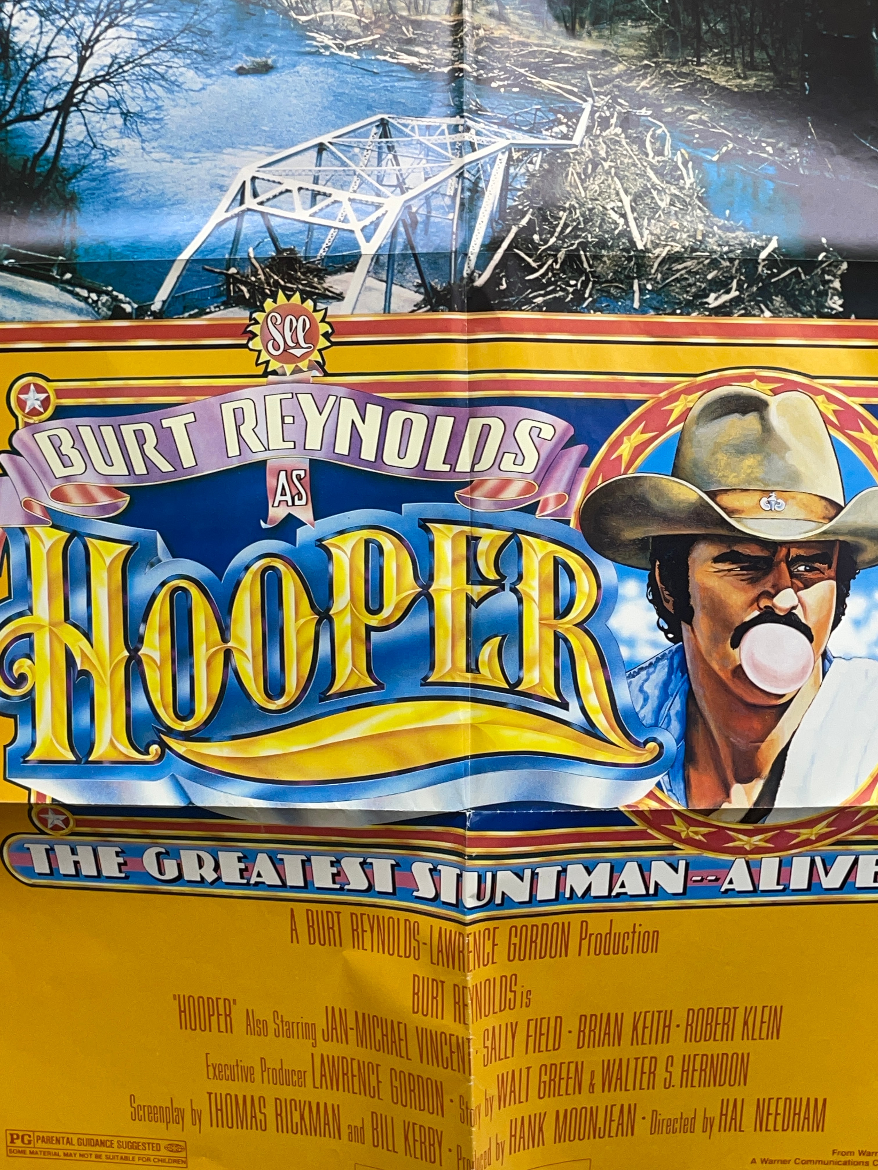 An original one-sheet movie poster for the 1978 film *Hooper*, starring Burt Reynolds, printed on paper. The vibrant design features a top image of a red car flying over a bridge with the tagline “Ain’t nobody can fly a car like Hooper!”. The main section showcases a stylized title “BURT REYNOLDS AS HOOPER” alongside an illustration of Burt Reynolds in a cowboy hat blowing a bubble, and the declaration “THE GREATEST STUNTMAN — ALIVE!”. Extensive credits list actors such as Sally Field, Jan-Michael Vincent, Brian Keith, Robert Klein, and director Hal Needham. Visible markings include “PG PARENTAL GUIDANCE SUGGESTED”, “From Warner Bros. A Warner Communications Company © 1978 WARNER BROS. INC.”, “STYLE C”, “780090”, and “HOOPER”.