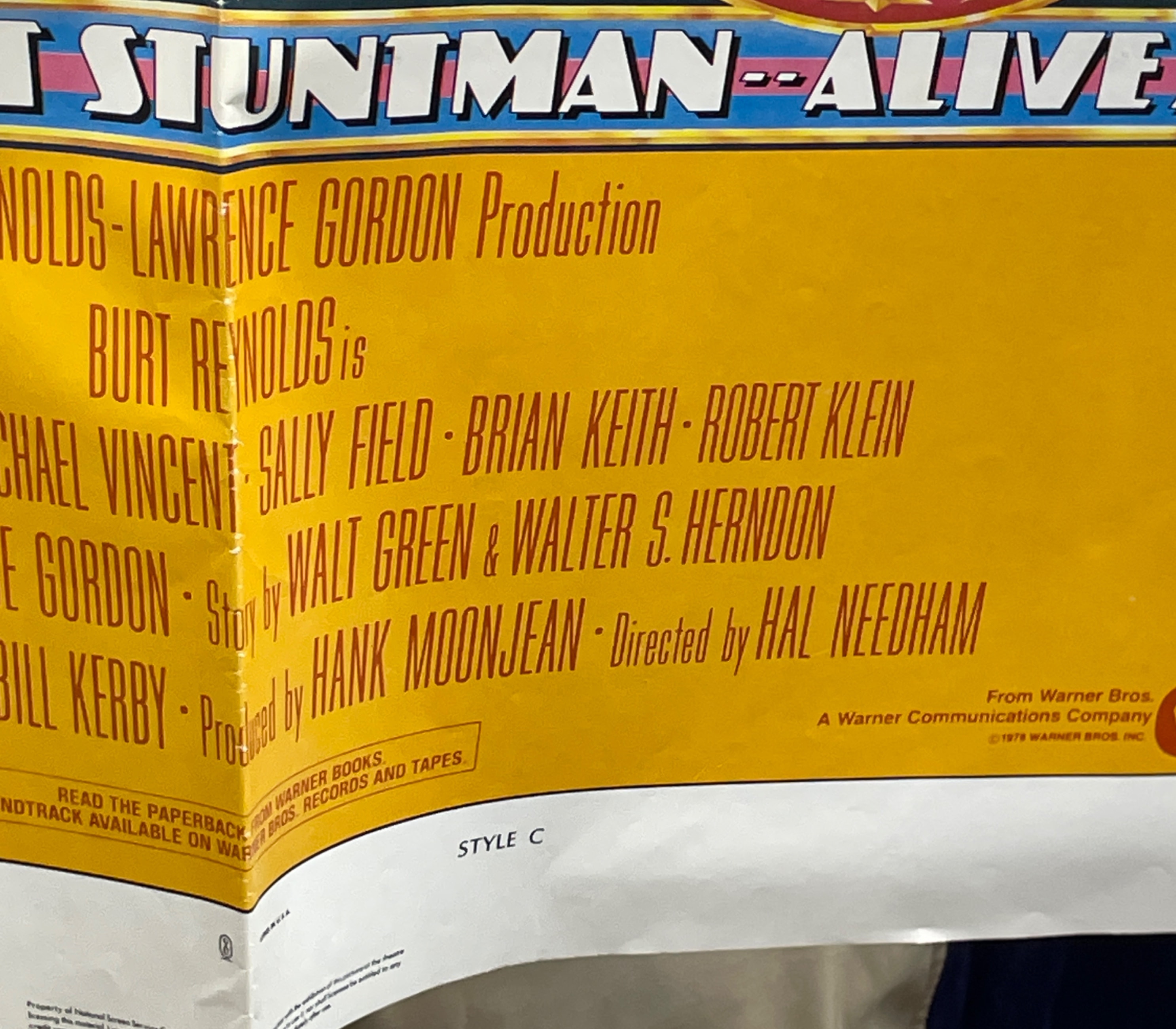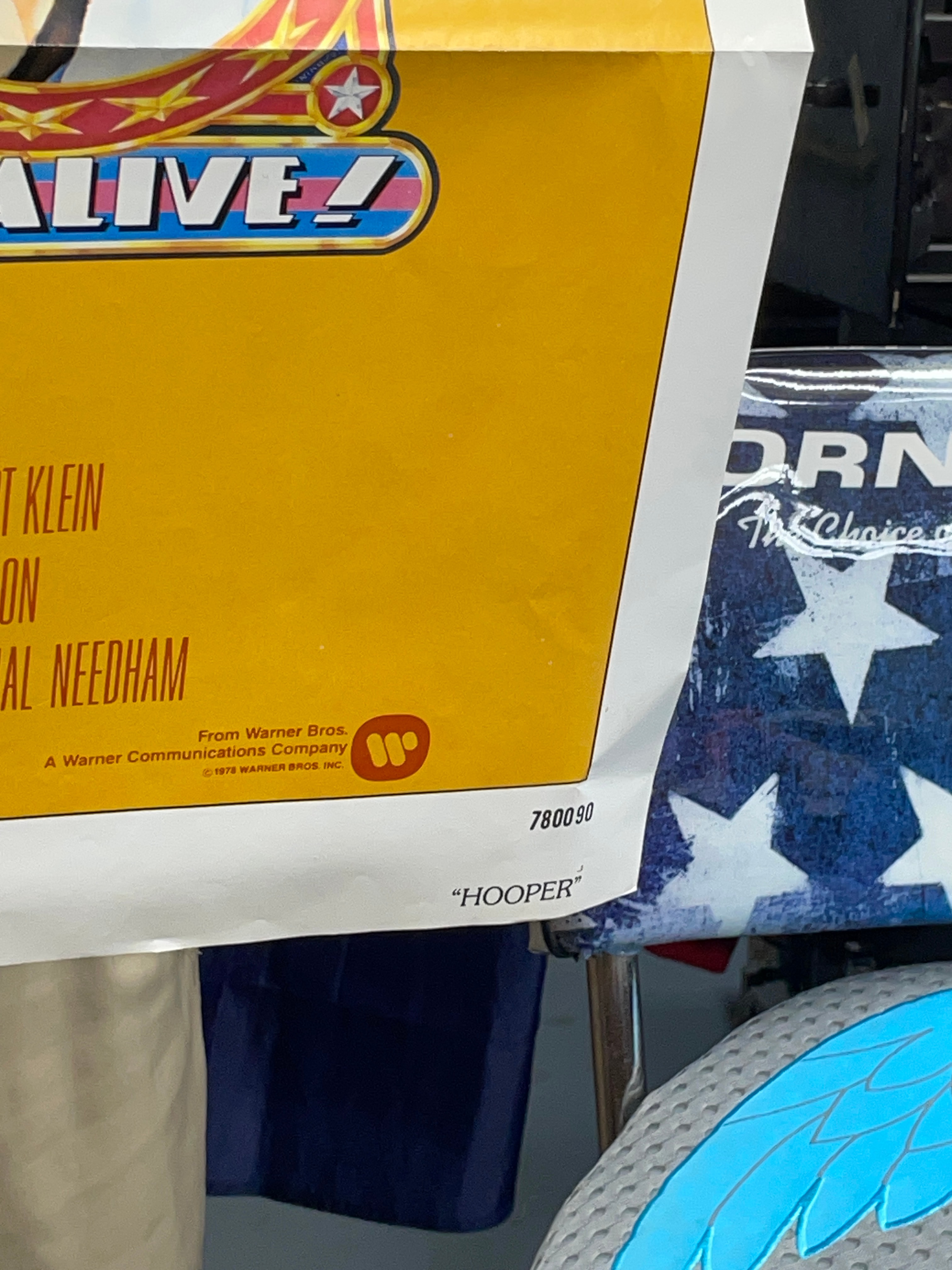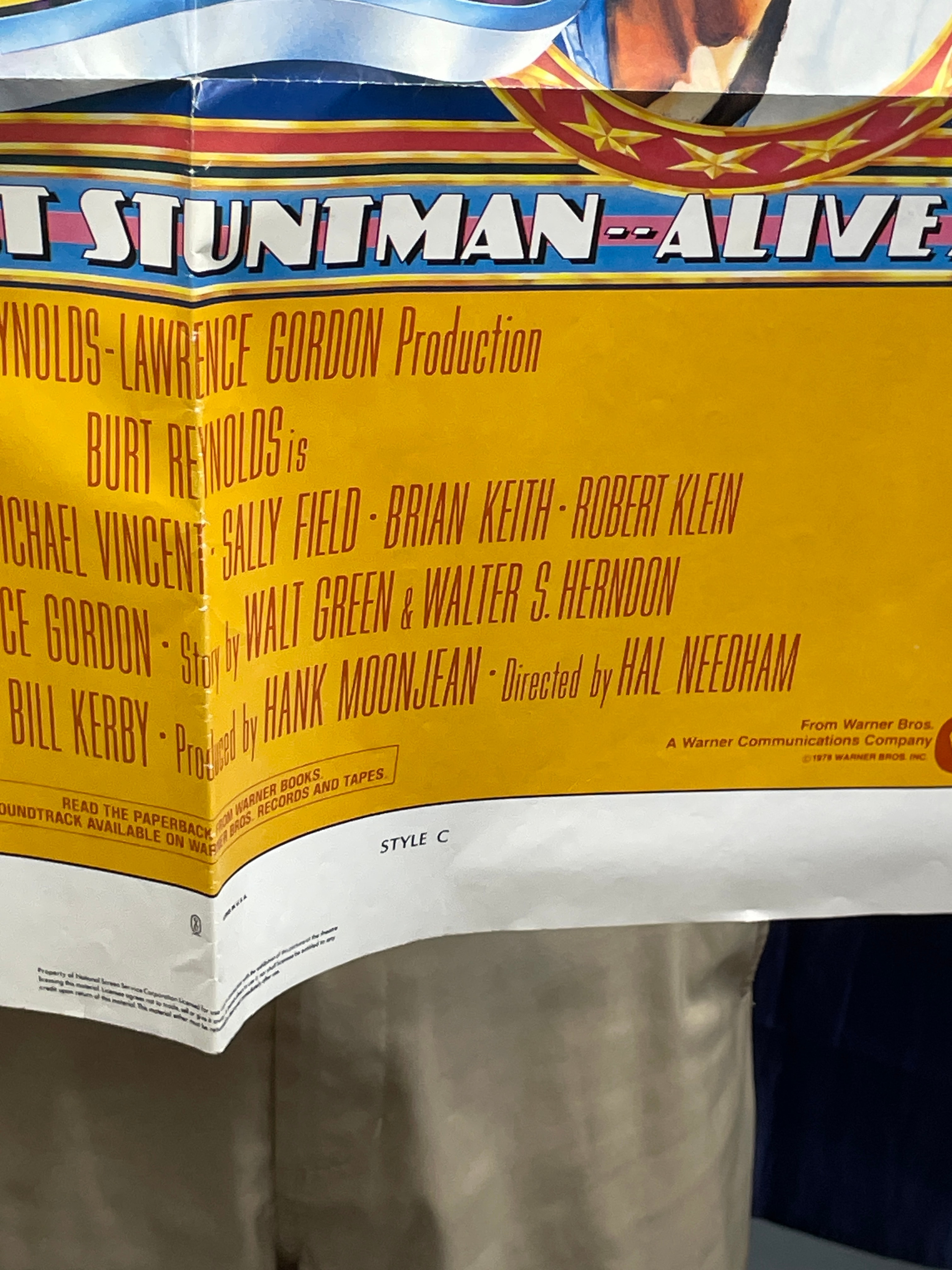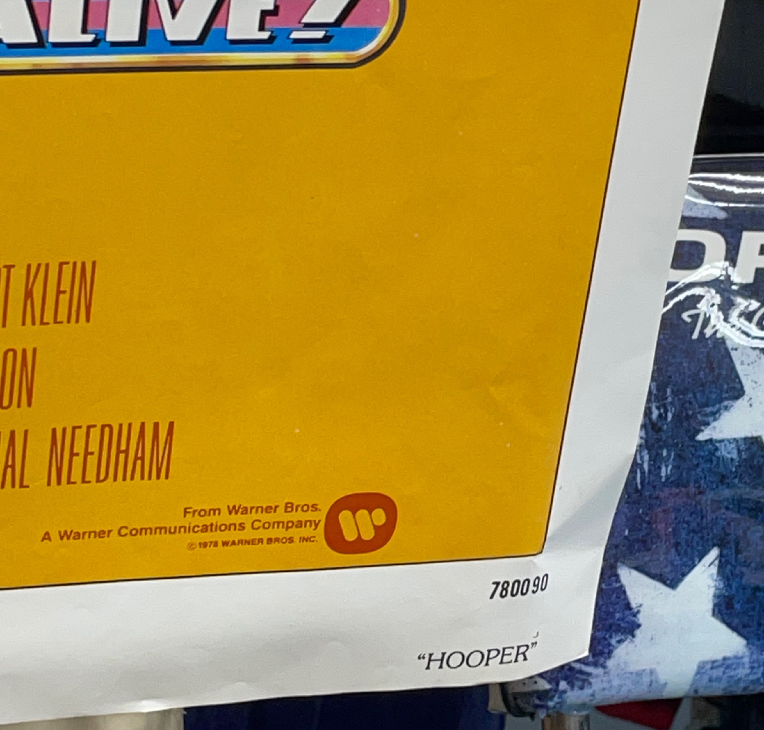 An original one-sheet movie poster for the 1978 film *Hooper*, starring Burt Reynolds, printed on paper. The vibrant design features a top image of a red car flying over a bridge with the tagline “Ain’t nobody can fly a car like Hooper!”. The main section showcases a stylized title “BURT REYNOLDS AS HOOPER” alongside an illustration of Burt Reynolds in a cowboy hat blowing a bubble, and the declaration “THE GREATEST STUNTMAN — ALIVE!”. Extensive credits list actors such as Sally Field, Jan-Michael Vincent, Brian Keith, Robert Klein, and director Hal Needham. Visible markings include “PG PARENTAL GUIDANCE SUGGESTED”, “From Warner Bros. A Warner Communications Company © 1978 WARNER BROS. INC.”, “STYLE C”, “780090”, and “HOOPER”.