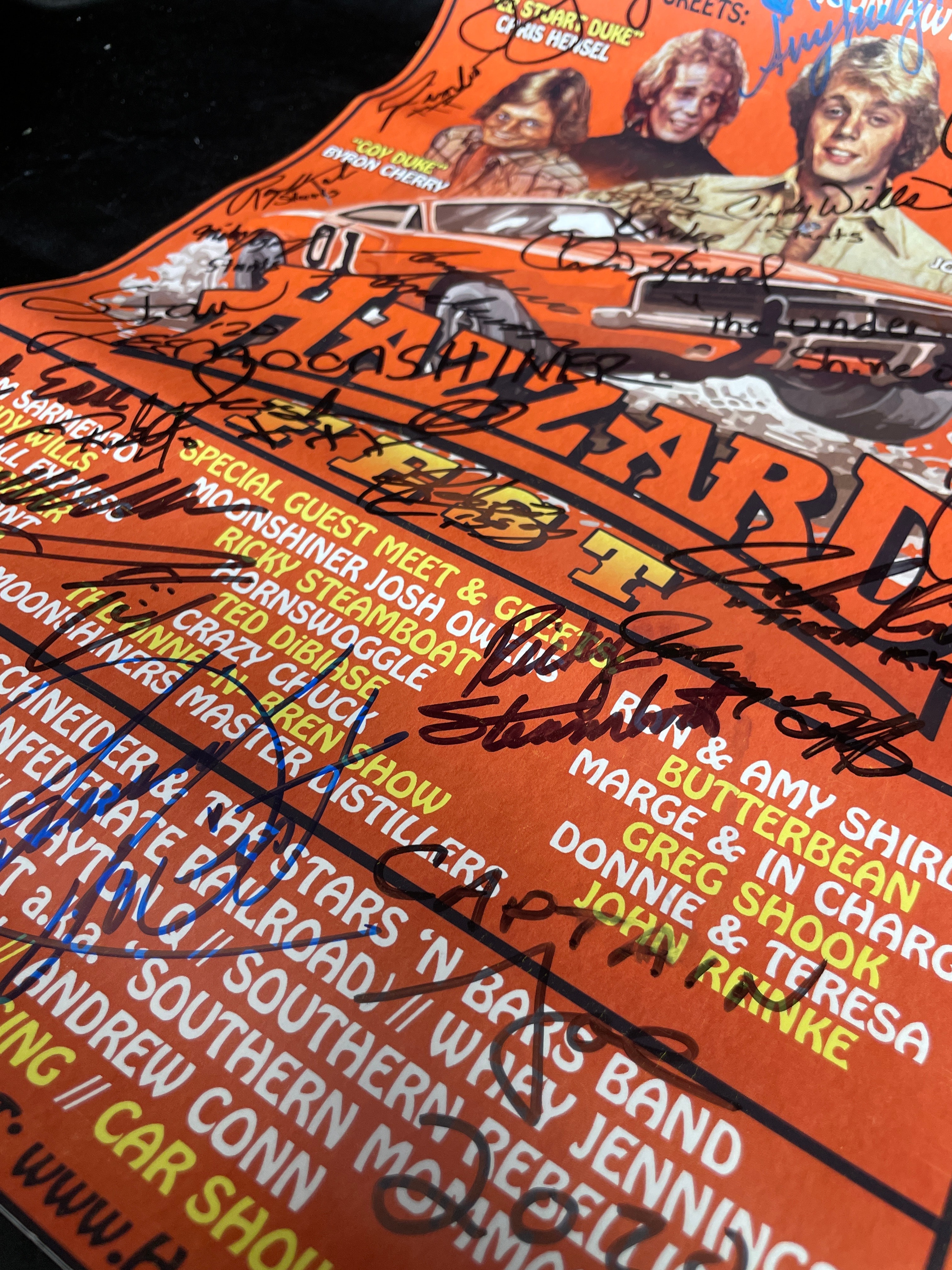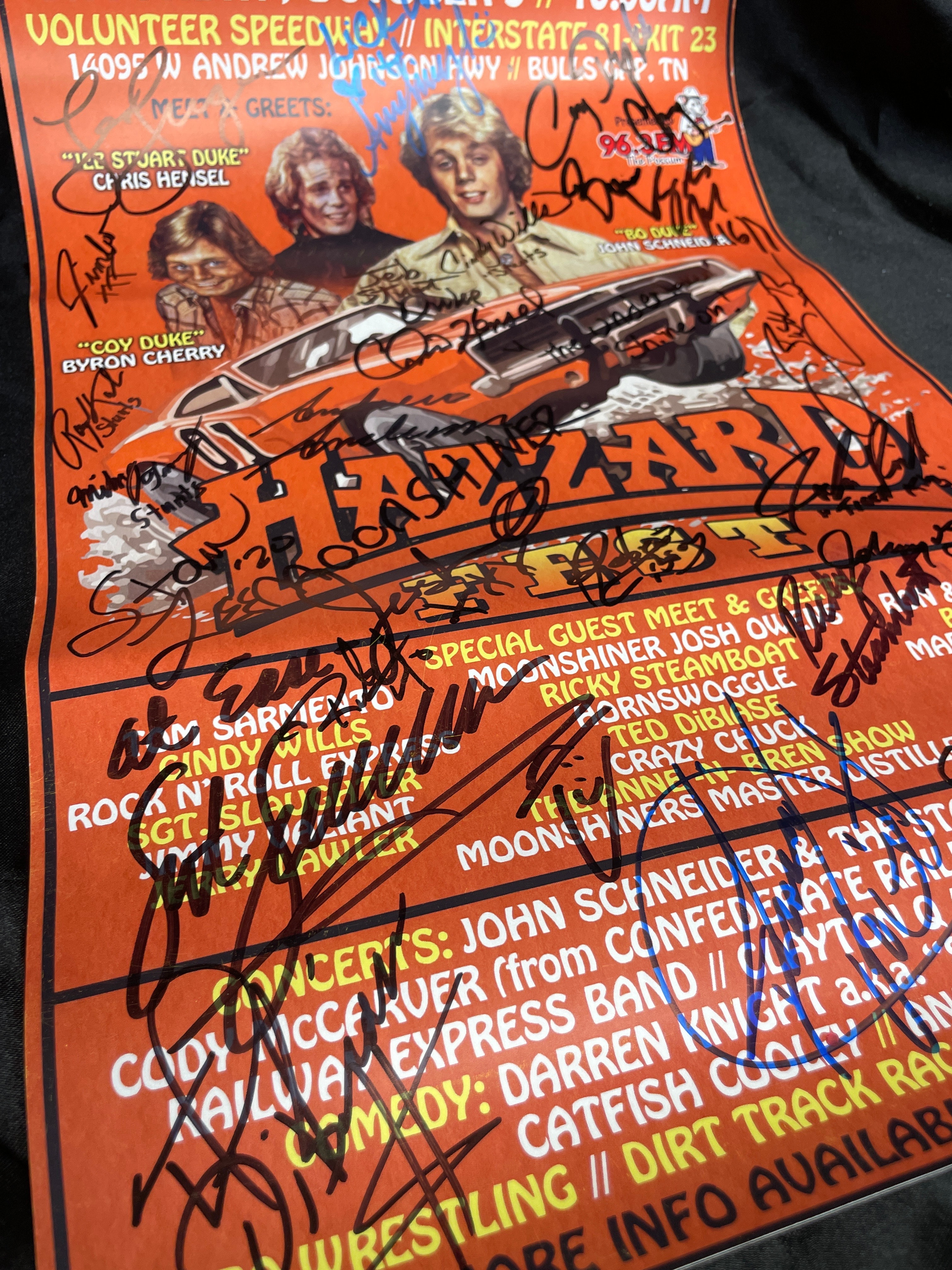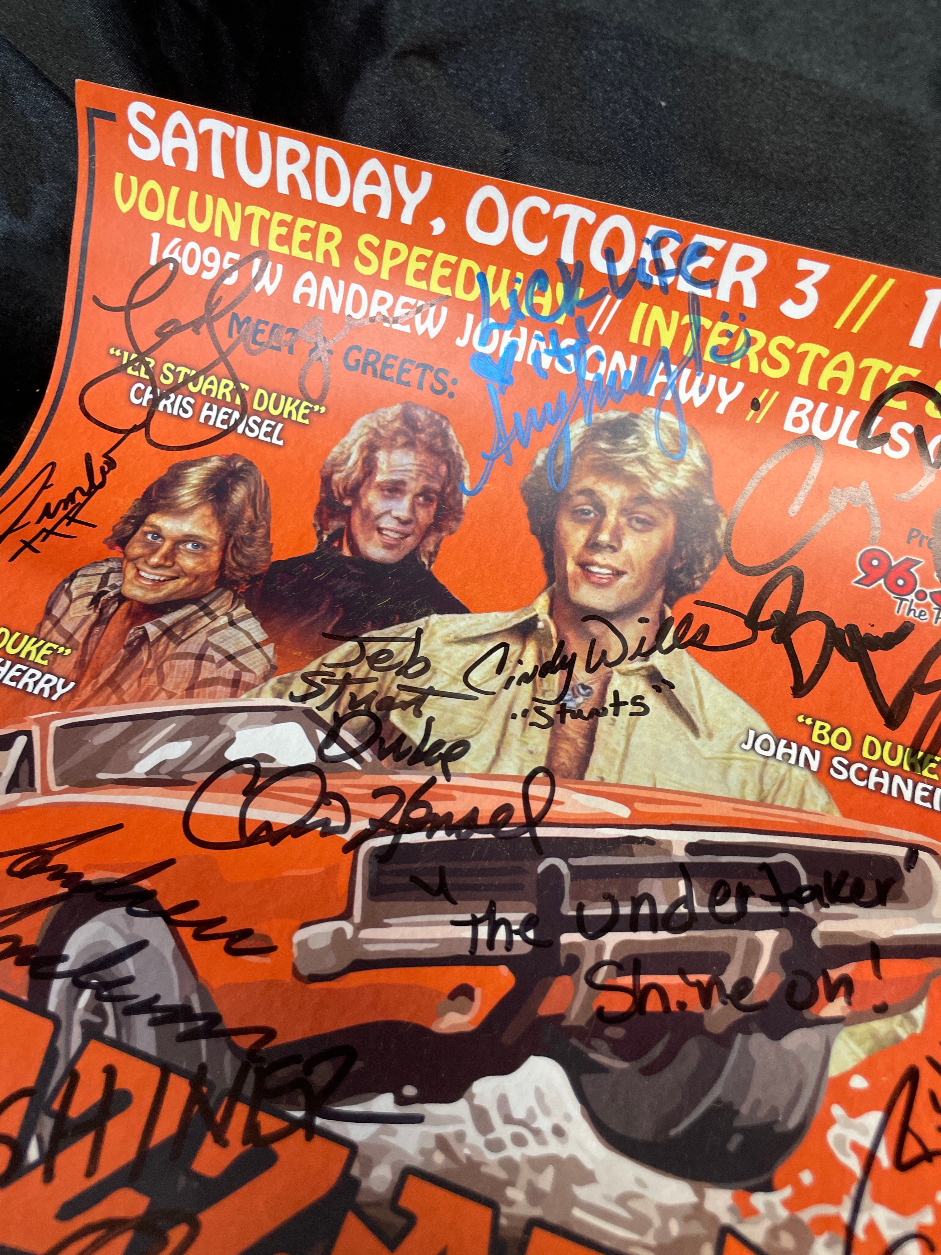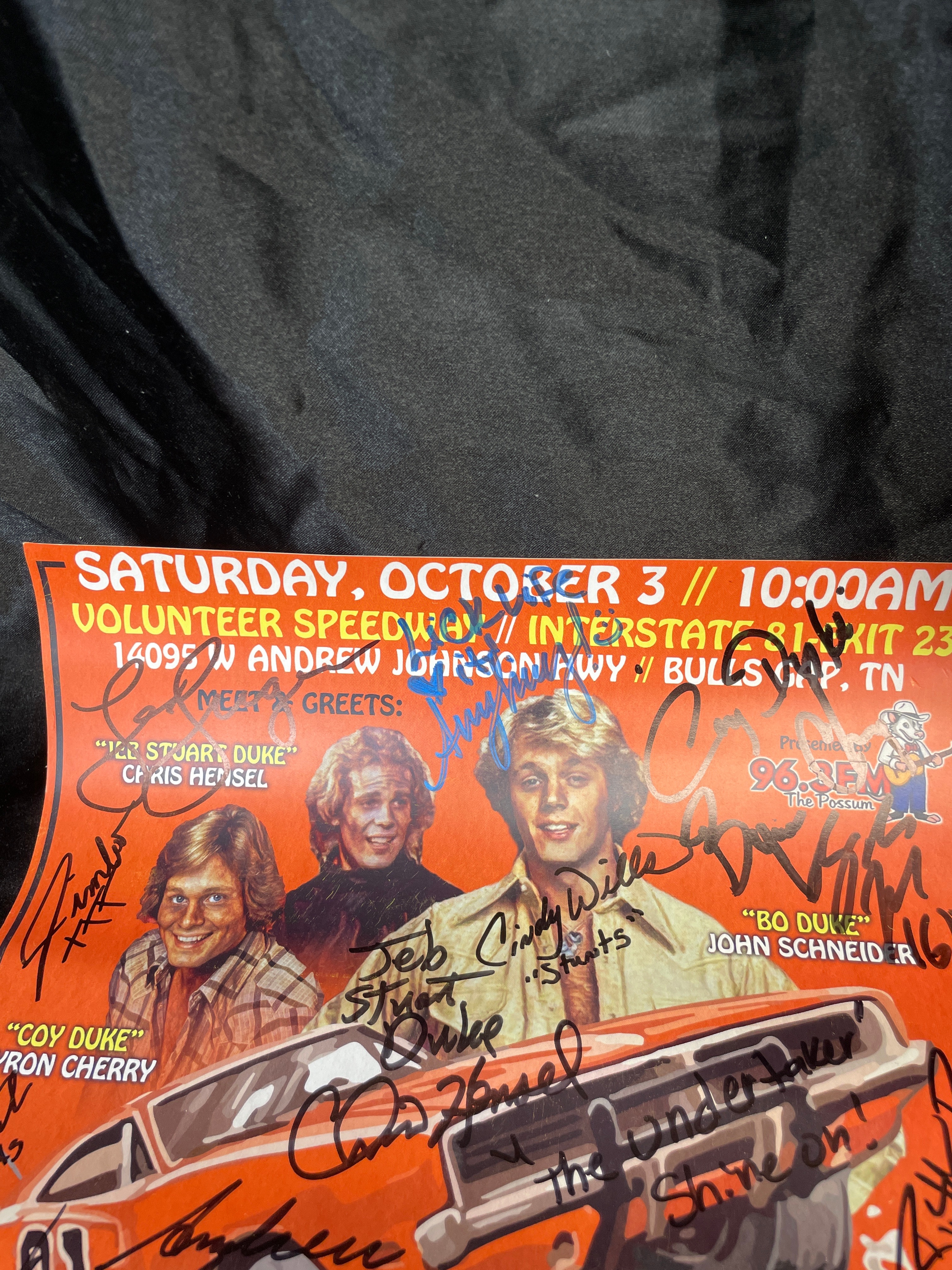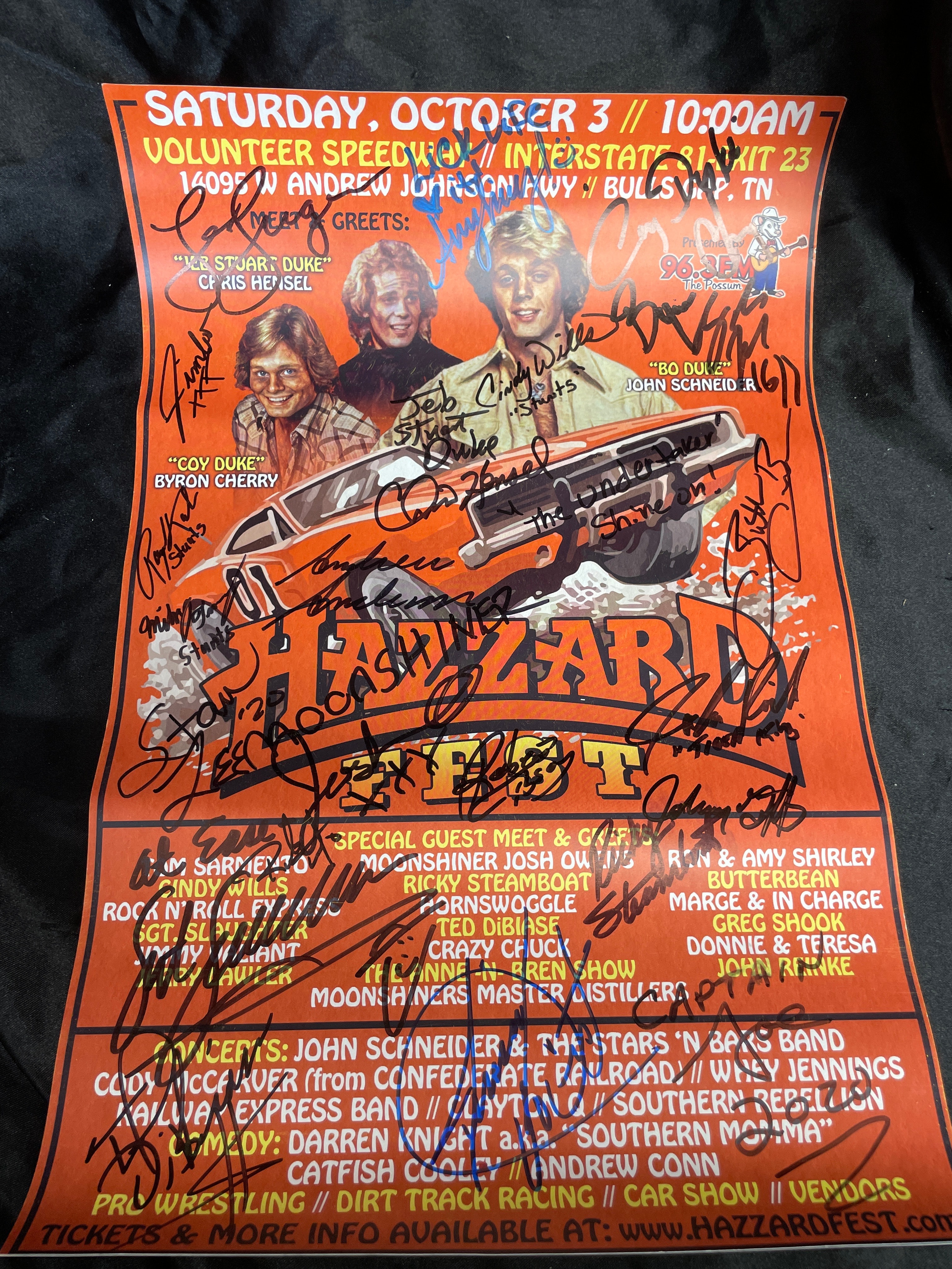 A Hazzard Fest promotional poster, printed on paper, for an event scheduled for Saturday, October 3rd at 10:00 AM at Volunteer Speedway in Bulls Gap, TN. The poster features a vibrant orange background with an illustration of the “General Lee” car and images of actors Byron Cherry (“Coy Duke”), Chris Hensel (“Stuar Duke”), and John Schneider (“Bo Duke”). Text details a variety of activities including meet and greets with various guests such as “Moonshiner Josh Out Law, ” Ricky Steamboat, and Ted Dibiase, live concerts by John Schneider & The Stars ‘N Bars Band, comedy performances, pro wrestling, dirt track racing, and a car show. The poster is heavily covered with numerous handwritten signatures in both black and blue ink, many of which are legible, including those of the featured actors and other personalities, with one notable inscription reading “The Undertaker Shine on!”.