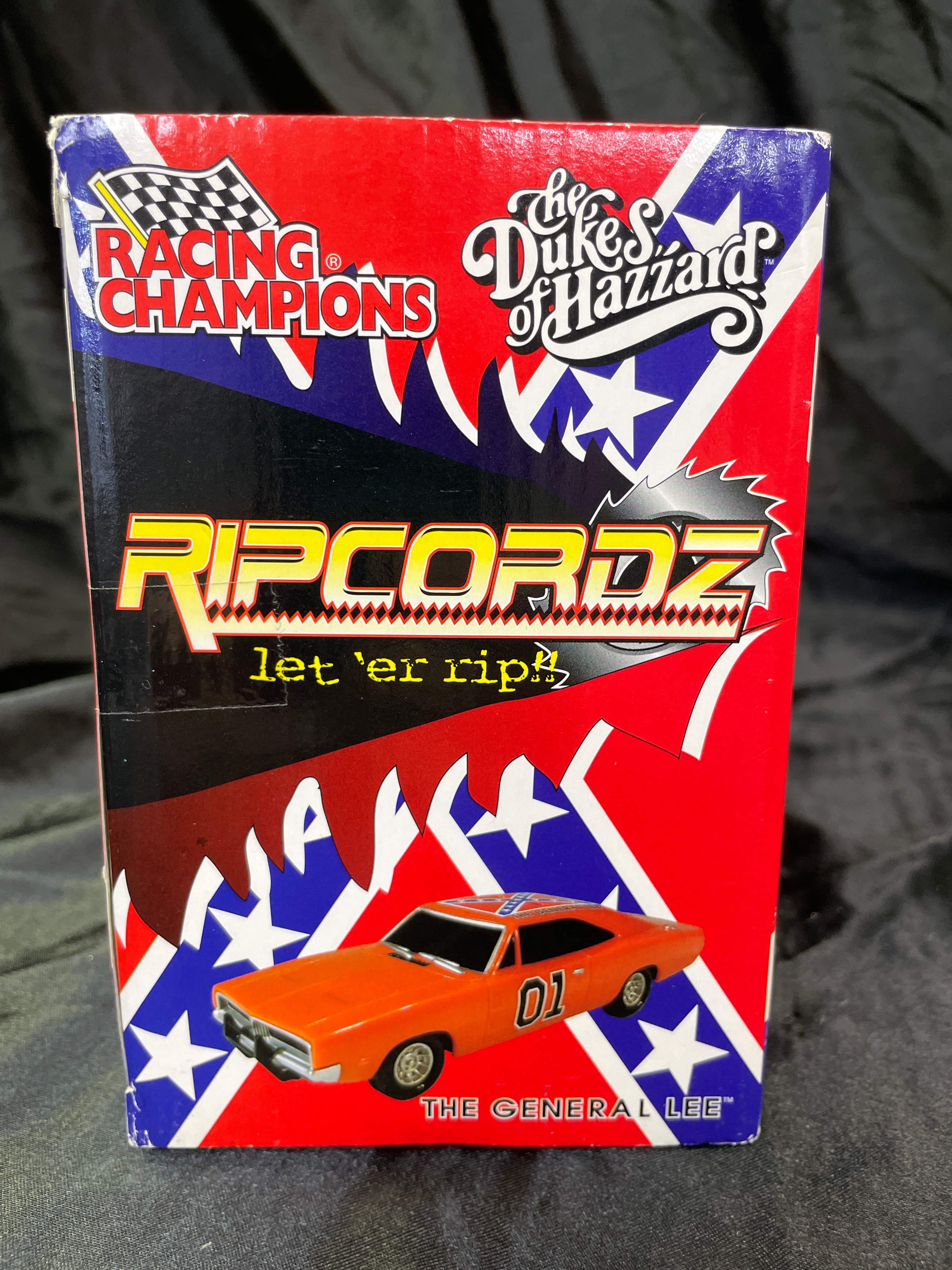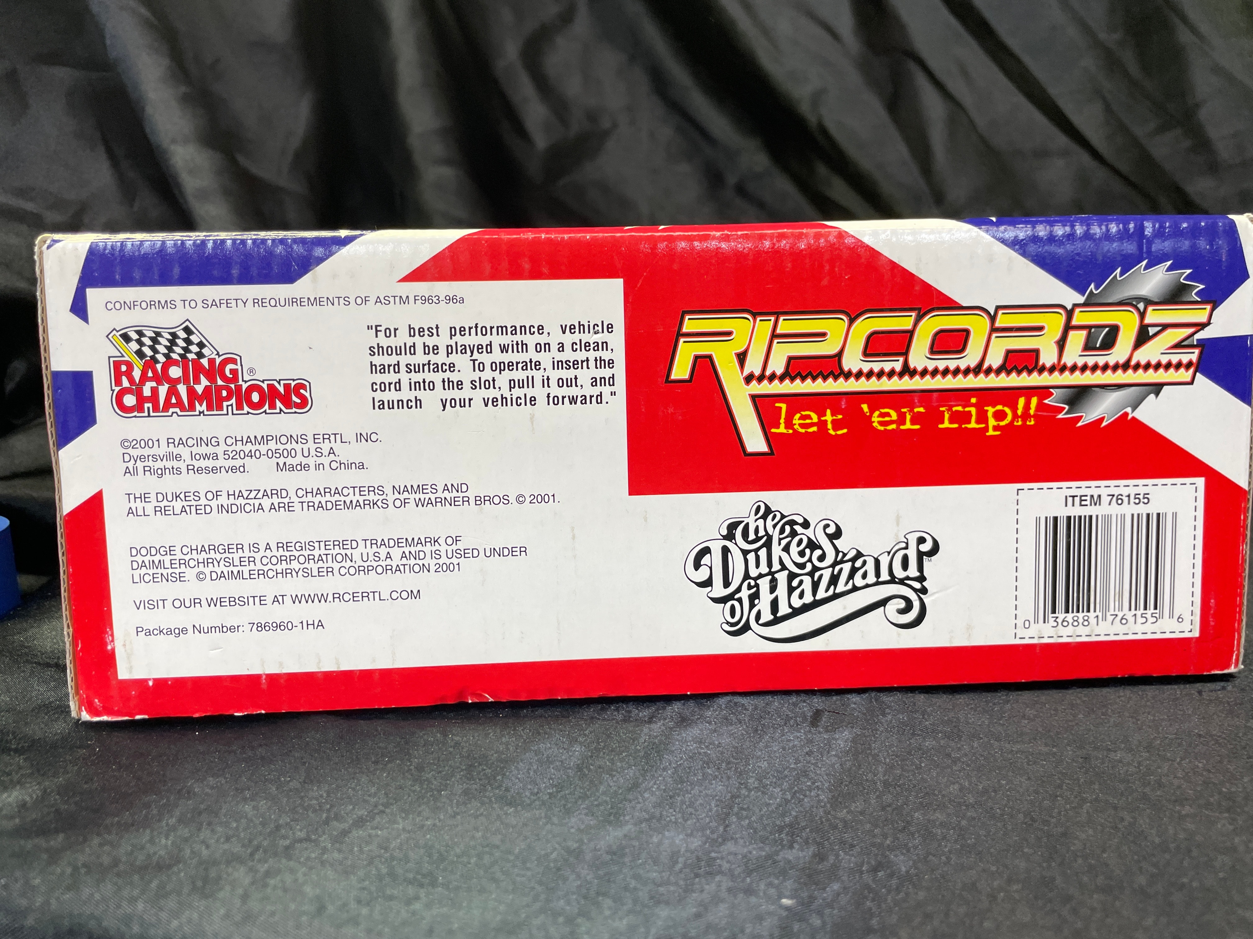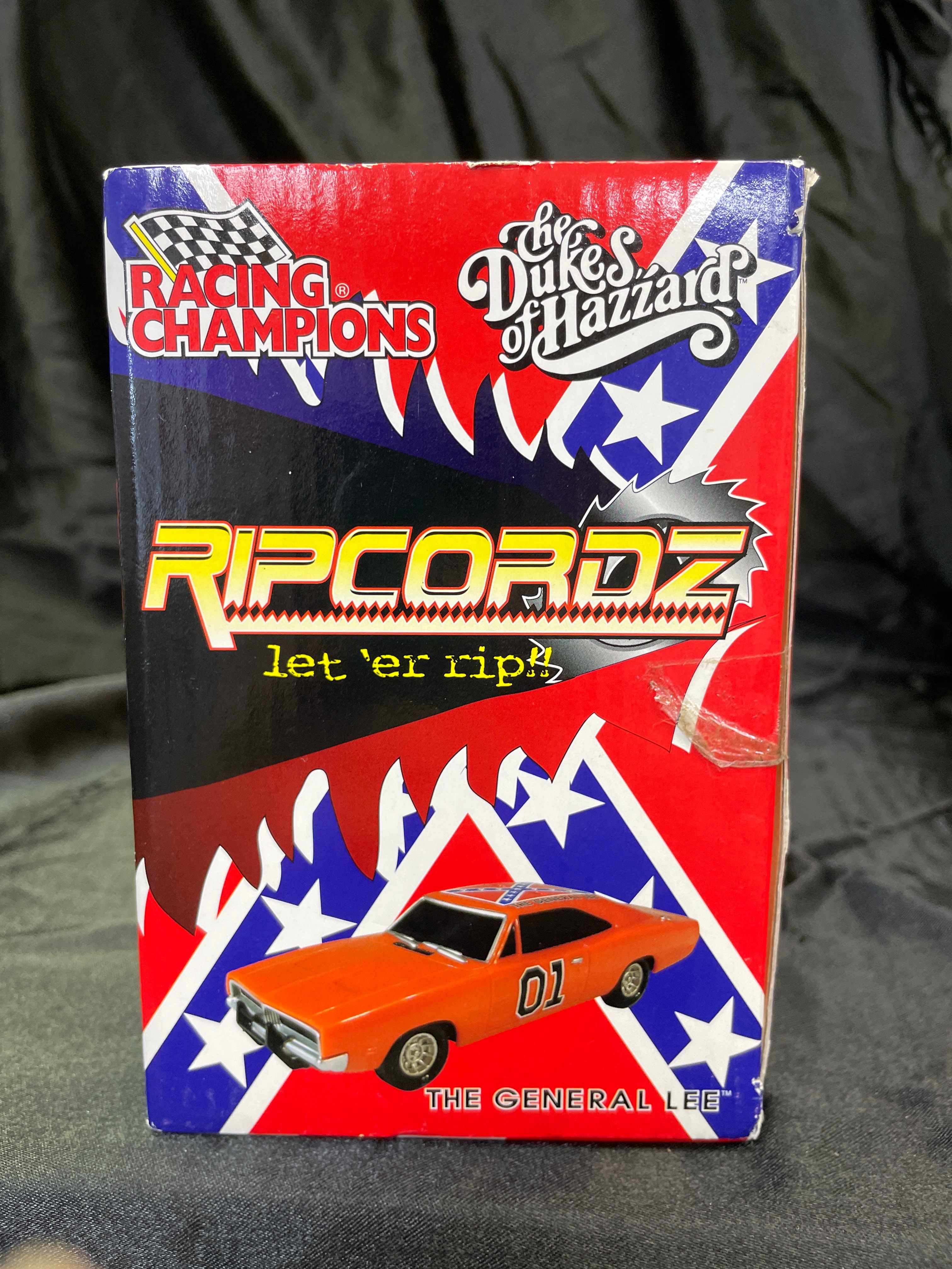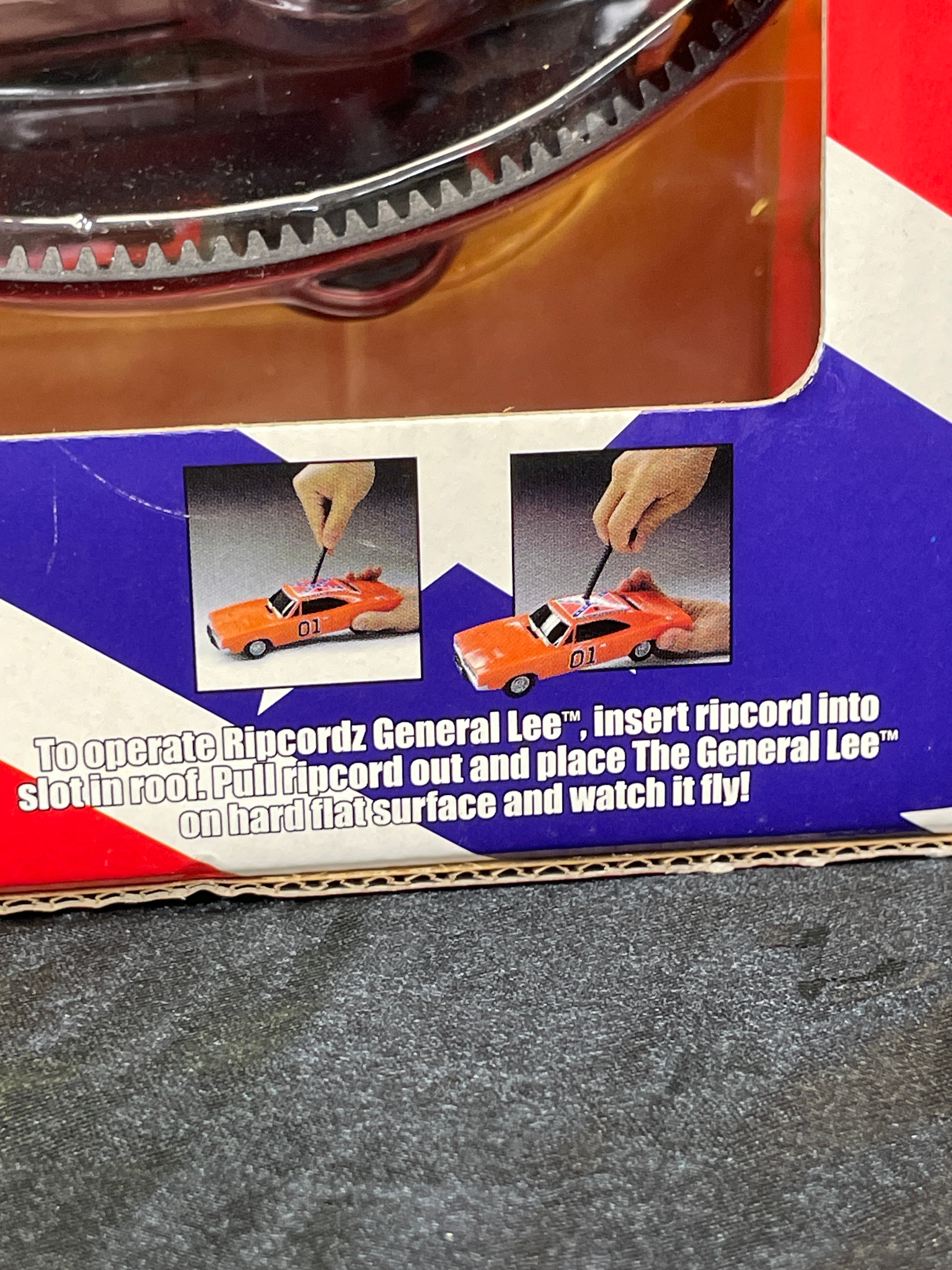 A Racing Champions Ripcordz “The General Lee” toy car, modeled after the iconic 1969 Dodge Charger from “The Dukes of Hazzard” franchise. Produced in 2001 by Racing Champions Ertl, Inc. and Warner Bros., this vibrant orange plastic car features “01” on its doors and a Confederate battle flag decal with “THE GENERAL LEE” text on its roof. The item is sealed within its original cardboard and clear plastic packaging, which displays “5+” for age, “RACING CHAMPIONS”, “RIPCORDZ”, and “The Dukes of Hazzard” branding, along with operational instructions for its “rev-it-up and rip it out” pull-cord mechanism.