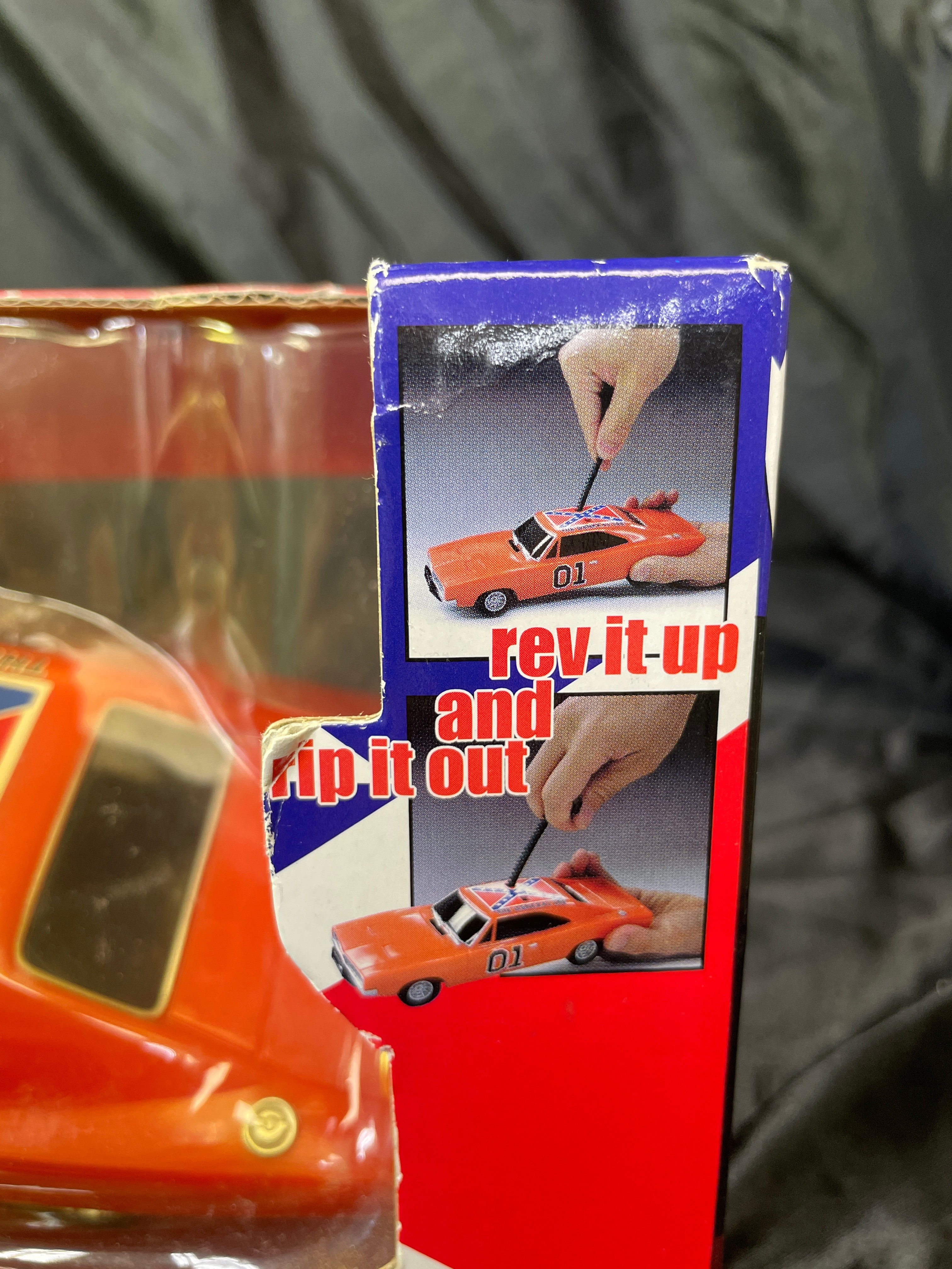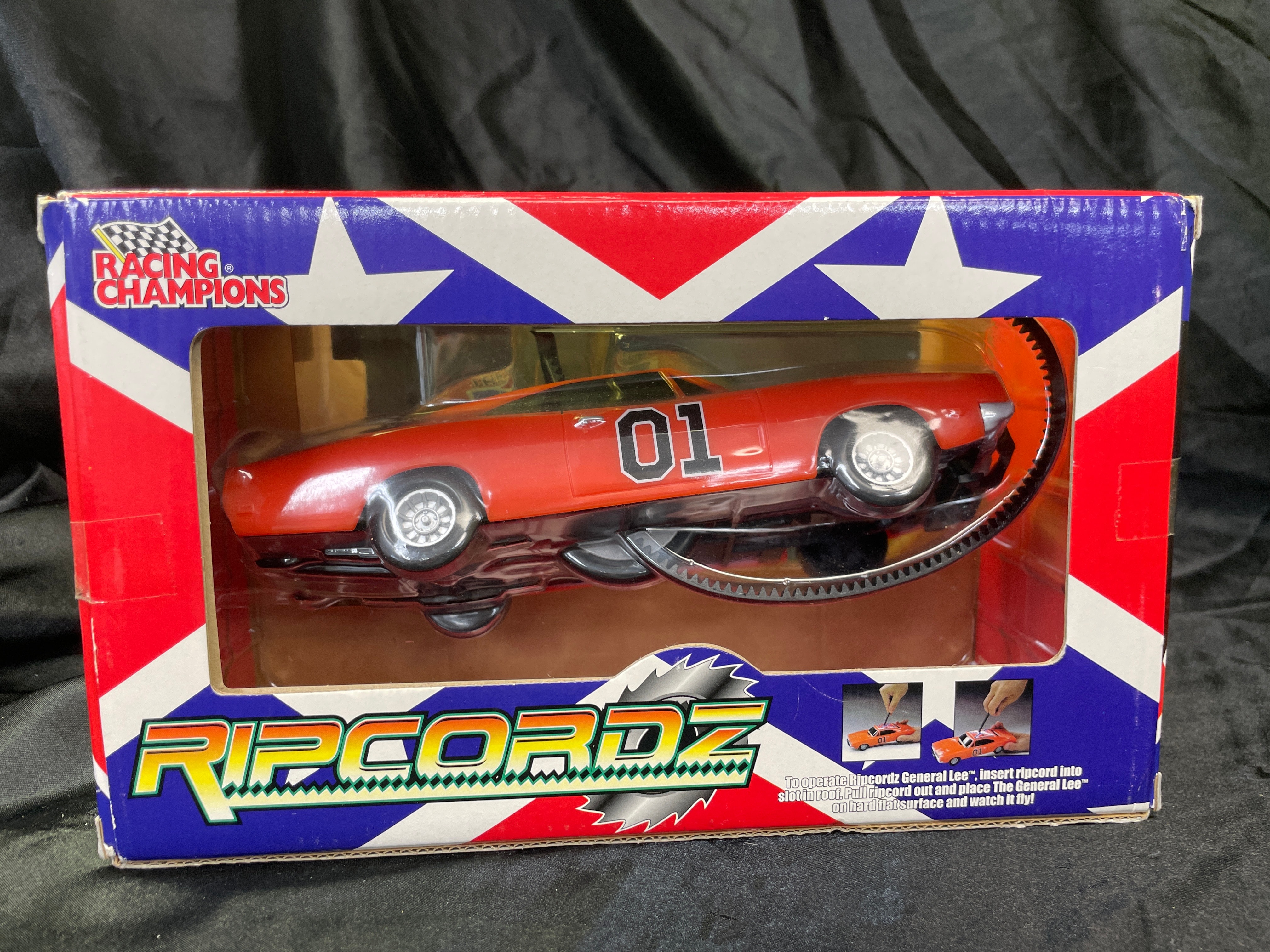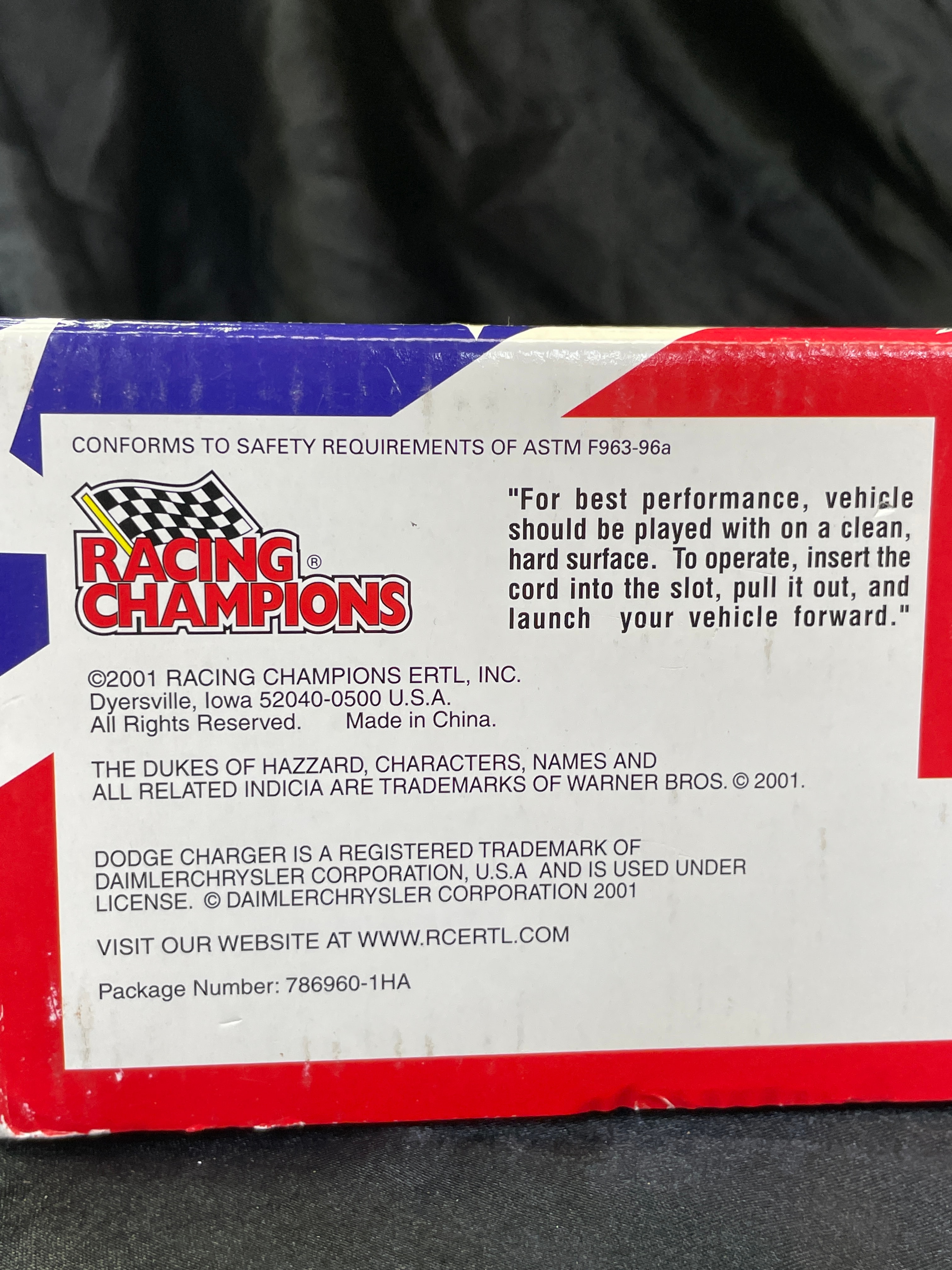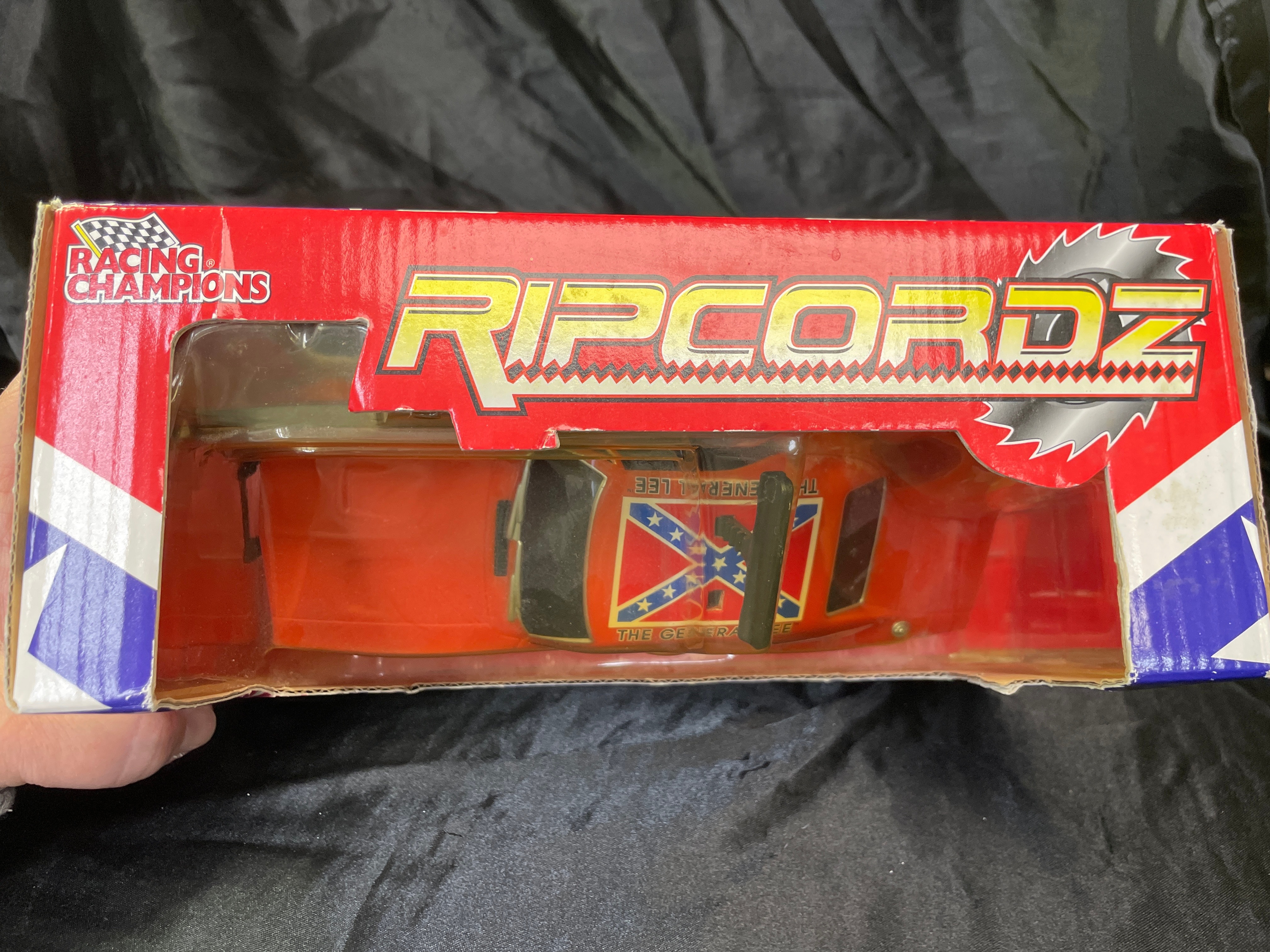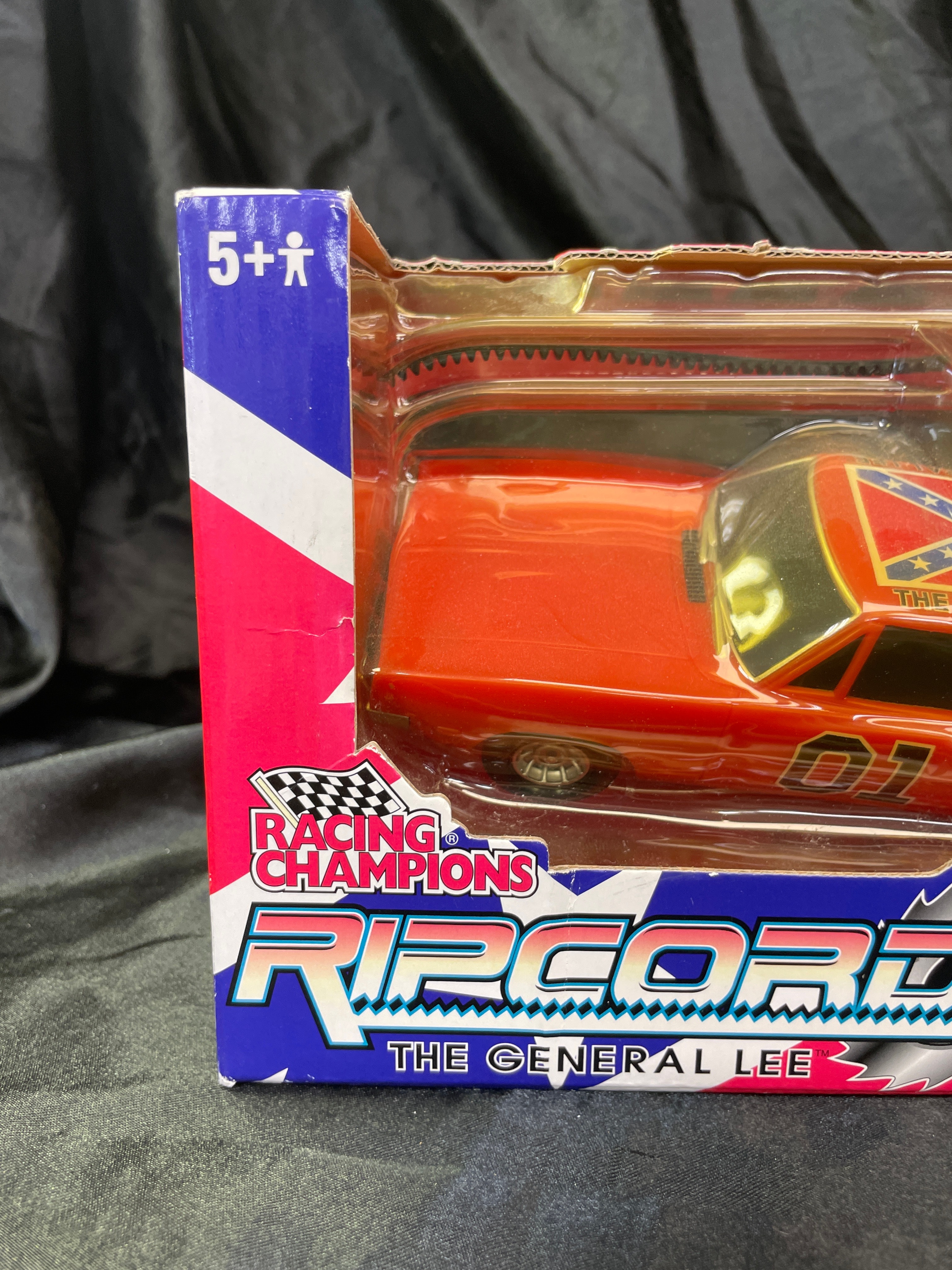 A Racing Champions Ripcordz “The General Lee” toy car, modeled after the iconic 1969 Dodge Charger from “The Dukes of Hazzard” franchise. Produced in 2001 by Racing Champions Ertl, Inc. and Warner Bros., this vibrant orange plastic car features “01” on its doors and a Confederate battle flag decal with “THE GENERAL LEE” text on its roof. The item is sealed within its original cardboard and clear plastic packaging, which displays “5+” for age, “RACING CHAMPIONS”, “RIPCORDZ”, and “The Dukes of Hazzard” branding, along with operational instructions for its “rev-it-up and rip it out” pull-cord mechanism.