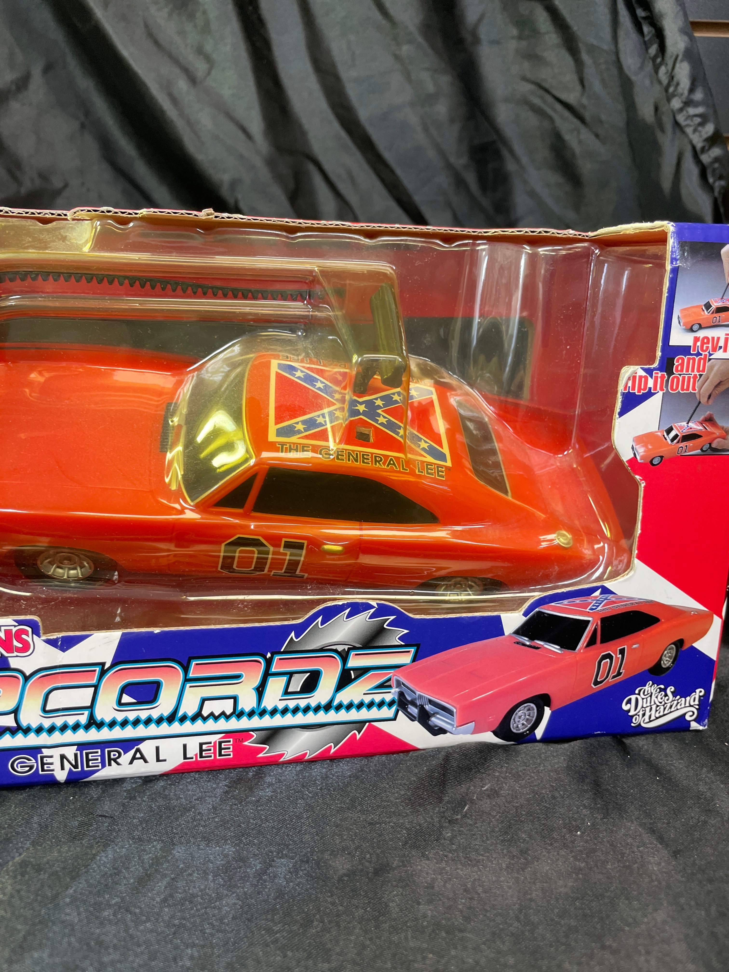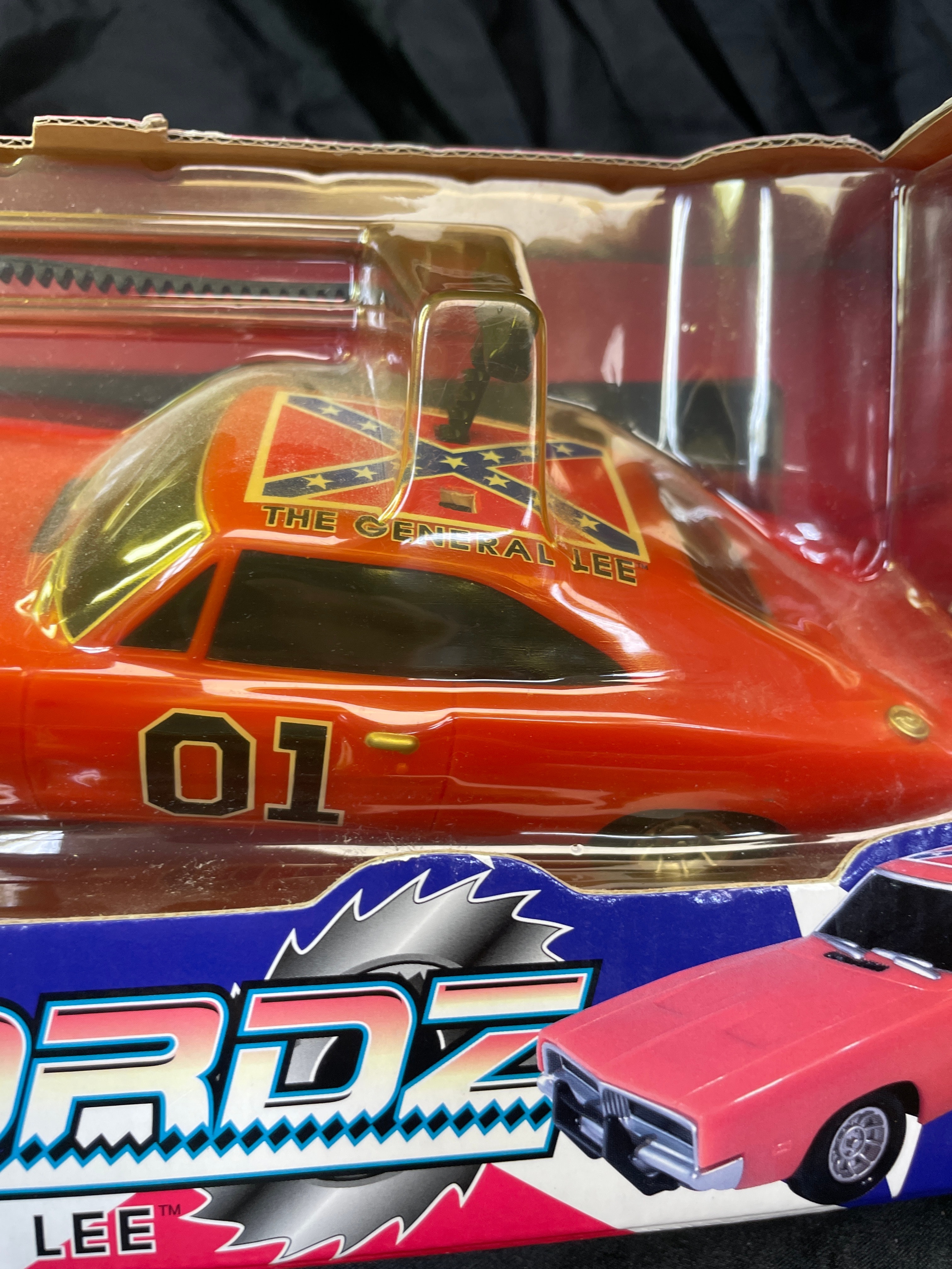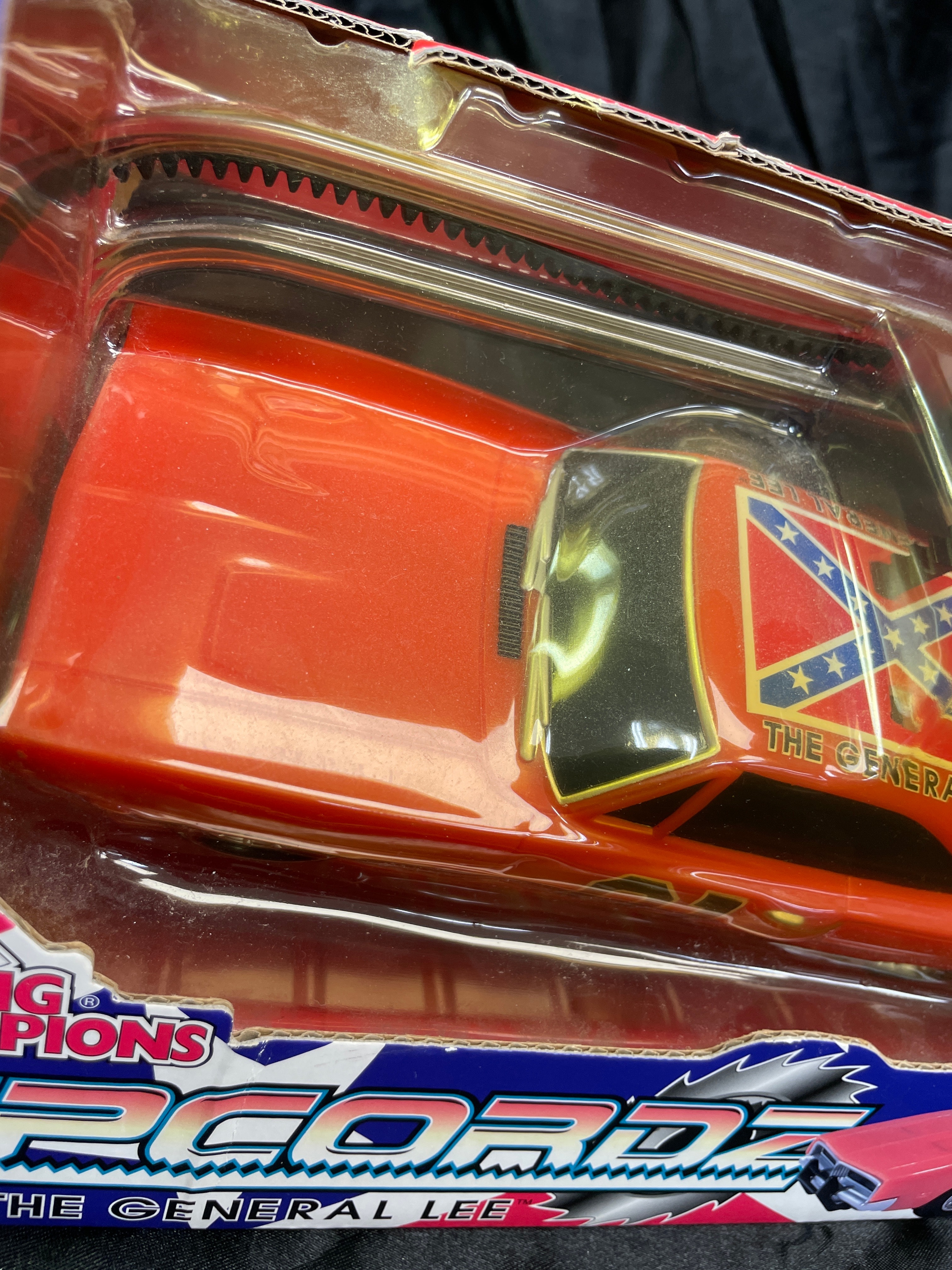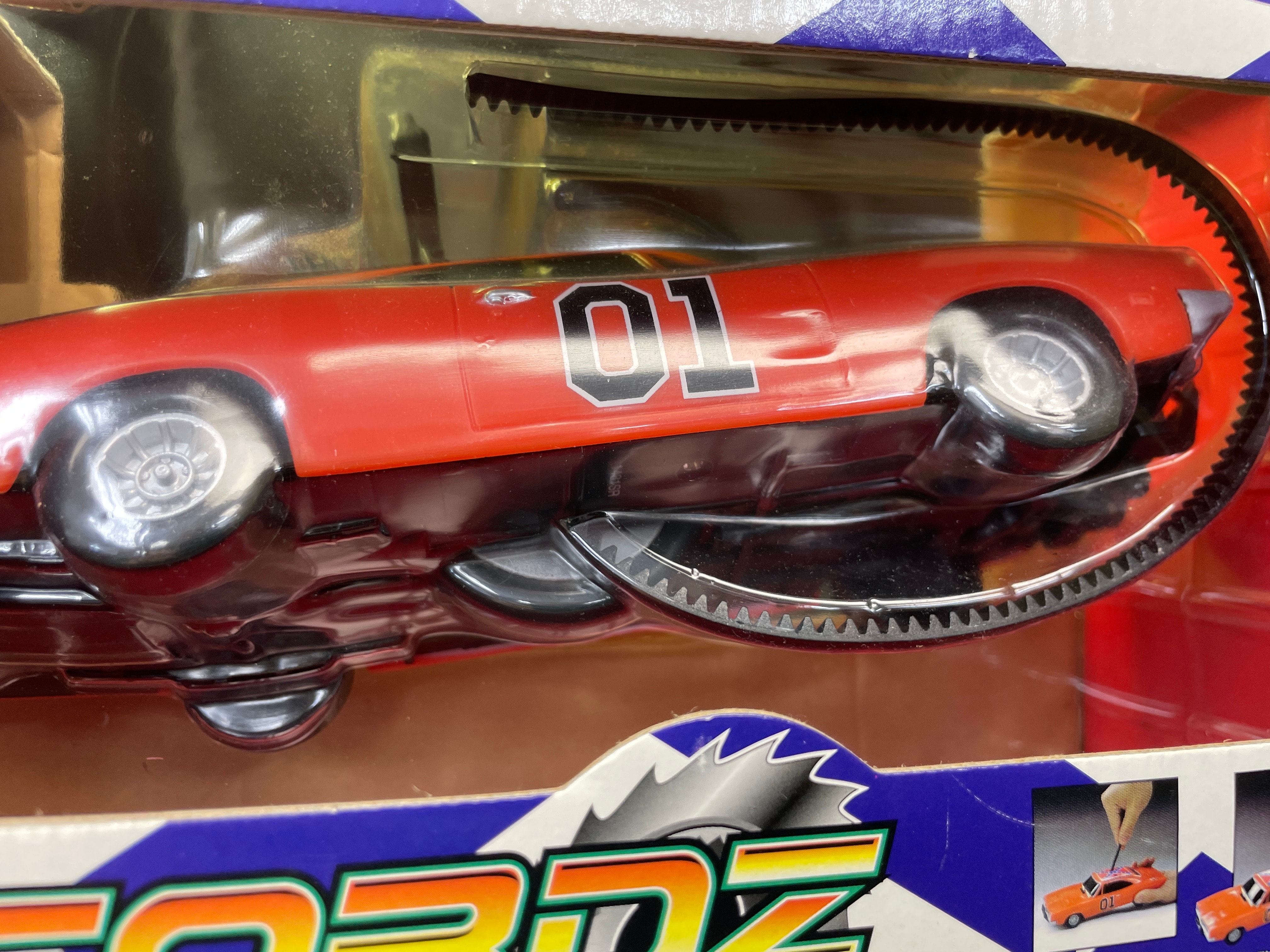 A Racing Champions Ripcordz “The General Lee” toy car, modeled after the iconic 1969 Dodge Charger from “The Dukes of Hazzard” franchise. Produced in 2001 by Racing Champions Ertl, Inc. and Warner Bros., this vibrant orange plastic car features “01” on its doors and a Confederate battle flag decal with “THE GENERAL LEE” text on its roof. The item is sealed within its original cardboard and clear plastic packaging, which displays “5+” for age, “RACING CHAMPIONS”, “RIPCORDZ”, and “The Dukes of Hazzard” branding, along with operational instructions for its “rev-it-up and rip it out” pull-cord mechanism.
