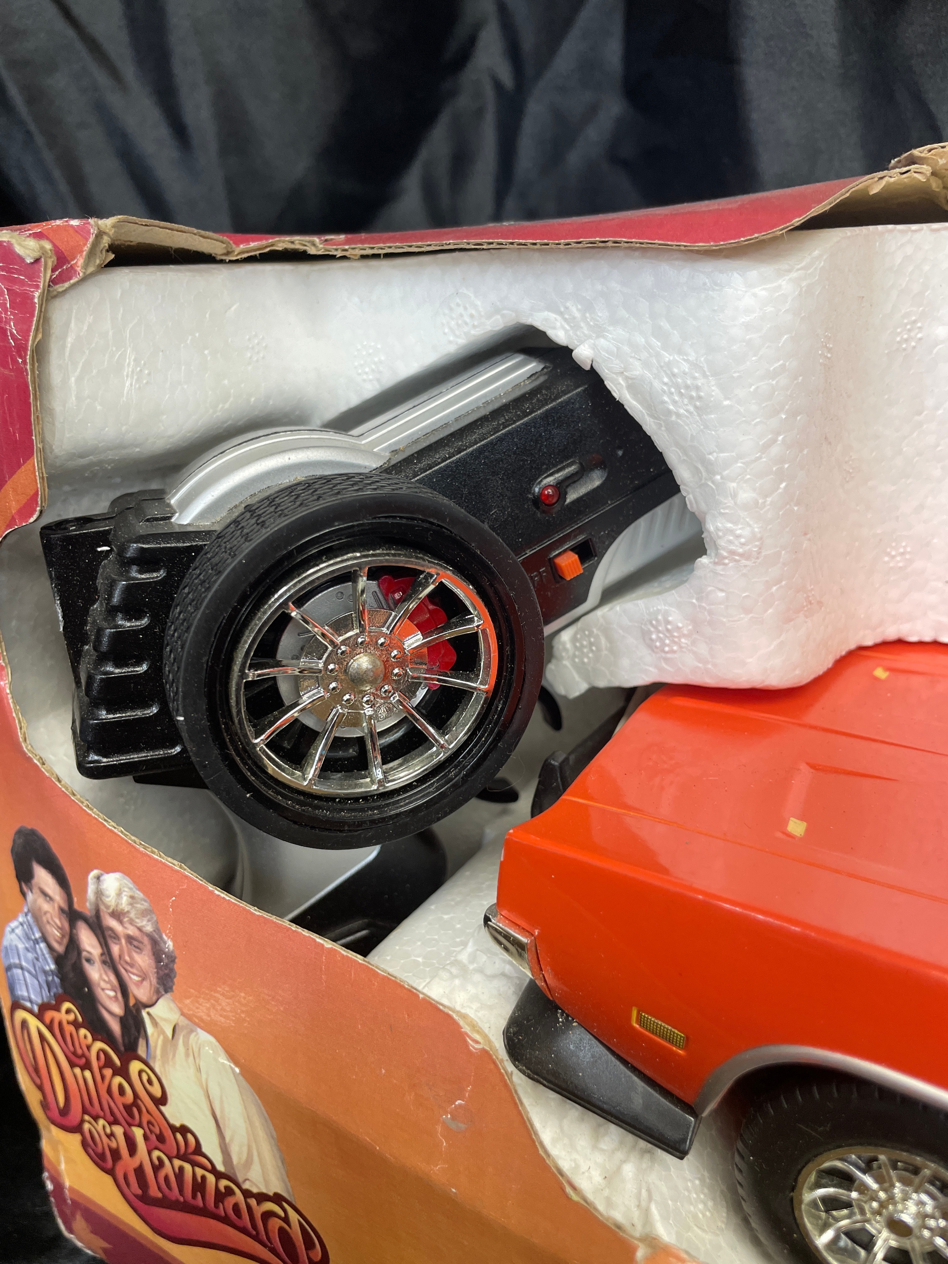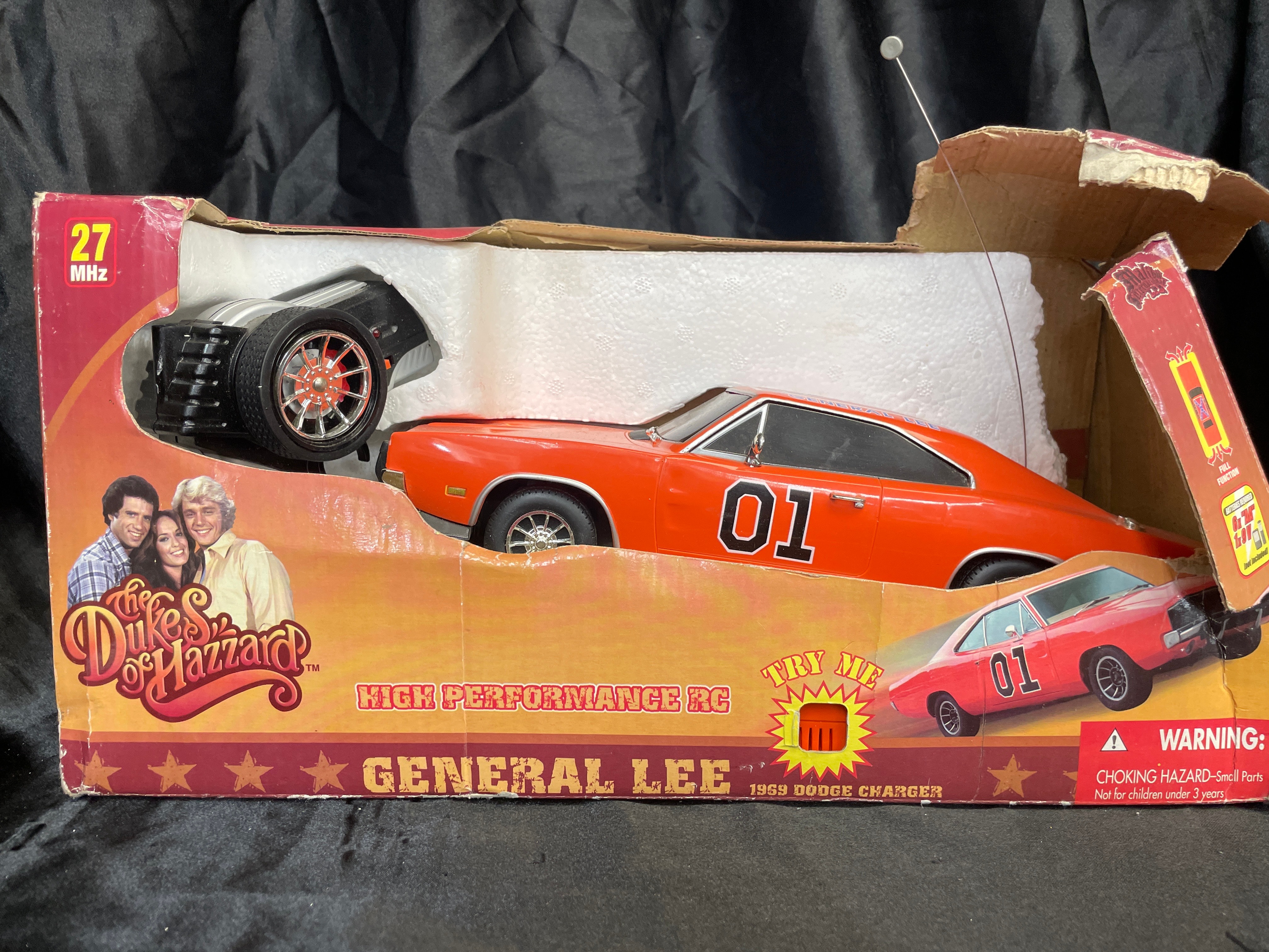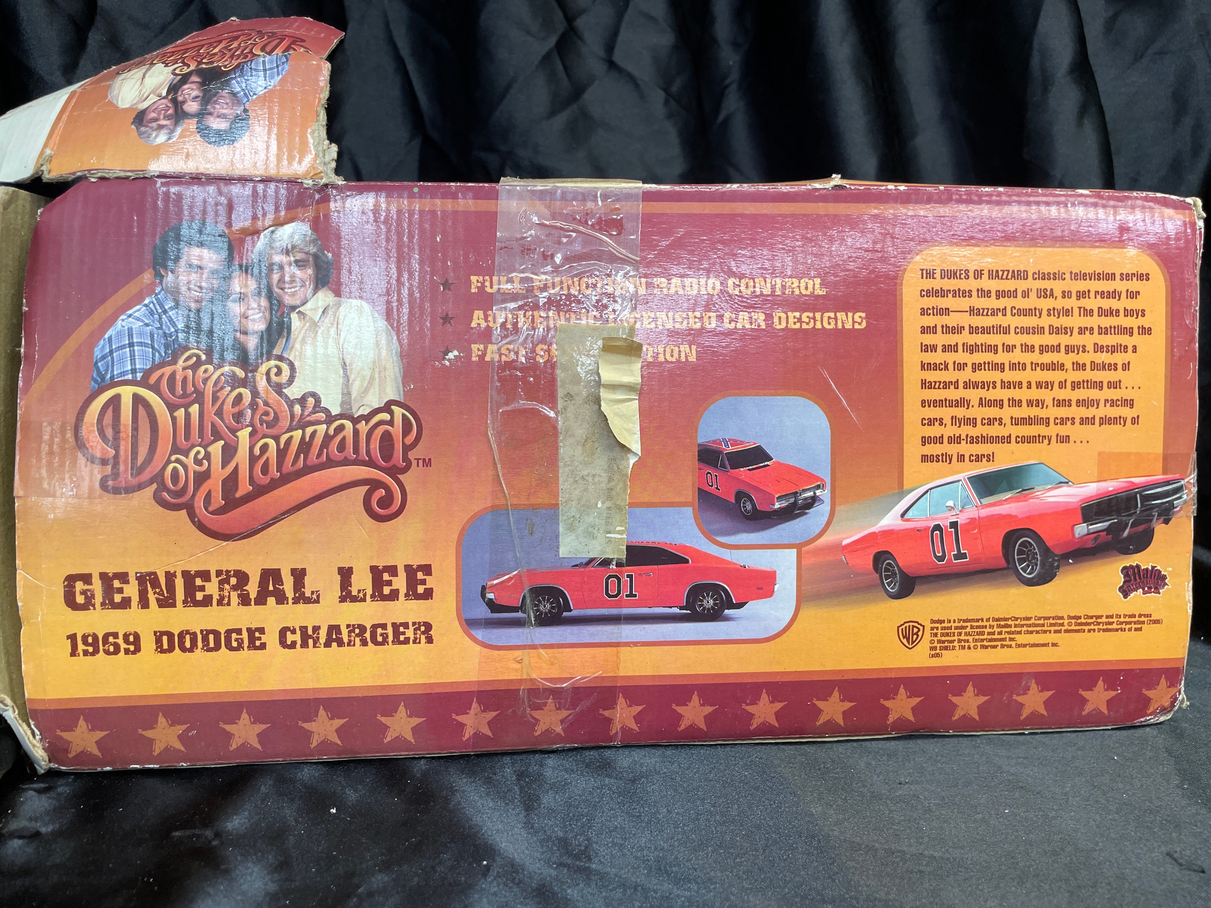 A remote control toy vehicle, identified as the “General Lee” 1969 Dodge Charger from “The Dukes of Hazzard, ” produced under license by Malibu International Limited. The bright orange model features the number “01” on its doors and a Confederate battle flag design on the roof. It is presented in its original cardboard box with molded Styrofoam inserts, accompanied by its black remote control unit. The packaging displays “The Dukes of Hazzard” branding, images of the cast, and text indicating it is a “HIGH PERFORMANCE RC” operating at “27 MHZ.” Copyright information on the box dates its licensing to 2005 by Warner Bros. Entertainment Inc. and DaimlerChrysler Corporation (2005) via Malibu International Limited.