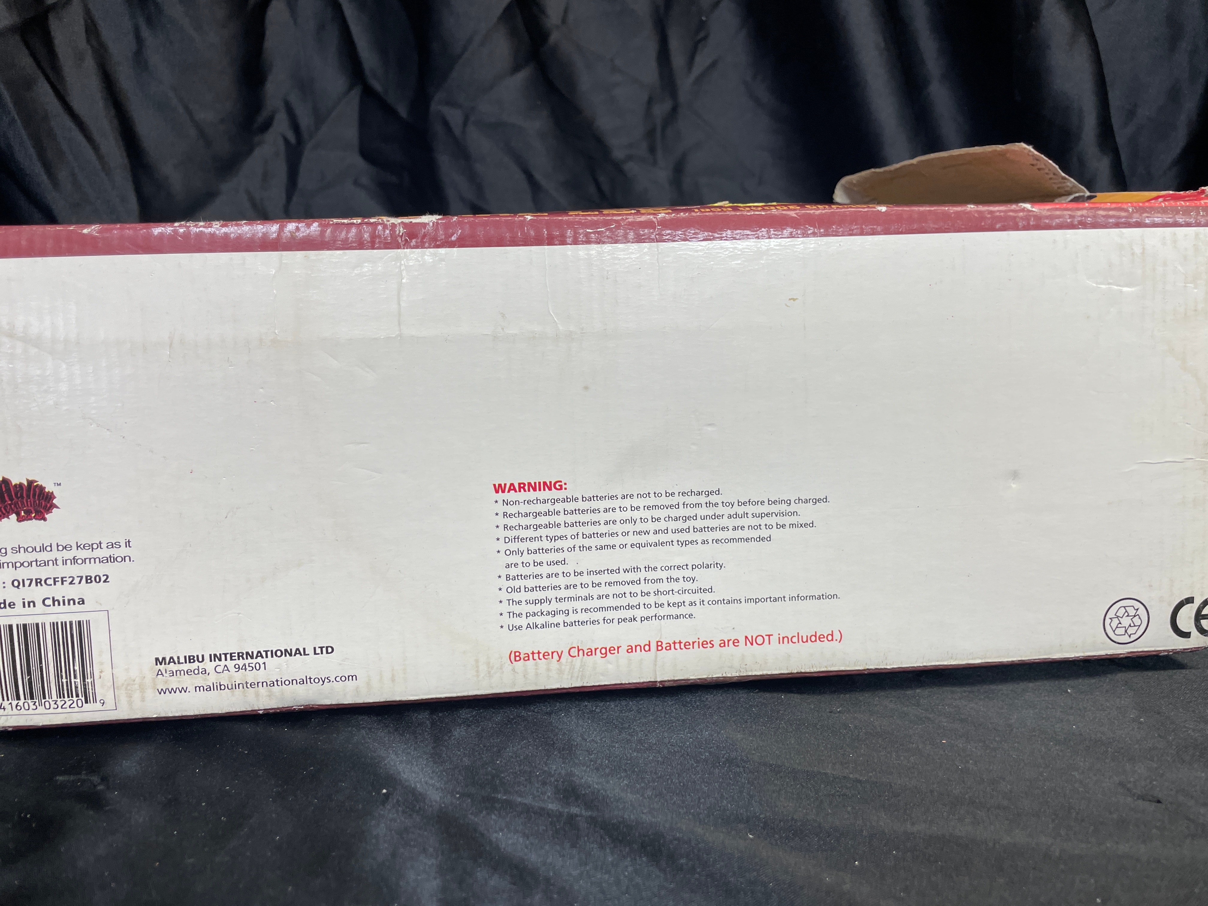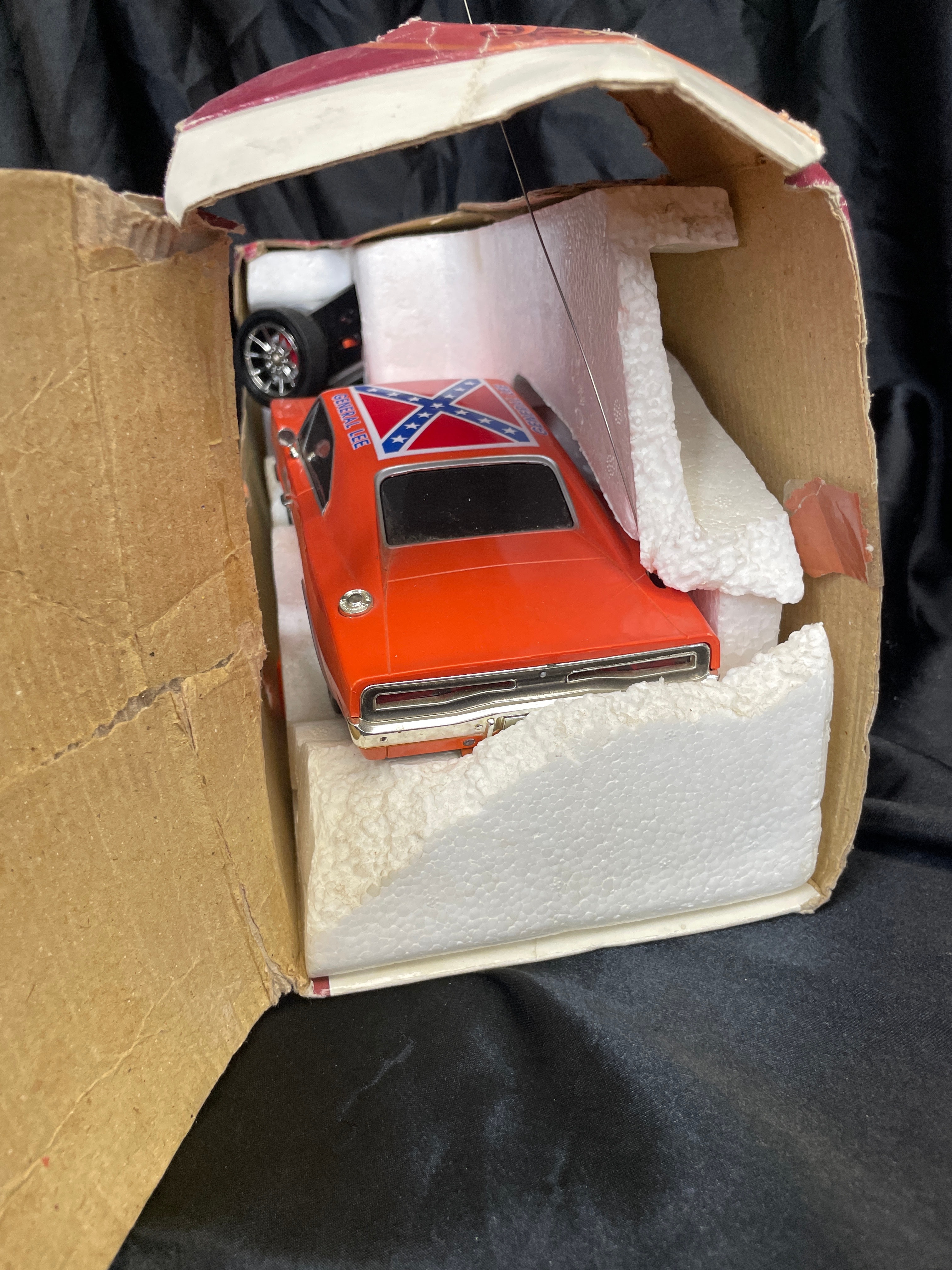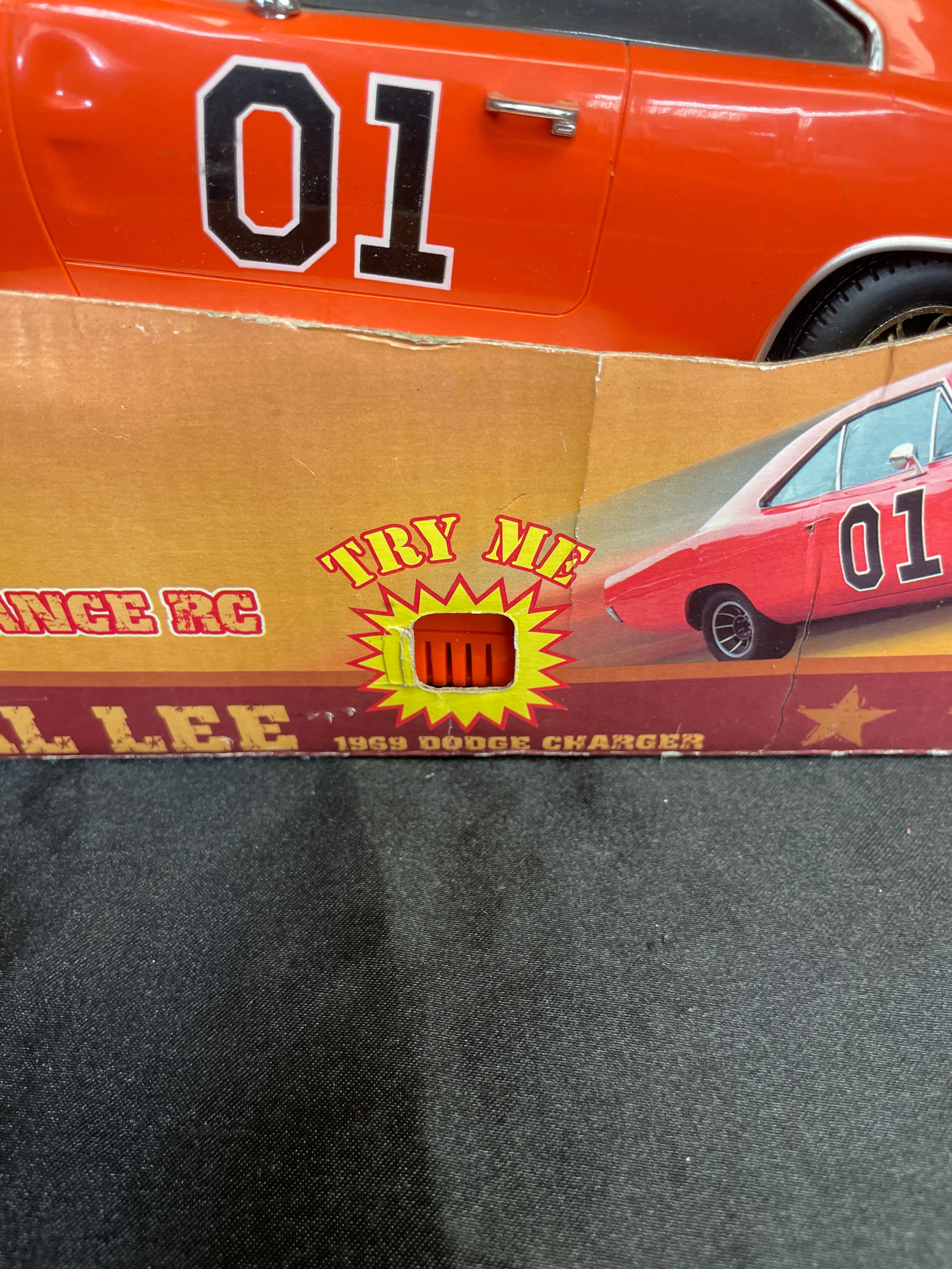 A remote control toy vehicle, identified as the “General Lee” 1969 Dodge Charger from “The Dukes of Hazzard, ” produced under license by Malibu International Limited. The bright orange model features the number “01” on its doors and a Confederate battle flag design on the roof. It is presented in its original cardboard box with molded Styrofoam inserts, accompanied by its black remote control unit. The packaging displays “The Dukes of Hazzard” branding, images of the cast, and text indicating it is a “HIGH PERFORMANCE RC” operating at “27 MHZ.” Copyright information on the box dates its licensing to 2005 by Warner Bros. Entertainment Inc. and DaimlerChrysler Corporation (2005) via Malibu International Limited.