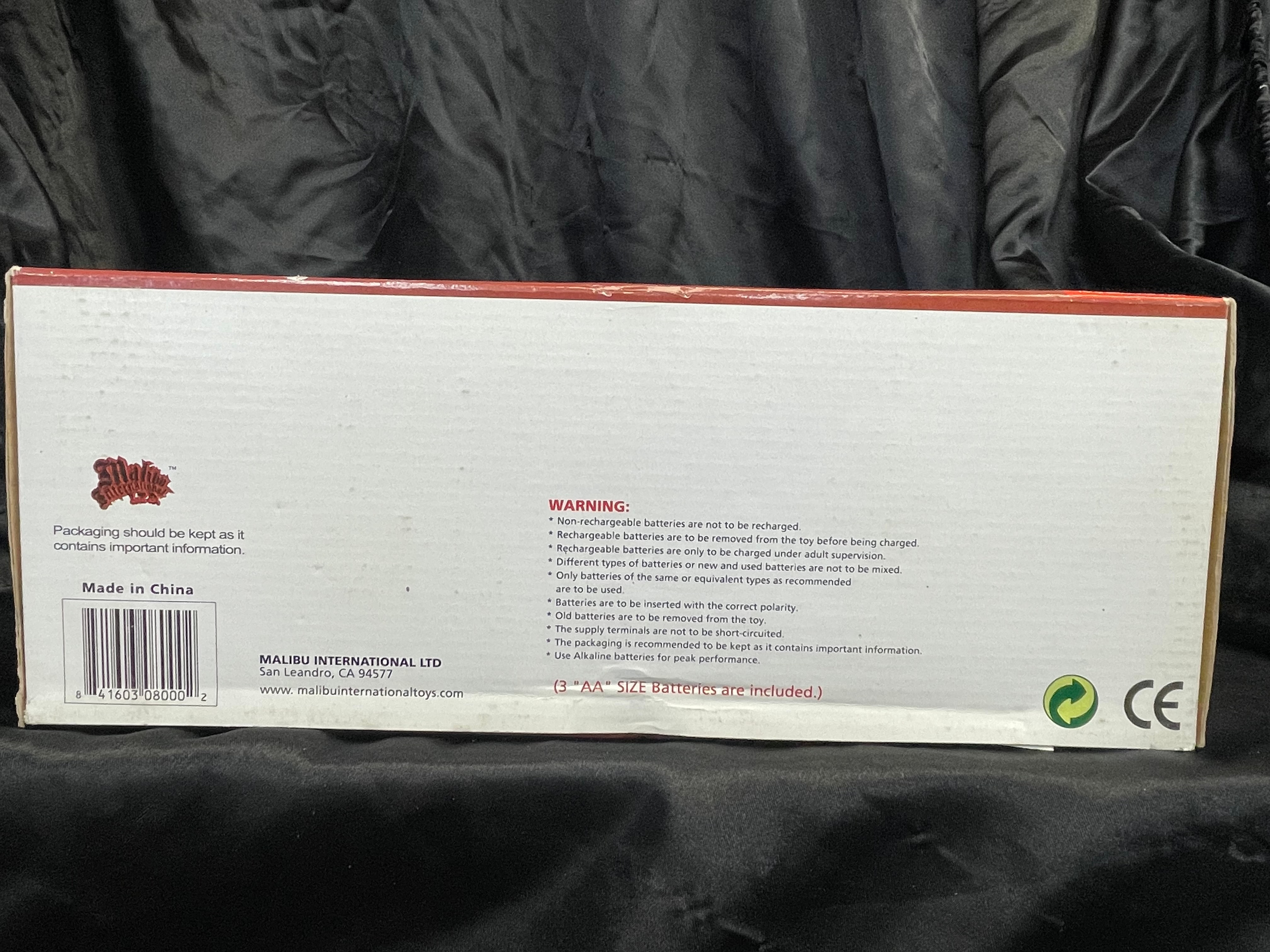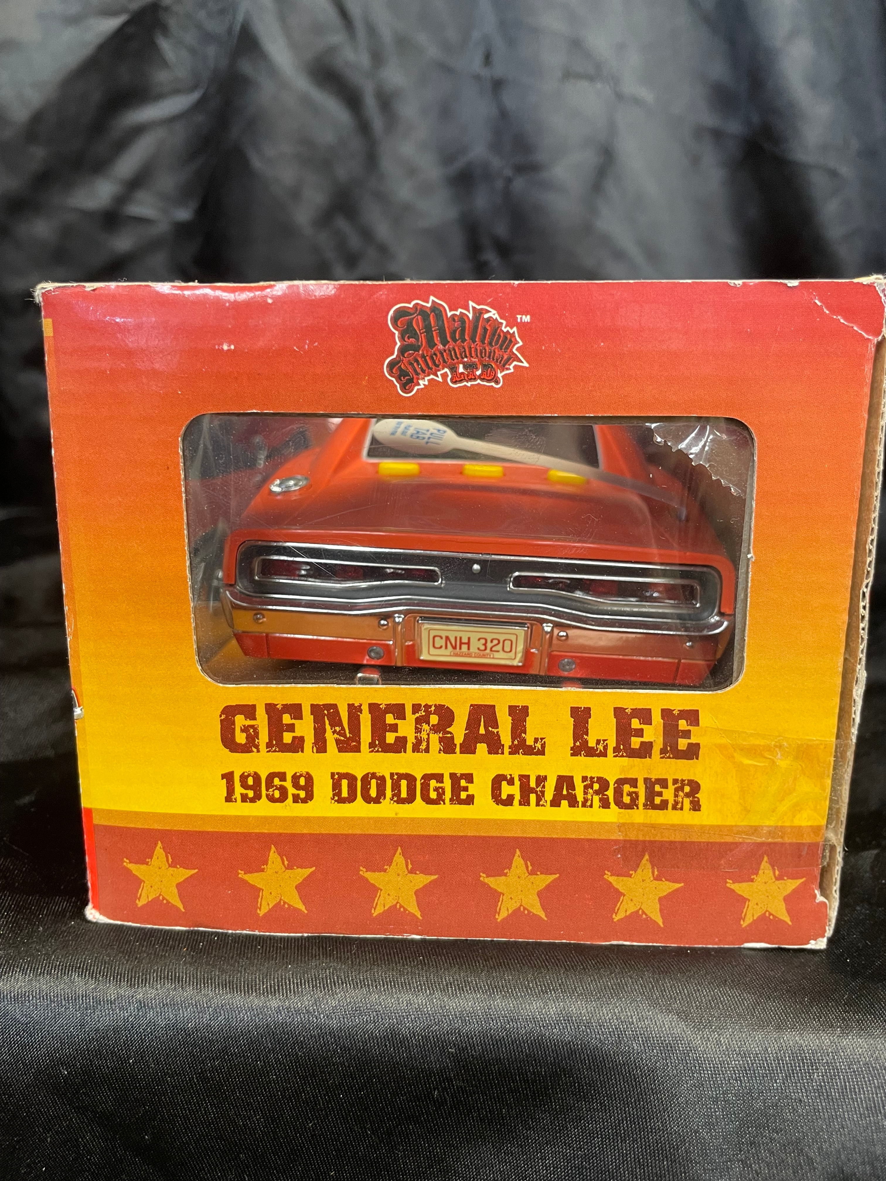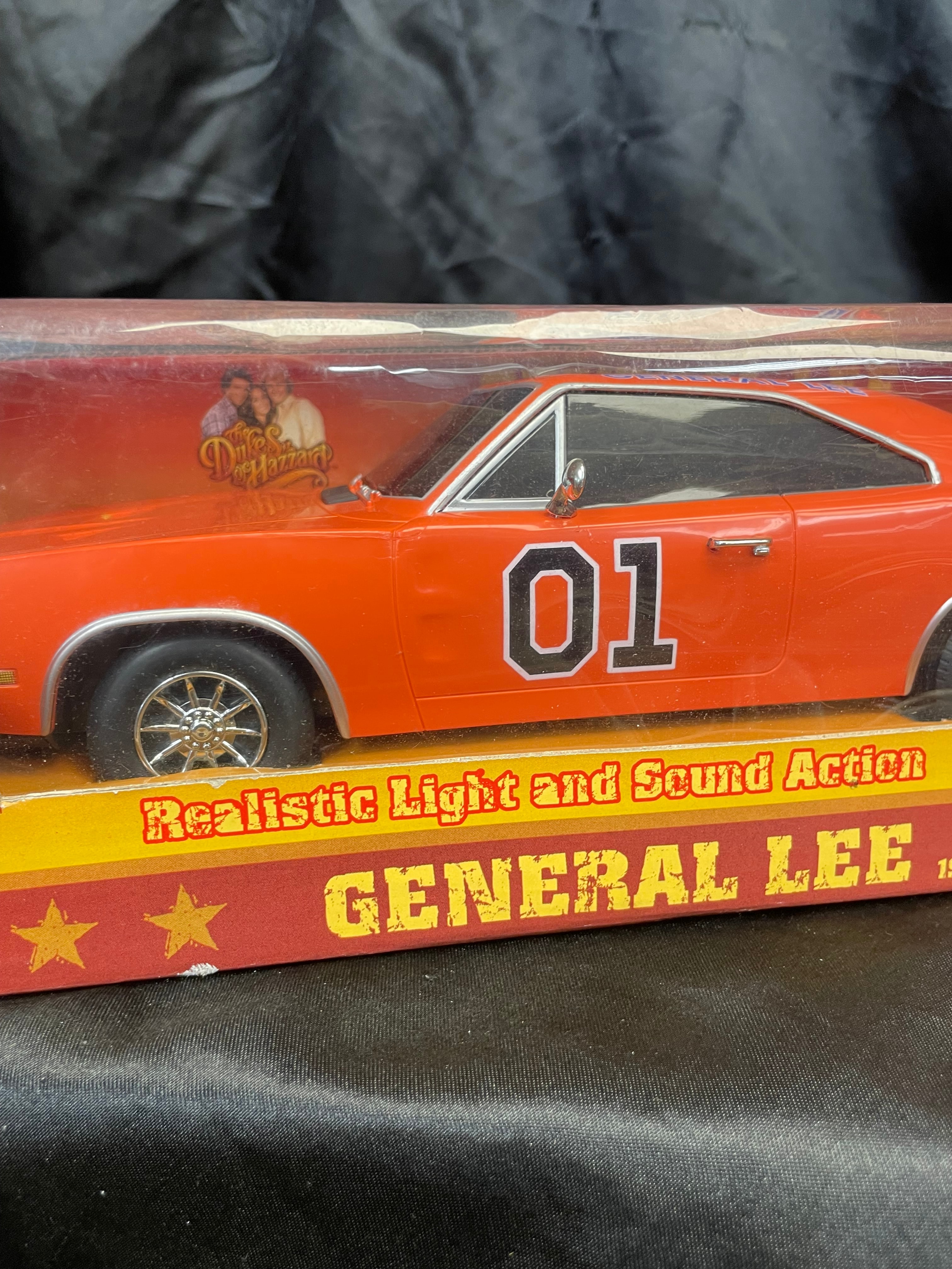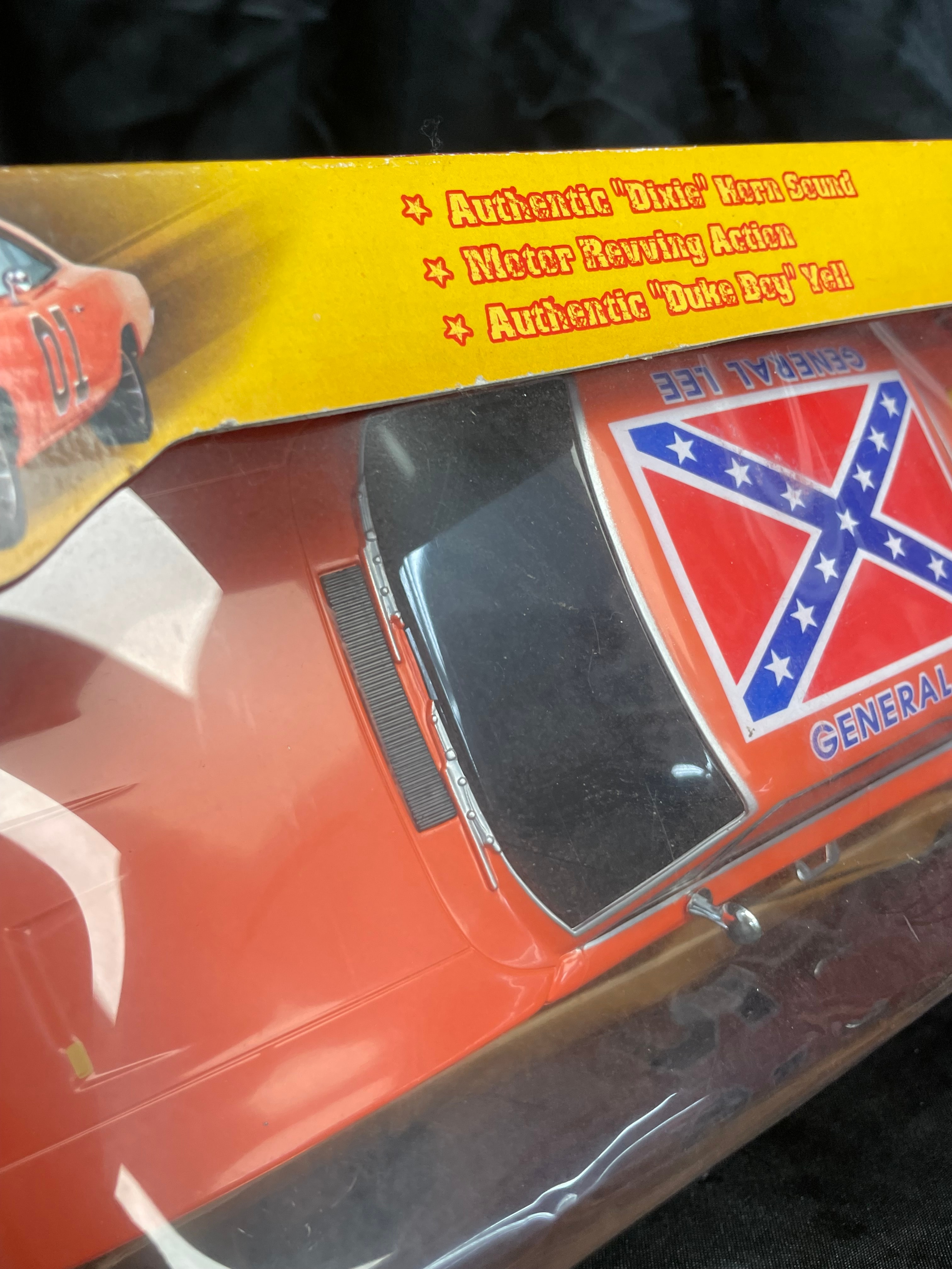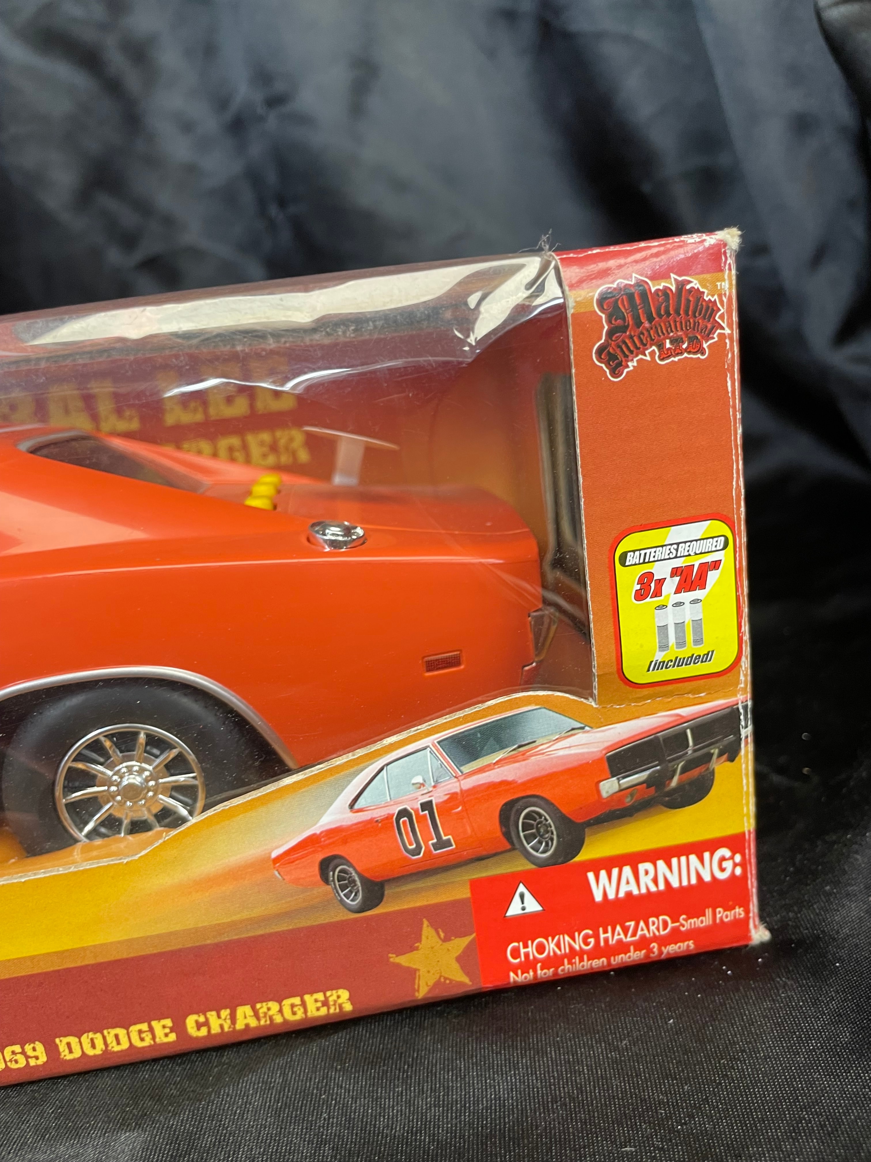 A Malibu International 1:18 scale model car, replicating the iconic “General Lee” 1969 Dodge Charger from “The Dukes of Hazzard” television series. The model is presented new in its original cardboard and clear plastic window packaging. The orange-colored plastic and die-cast car features the number “01” on its doors, “GENERAL LEE” lettering, and a Confederate battle flag emblem on its roof. It is also detailed with a “CNH 320 Hazzard County” license plate. The packaging indicates “Realistic Light and Sound Action,” including “Authentic ‘Dixie’ Horn Sound,” “Motor Revving Action,” and “Authentic ‘Duke Boy’ Yell,” powered by three ‘AA’ batteries (noted as included). Additional markings on the packaging include “The Dukes of Hazzard” branding, “Malibu Internationalâ„¢” logo, “ITEM# 08000,” an age recommendation of “8+,” a choking hazard warning, and “Made in China.”
