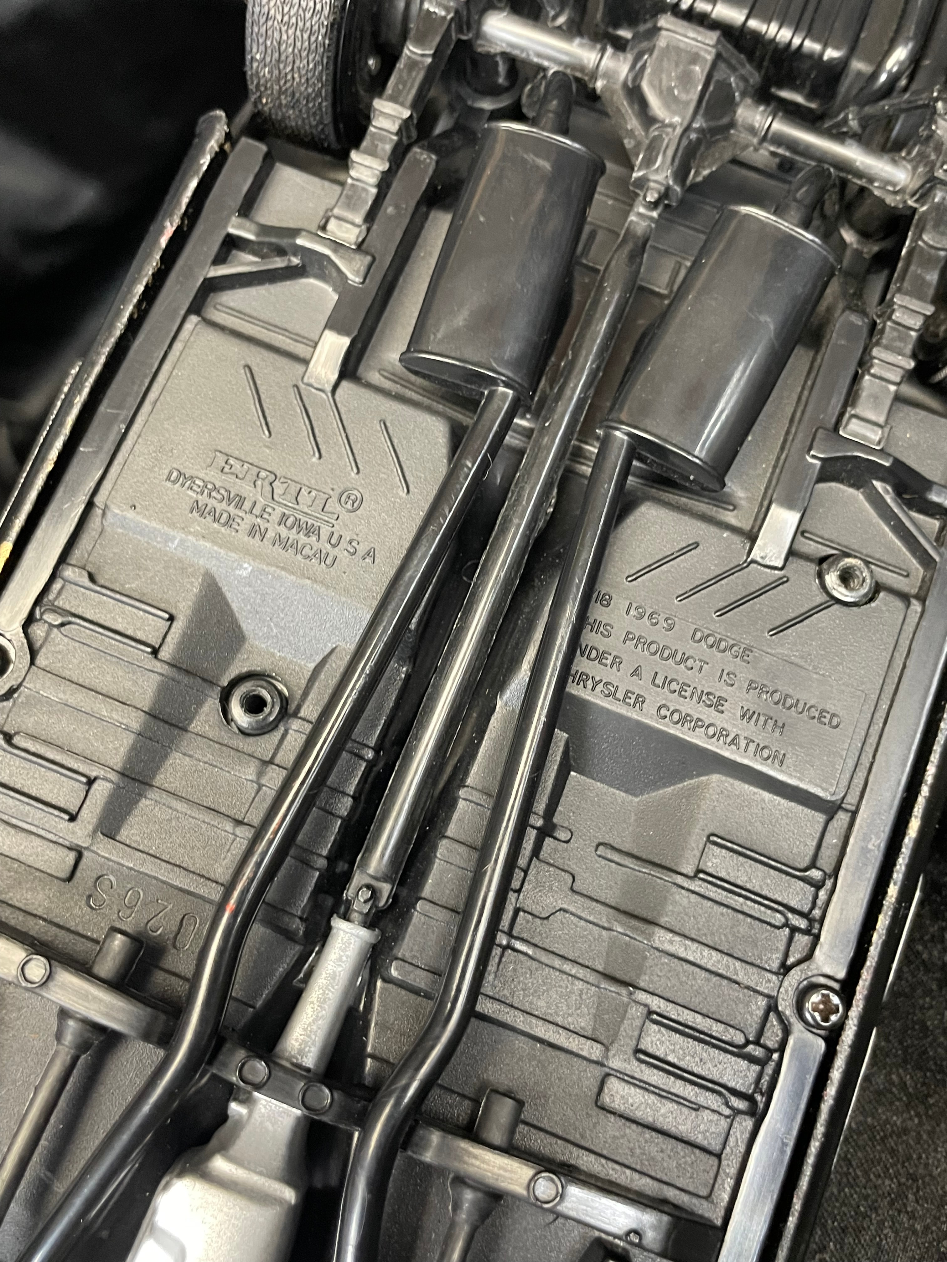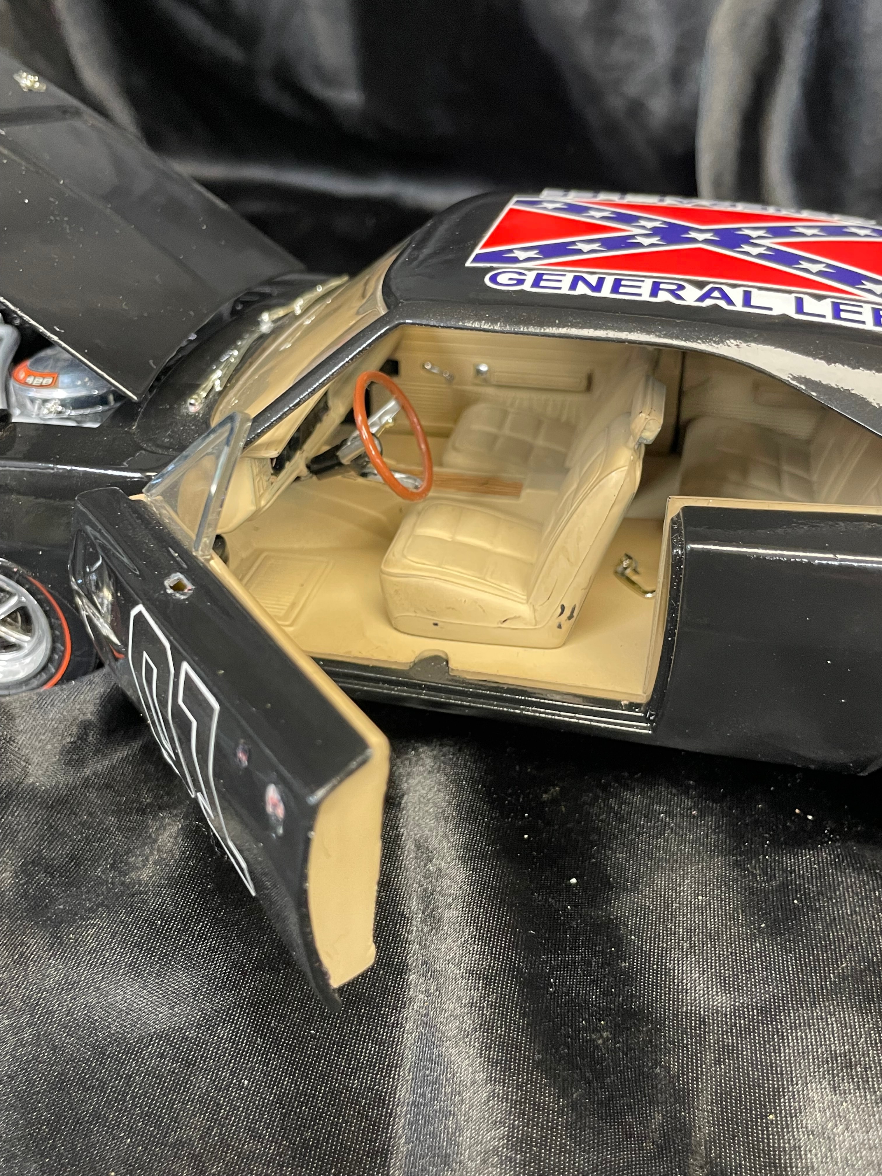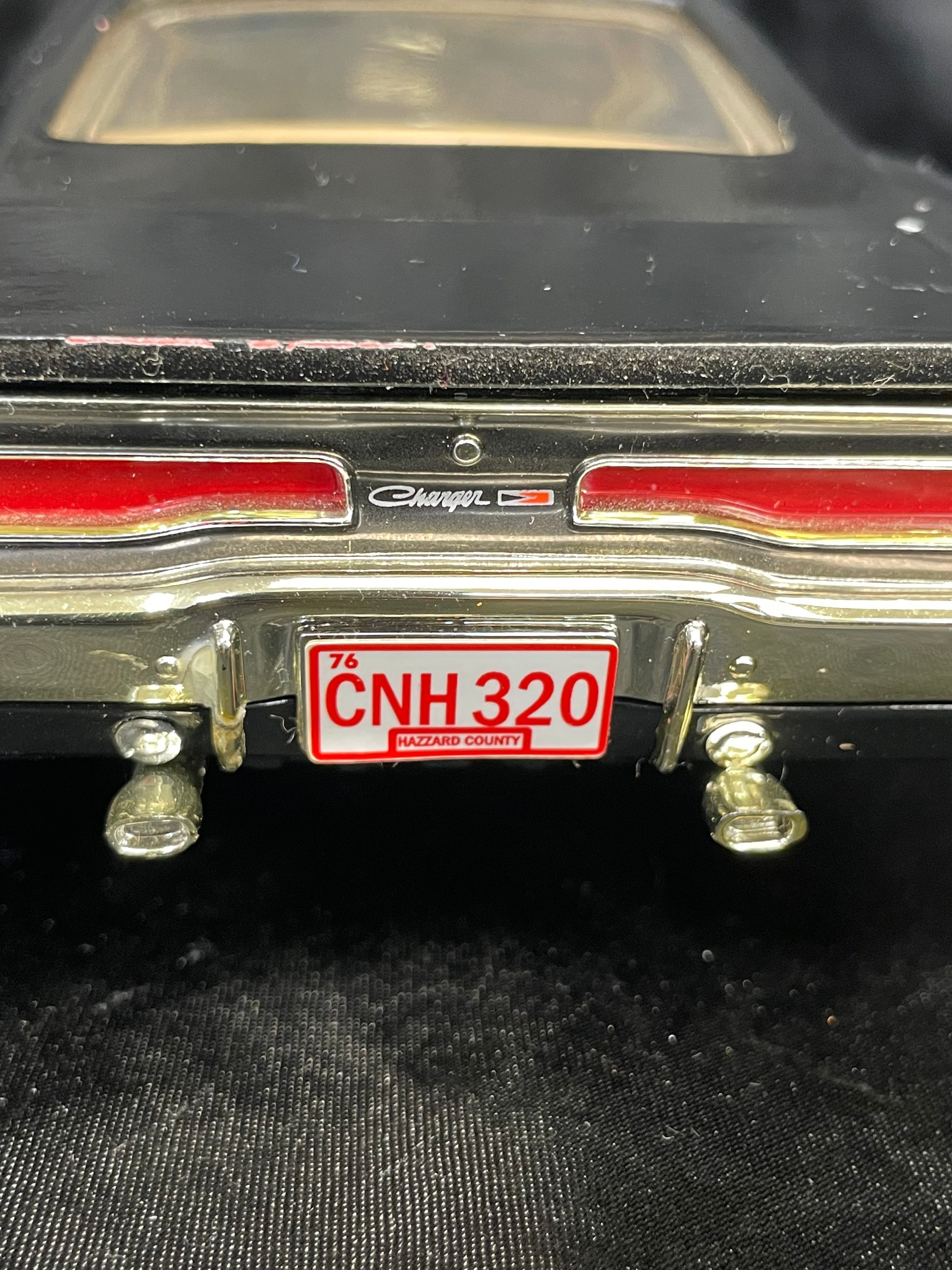 An ERTL 1969 Dodge Charger ‘General Lee’ die-cast model car, produced under license with Chrysler Corporation. This detailed replica features a black finish with a Confederate battle flag and “GENERAL LEE” text on the roof, “01” and “HEMI” decals on the doors, and a rear license plate reading “76 CNH 320 HAZZARD COUNTY” with “Charger” badging. The engine bay contains a “426 HEMI HEAD” marked engine, and the interior is finished in a tan/beige color. The undercarriage is marked “ERTLE / DYERSVILLE IOWA U.S.A. / MADE IN MACAU” and “COPYRIGHT 1969 DODGE / THIS PRODUCT IS PRODUCED UNDER A LICENSE WITH CHRYSLER CORPORATION.” The model is primarily composed of metal and plastic.