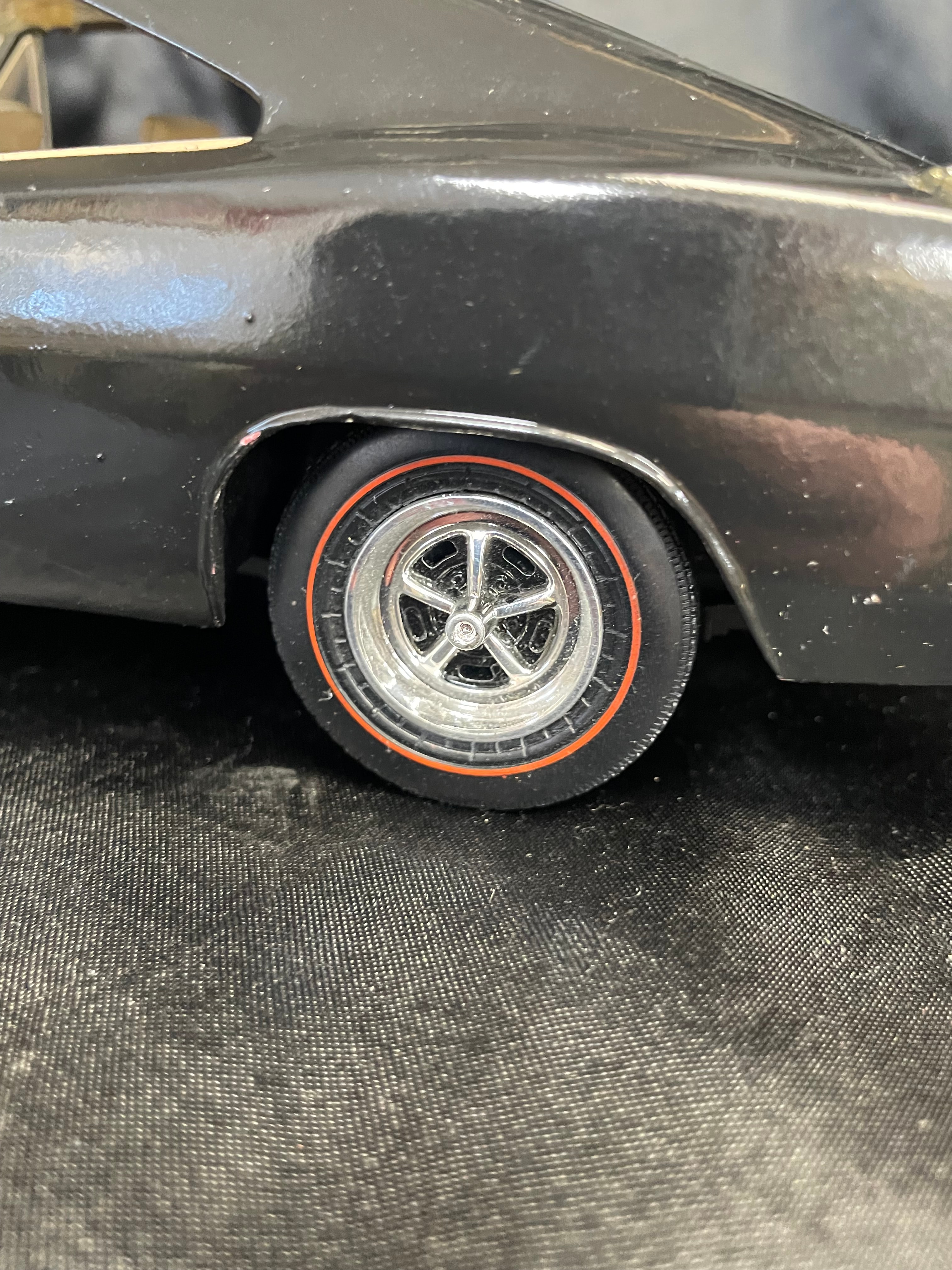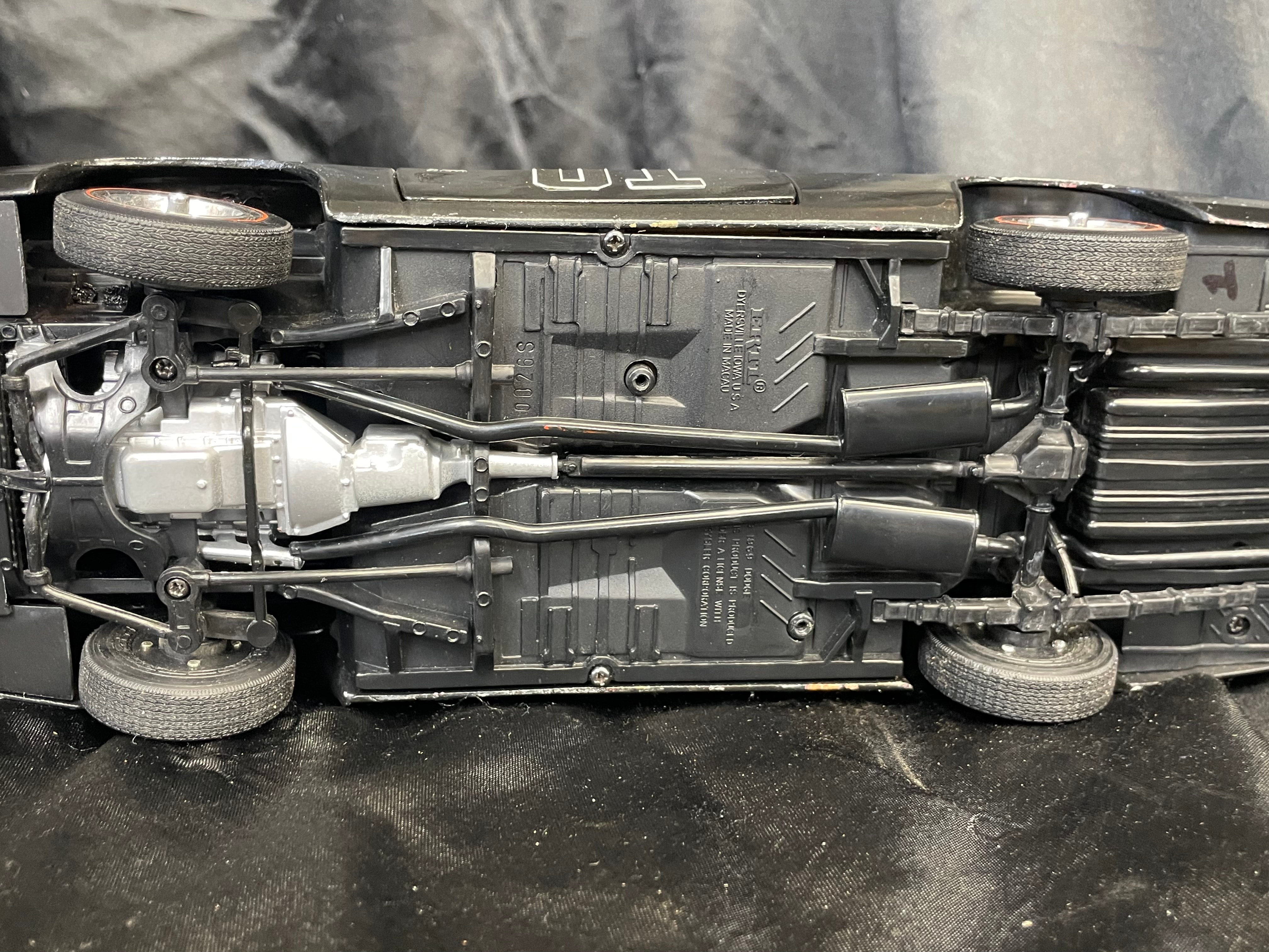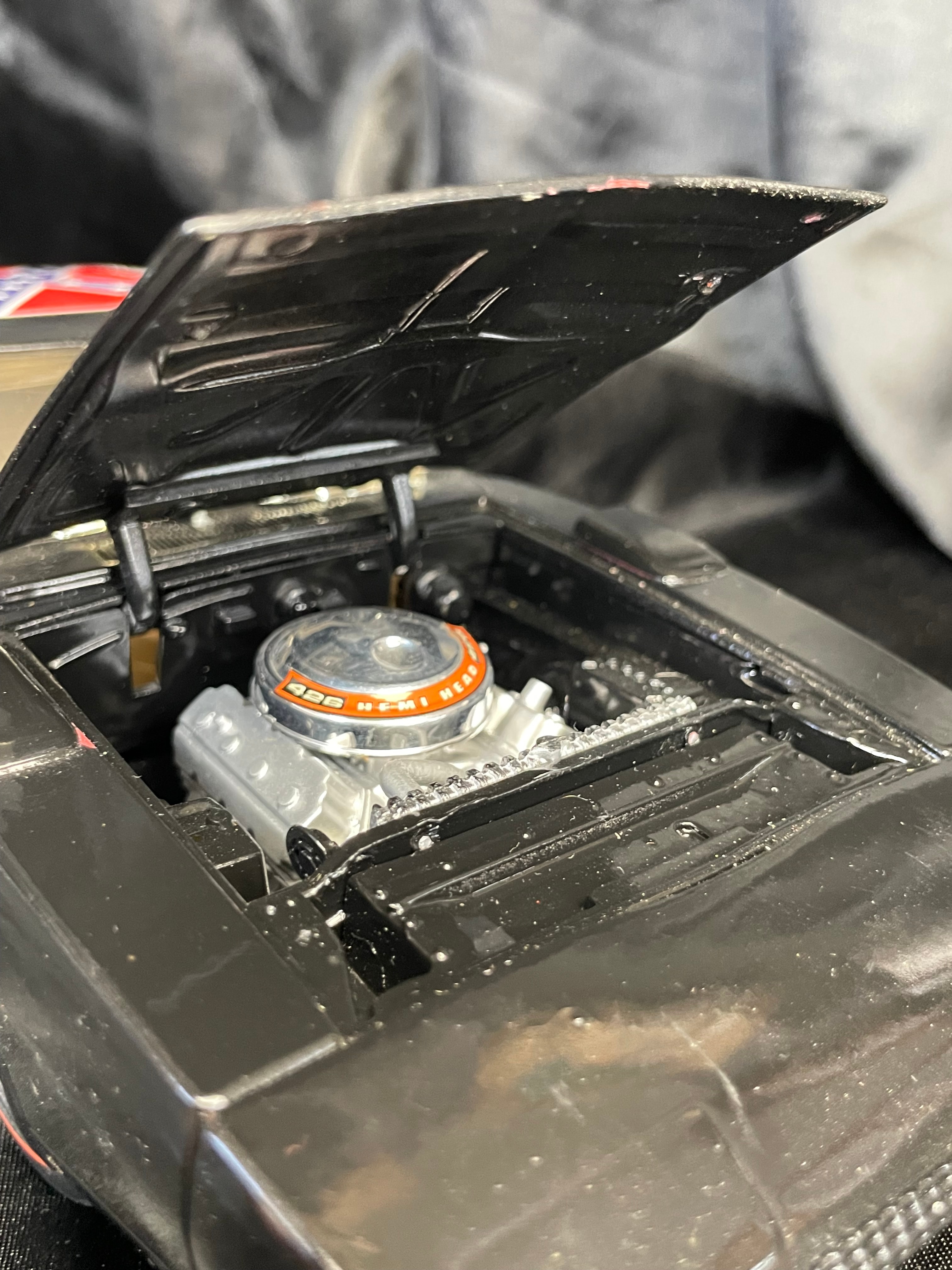 An ERTL 1969 Dodge Charger ‘General Lee’ die-cast model car, produced under license with Chrysler Corporation. This detailed replica features a black finish with a Confederate battle flag and “GENERAL LEE” text on the roof, “01” and “HEMI” decals on the doors, and a rear license plate reading “76 CNH 320 HAZZARD COUNTY” with “Charger” badging. The engine bay contains a “426 HEMI HEAD” marked engine, and the interior is finished in a tan/beige color. The undercarriage is marked “ERTLE / DYERSVILLE IOWA U.S.A. / MADE IN MACAU” and “COPYRIGHT 1969 DODGE / THIS PRODUCT IS PRODUCED UNDER A LICENSE WITH CHRYSLER CORPORATION.” The model is primarily composed of metal and plastic.