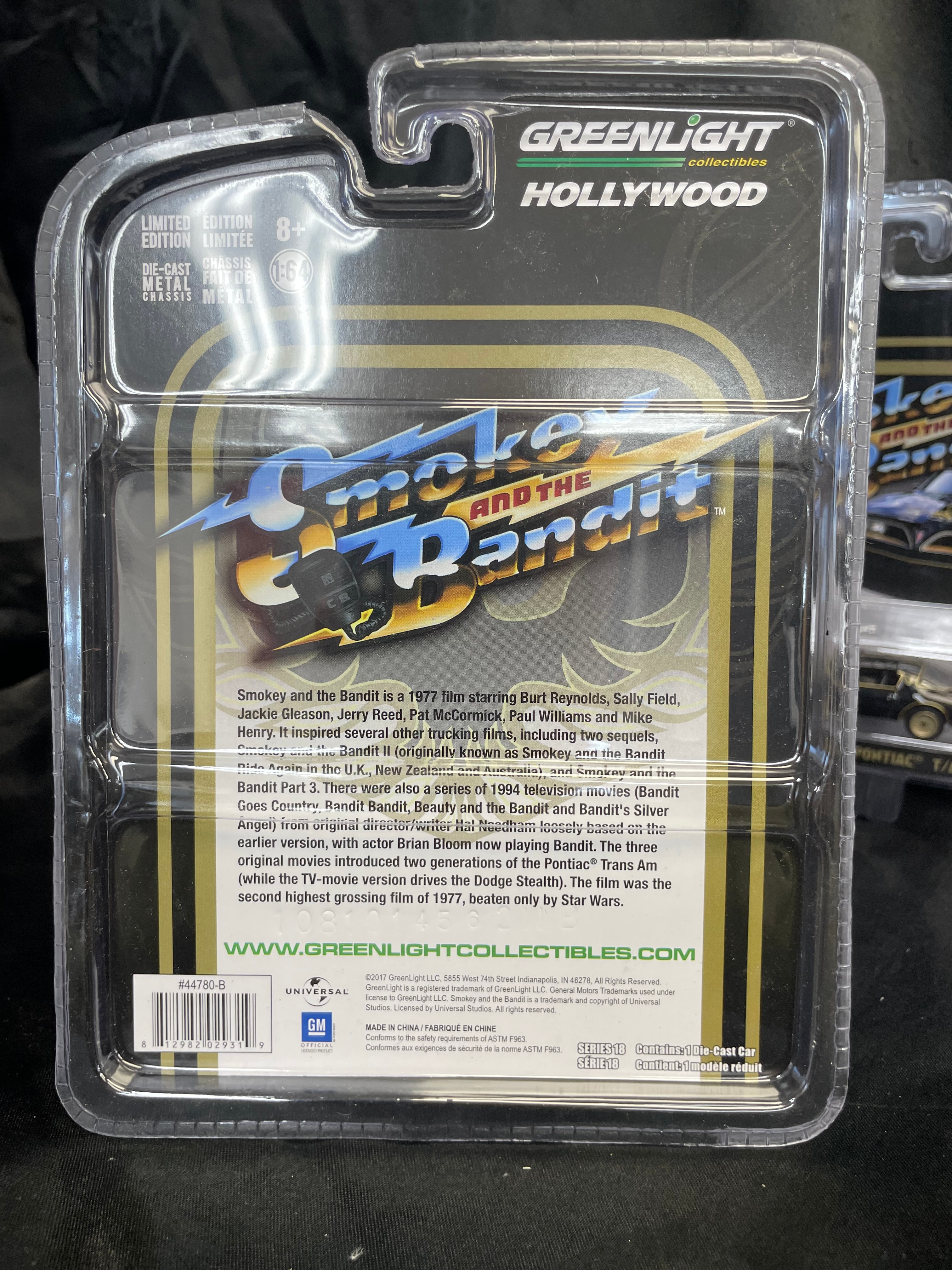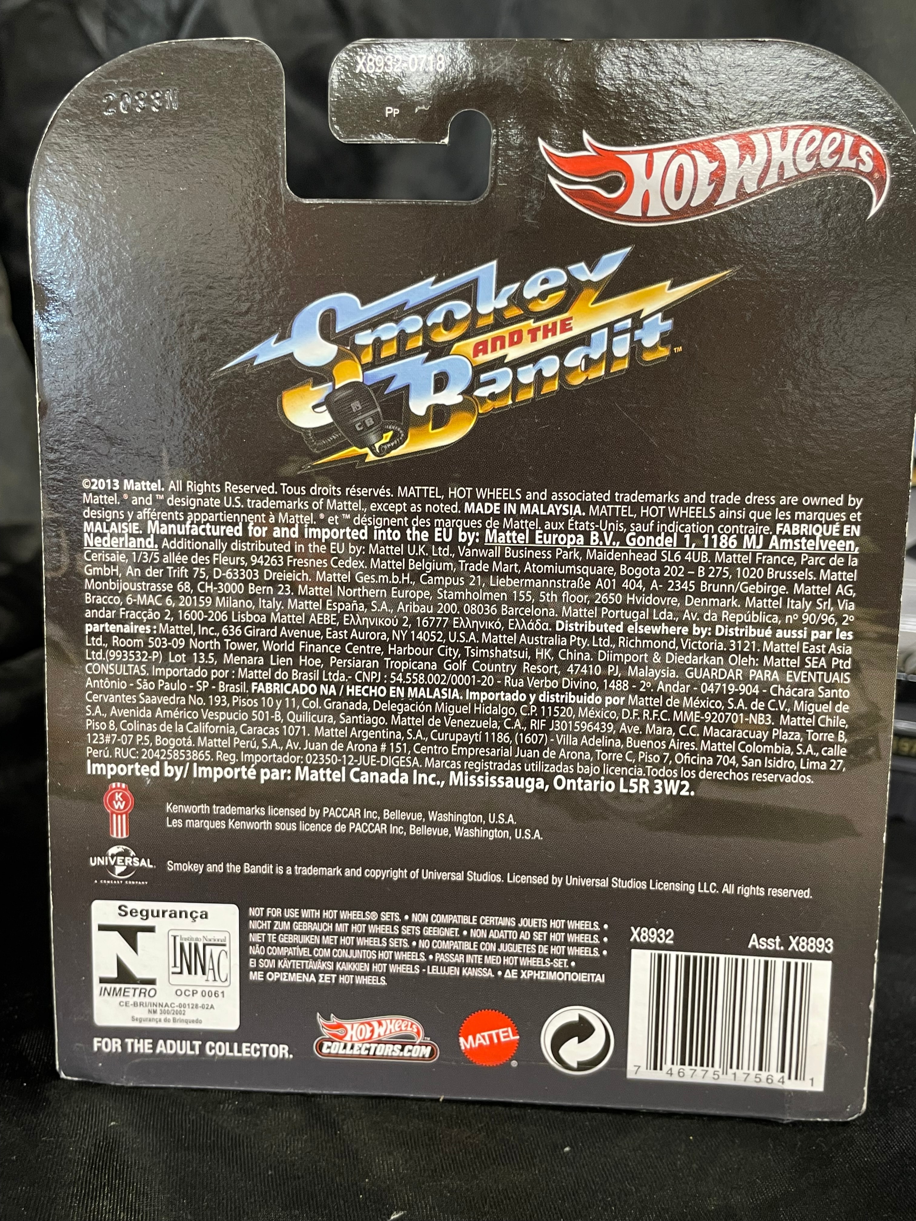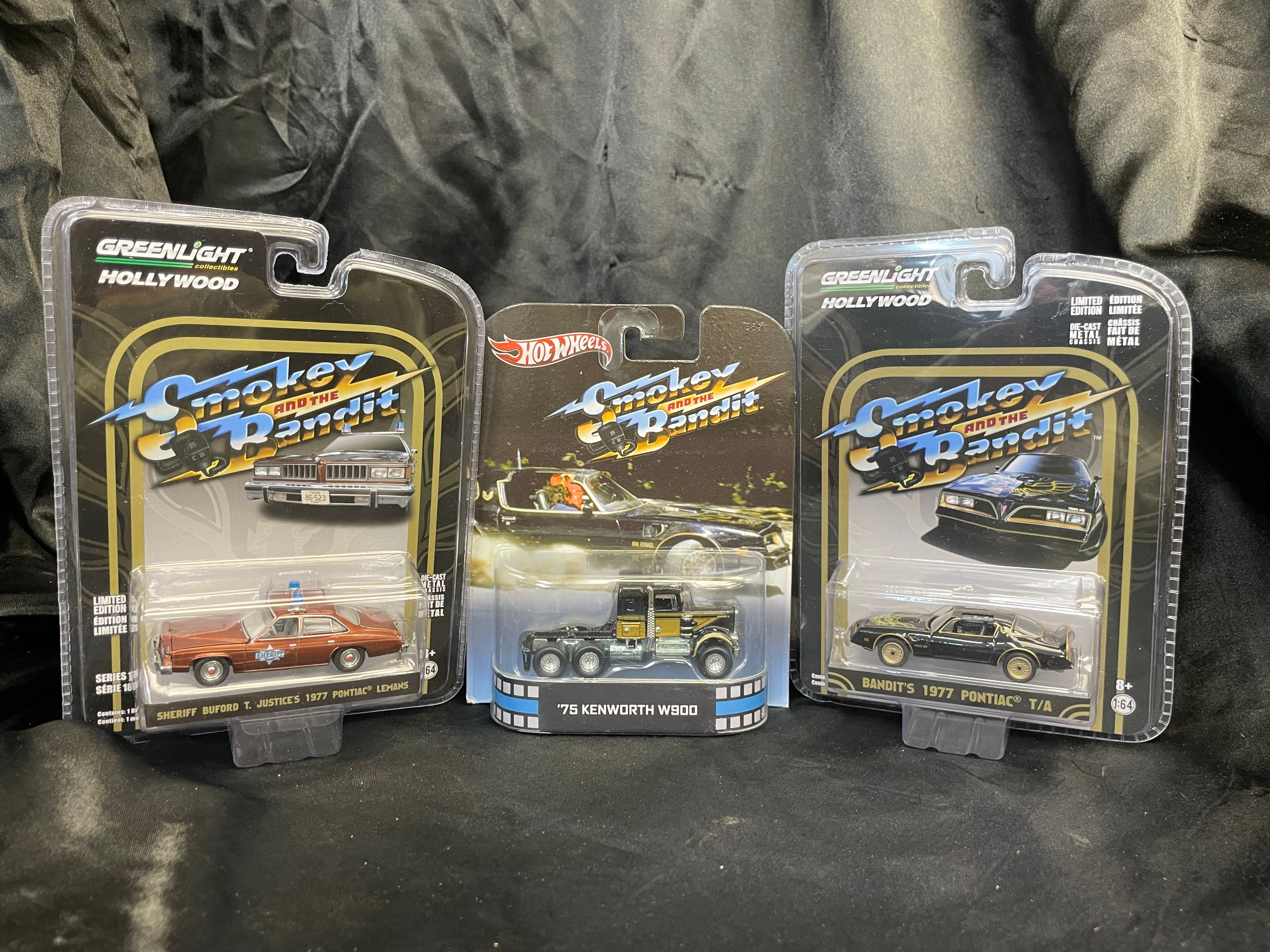 A group of three modern collectible die-cast miniature vehicles, all themed around the “Smokey and the Bandit” movie franchise. The lot includes one Hot Wheels Retro Entertainment ’75 Kenworth W900 semi-truck cab in black and gold. Accompanying this are two “GREENLIGHT HOLLYWOOD” branded 1:64 scale vehicles: a brown “SHERIFF BUFORD T. JUSTICE’S 1977 PONTIAC LEMANS” sedan with police lights, and a black “BANDIT’S 1977 PONTIAC T/A” coupe with gold accents. Both Greenlight items feature a DIE-CAST METAL CHASSIS METAL. All three items are sealed in their original blister packaging, which prominently displays the “Smokey and the Bandit” logo and an “8+” age rating. The packaging also includes various manufacturer details, with the Greenlight items indicating “Made in China” and the Hot Wheels item stating “Made in Malaysia.” Visible multilingual text on the packaging includes “LIMITED EDITION LIMITEE” and “Contient 1 véhicule réduit.”