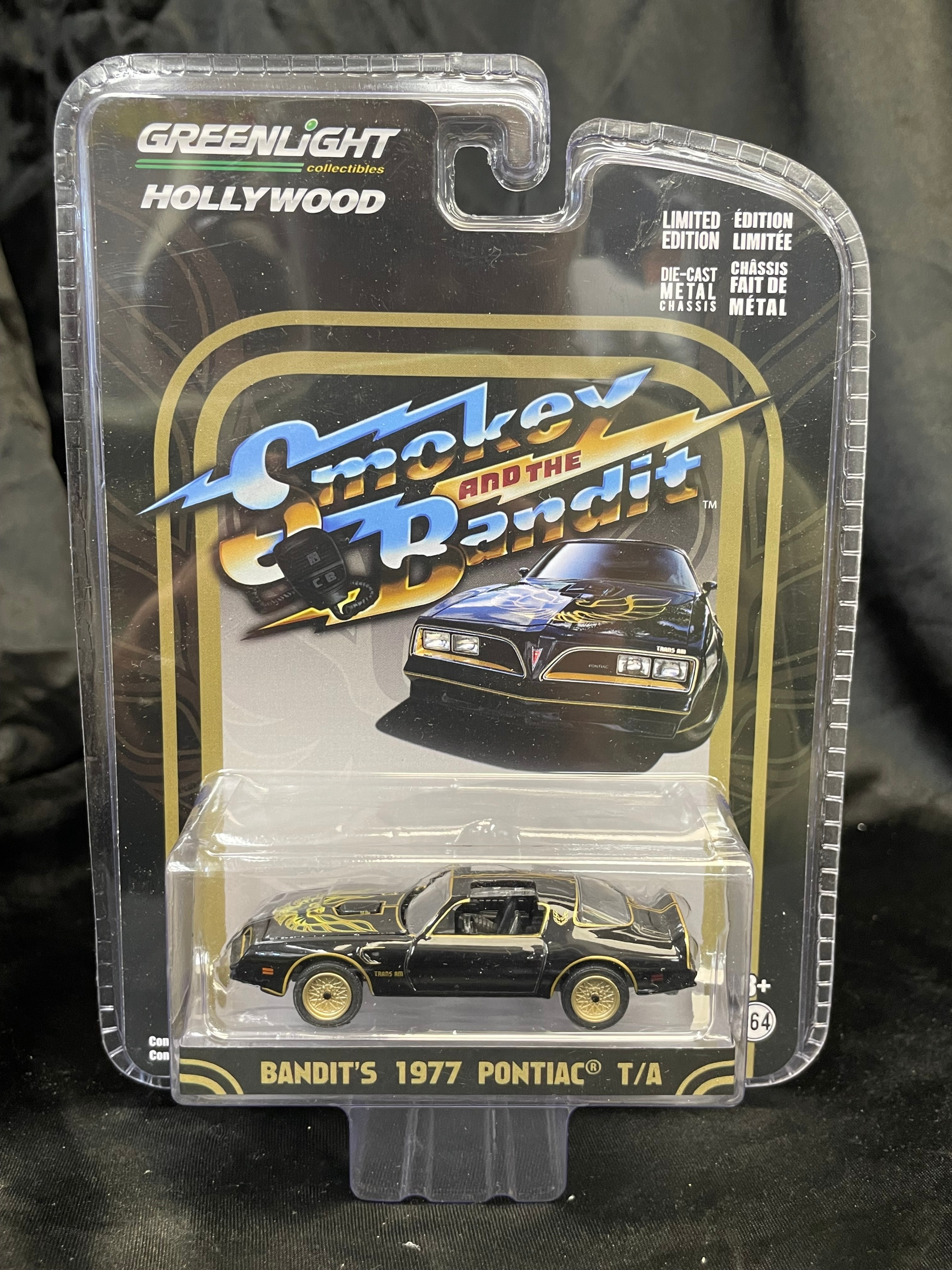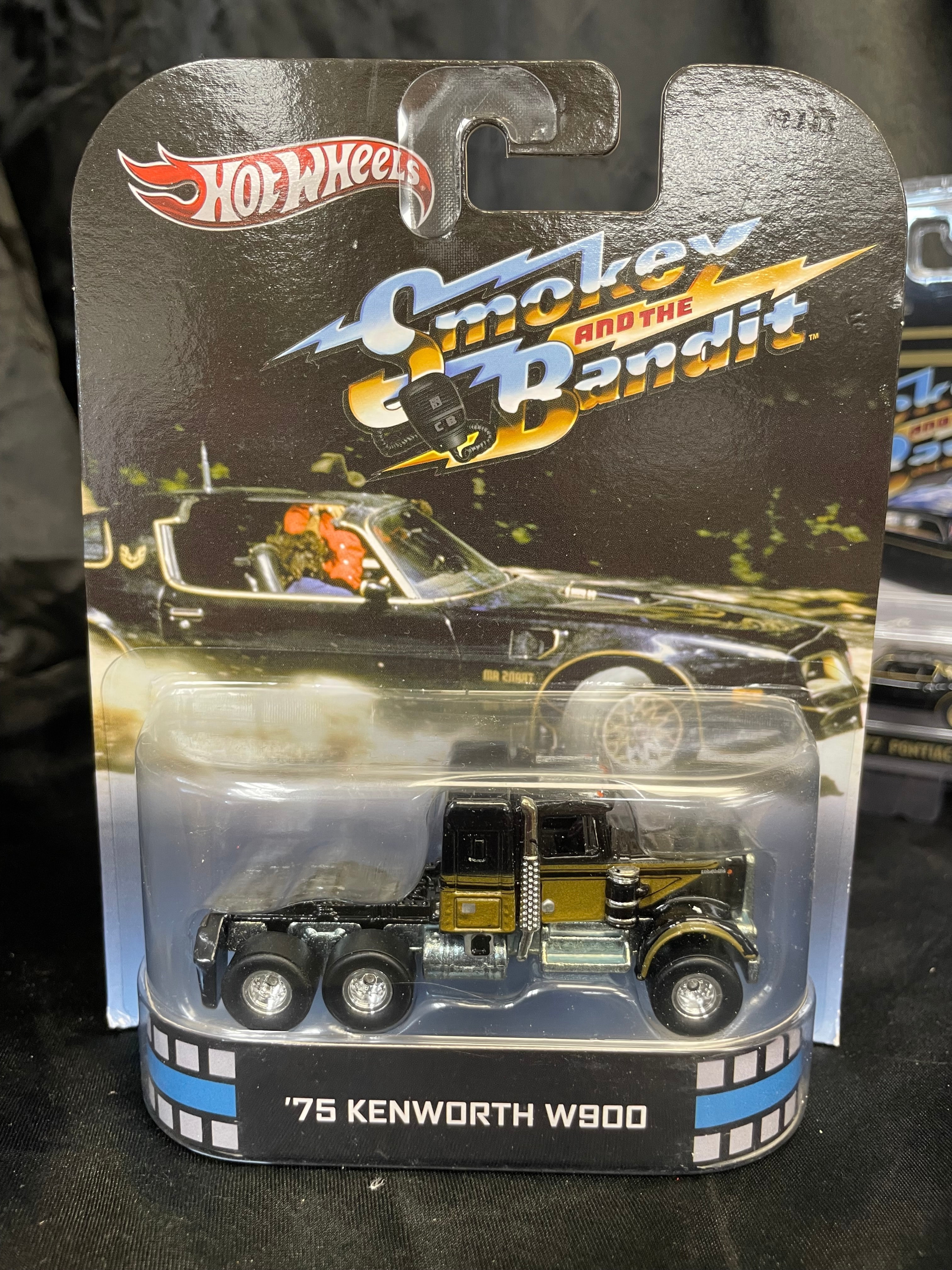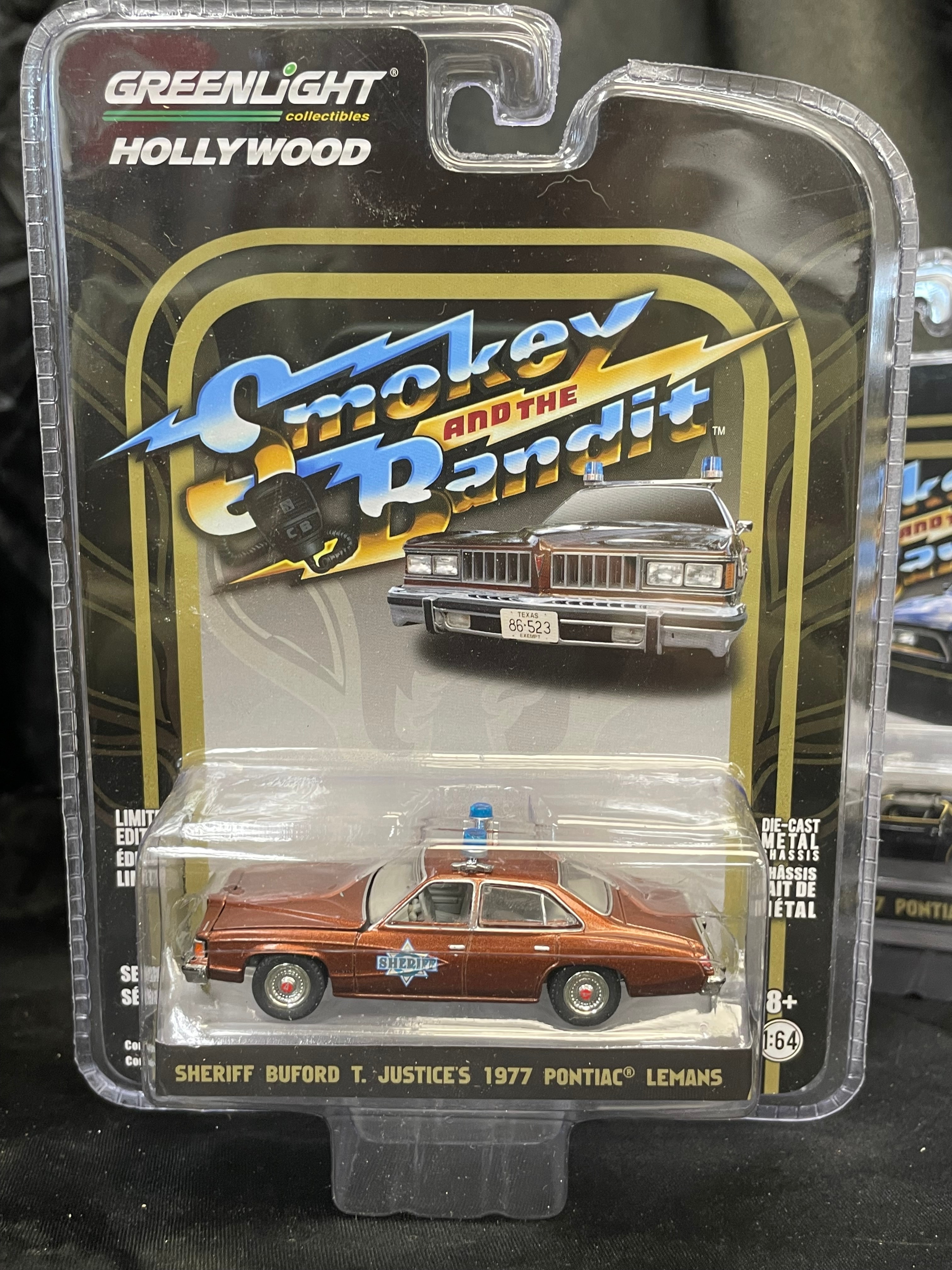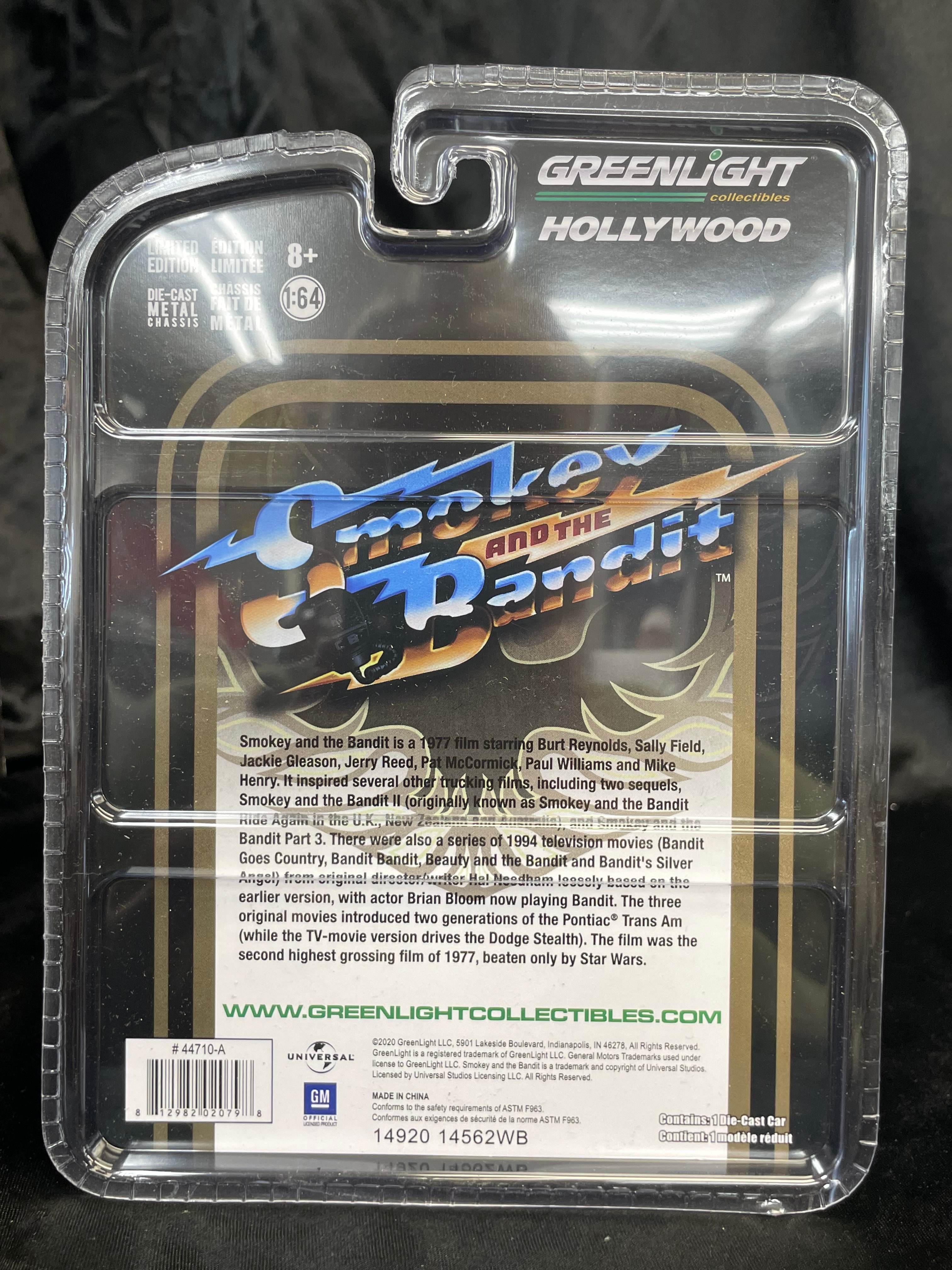 A group of three modern collectible die-cast miniature vehicles, all themed around the “Smokey and the Bandit” movie franchise. The lot includes one Hot Wheels Retro Entertainment ’75 Kenworth W900 semi-truck cab in black and gold. Accompanying this are two “GREENLIGHT HOLLYWOOD” branded 1:64 scale vehicles: a brown “SHERIFF BUFORD T. JUSTICE’S 1977 PONTIAC LEMANS” sedan with police lights, and a black “BANDIT’S 1977 PONTIAC T/A” coupe with gold accents. Both Greenlight items feature a DIE-CAST METAL CHASSIS METAL. All three items are sealed in their original blister packaging, which prominently displays the “Smokey and the Bandit” logo and an “8+” age rating. The packaging also includes various manufacturer details, with the Greenlight items indicating “Made in China” and the Hot Wheels item stating “Made in Malaysia.” Visible multilingual text on the packaging includes “LIMITED EDITION LIMITEE” and “Contient 1 véhicule réduit.”
