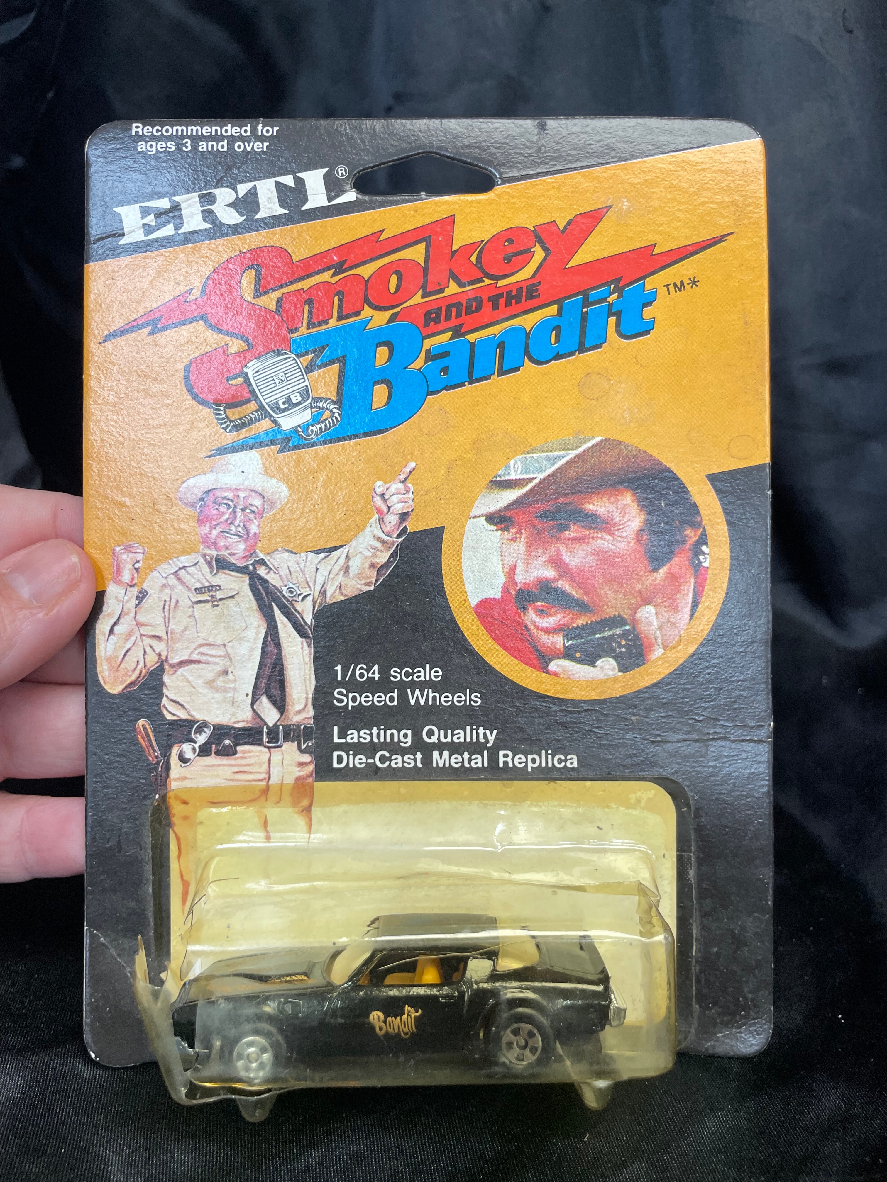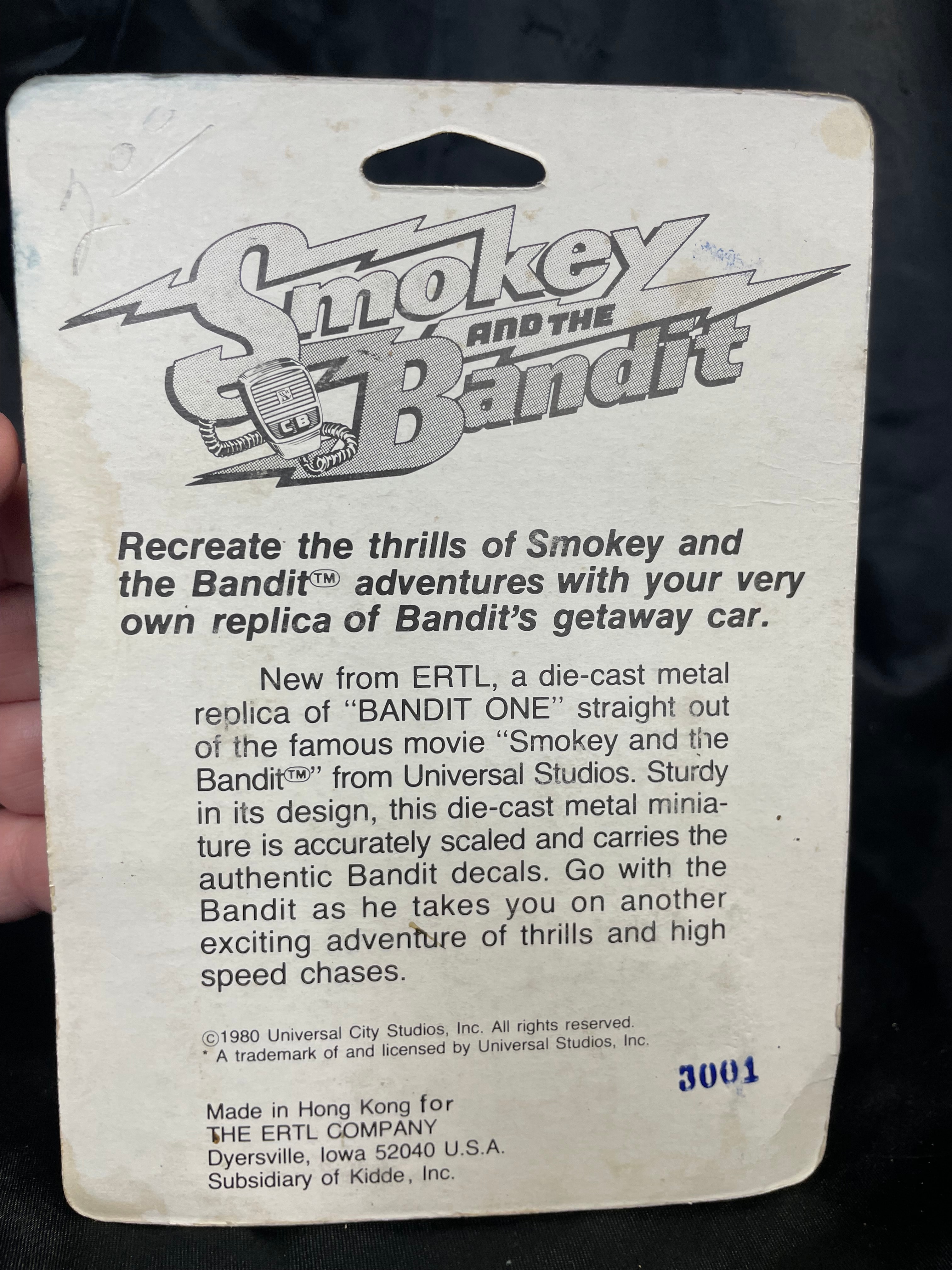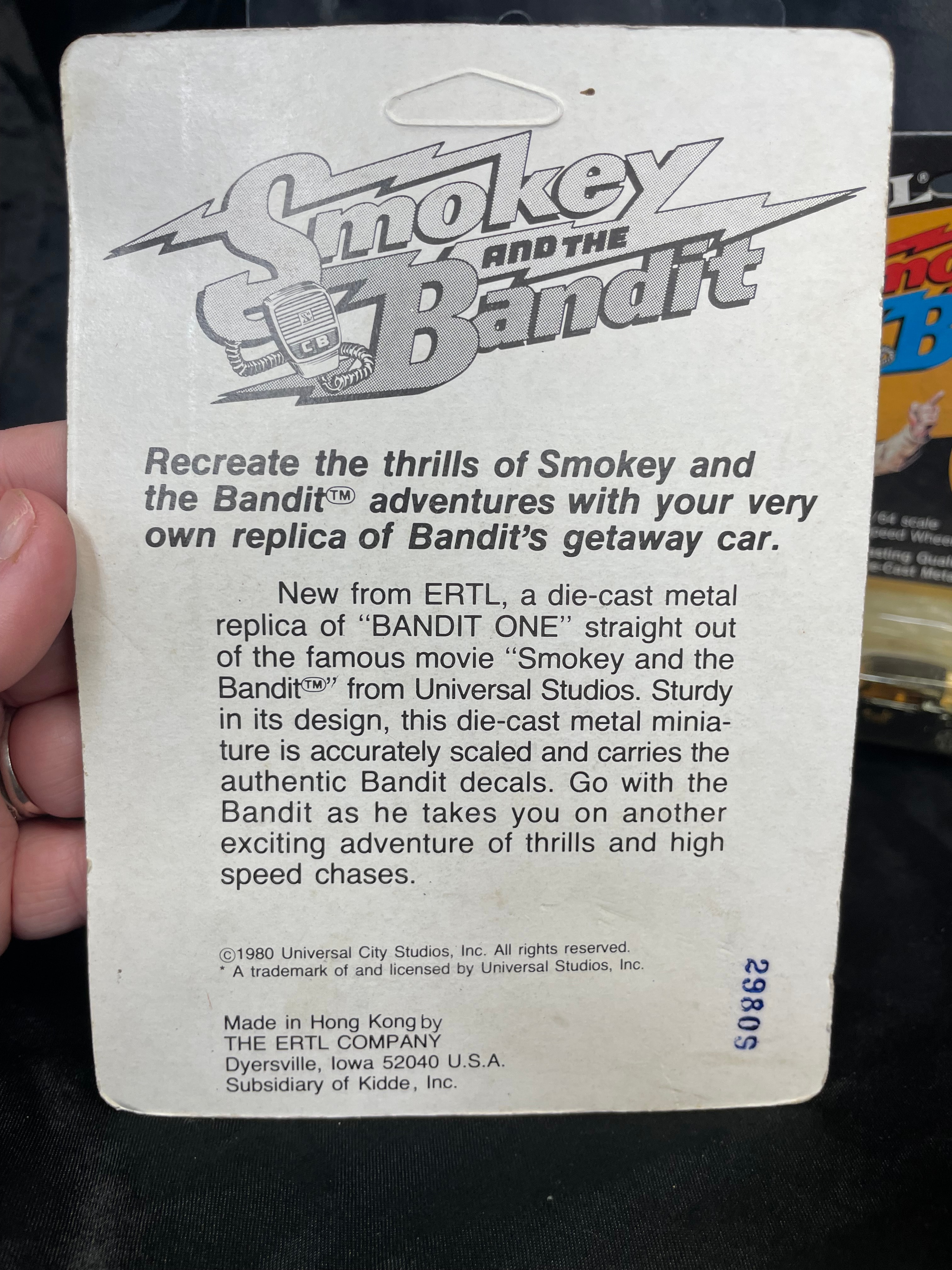 Three ERTL Smokey and the Bandit Pontiac Trans Am 1/64 scale die-cast replicas. Each black replica, depicting the ‘Bandit One’ getaway car with a prominent gold phoenix decal on the hood and “Bandit” script on the doors, is secured within a clear plastic blister or clamshell case attached to a cardboard backing. The packaging features colorful illustrations of Sheriff Buford T. Justice and Burt Reynolds as the Bandit, alongside the ‘Smokey and the Bandit’ title logo. The packaging is copyrighted “© 1980 Universal City Studios, Inc.,” indicating an early 1980s period. Text on the reverse confirms manufacturing by “THE ERTL COMPANY, Made in Hong Kong.”