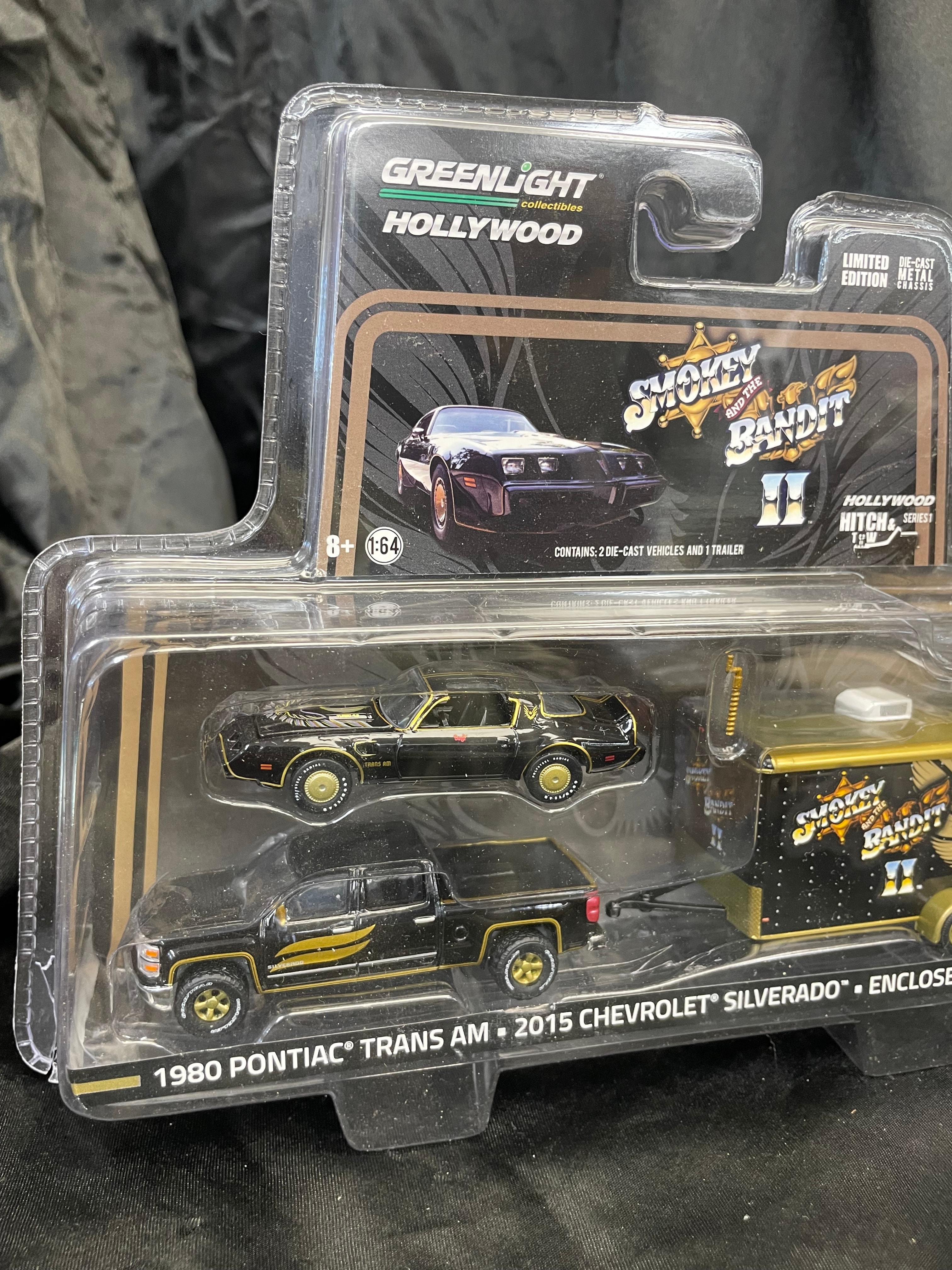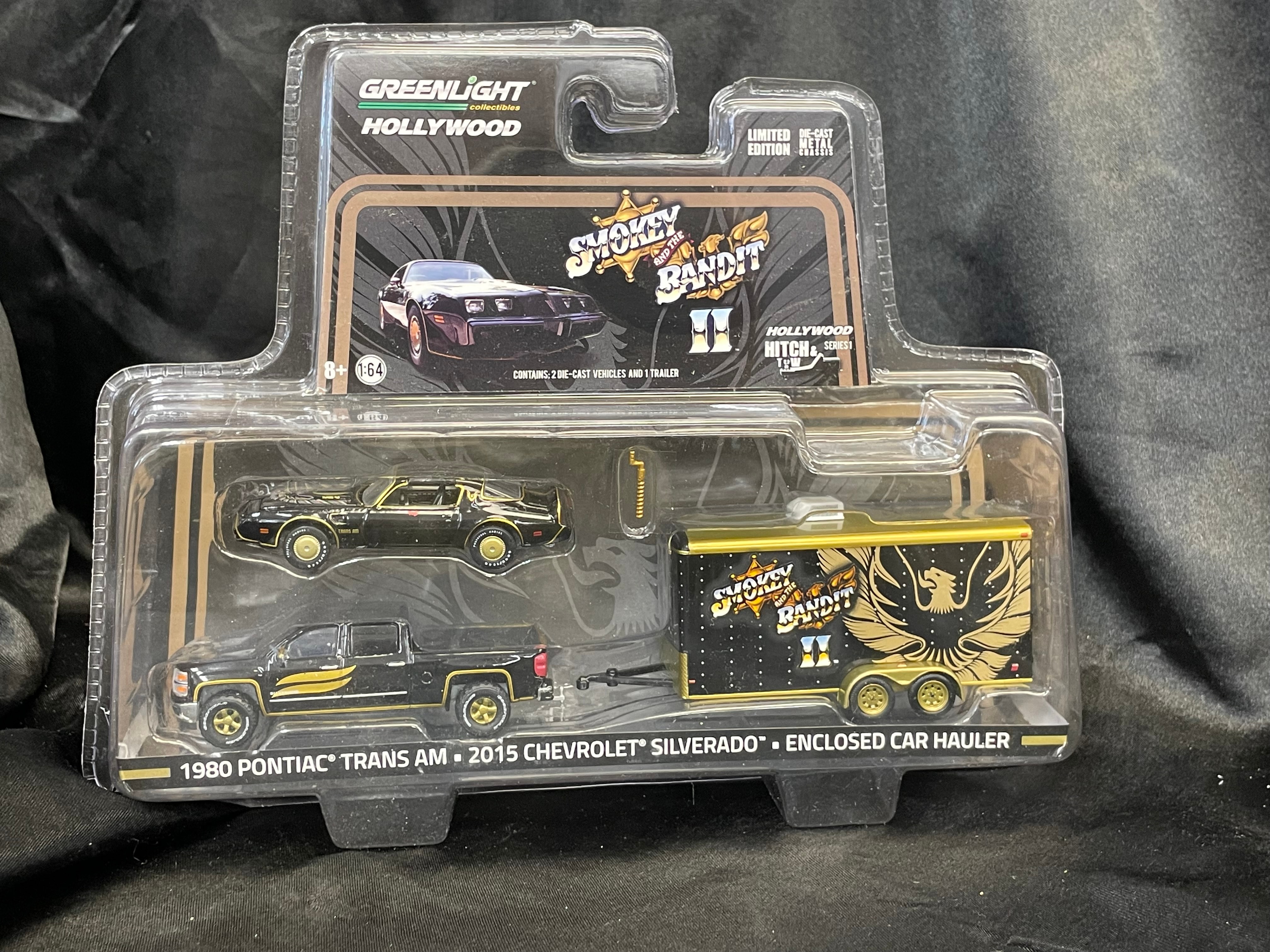 GreenLight Collectibles Hollywood Smokey and the Bandit II Hitch & Tow Series 1 1980 Pontiac Trans Am & 2015 Chevrolet Silverado with Enclosed Car Hauler 1:64 Scale Set