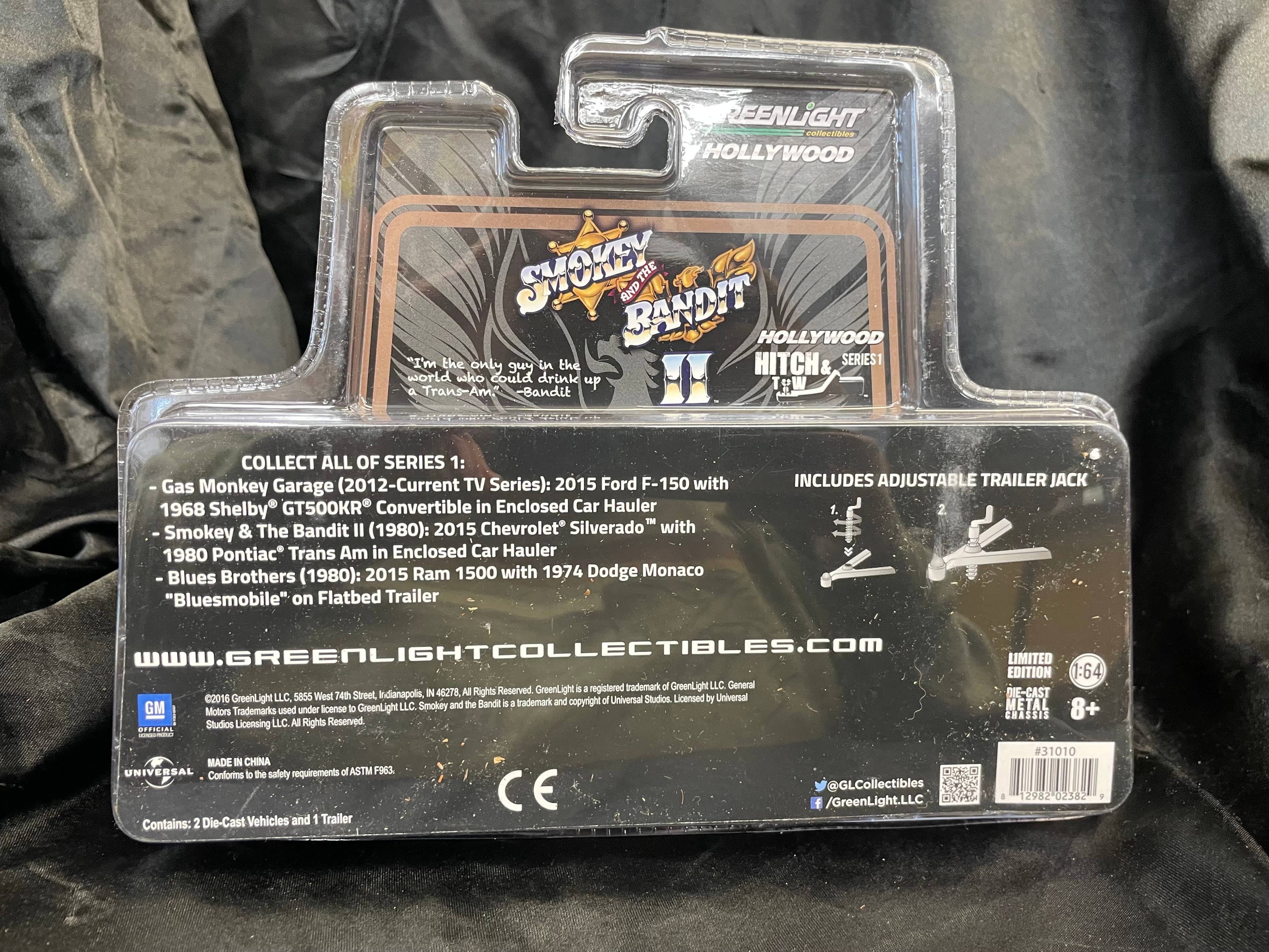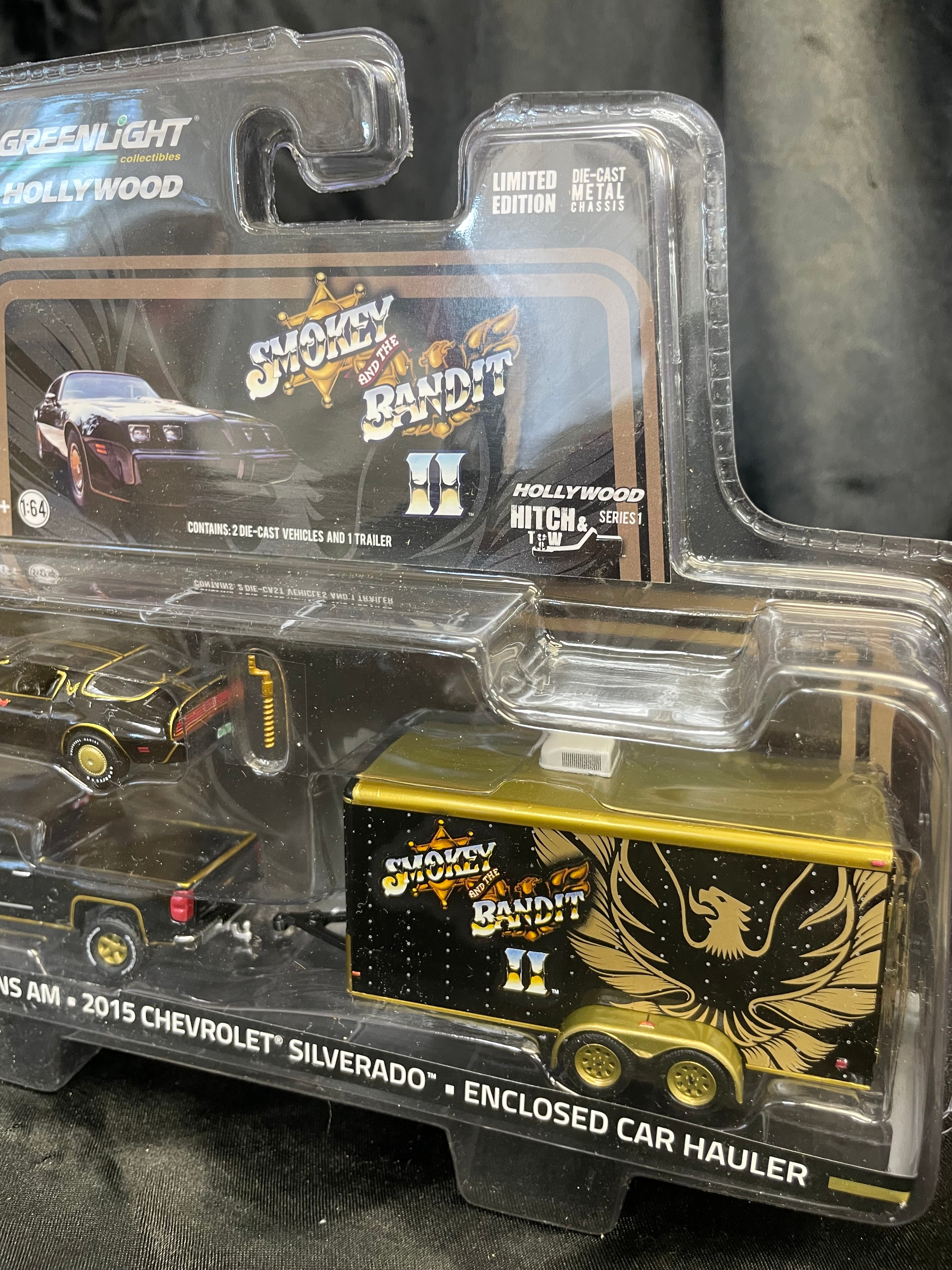 A GreenLight Collectibles Hollywood “Smokey and the Bandit II” Hitch & Tow Series 1 die-cast model set, featuring a 1:64 scale black and gold 1980 Pontiac Trans Am, a black and gold 2015 Chevrolet Silverado pickup truck, and a matching black and gold enclosed car hauler trailer. The trailer is adorned with the “Smokey and the Bandit II” logo and a large gold Firebird graphic. The set is a “LIMITED DIE-CAST EDITION” with “METAL CHASSIS” and “HOLLYWOOD HITCH & SERIES 1” indicated on the packaging. It “CONTAINS: 2 DIE-CAST VEHICLES AND 1 TRAILER.” The packaging also notes “MADE IN CHINA,” includes a “CE” mark, and a barcode with product number “31010.”