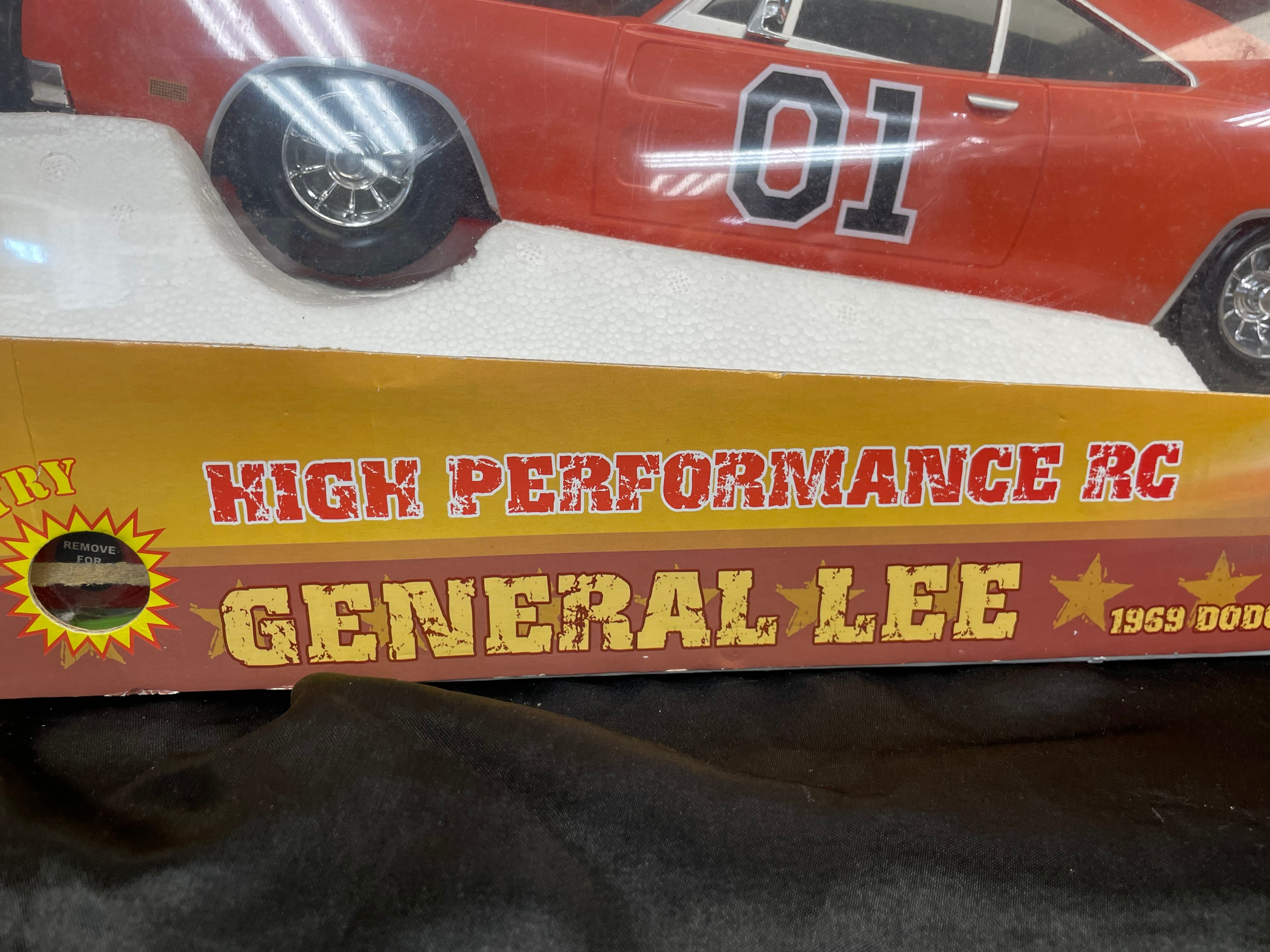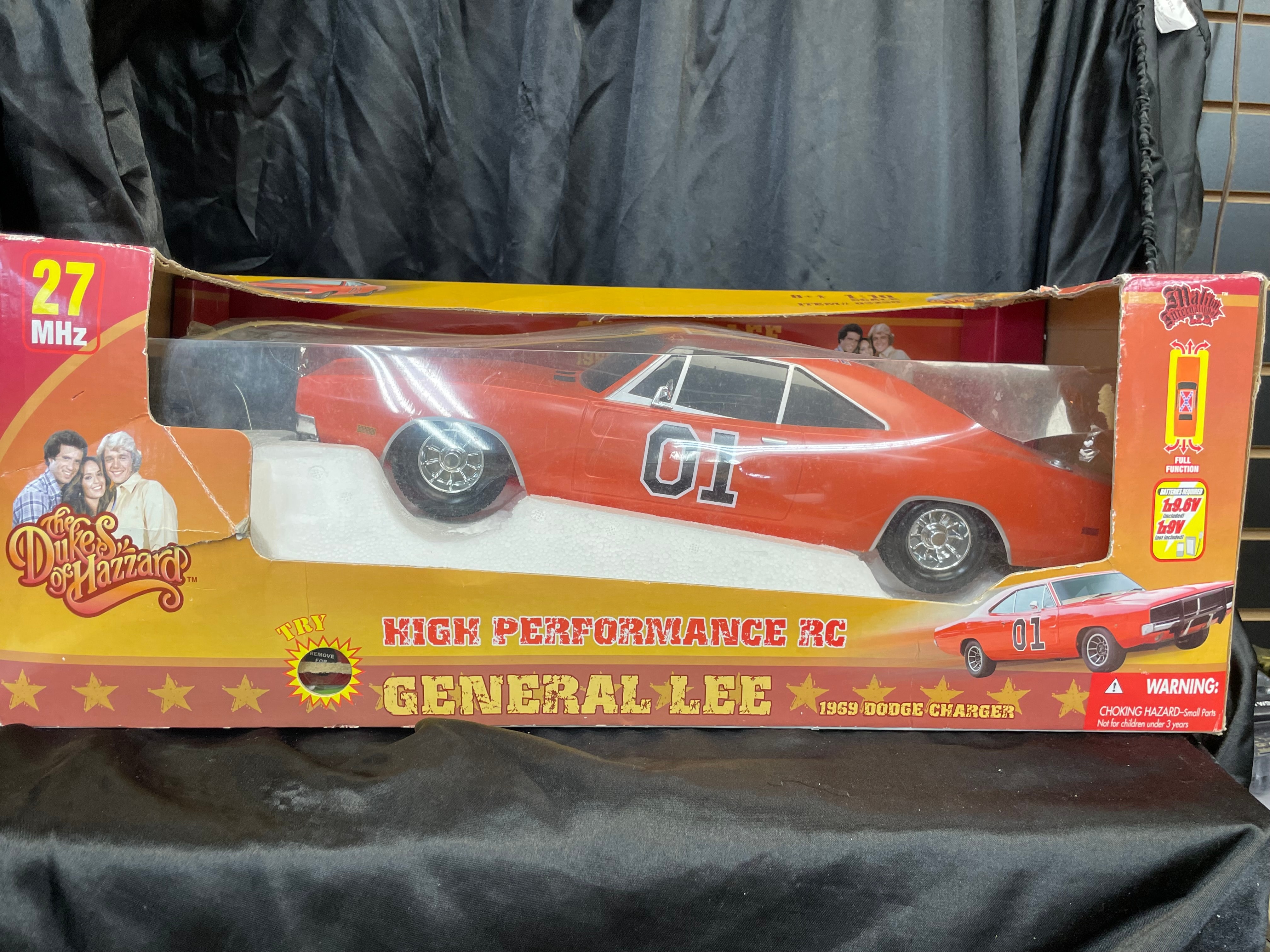 A “High Performance RC” toy replica of the “General Lee,” a 1969 Dodge Charger, manufactured by Malibu International™. The vehicle is rendered in orange with “01” decals on the doors and a Confederate battle flag with “GENERAL LEE” text on the roof. It is presented new in its original cardboard box, secured under a clear plastic window, and appears to be in unused condition. The packaging features “The Dukes of Hazzard™” branding with character images, indicates a “27 MHZ” operating frequency, and a 1:10 scale. “BATTERIES REQUIRED” text notes 9.6V included and 9V not included. A “WARNING: CHOKING HAZARD – Small Parts Not for children under 3 years” is also visible on the packaging.