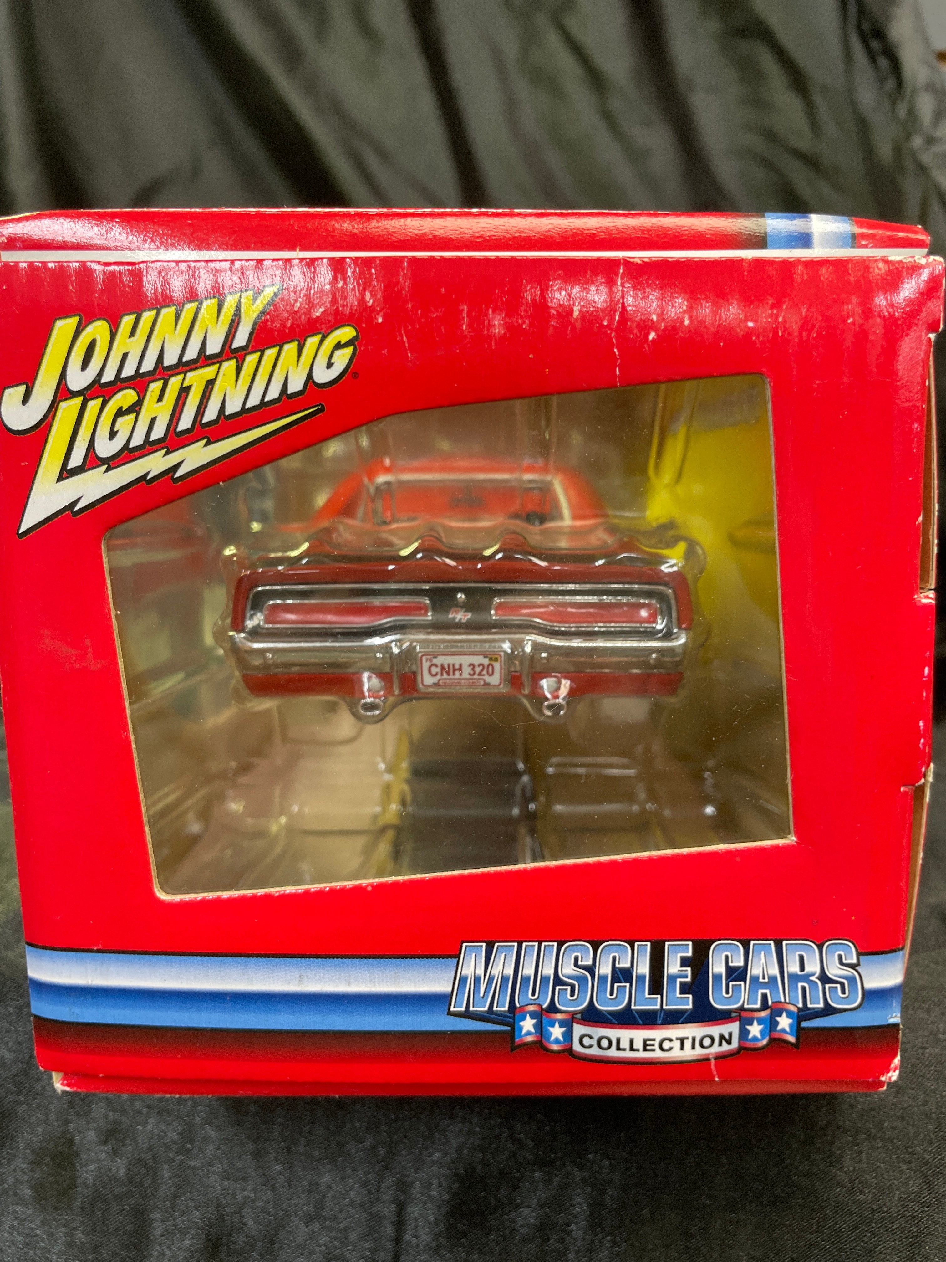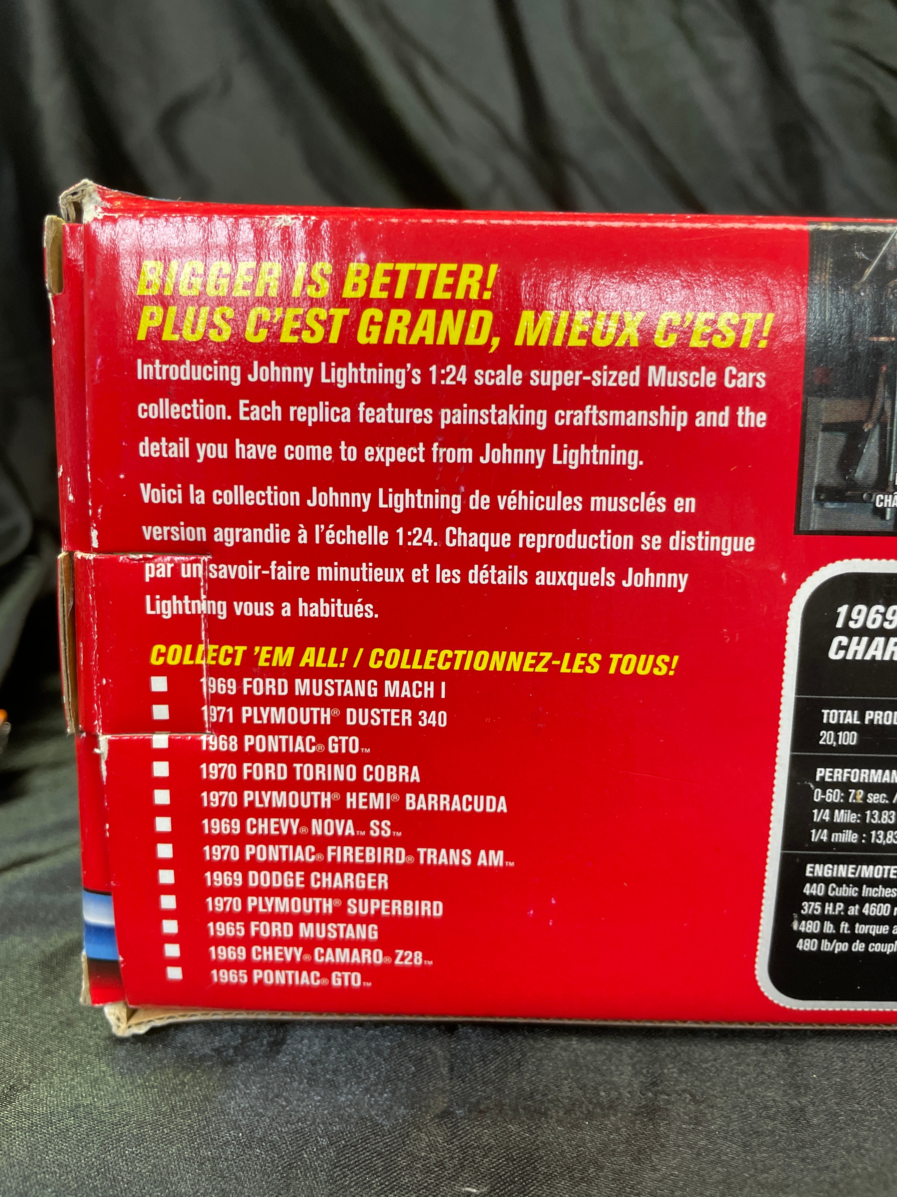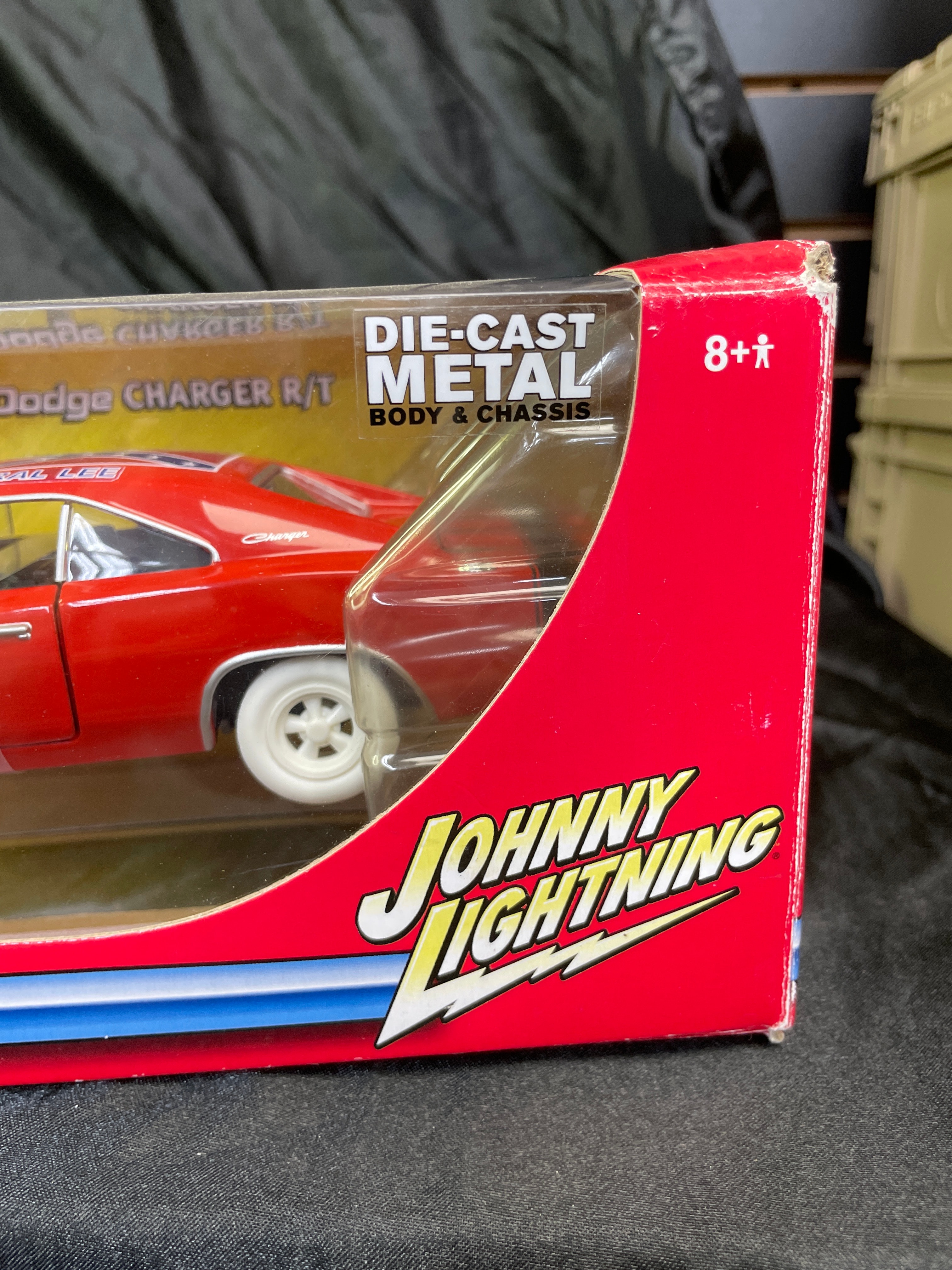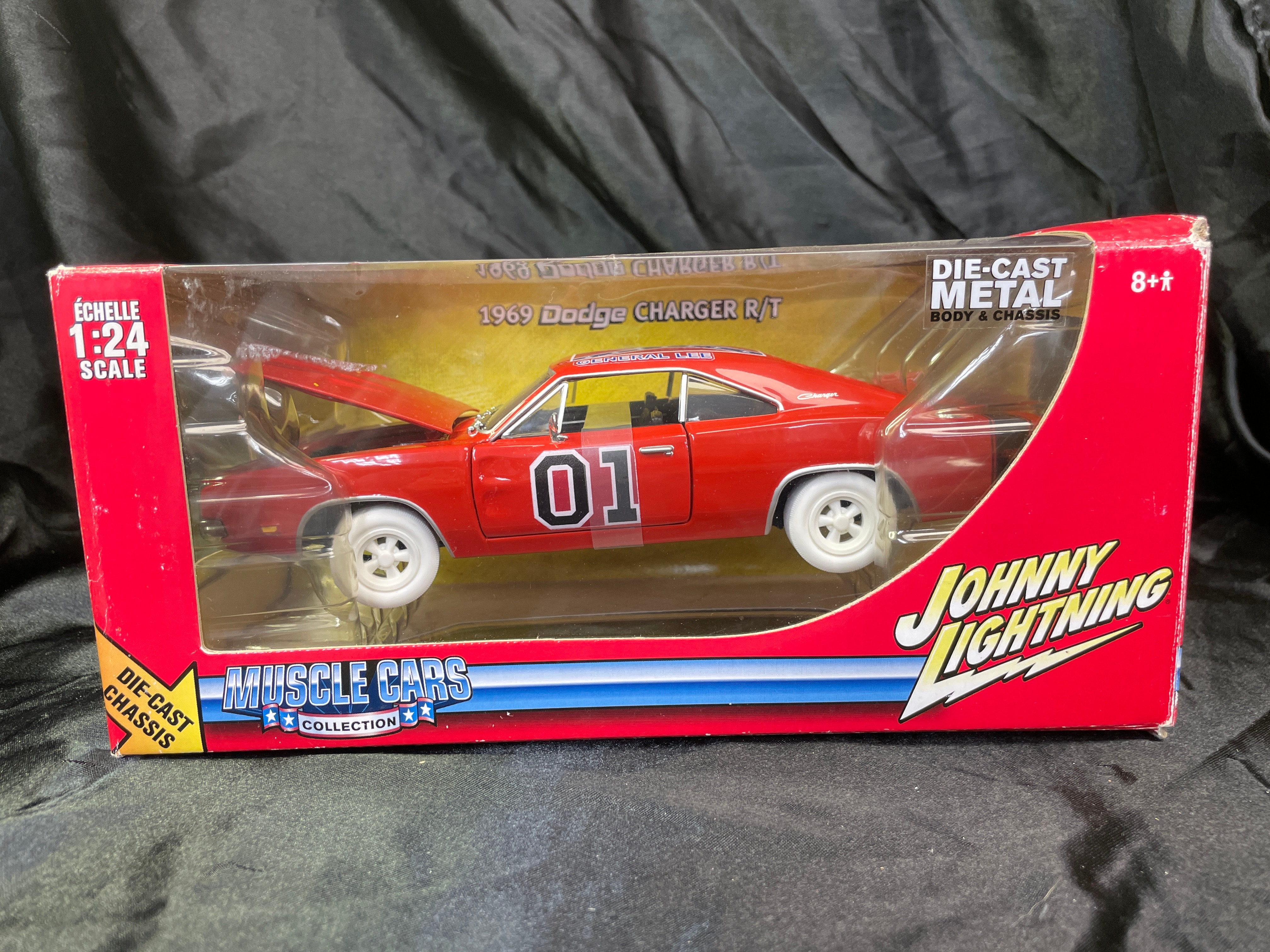 A Johnny Lightning ‘Muscle Cars Collection’ 1:24 scale die-cast model car, representing a 1969 Dodge Charger R/T in the iconic ‘General Lee’ livery from ‘The Dukes of Hazzard’. The red die-cast vehicle features a “01” on the doors, “GENERAL LEE” text alongside a Confederate battle flag graphic on the roof, and a “Hazzard County CNH 320” license plate at the rear. It is presented new in its original clear plastic window box, which specifies the material as “DIE-CAST METAL BODY & CHASSIS” and indicates a “1:24 SCALE”. The packaging highlights features such as opening doors and hood, detailed interiors, and posable two-piece wheels, with an age recommendation of 8+. The packaging contains text in both English and French, including “BIGGER IS BETTER! PLUS C’EST GRAND, MIEUX C’EST!” and a copyright dated 2005.