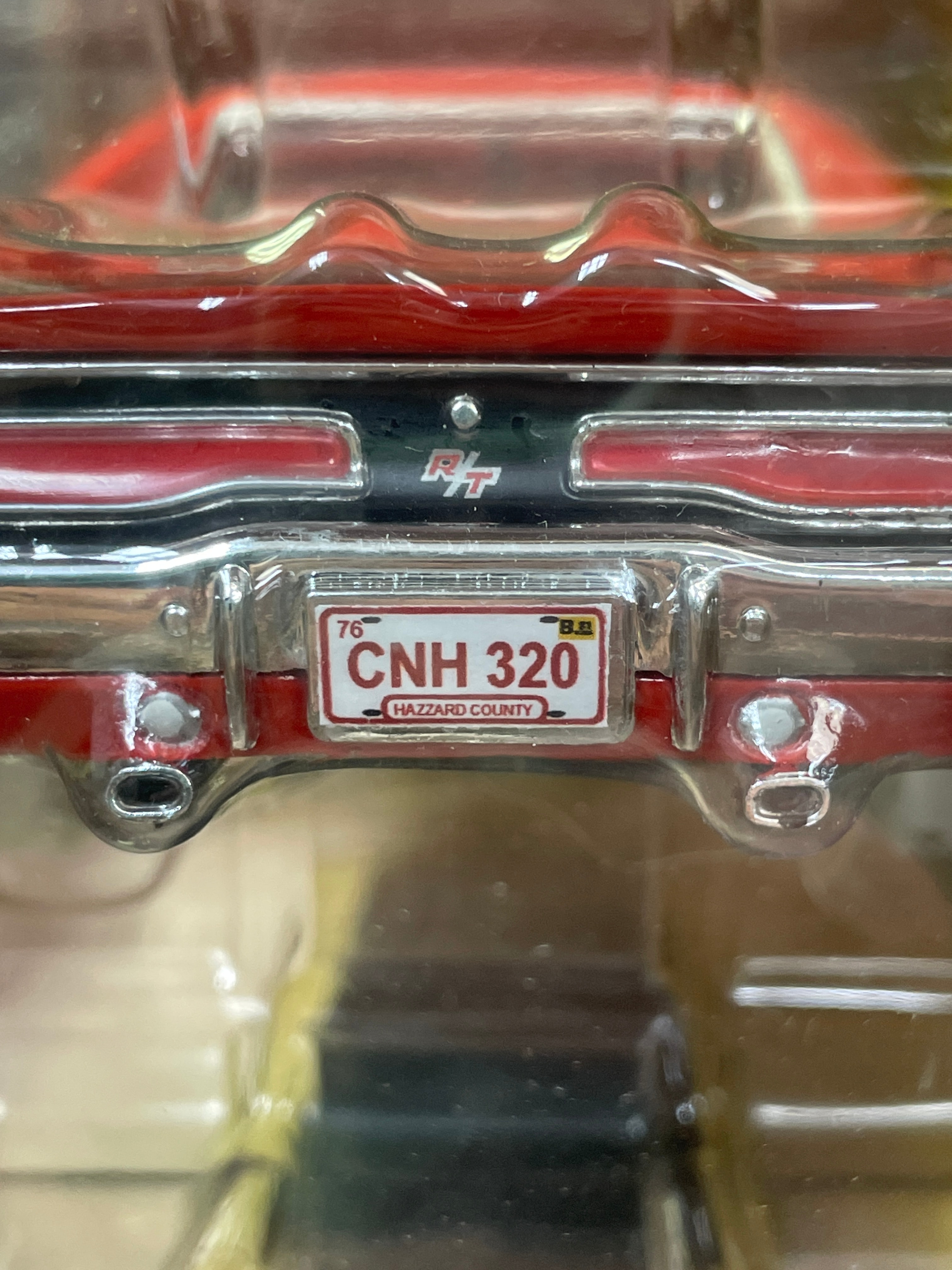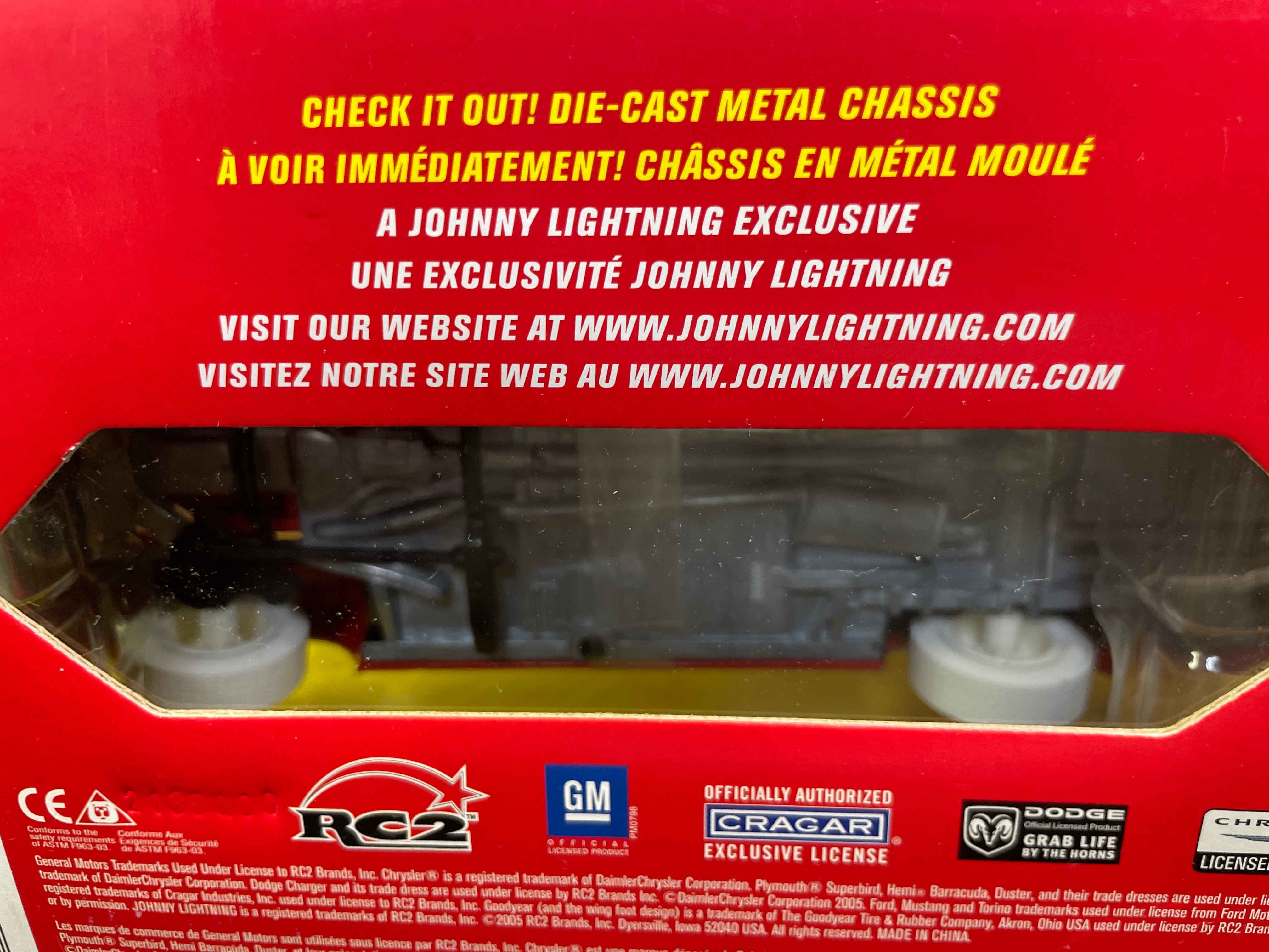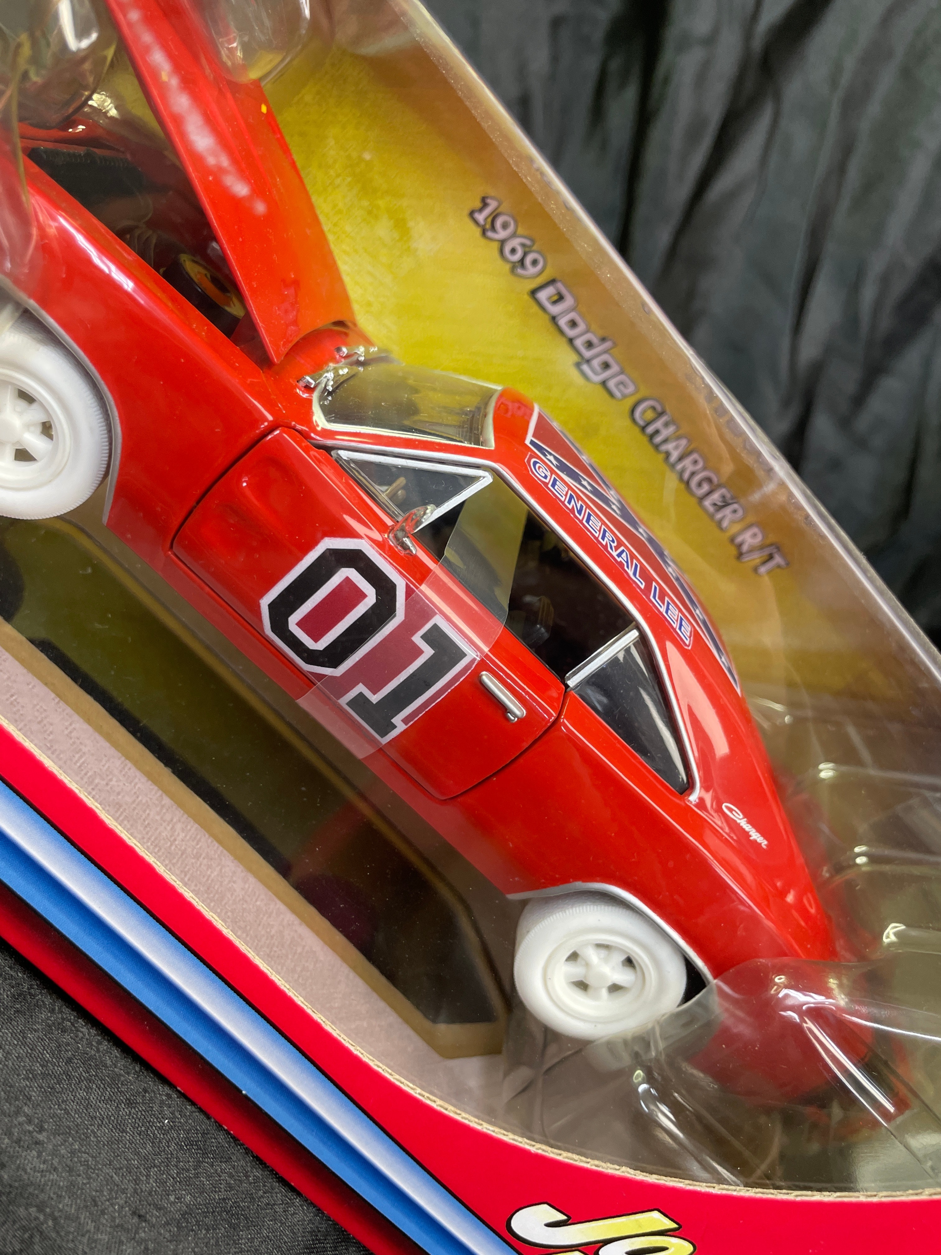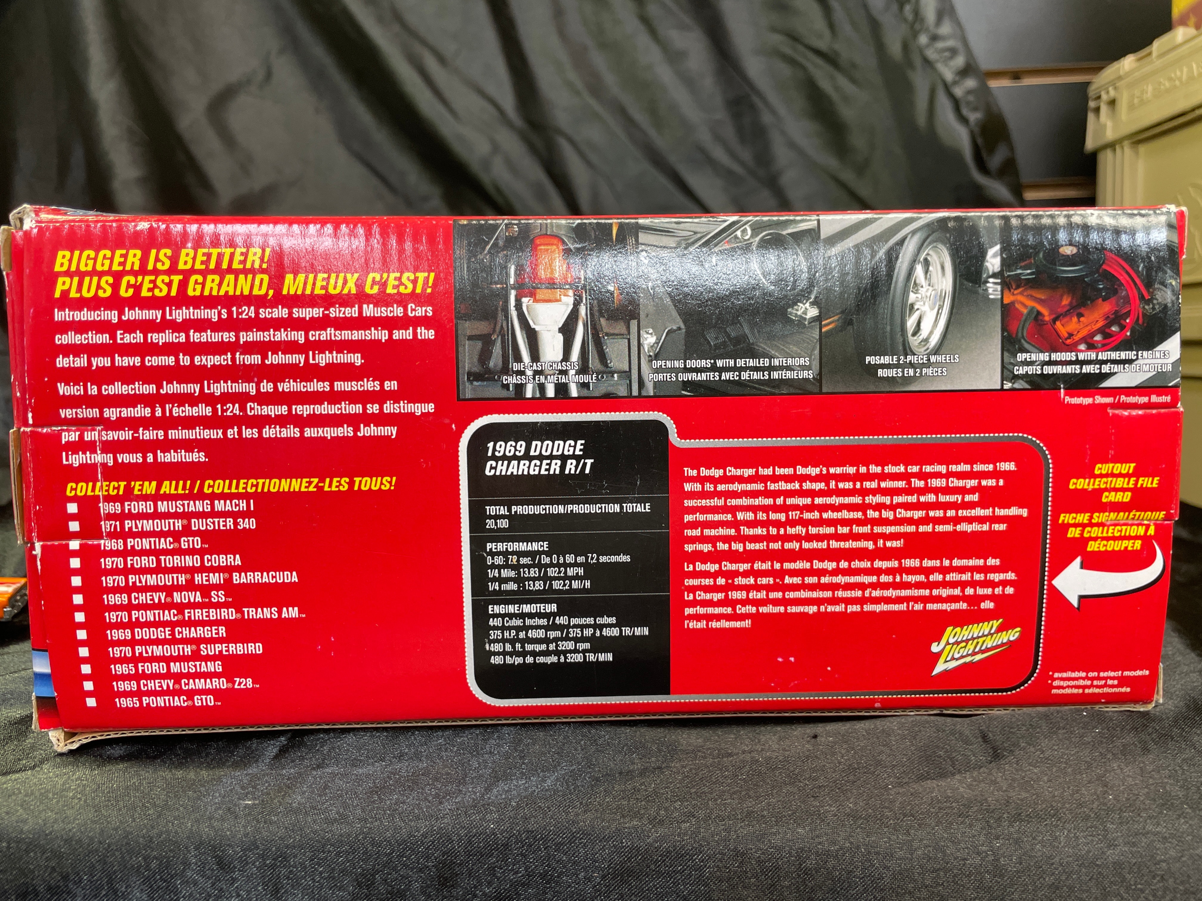 A Johnny Lightning ‘Muscle Cars Collection’ 1:24 scale die-cast model car, representing a 1969 Dodge Charger R/T in the iconic ‘General Lee’ livery from ‘The Dukes of Hazzard’. The red die-cast vehicle features a “01” on the doors, “GENERAL LEE” text alongside a Confederate battle flag graphic on the roof, and a “Hazzard County CNH 320” license plate at the rear. It is presented new in its original clear plastic window box, which specifies the material as “DIE-CAST METAL BODY & CHASSIS” and indicates a “1:24 SCALE”. The packaging highlights features such as opening doors and hood, detailed interiors, and posable two-piece wheels, with an age recommendation of 8+. The packaging contains text in both English and French, including “BIGGER IS BETTER! PLUS C’EST GRAND, MIEUX C’EST!” and a copyright dated 2005.