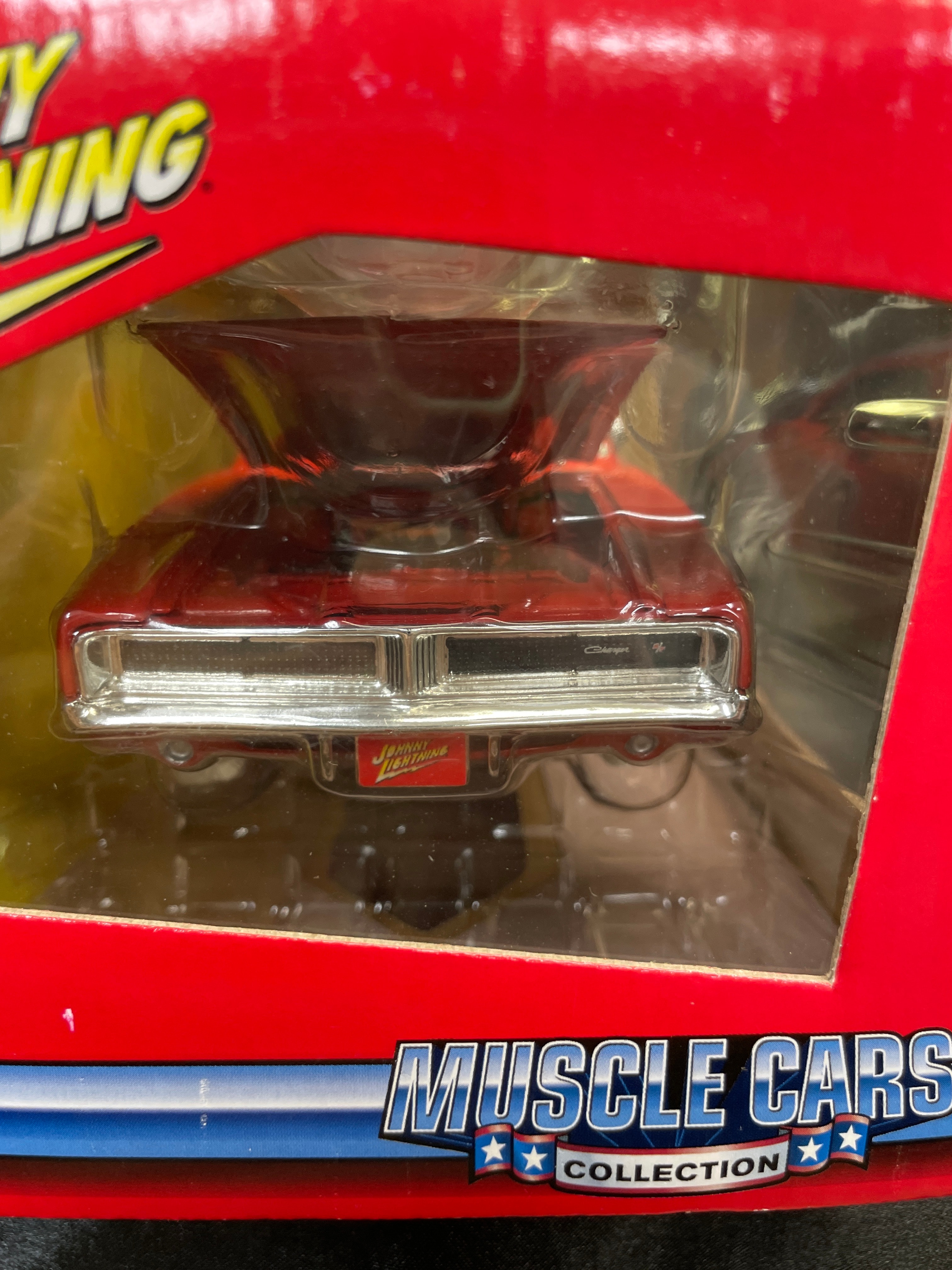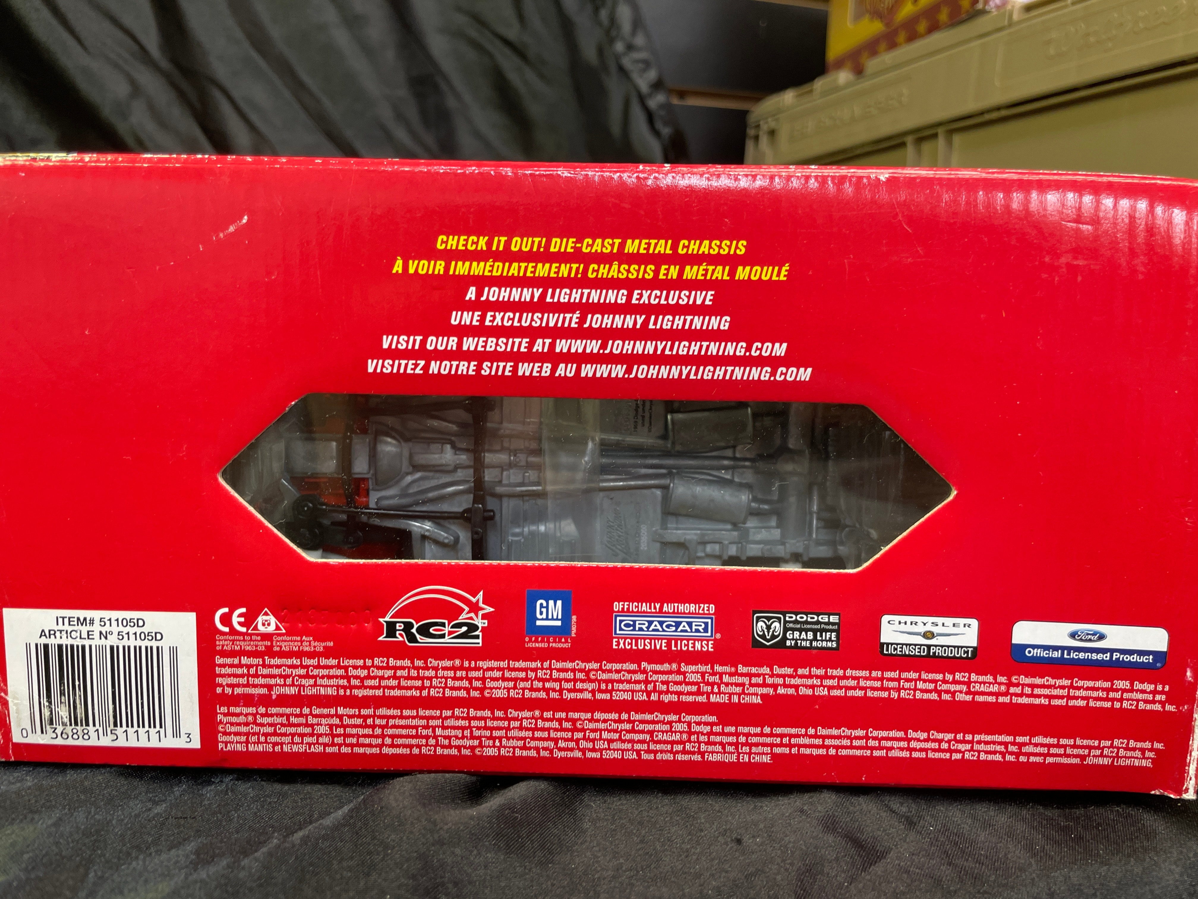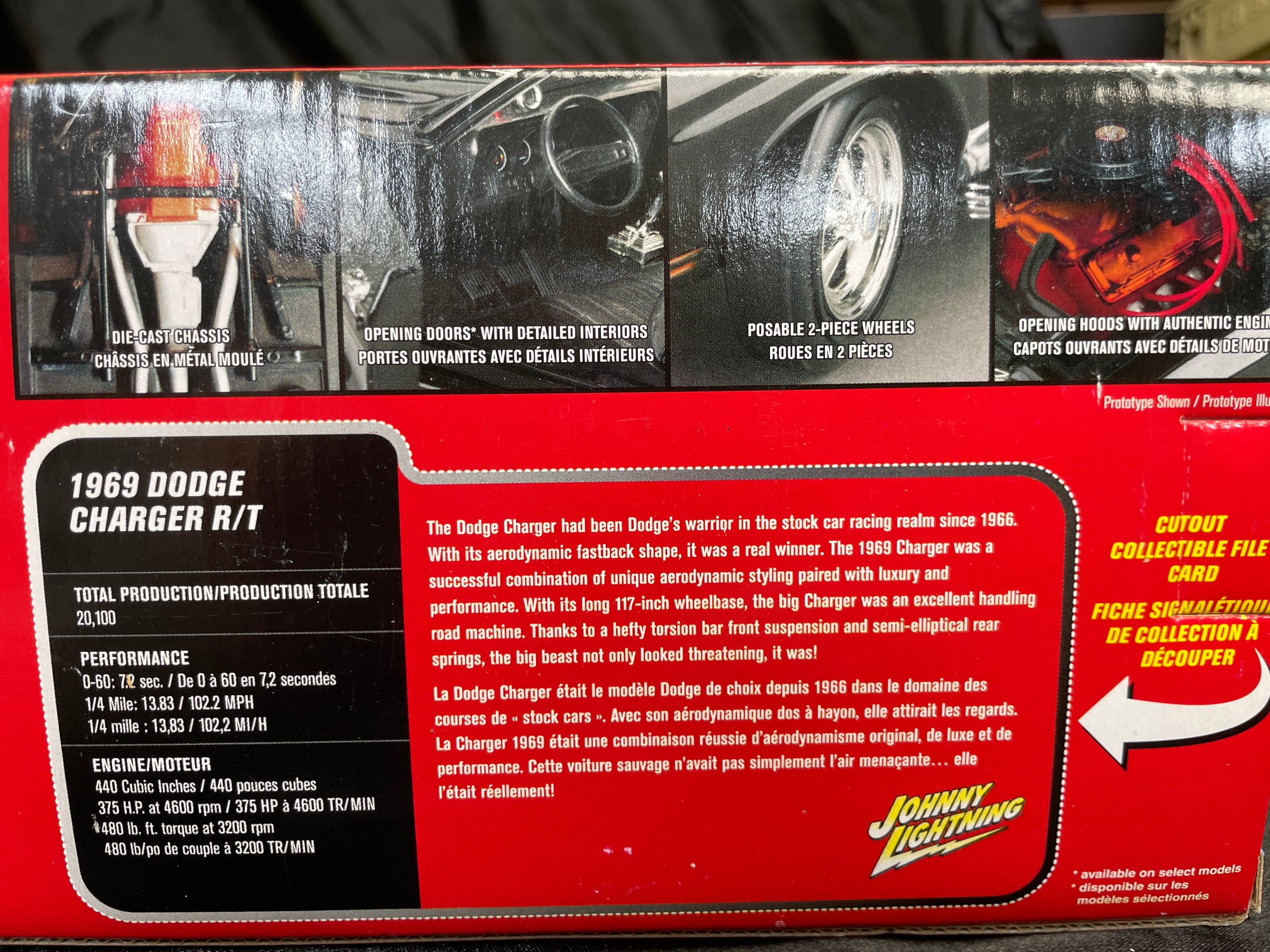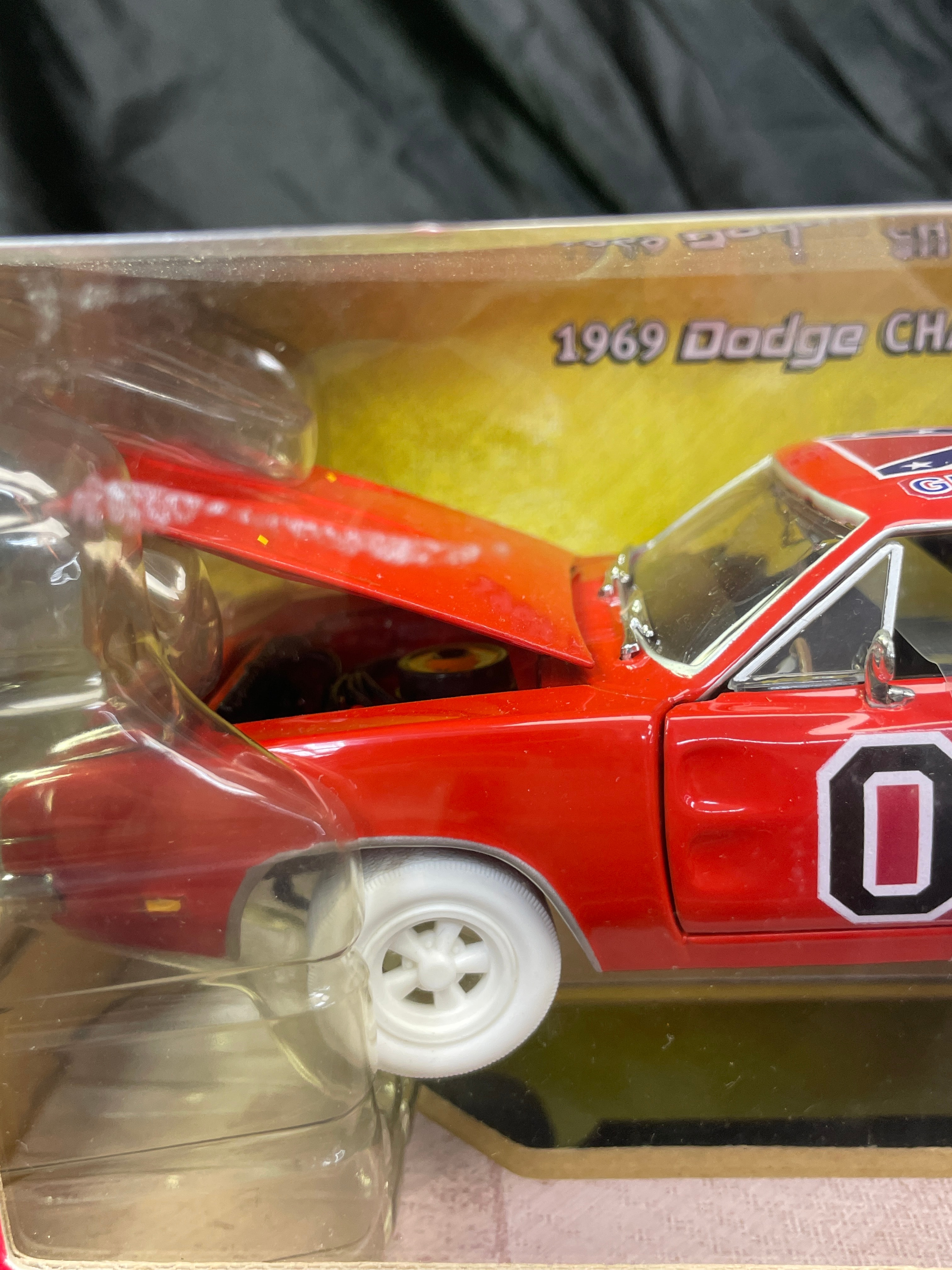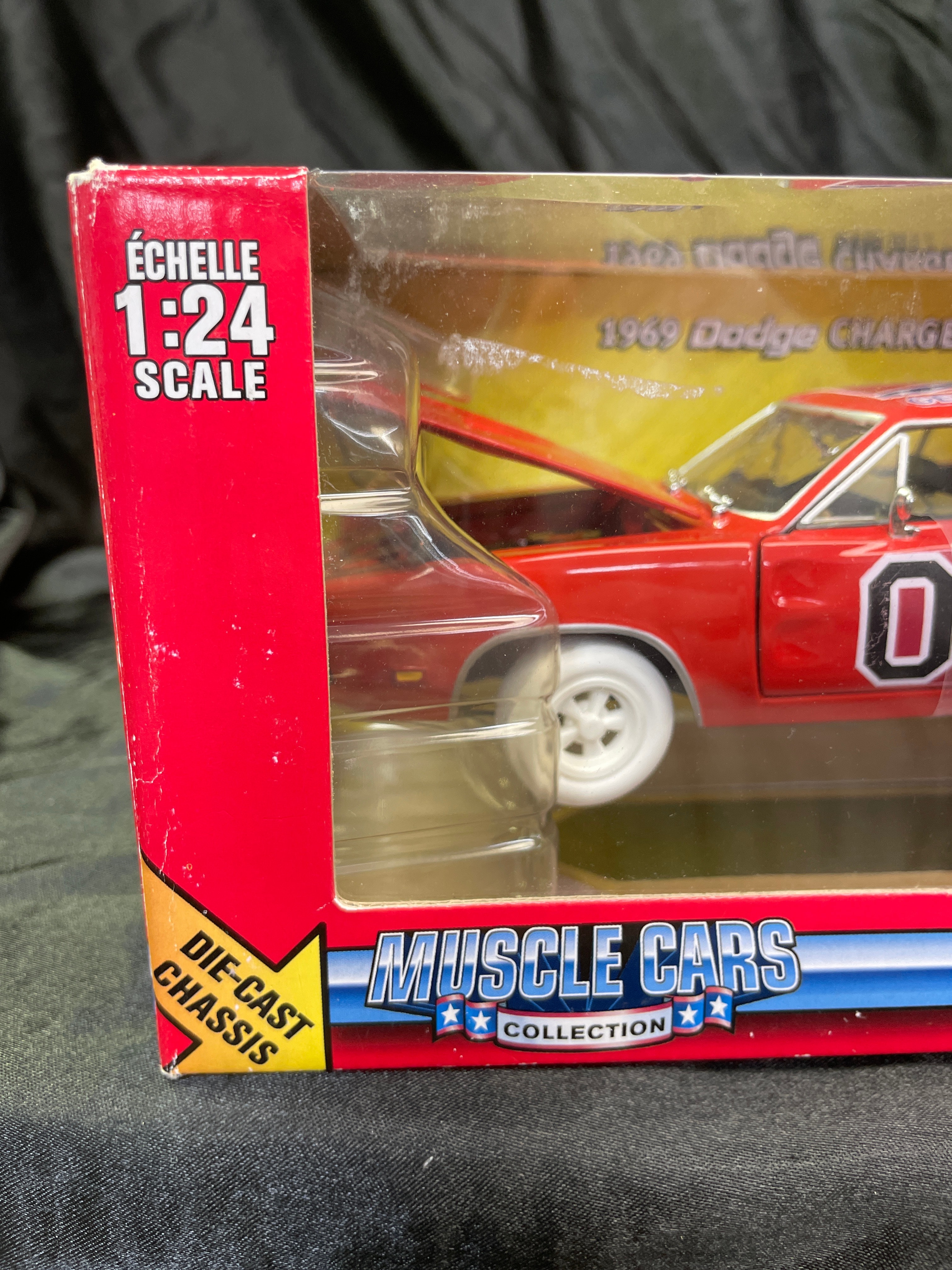 A Johnny Lightning ‘Muscle Cars Collection’ 1:24 scale die-cast model car, representing a 1969 Dodge Charger R/T in the iconic ‘General Lee’ livery from ‘The Dukes of Hazzard’. The red die-cast vehicle features a “01” on the doors, “GENERAL LEE” text alongside a Confederate battle flag graphic on the roof, and a “Hazzard County CNH 320” license plate at the rear. It is presented new in its original clear plastic window box, which specifies the material as “DIE-CAST METAL BODY & CHASSIS” and indicates a “1:24 SCALE”. The packaging highlights features such as opening doors and hood, detailed interiors, and posable two-piece wheels, with an age recommendation of 8+. The packaging contains text in both English and French, including “BIGGER IS BETTER! PLUS C’EST GRAND, MIEUX C’EST!” and a copyright dated 2005.