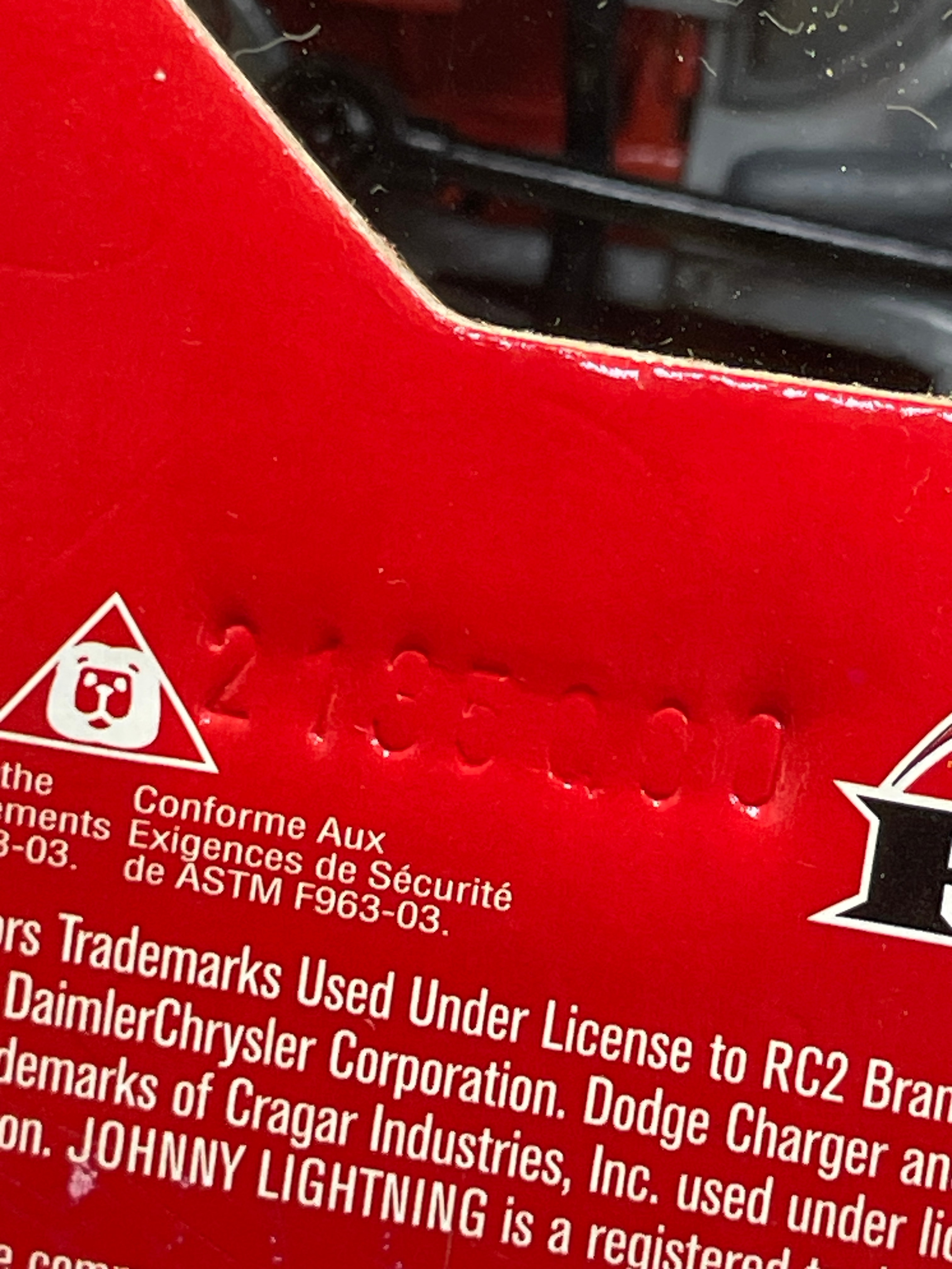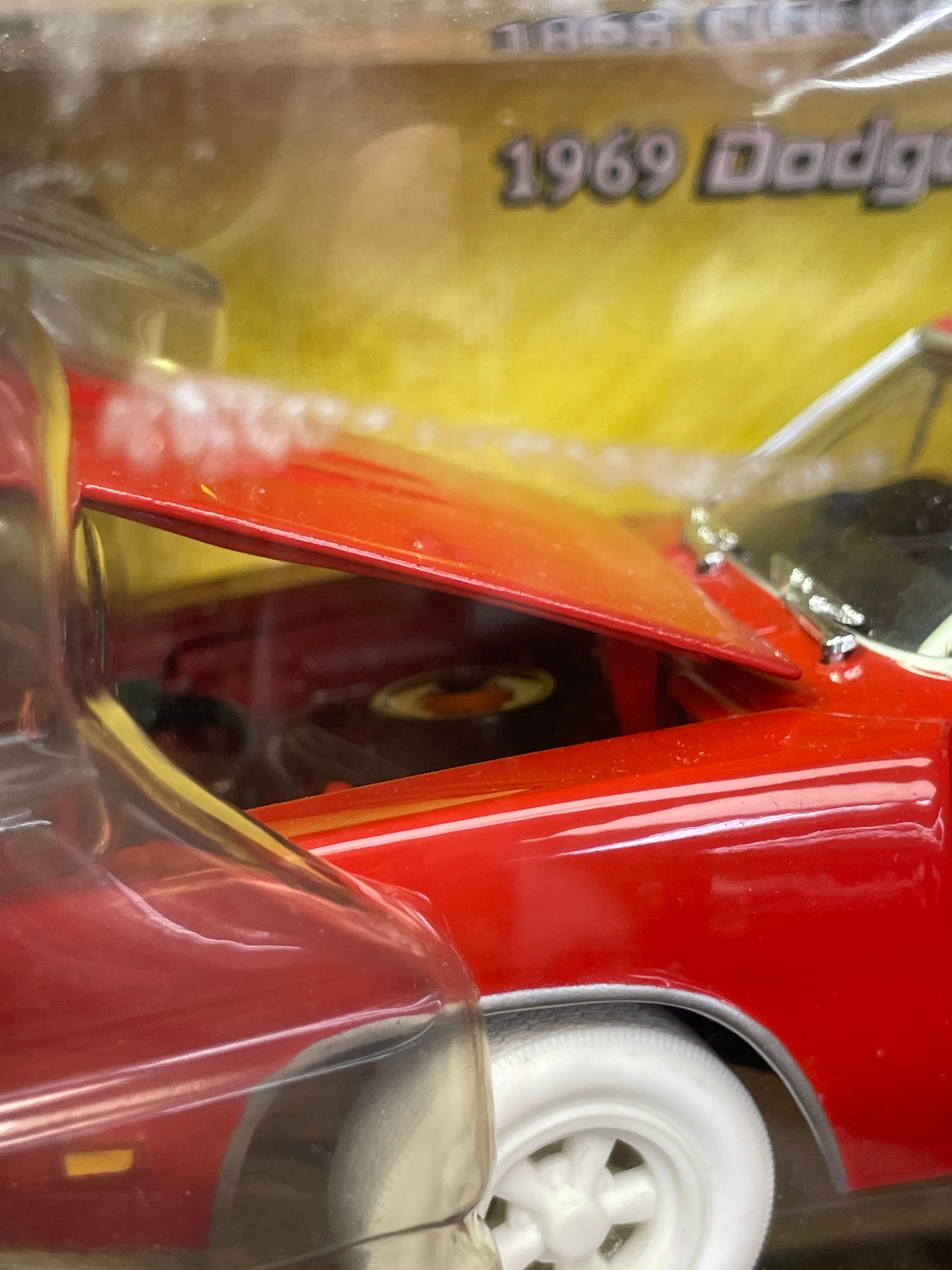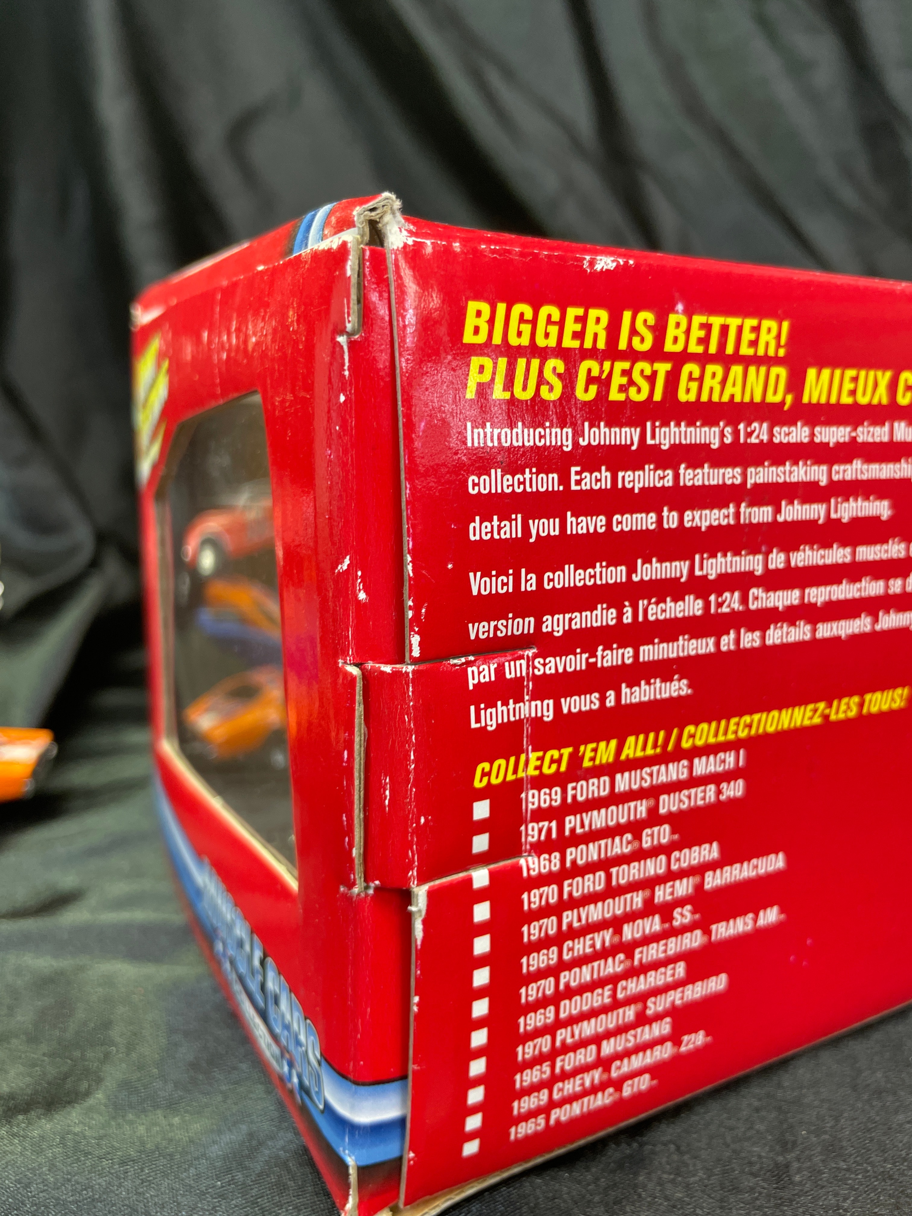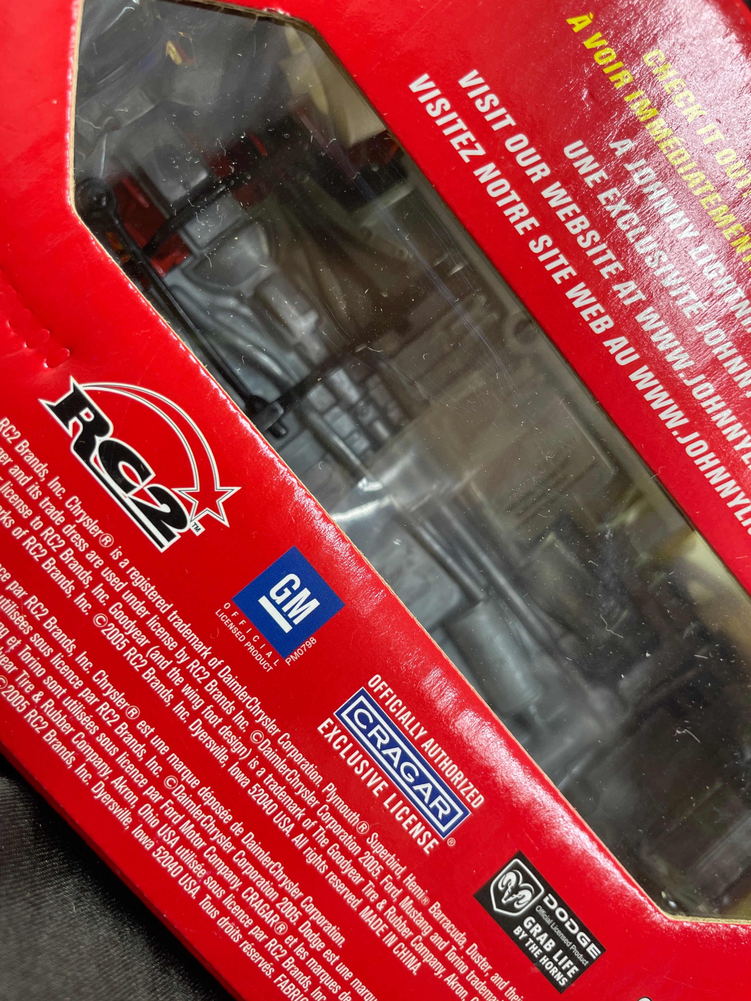 A Johnny Lightning ‘Muscle Cars Collection’ 1:24 scale die-cast model car, representing a 1969 Dodge Charger R/T in the iconic ‘General Lee’ livery from ‘The Dukes of Hazzard’. The red die-cast vehicle features a “01” on the doors, “GENERAL LEE” text alongside a Confederate battle flag graphic on the roof, and a “Hazzard County CNH 320” license plate at the rear. It is presented new in its original clear plastic window box, which specifies the material as “DIE-CAST METAL BODY & CHASSIS” and indicates a “1:24 SCALE”. The packaging highlights features such as opening doors and hood, detailed interiors, and posable two-piece wheels, with an age recommendation of 8+. The packaging contains text in both English and French, including “BIGGER IS BETTER! PLUS C’EST GRAND, MIEUX C’EST!” and a copyright dated 2005.