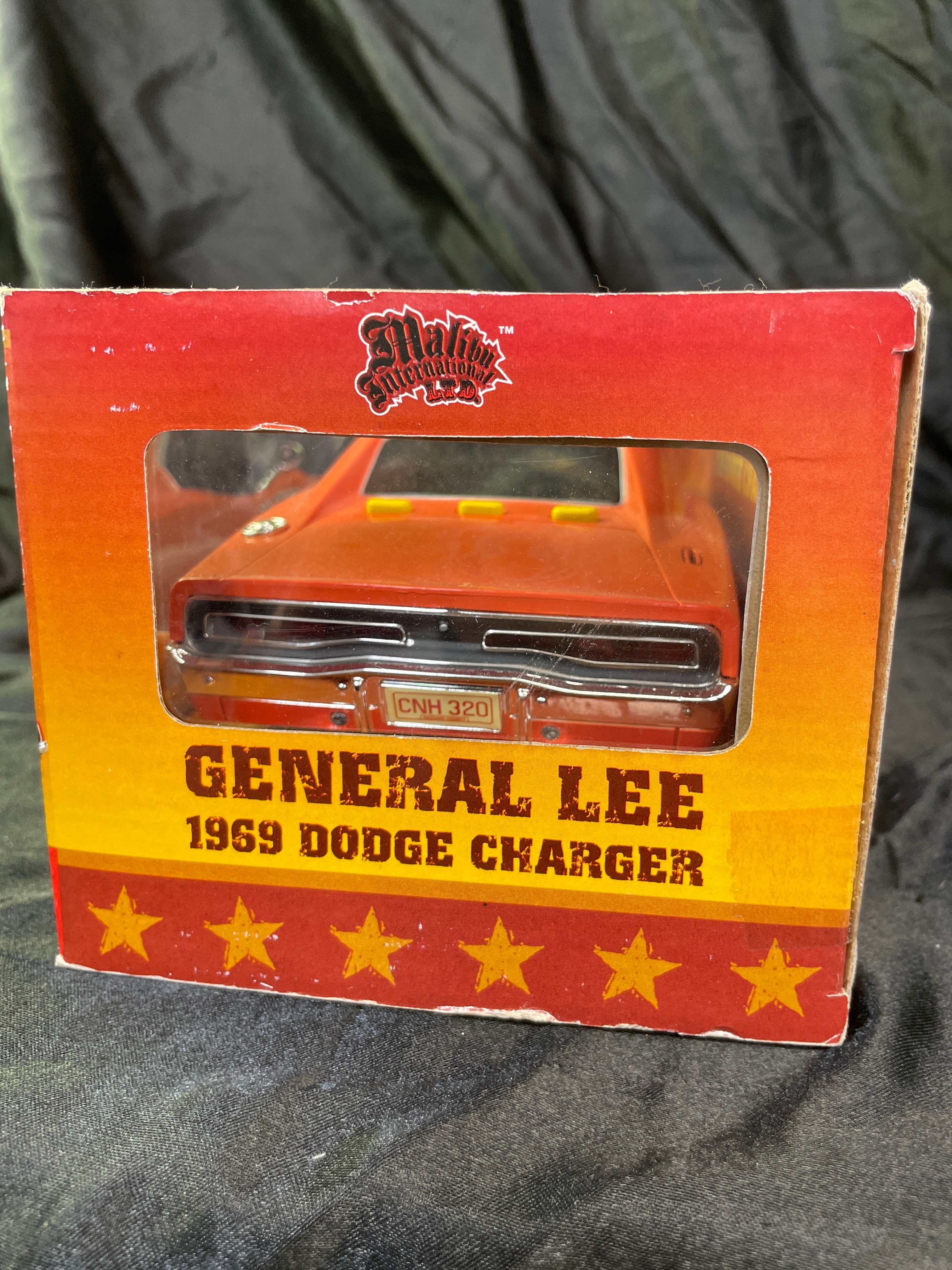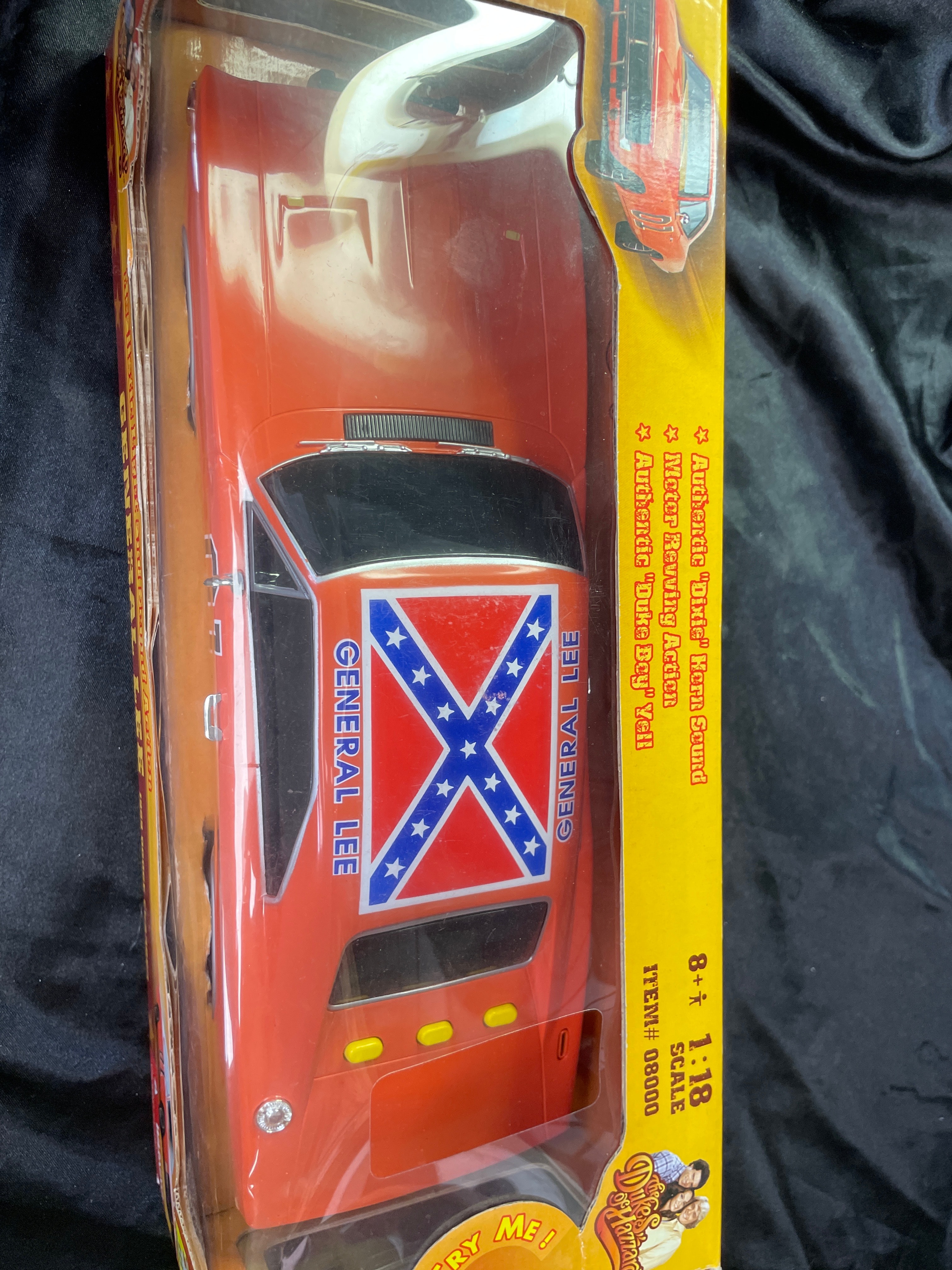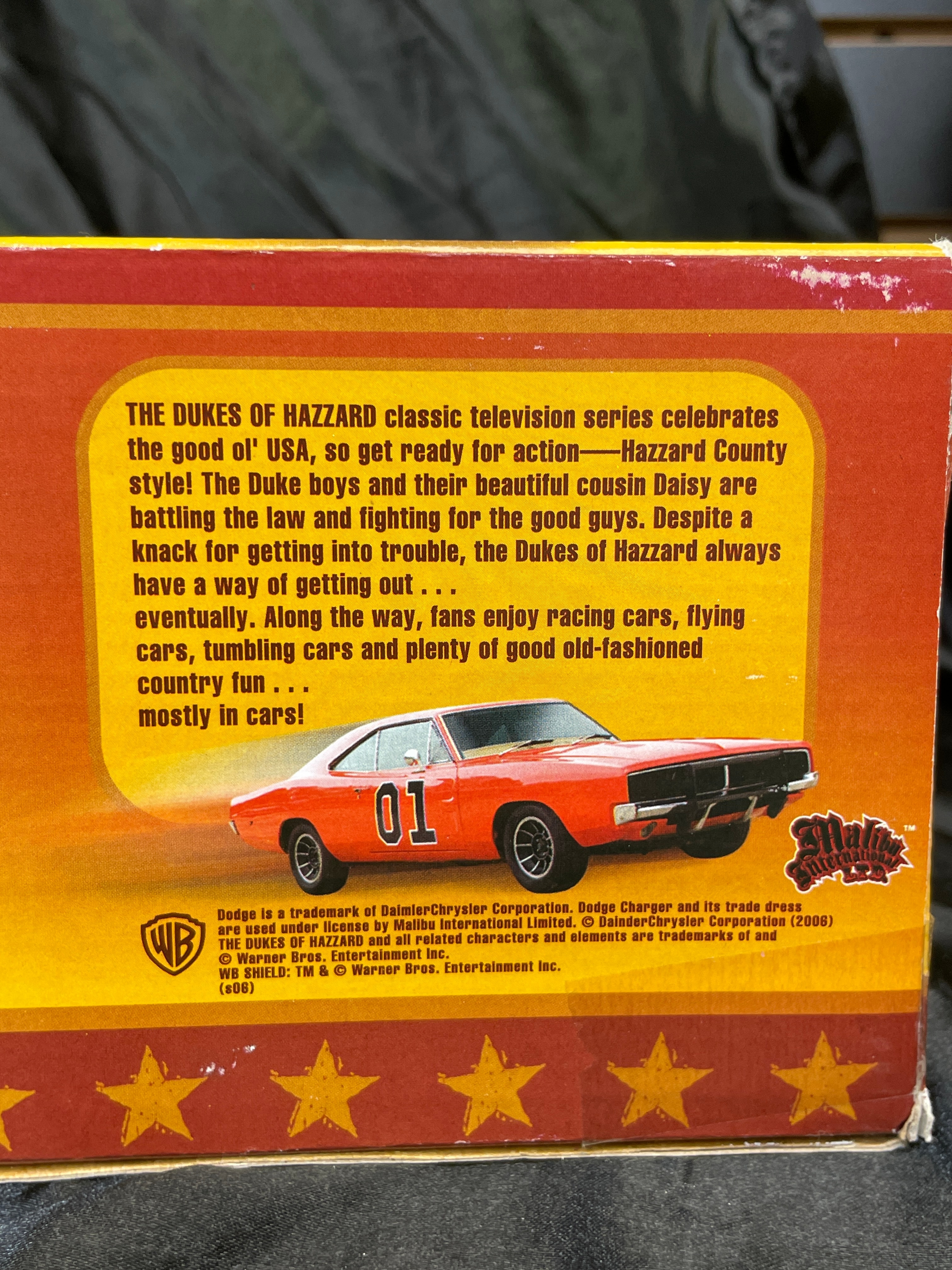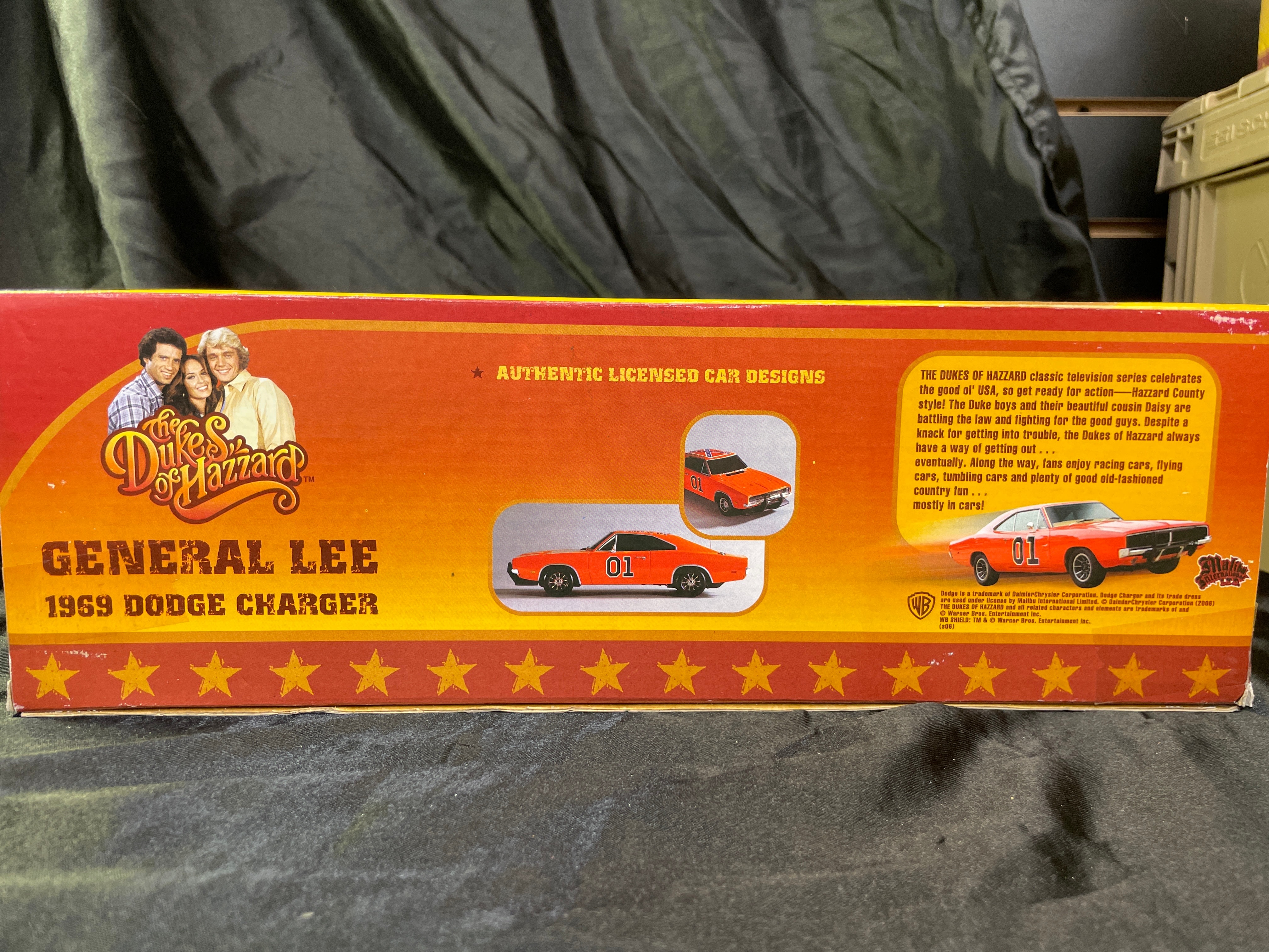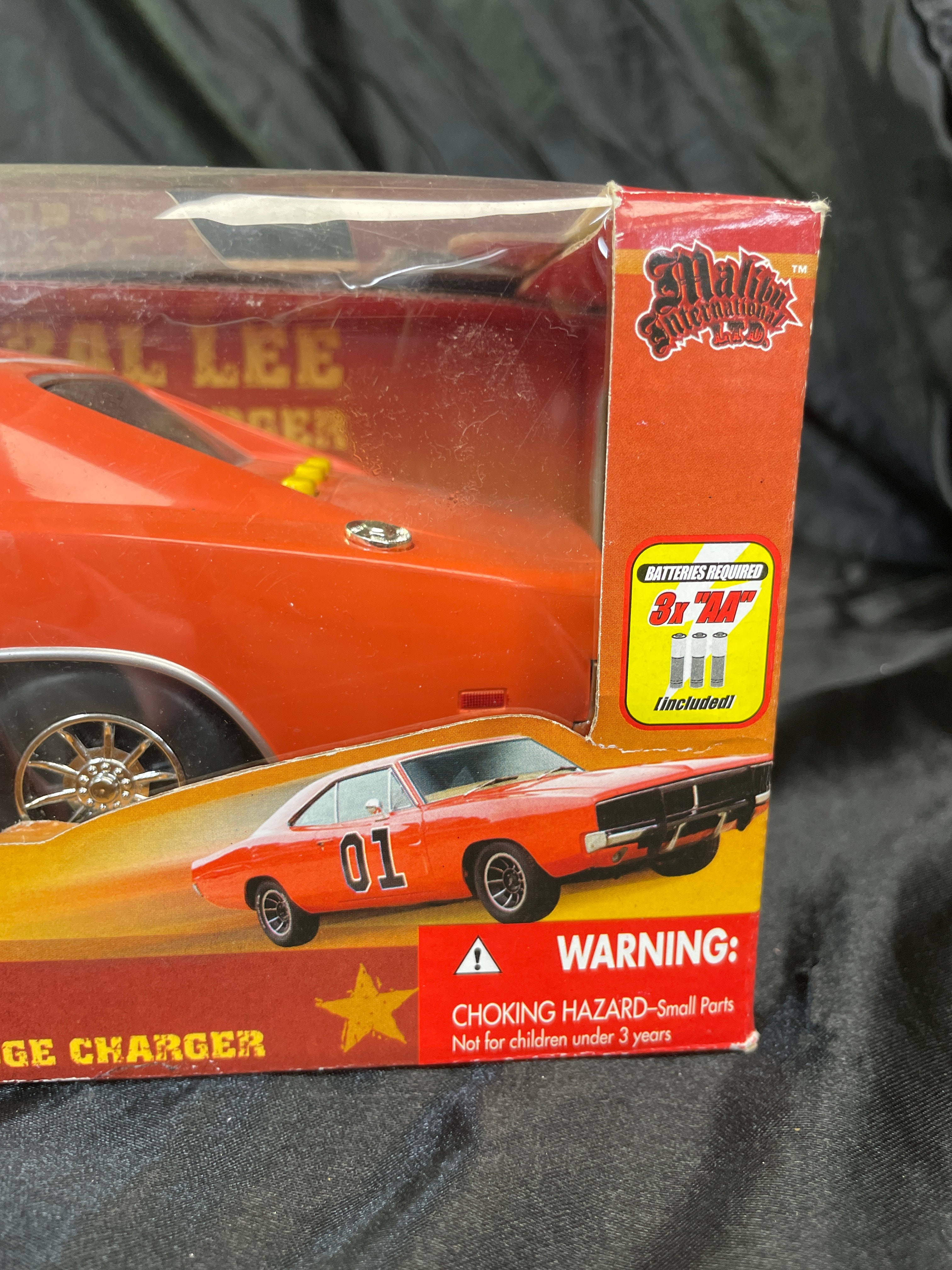A Malibu International 1:18 scale replica toy car, depicting the iconic “General Lee” 1969 Dodge Charger from “The Dukes of Hazzard.” The model is primarily orange with “01” decals on its doors and a Confederate battle flag decal on its roof. Constructed from plastic and/or die-cast components, the car is presented in its original cardboard box with a clear plastic window. The packaging advertises “Realistic Light and Sound Action, ” including “Authentic ‘Dixie’ Horn Sound, ” “Motor Revving Action, ” and “Authentic ‘Duke Boys’ Yell!” Visible manufacturer and copyright information includes “Malibu International LTD, ” “Made in China, ” UPC barcode (841603080002), and copyright (s08) for Warner Bros. Entertainment Inc. A “WARNING: CHOKING HAZARD” is also present on the packaging. The item appears new and unused, sealed within its box.