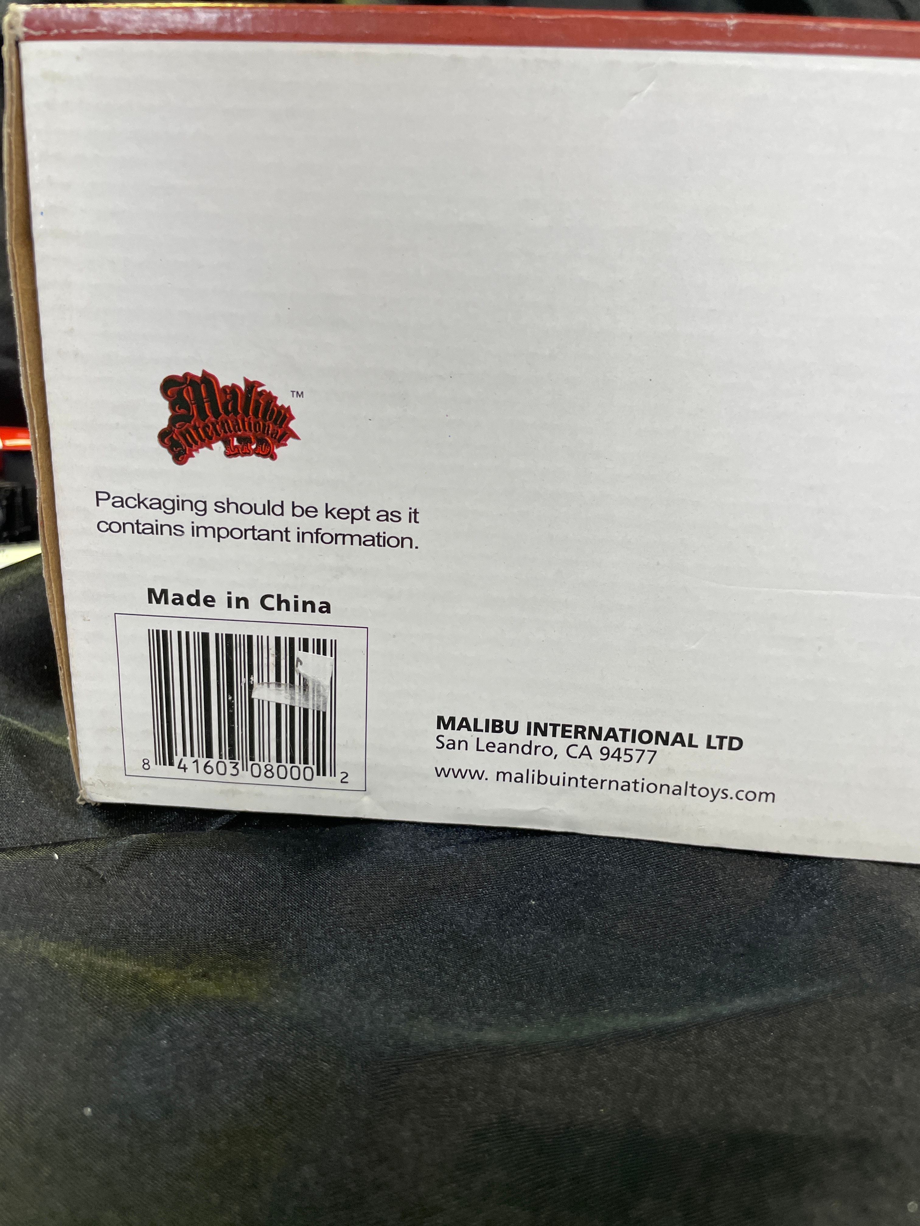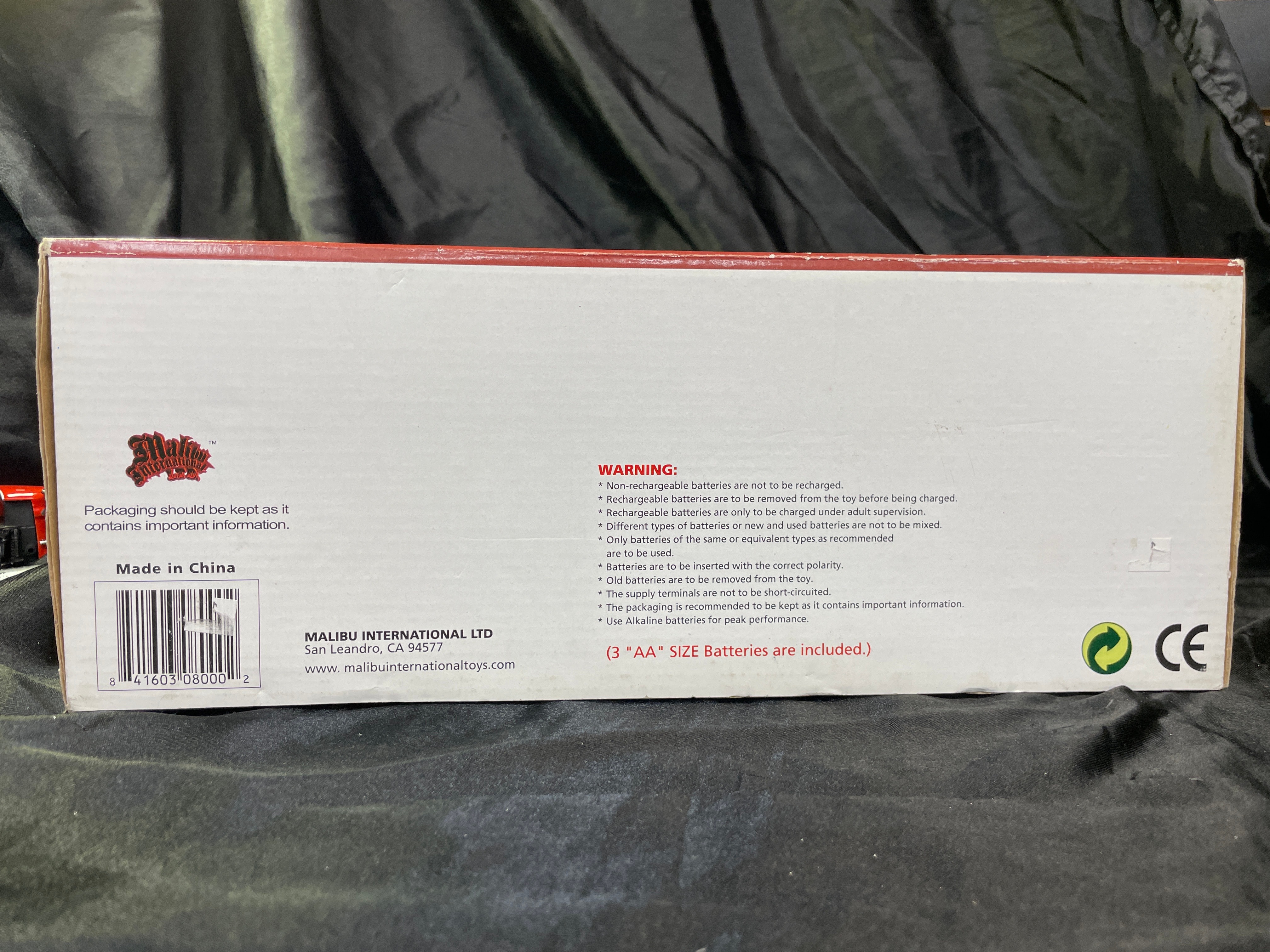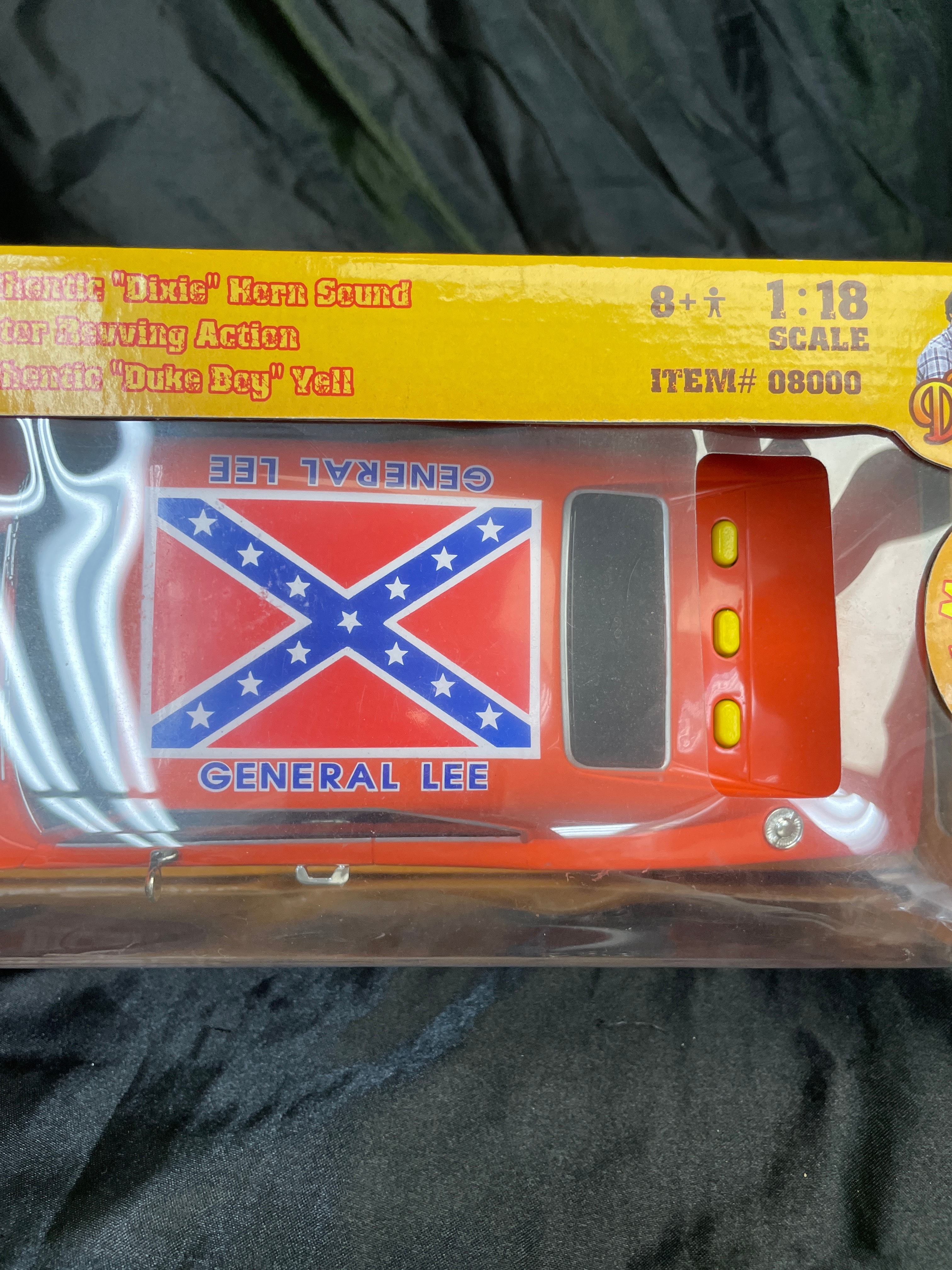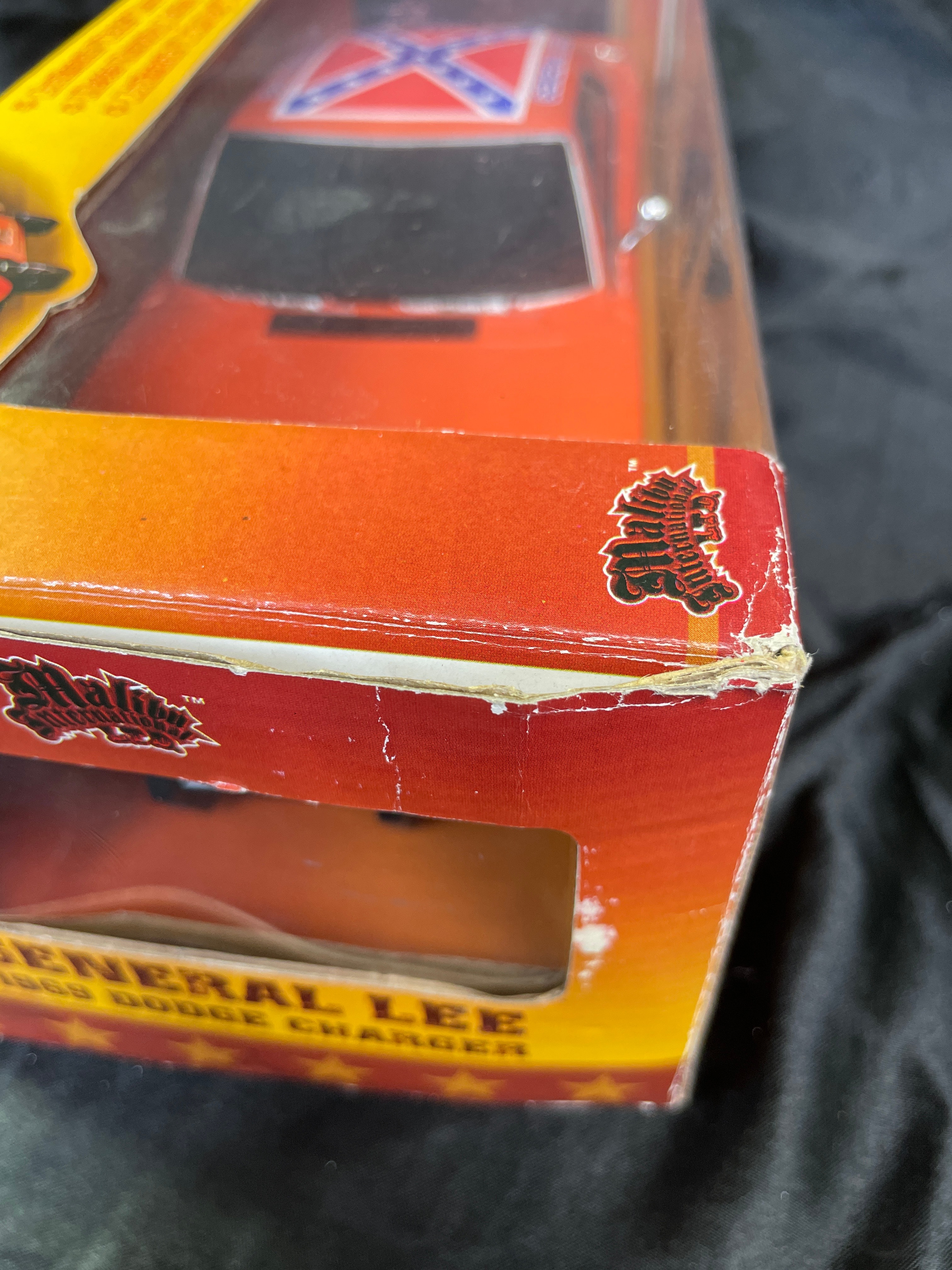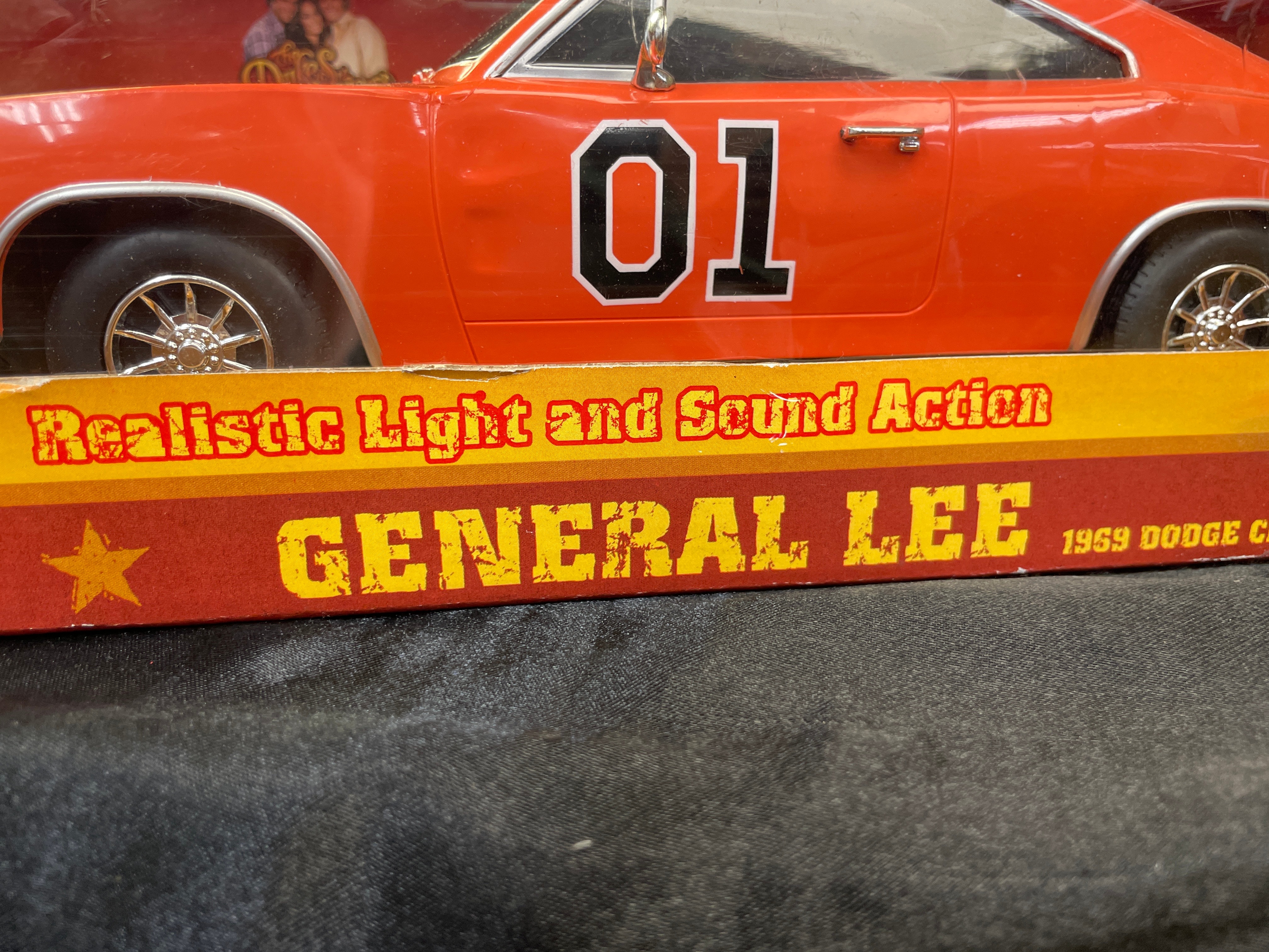 A Malibu International 1:18 scale replica toy car, depicting the iconic “General Lee” 1969 Dodge Charger from “The Dukes of Hazzard.” The model is primarily orange with “01” decals on its doors and a Confederate battle flag decal on its roof. Constructed from plastic and/or die-cast components, the car is presented in its original cardboard box with a clear plastic window. The packaging advertises “Realistic Light and Sound Action, ” including “Authentic ‘Dixie’ Horn Sound, ” “Motor Revving Action, ” and “Authentic ‘Duke Boys’ Yell!” Visible manufacturer and copyright information includes “Malibu International LTD, ” “Made in China, ” UPC barcode (841603080002), and copyright (s08) for Warner Bros. Entertainment Inc. A “WARNING: CHOKING HAZARD” is also present on the packaging. The item appears new and unused, sealed within its box.