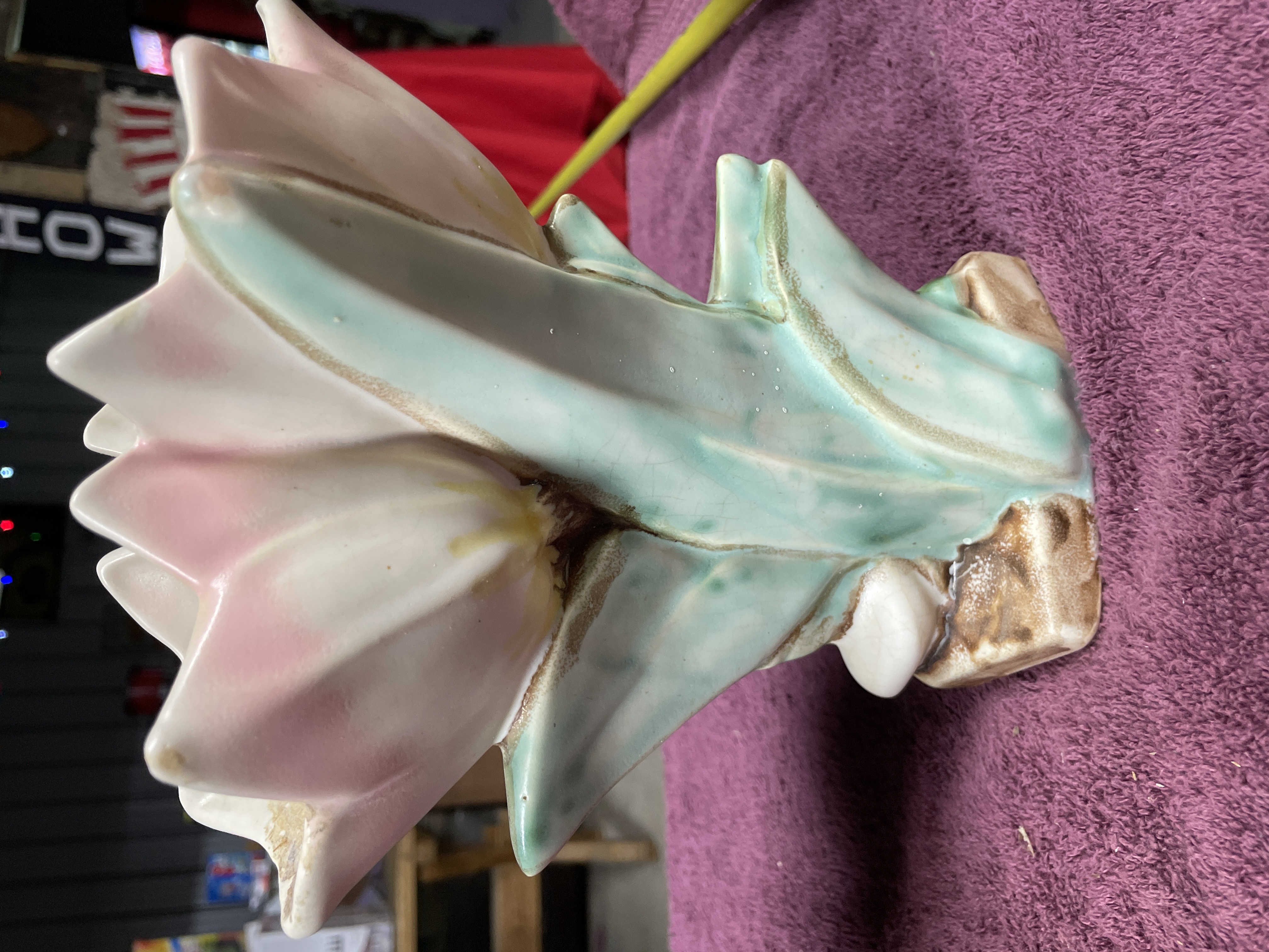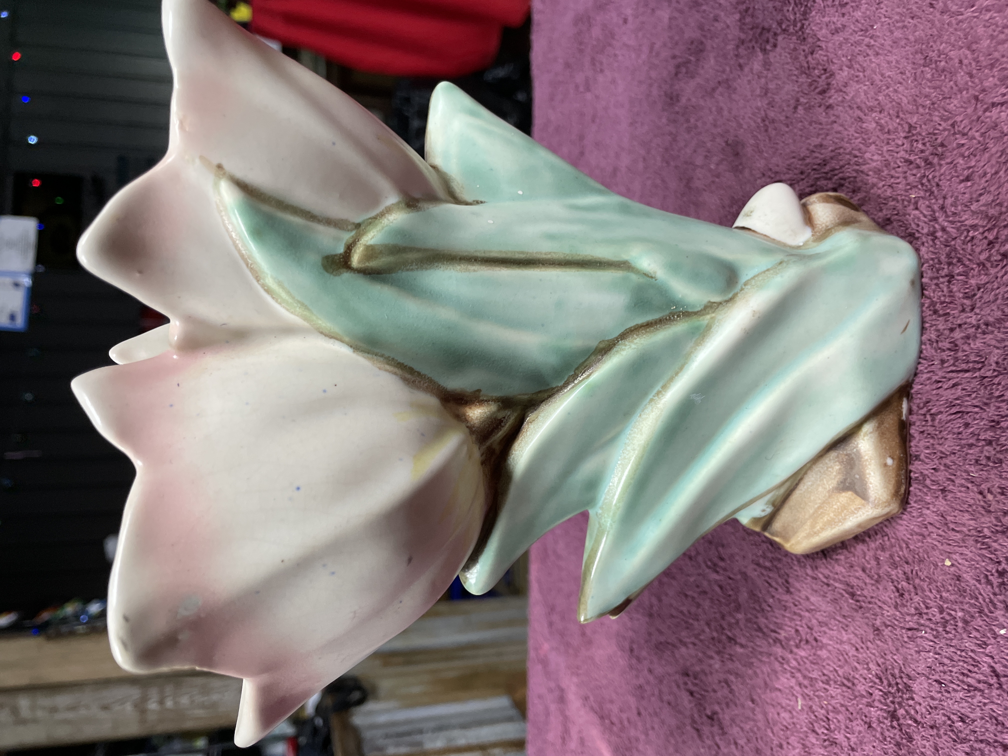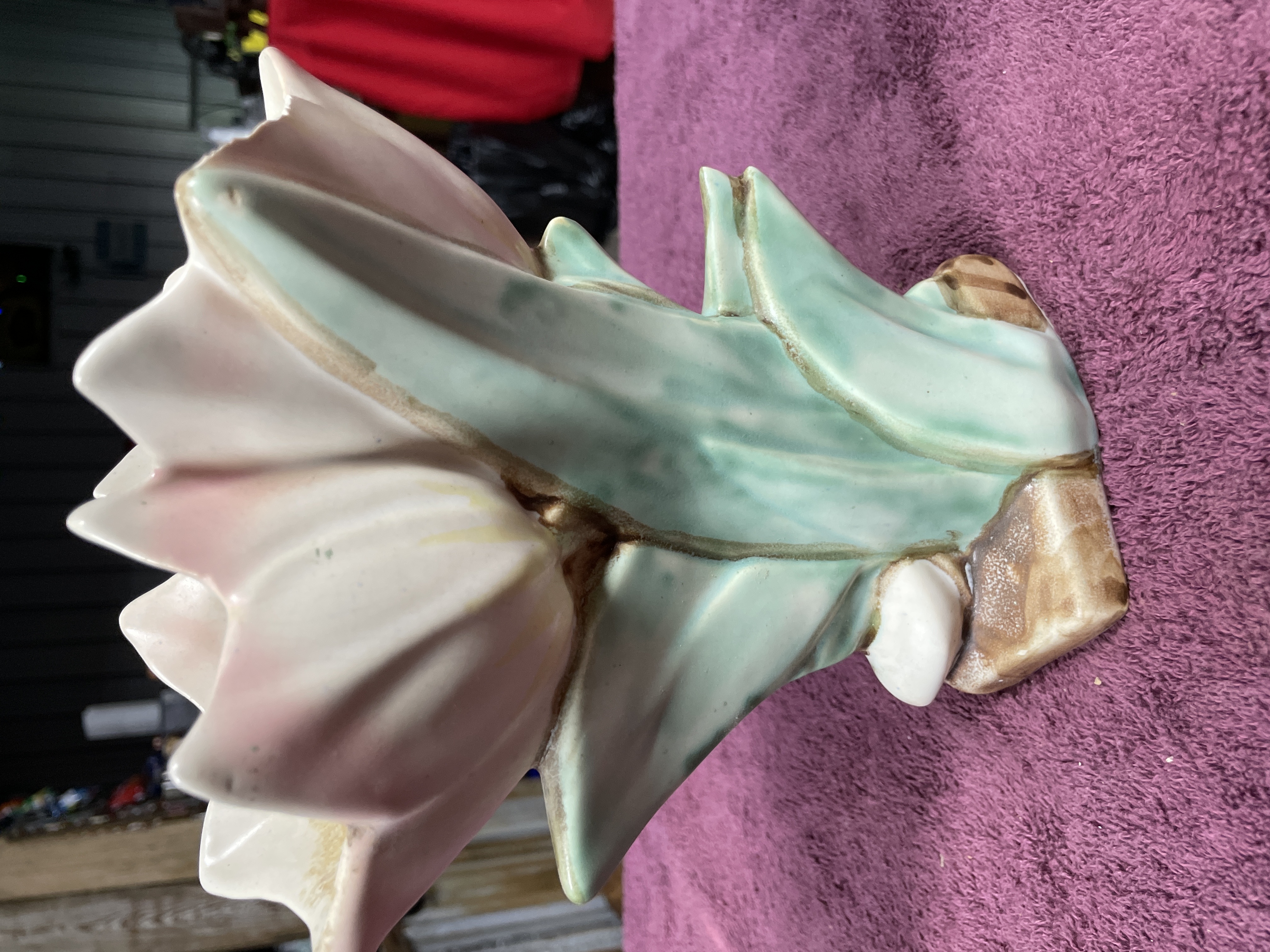 A pair of glazed ceramic planters or vases executed in the style of mid-century floral pottery. Each piece is molded to depict a large, stylized flower, possibly a hyacinth or tulip, emerging from a base of large, pointed foliage. The decoration utilizes multi-tone glazes, featuring white and pink shading on the flower petals, mottled teal and blue-green on the supporting leaves, and a textured brown glaze applied to the small, square bases. The unglazed undersides display visible crazing on the white glaze patch and a raised circular or spiral molding mark, though no legible manufacturer text or numbers are present.