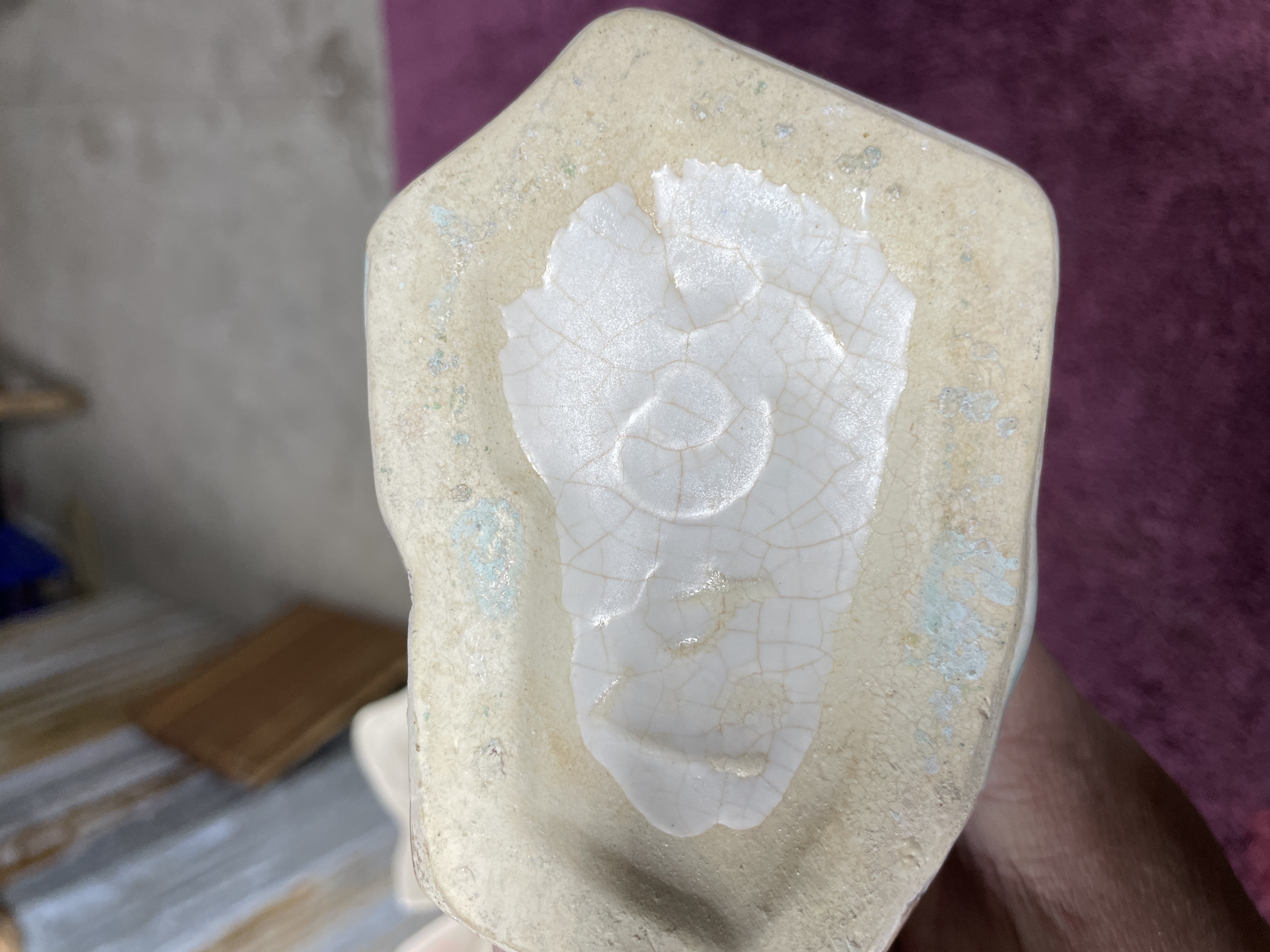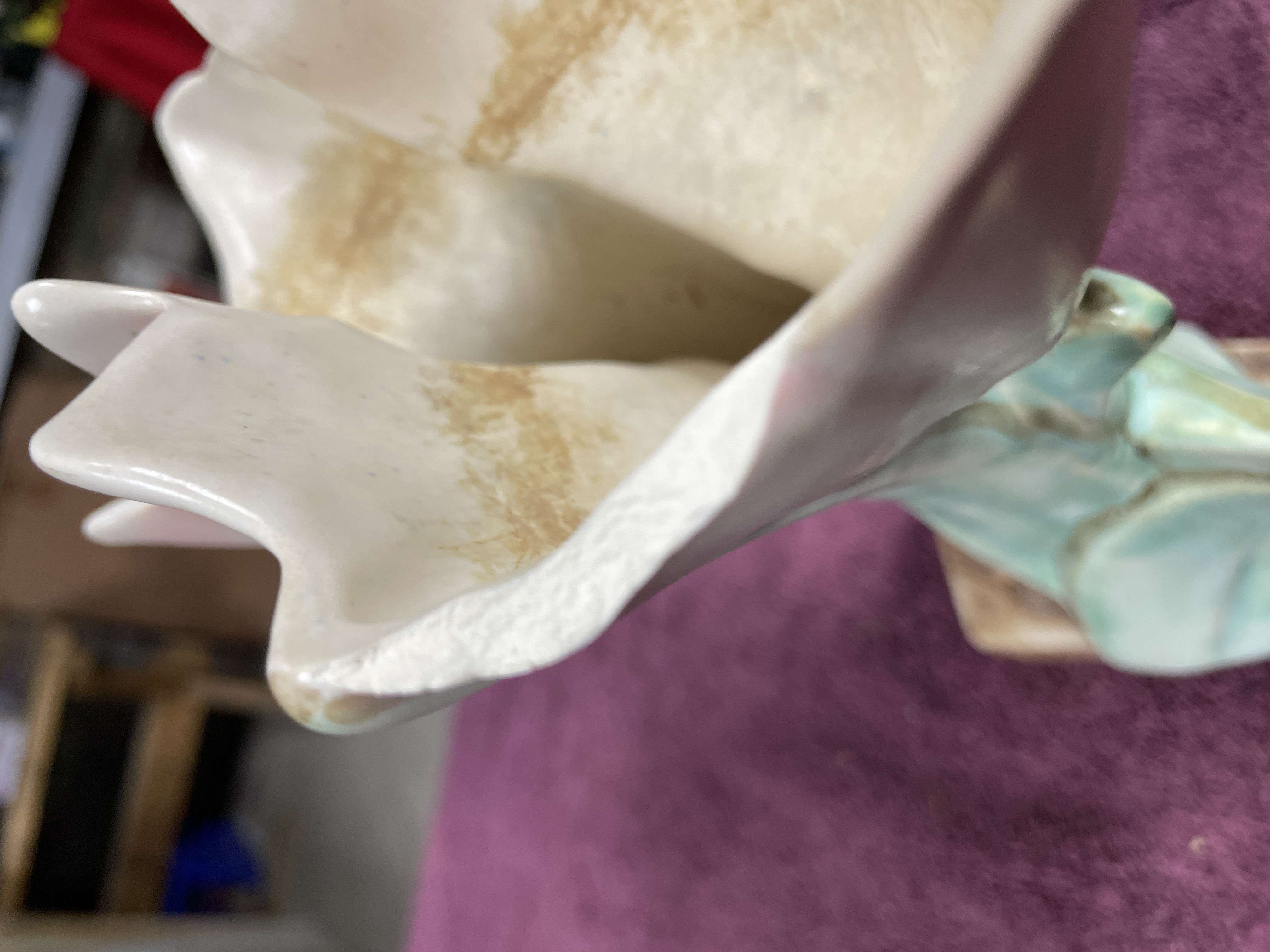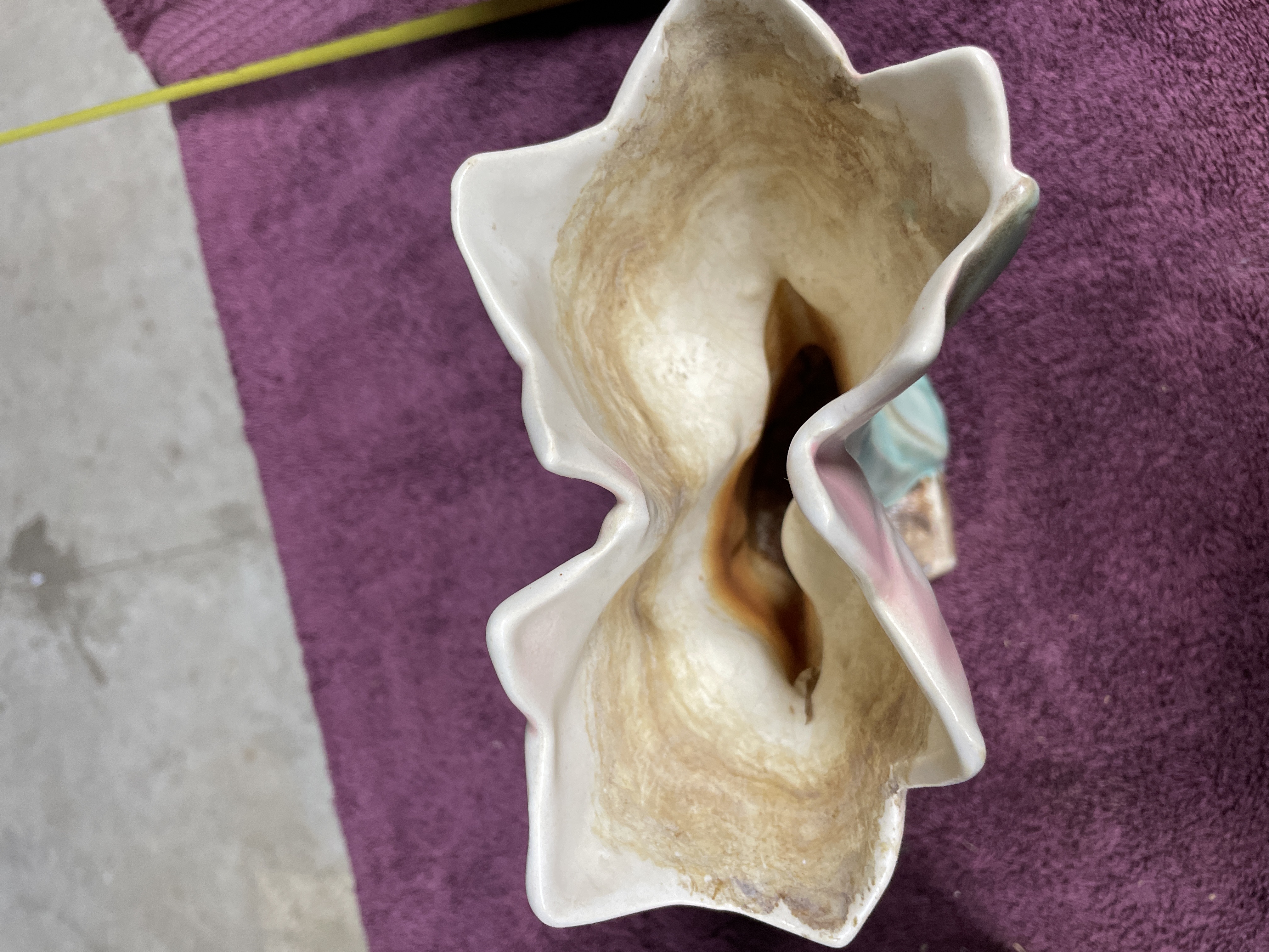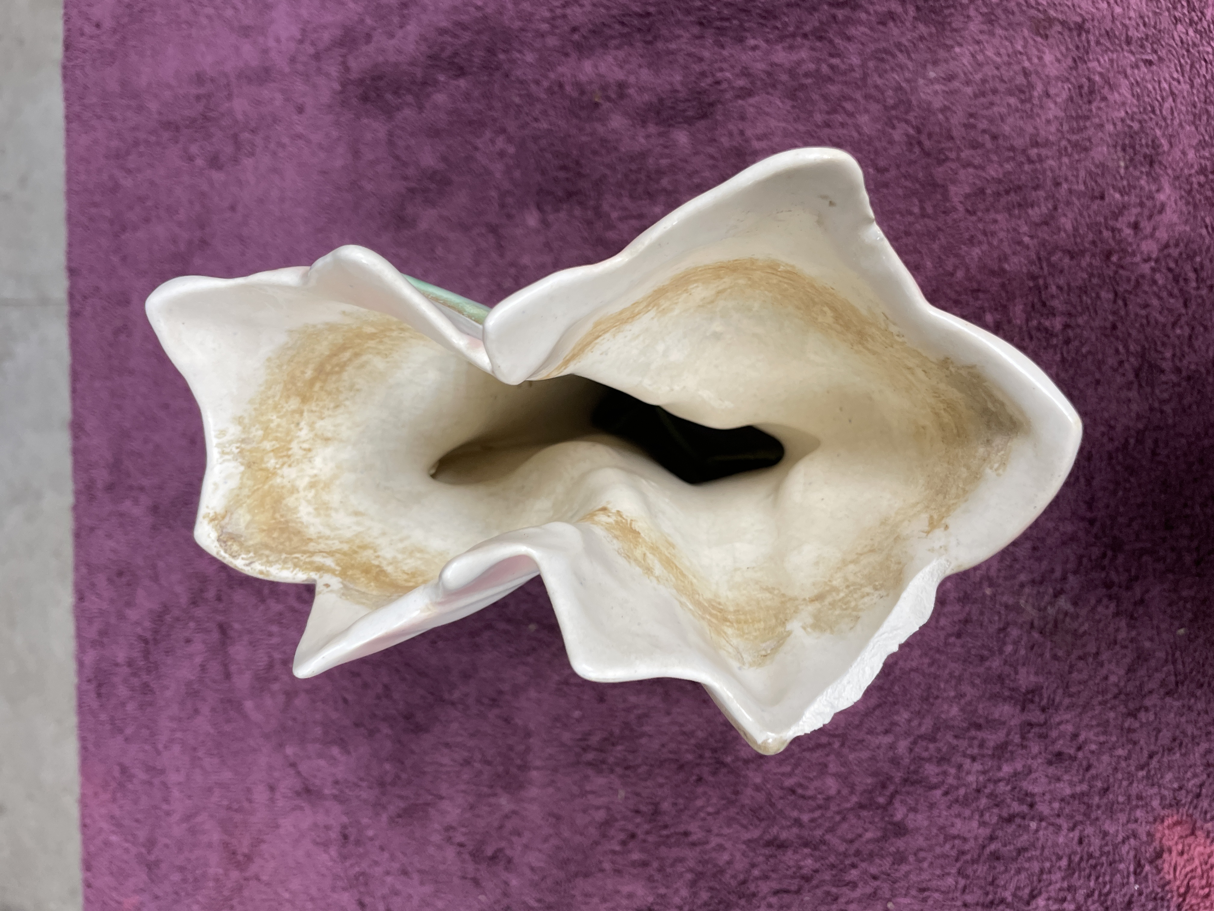 A pair of glazed ceramic planters or vases executed in the style of mid-century floral pottery. Each piece is molded to depict a large, stylized flower, possibly a hyacinth or tulip, emerging from a base of large, pointed foliage. The decoration utilizes multi-tone glazes, featuring white and pink shading on the flower petals, mottled teal and blue-green on the supporting leaves, and a textured brown glaze applied to the small, square bases. The unglazed undersides display visible crazing on the white glaze patch and a raised circular or spiral molding mark, though no legible manufacturer text or numbers are present.