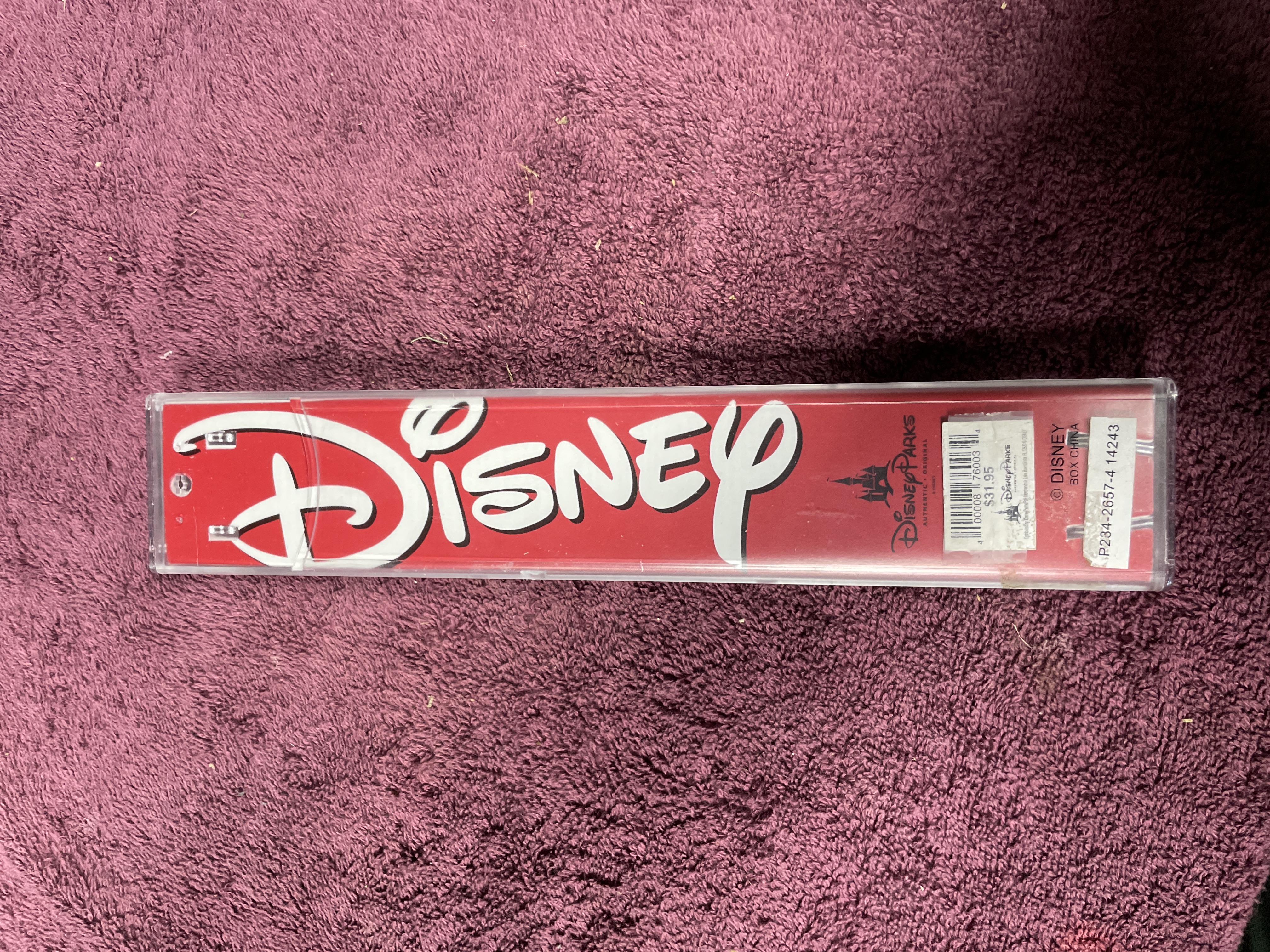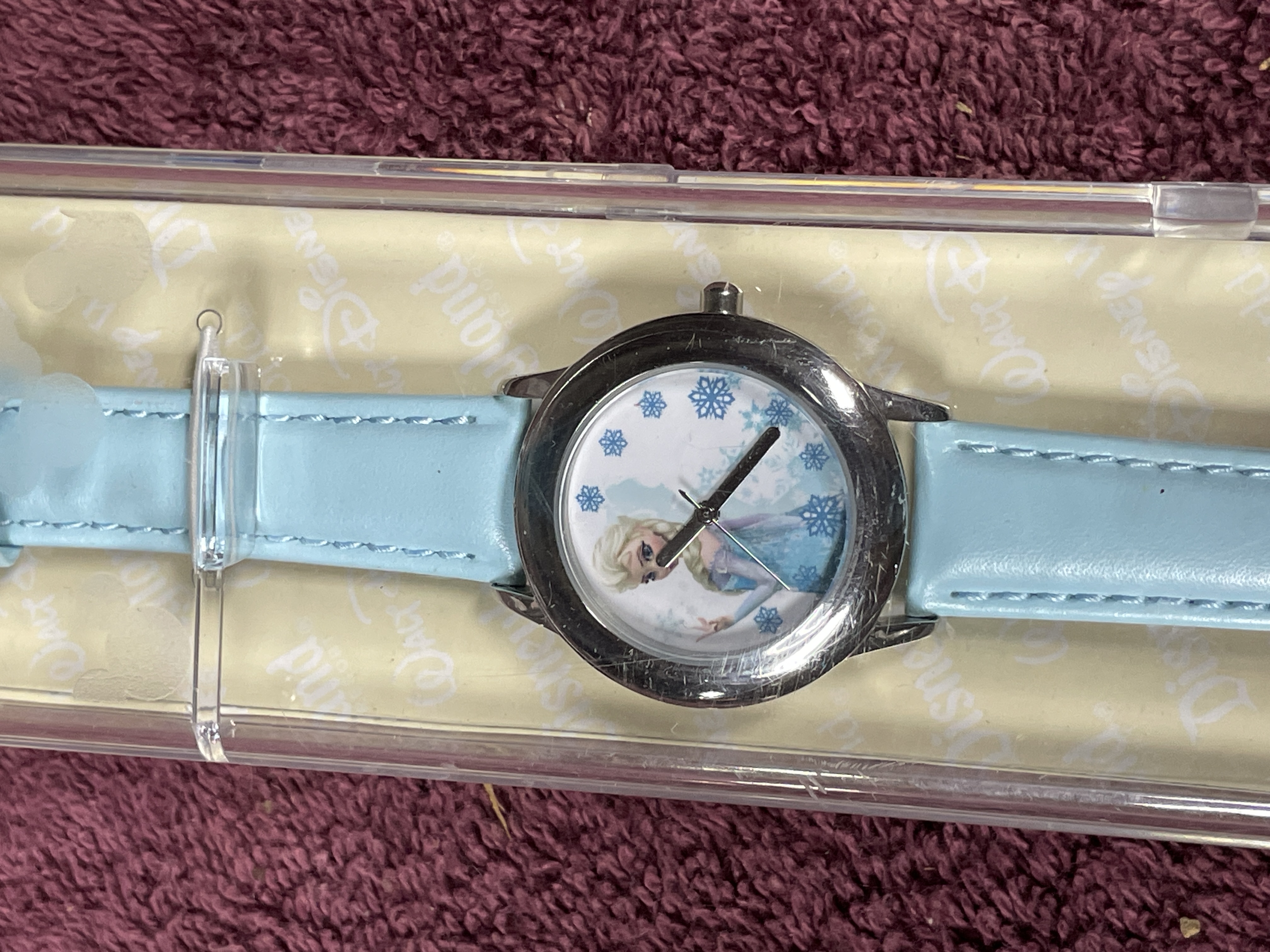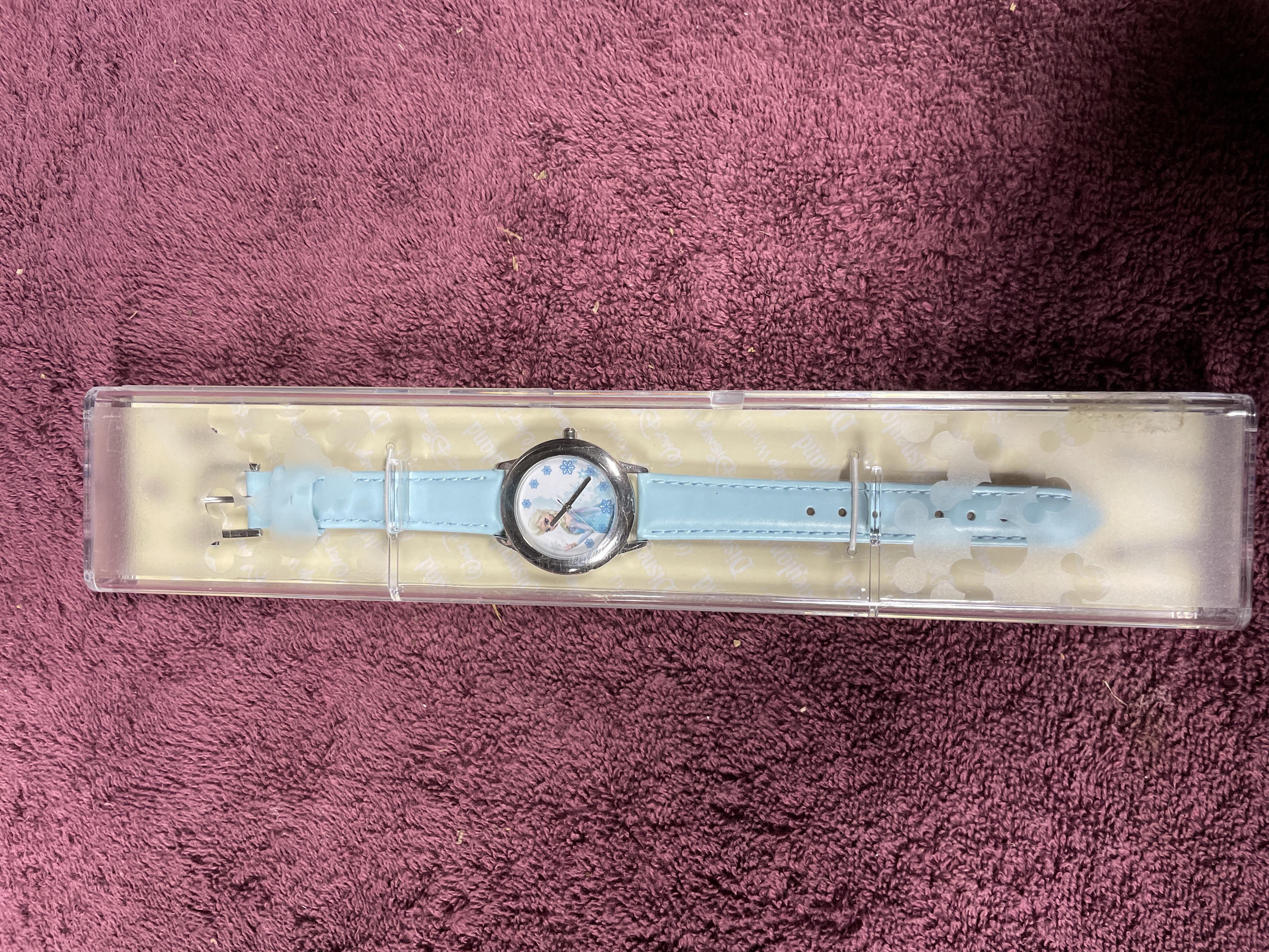 A single wristwatch produced for Disney Parks, featuring the character Elsa from the film Frozen. The watch has a round, silver-tone metal case housing a dial that depicts Elsa surrounded by blue and white snowflake motifs, utilizing black hour and minute hands. The watch is fitted with a light blue strap, likely synthetic material, secured with white contrast stitching. The item is presented in its original clear plastic presentation case with a yellow interior insert displaying repeated Walt Disney World and Disney branding. The red backing insert features the large Disney logo, the Disney Parks logo, a barcode, and text reading ® DISNEY and BOX CHINA. A retail price tag of $31.95 is affixed to the backing.