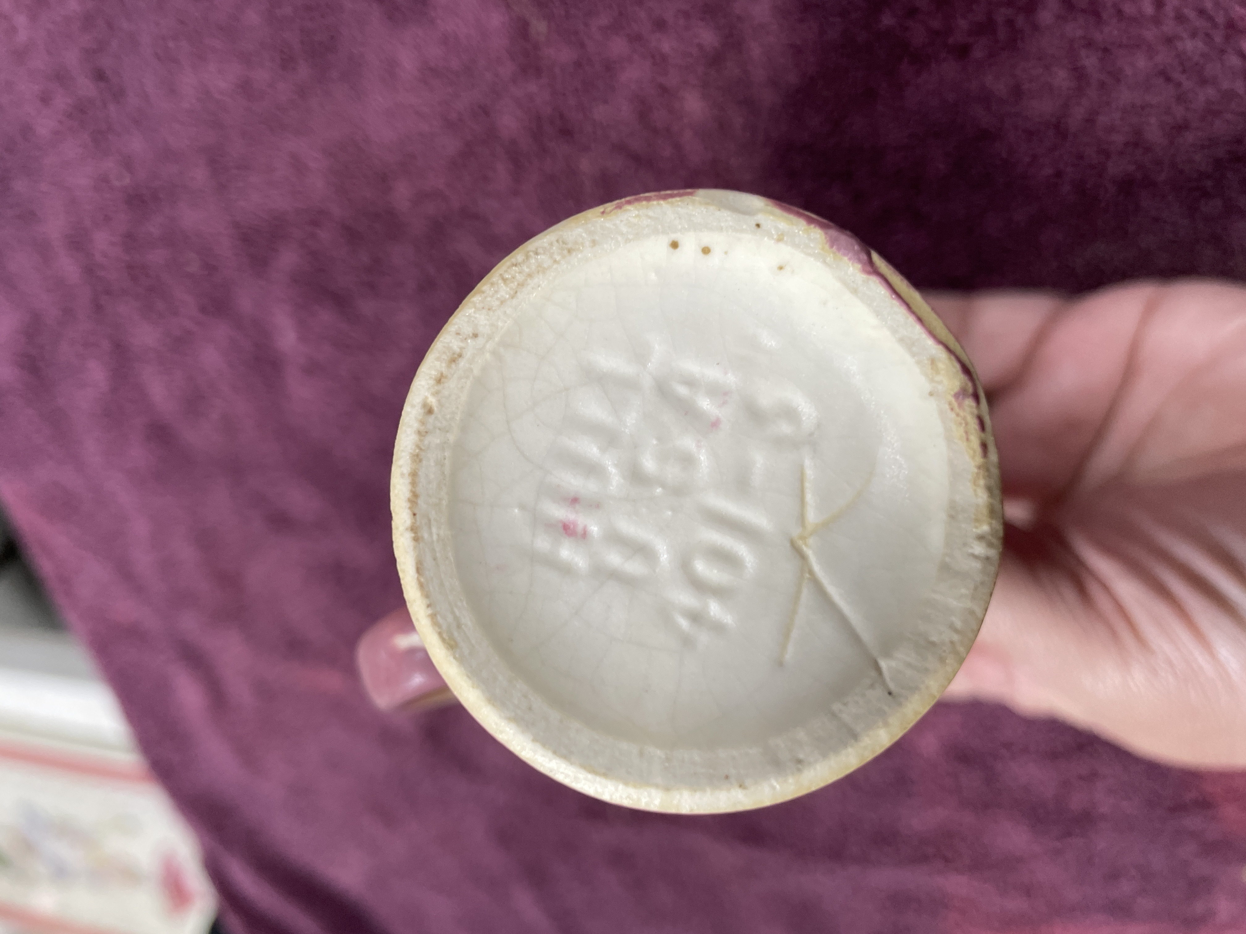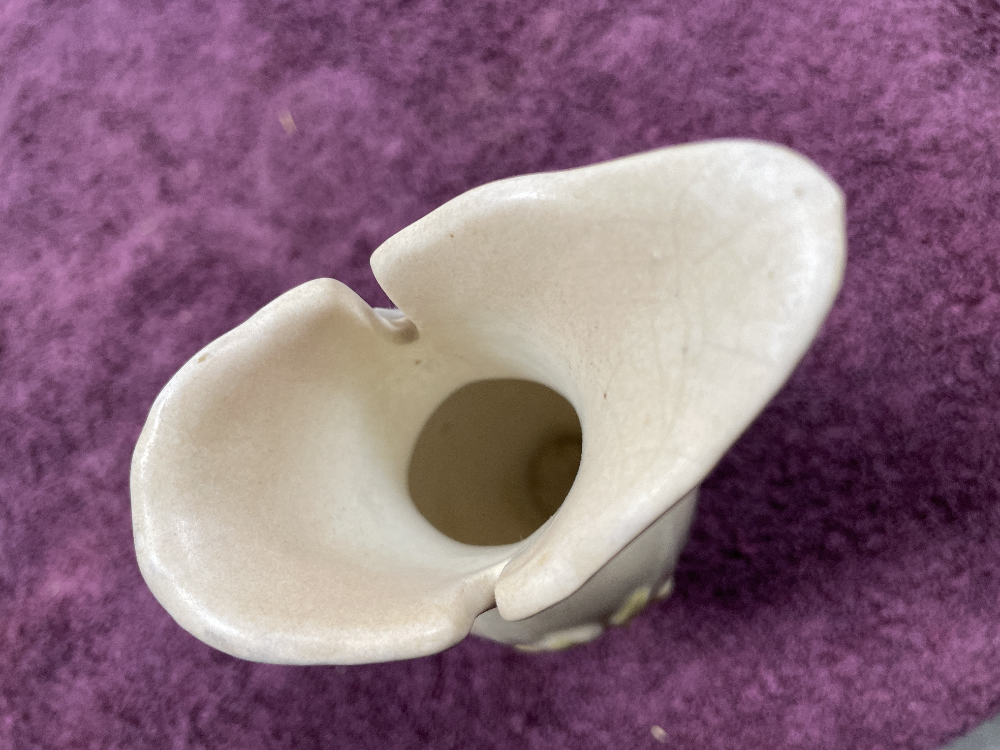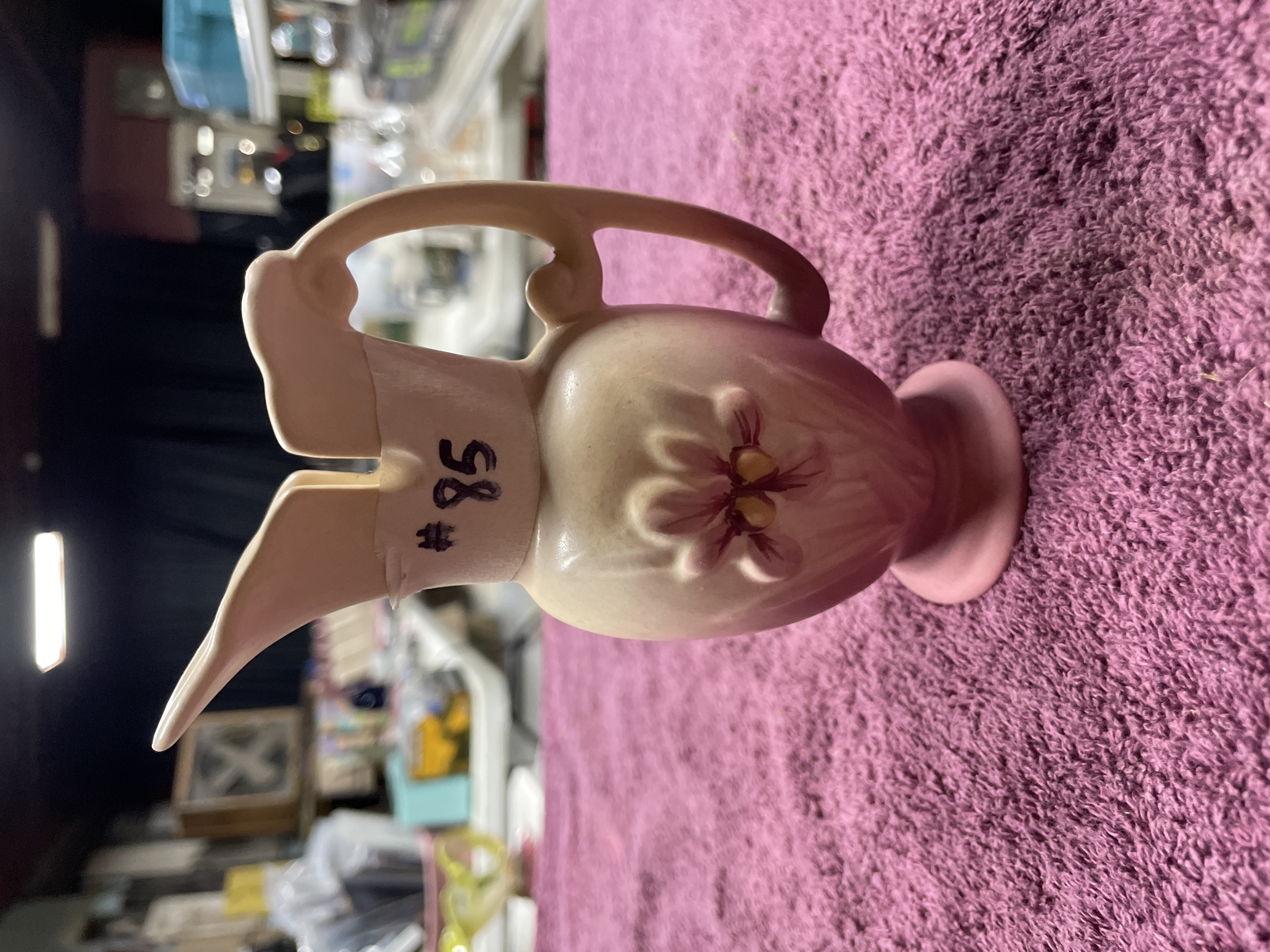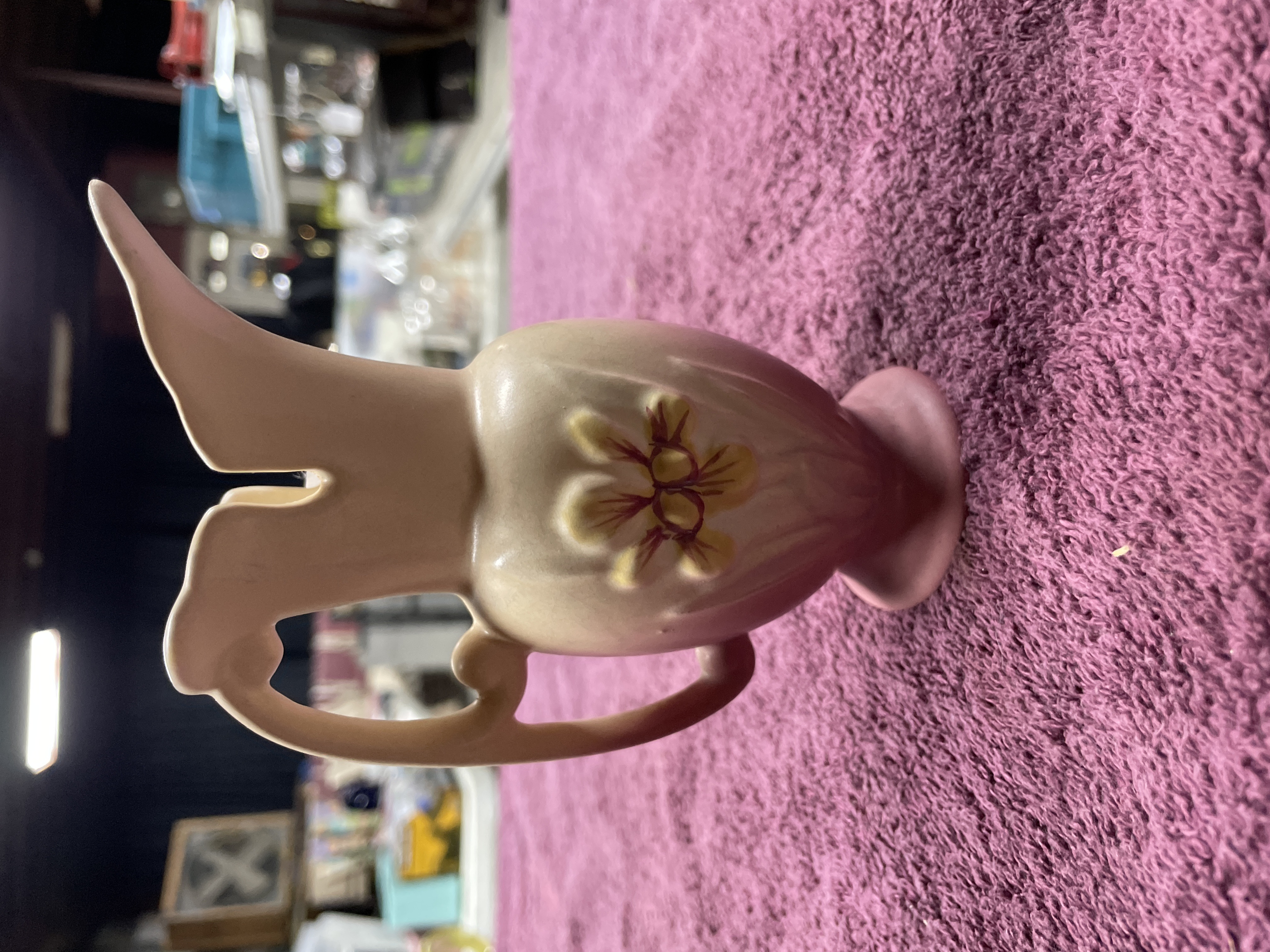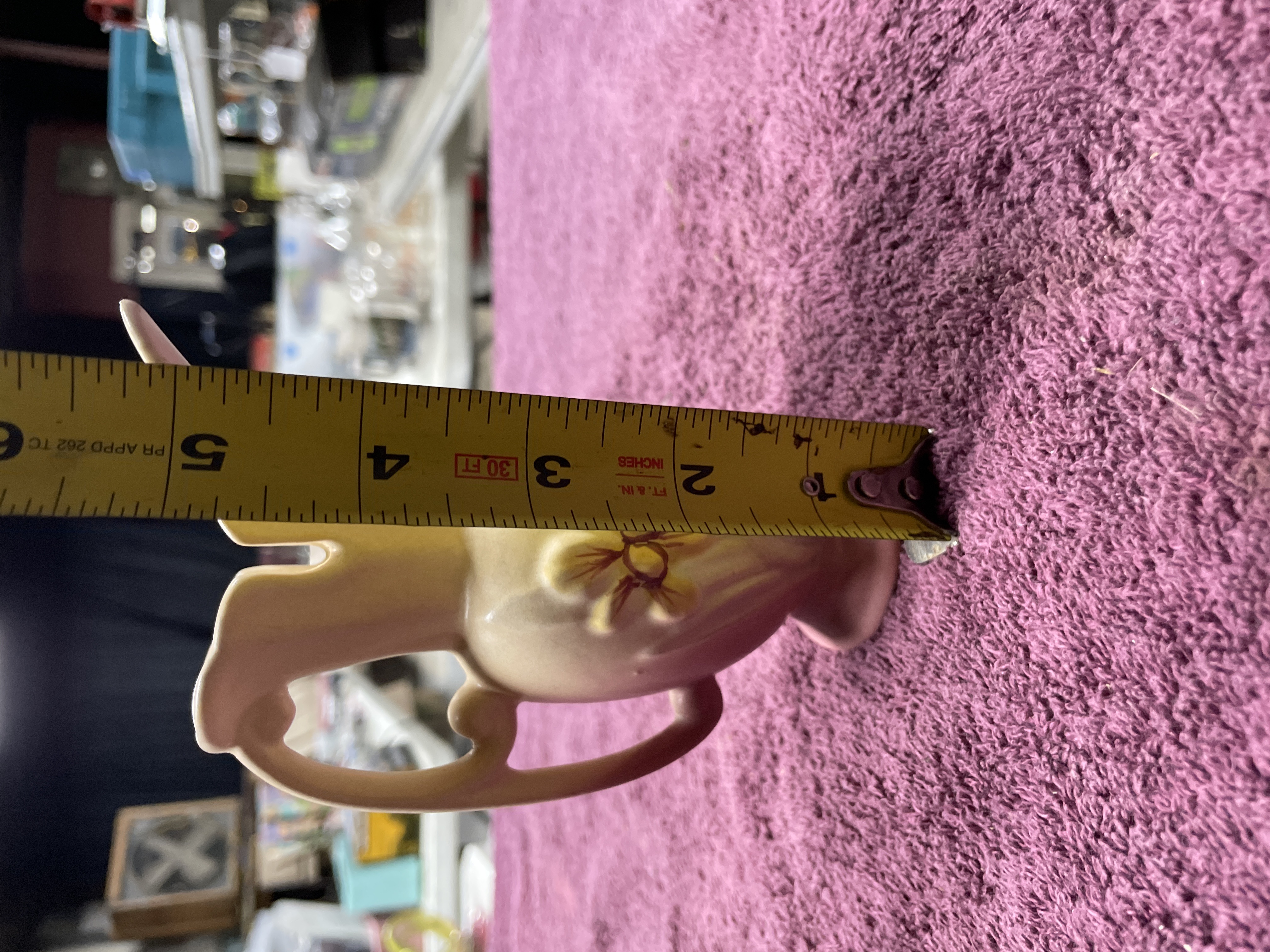 A single glazed ceramic miniature pitcher or ewer produced by Hull Pottery in the Magnolia pattern, consistent with the Hull Art line. The vessel features a tapered body with a prominent handle and a sharp pouring spout. The glossy glaze transitions from a pale peach/cream at the upper body and rim to a deeper rose pink toward the pedestal base. The front is adorned with a single raised relief floral design, accented with yellow and maroon. The underside of the base bears the impressed mark HULL 101 / 6.