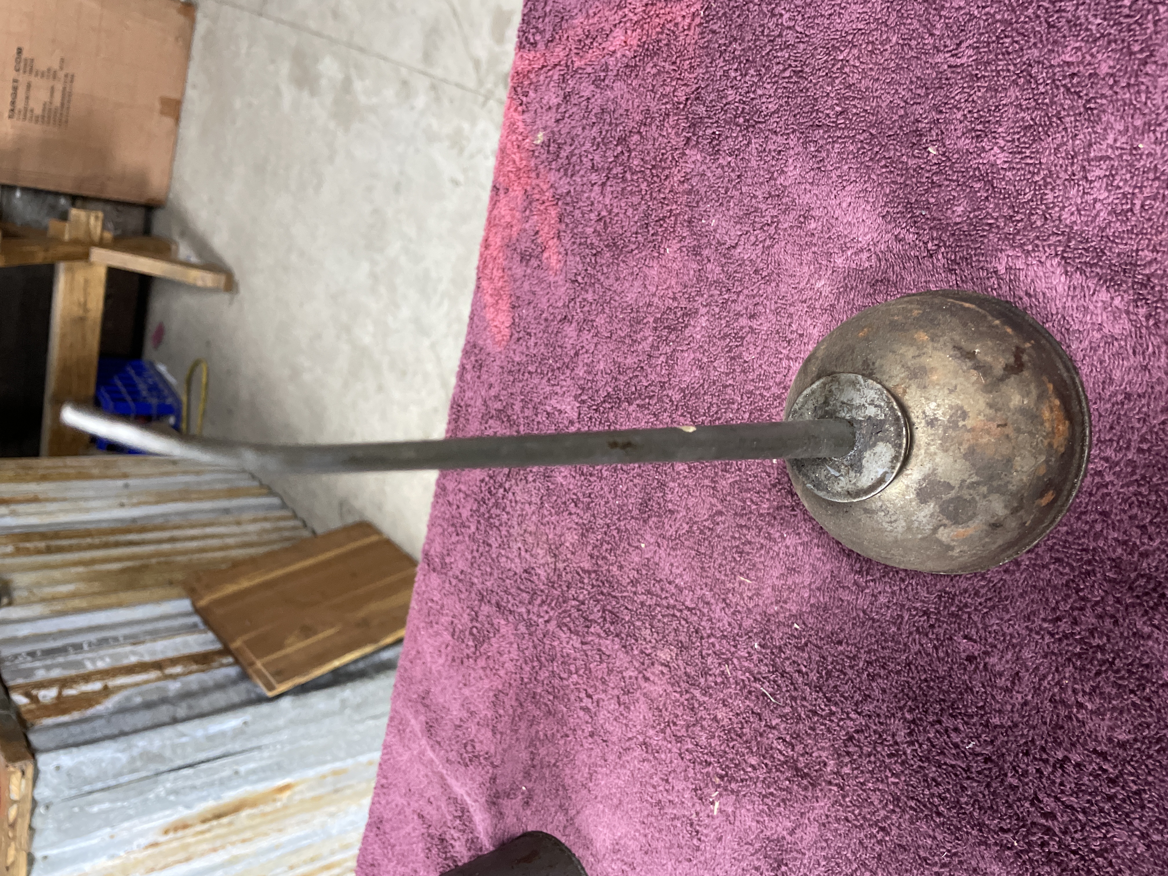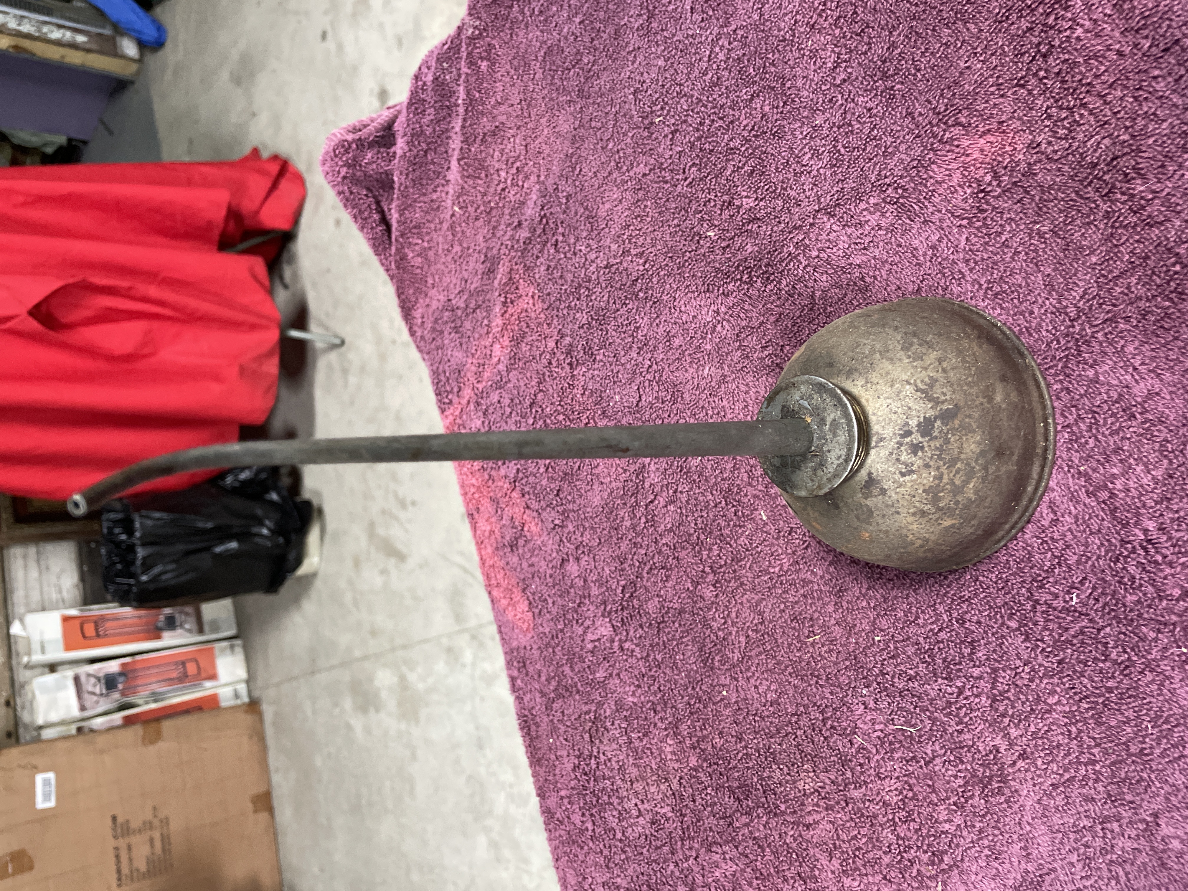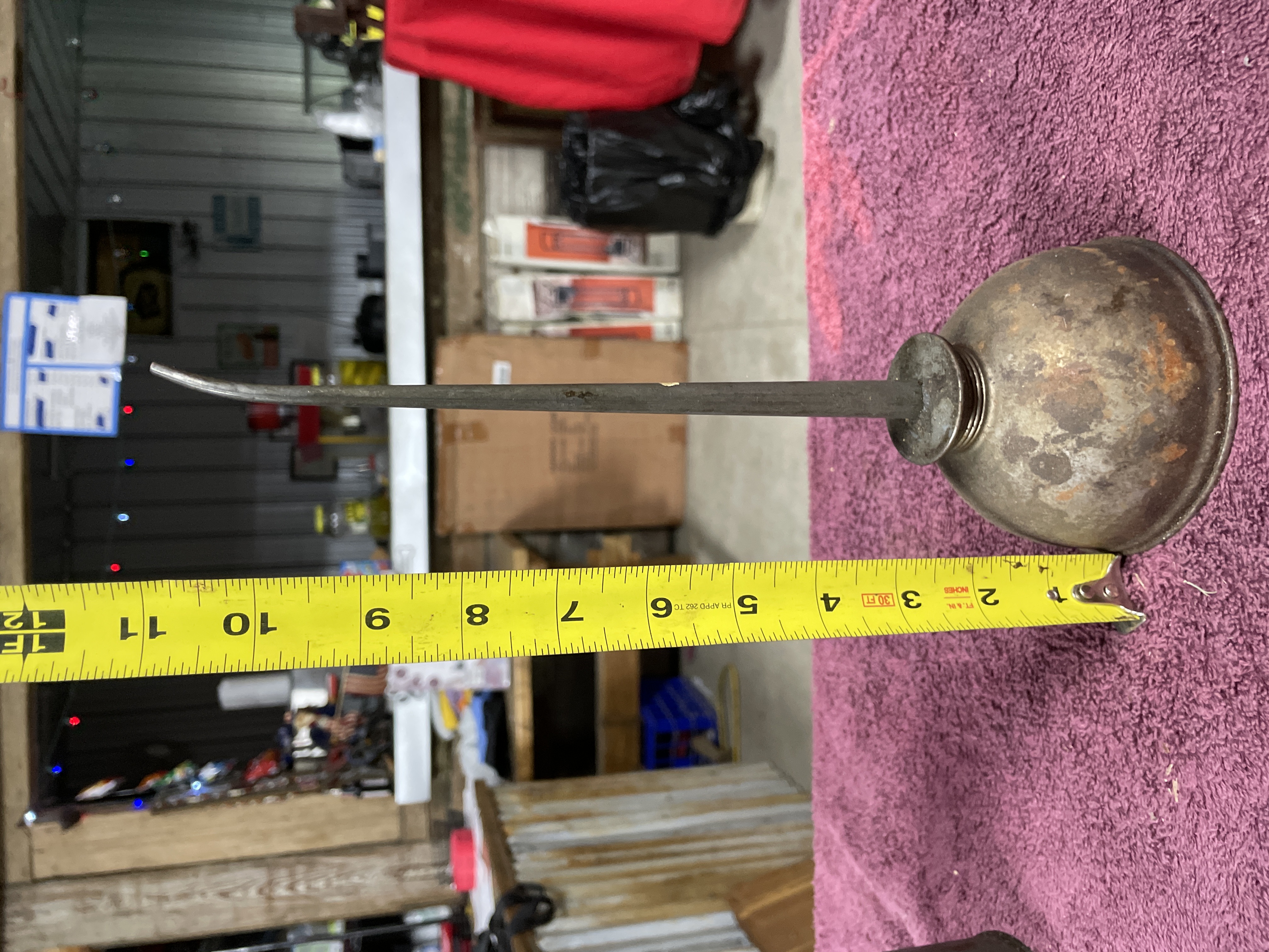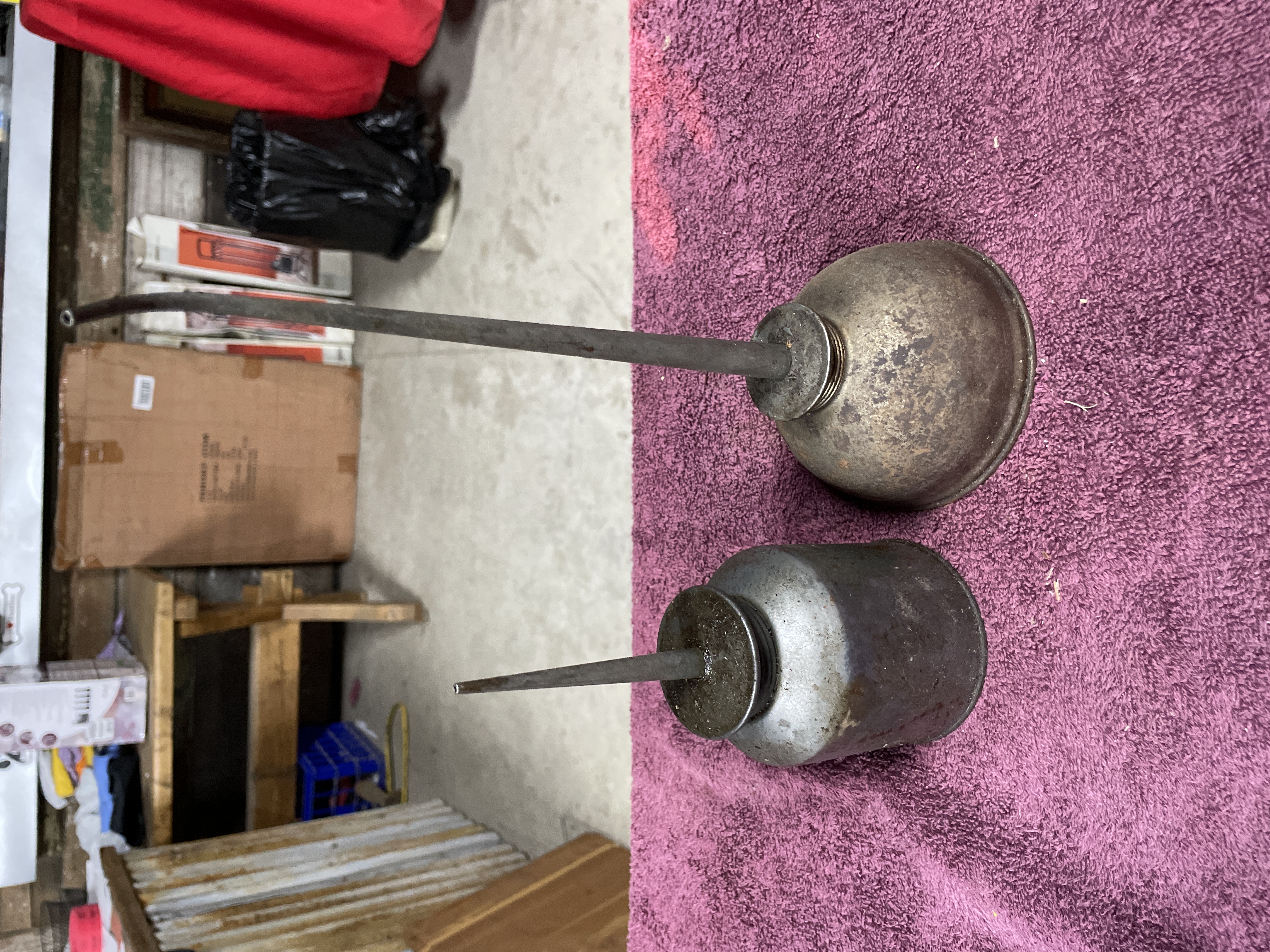 The lot consists of a pair of vintage metal oilers (oil cans) constructed of tin or steel, typical of industrial workshop equipment. Neither oiler displays visible manufacturer markings or text. The first oiler features a cylindrical body and a short, straight, conical spout. The second oiler has a spherical or dome-shaped body and a long, narrow, slightly bent spout. Both items show heavy signs of use consistent with their function as oil dispensers.