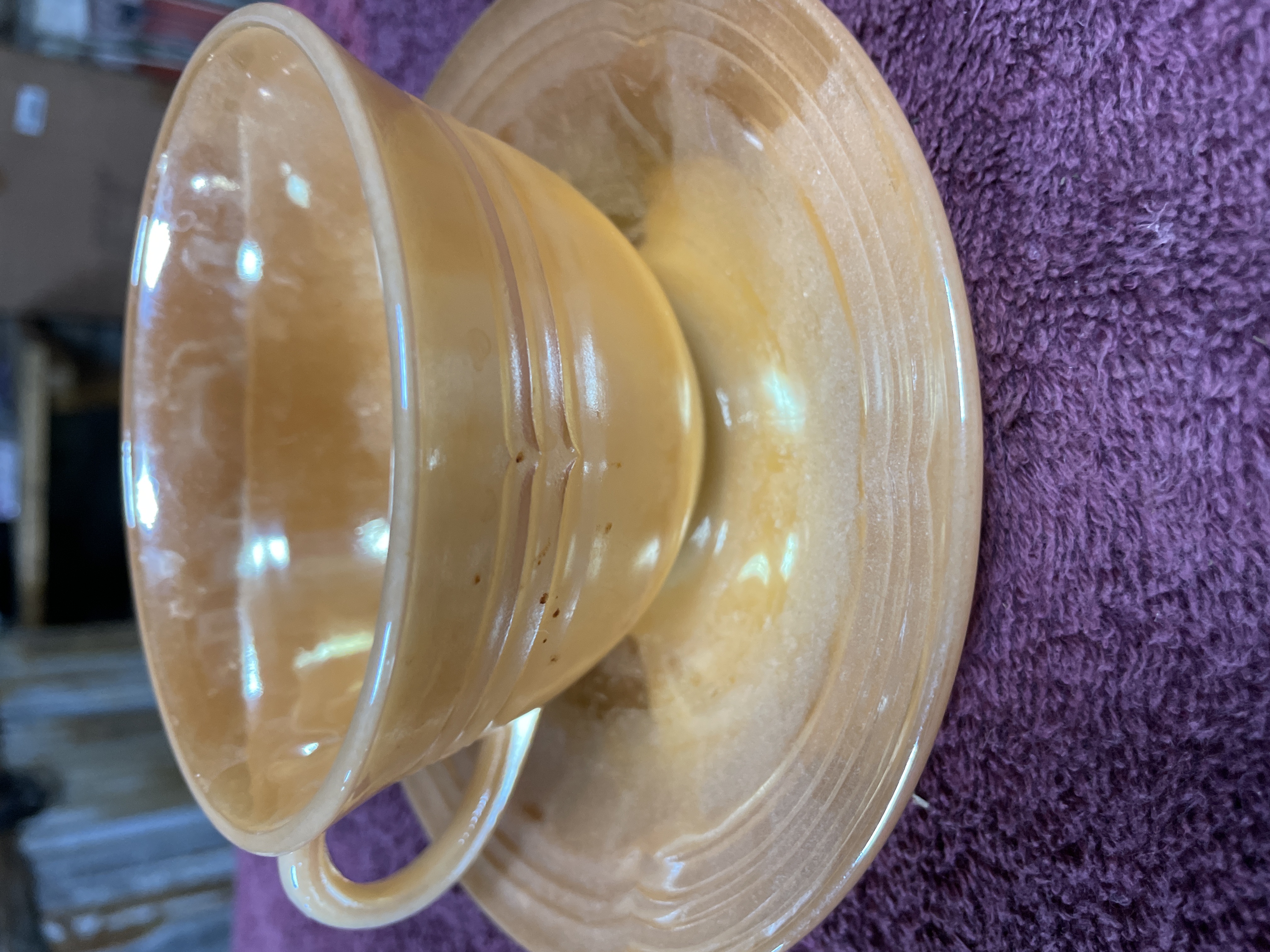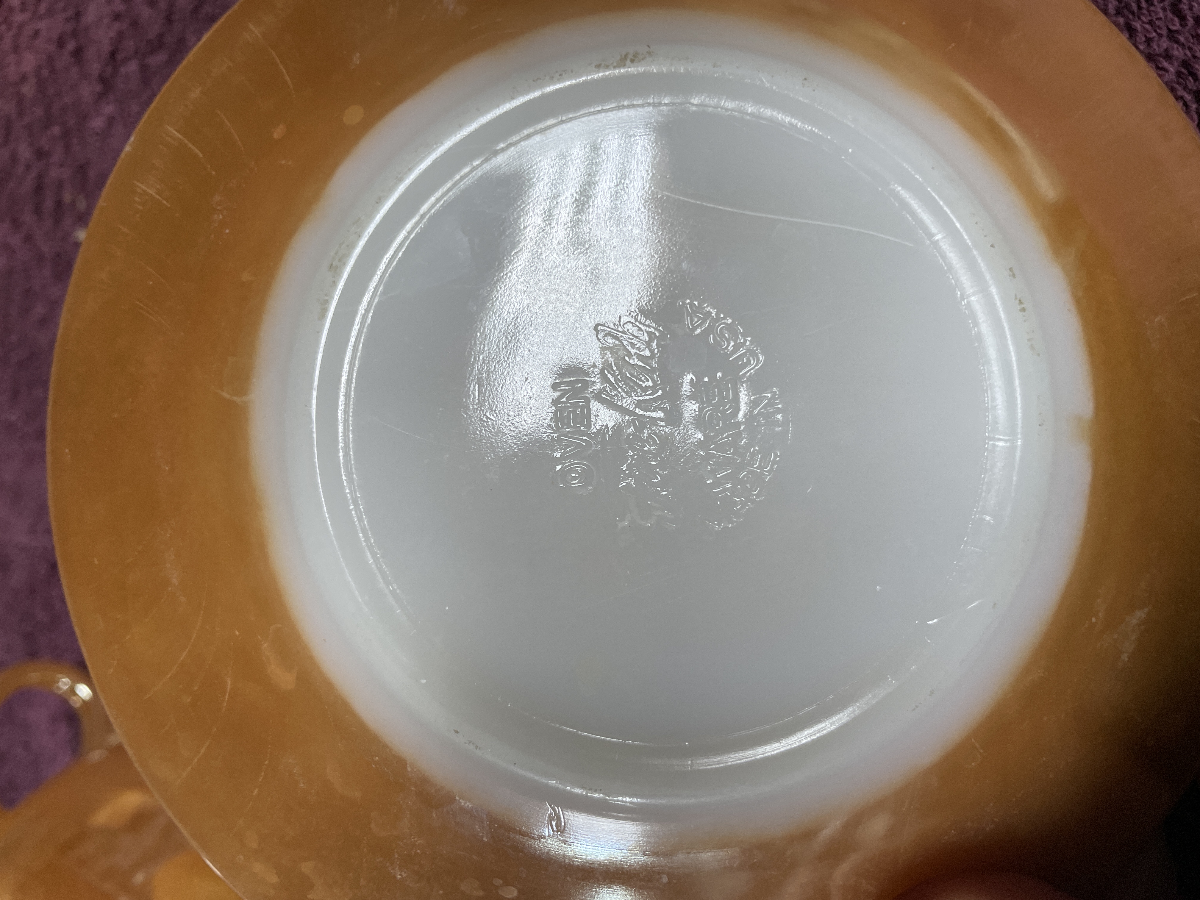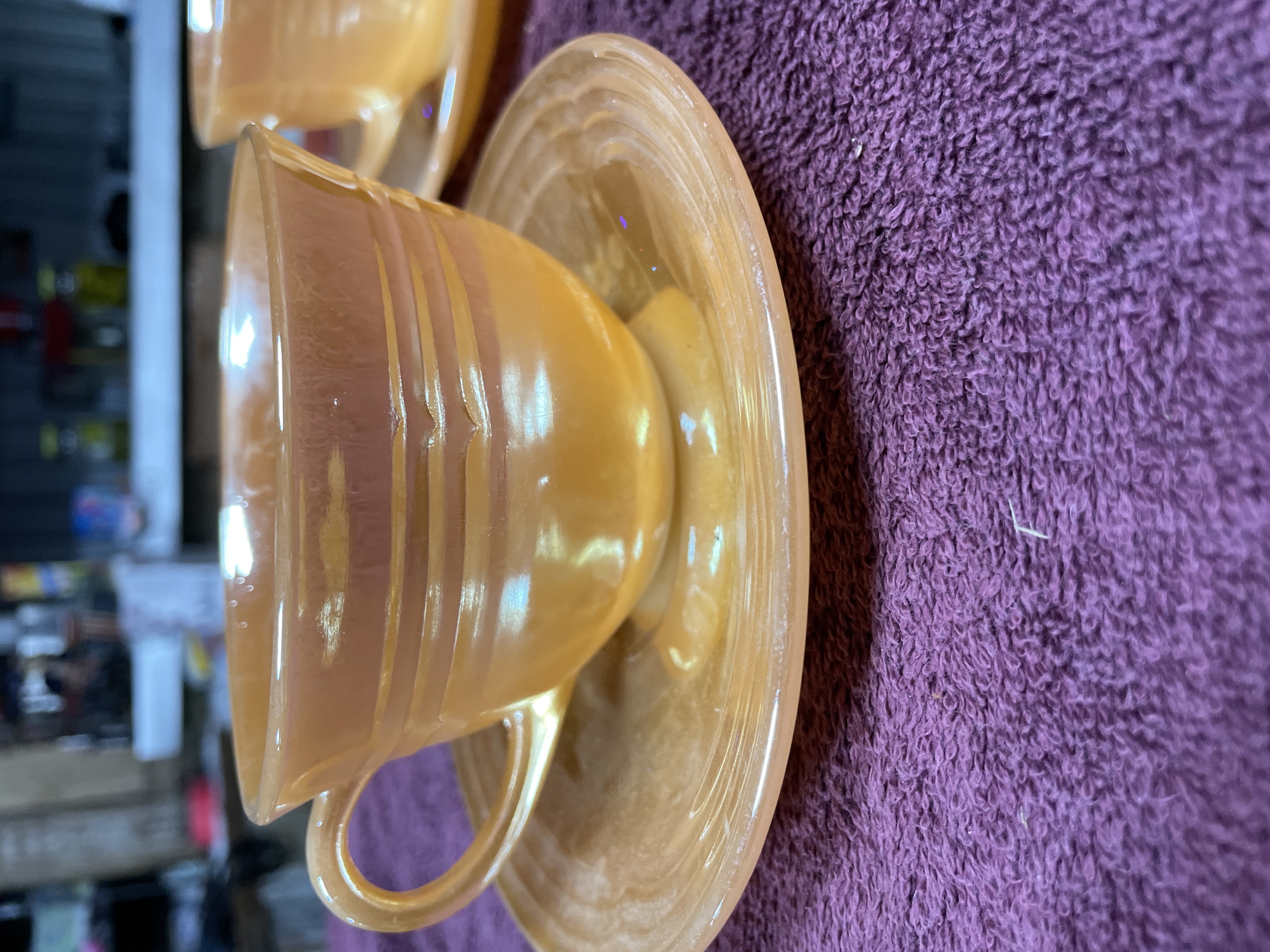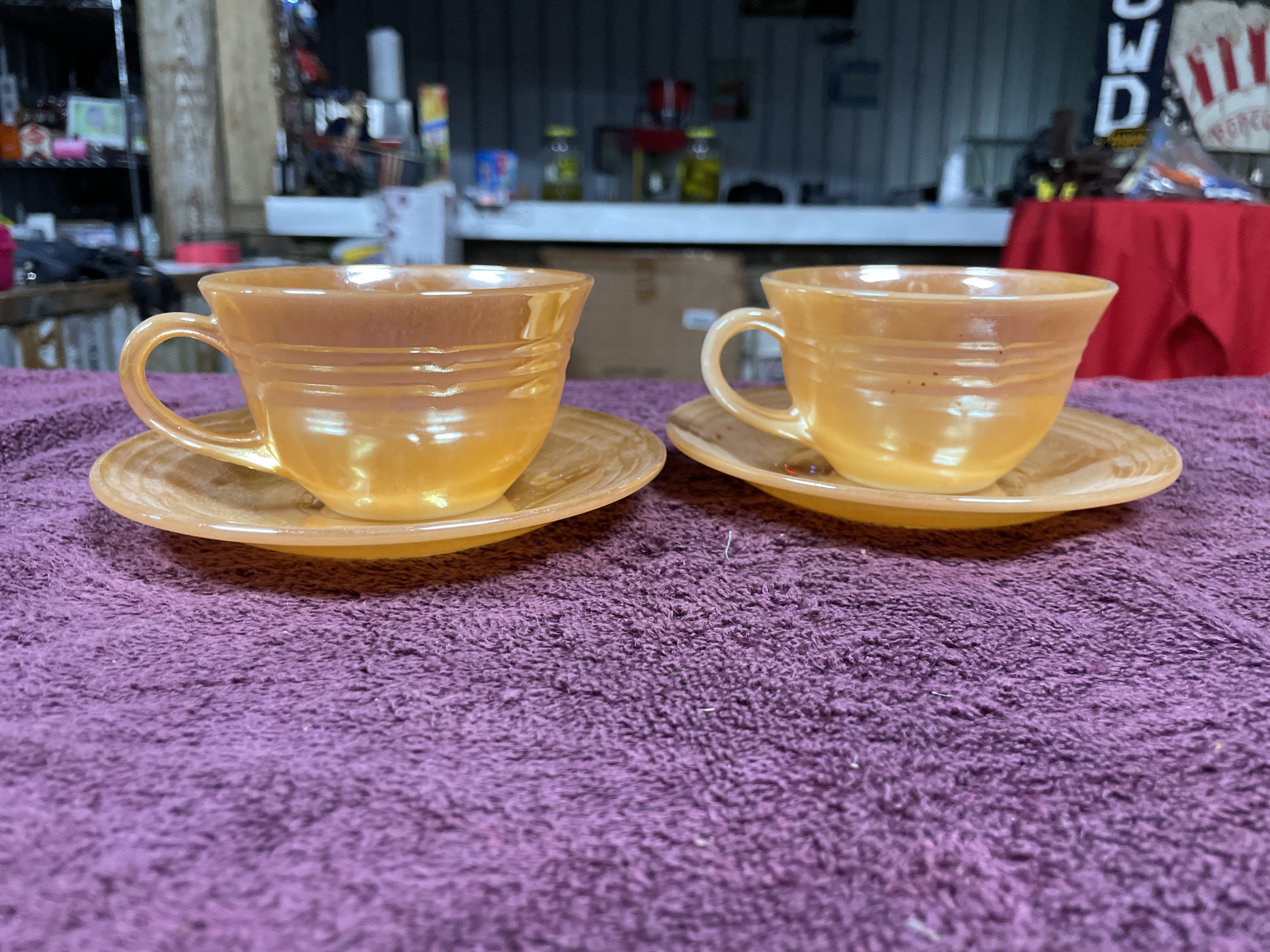 A collection of four pieces of molded milk glass tableware, comprising two cup and saucer sets, manufactured by Anchor Hocking under the Fire-King line in the Peach Lustre pattern. The objects feature an iridescent marigold or amber finish applied over the opal glass body. The cups are characterized by horizontal ribbing around the exterior, while the saucers display concentric rings. The base of both the cups and saucers are embossed with the manufacturer’s mark, reading OVEN Fire-King WARE MADE IN U.S.A.