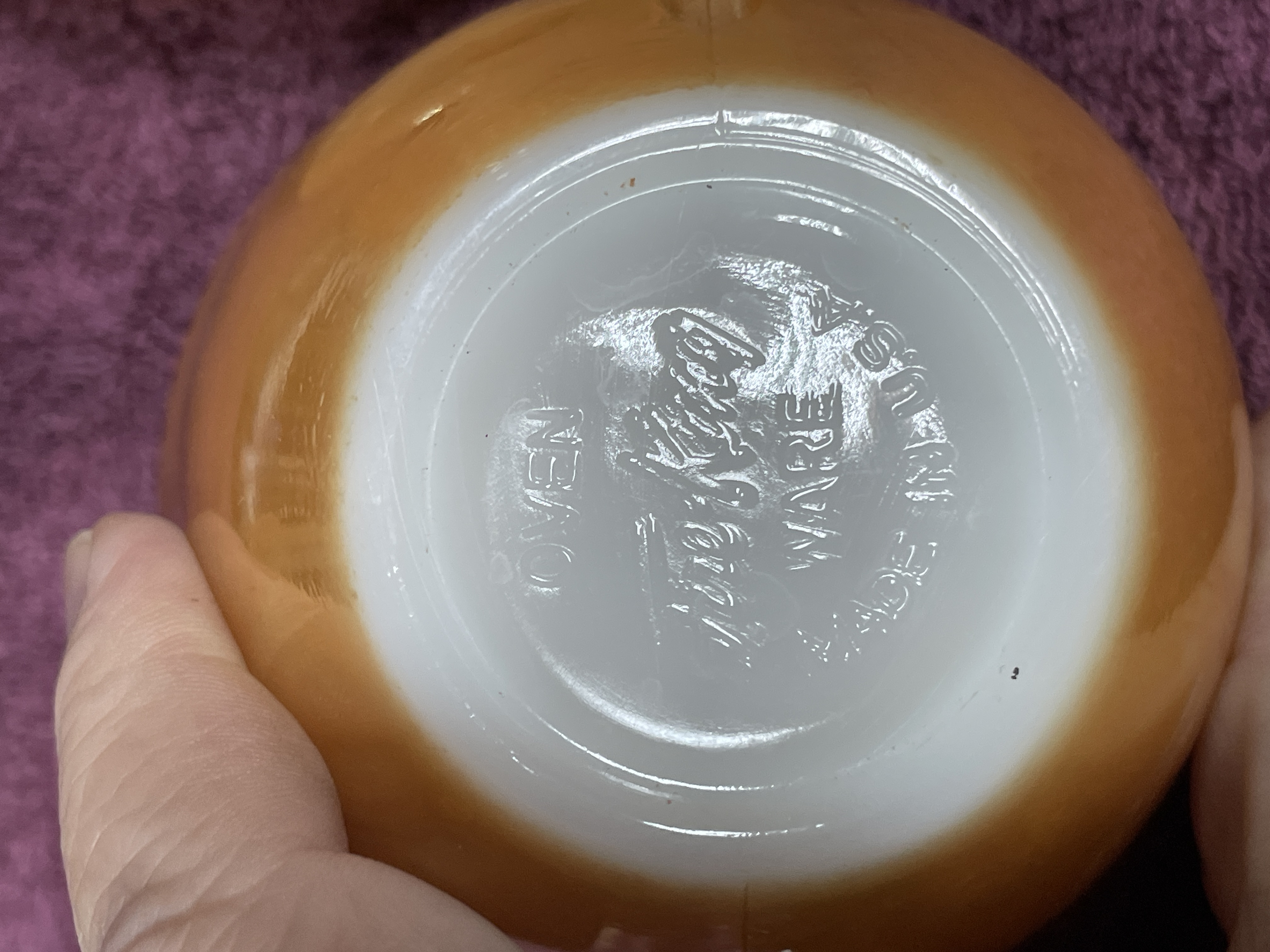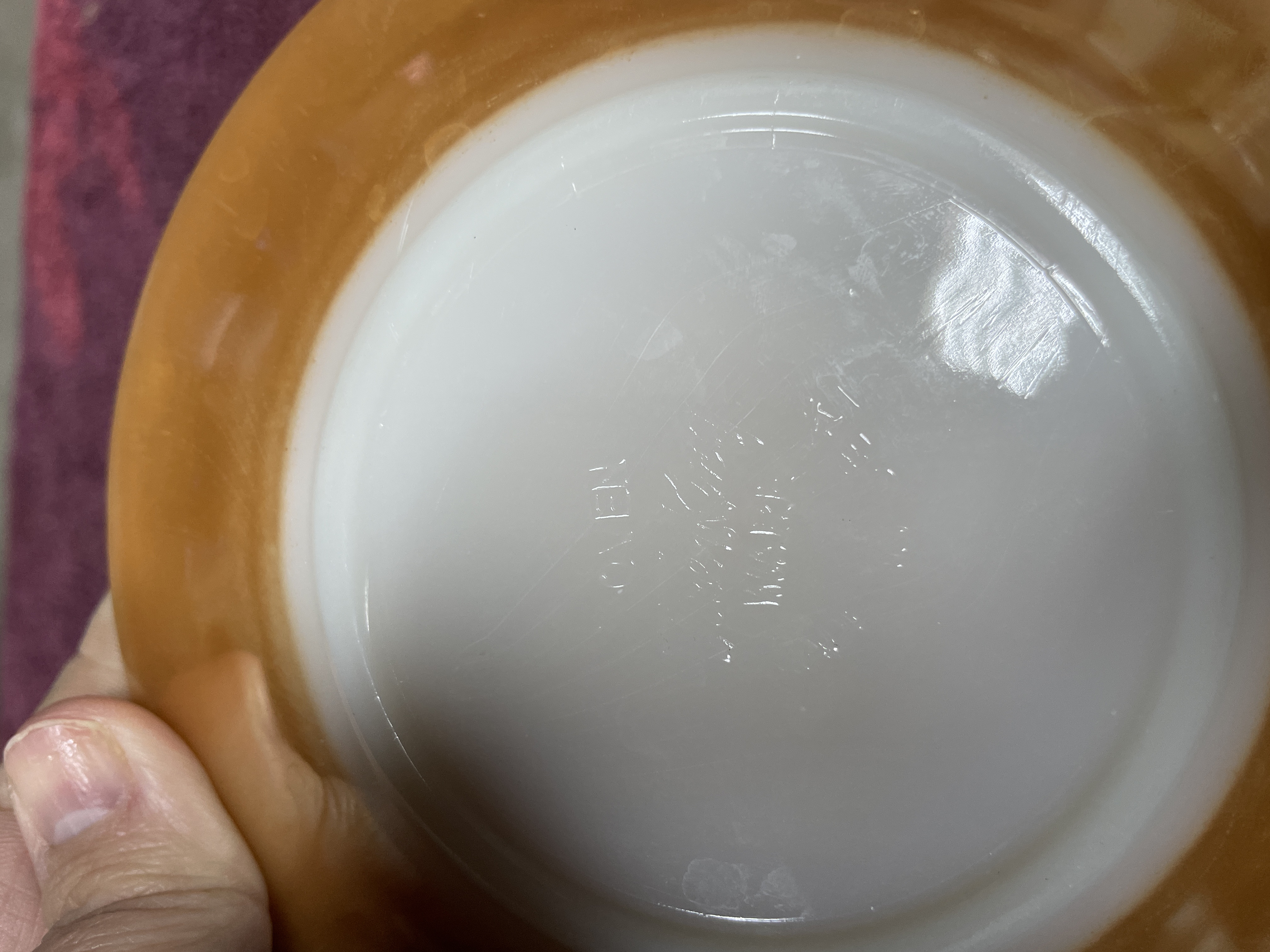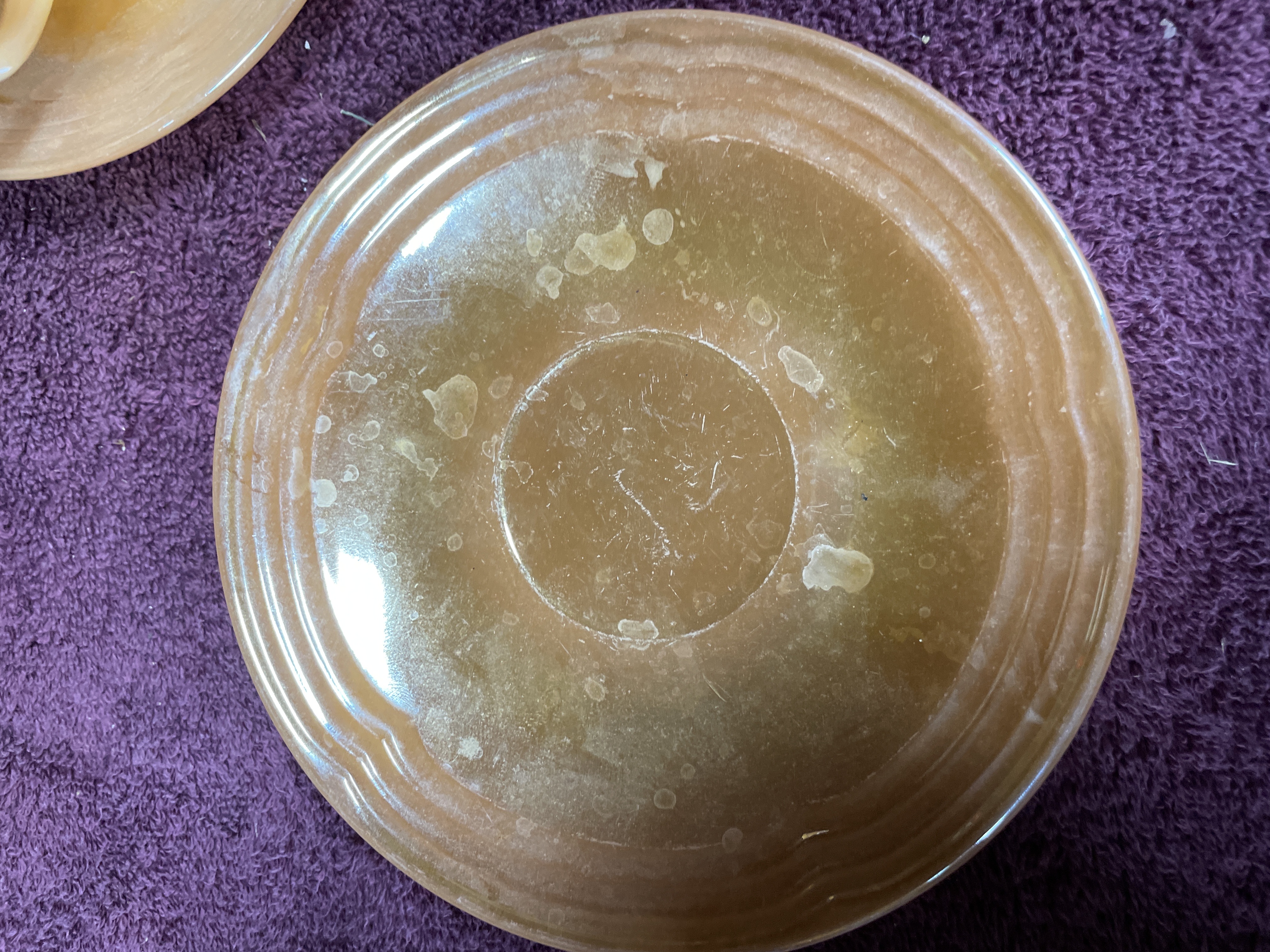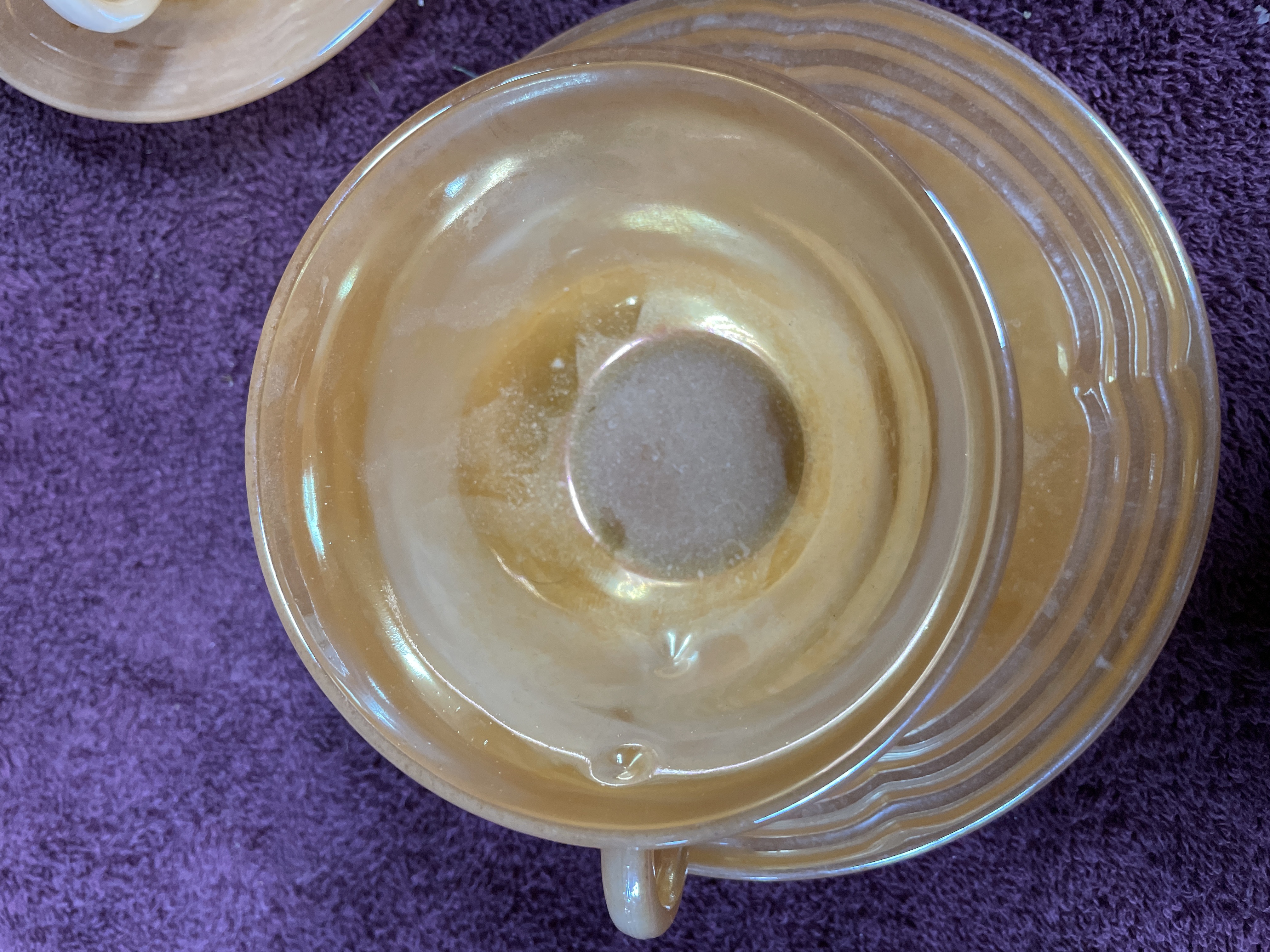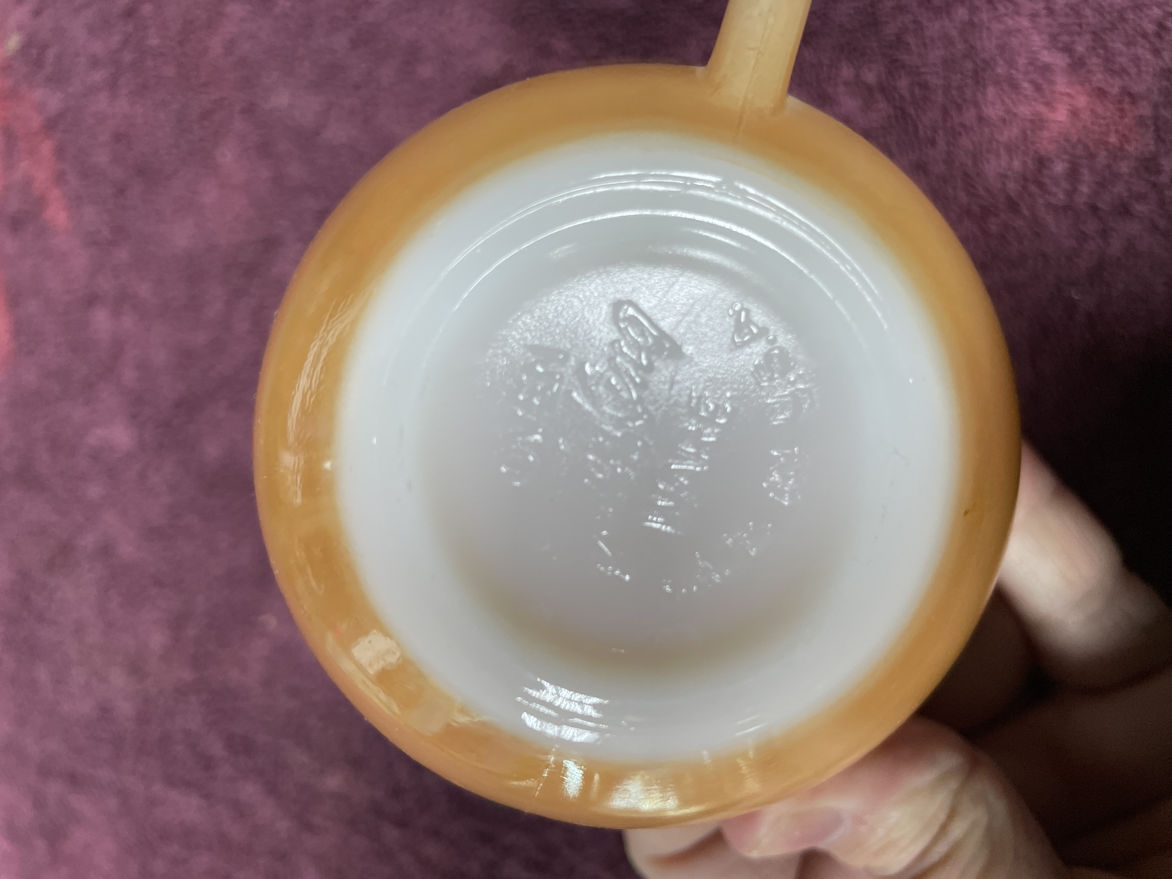 A collection of four pieces of molded milk glass tableware, comprising two cup and saucer sets, manufactured by Anchor Hocking under the Fire-King line in the Peach Lustre pattern. The objects feature an iridescent marigold or amber finish applied over the opal glass body. The cups are characterized by horizontal ribbing around the exterior, while the saucers display concentric rings. The base of both the cups and saucers are embossed with the manufacturer’s mark, reading OVEN Fire-King WARE MADE IN U.S.A.