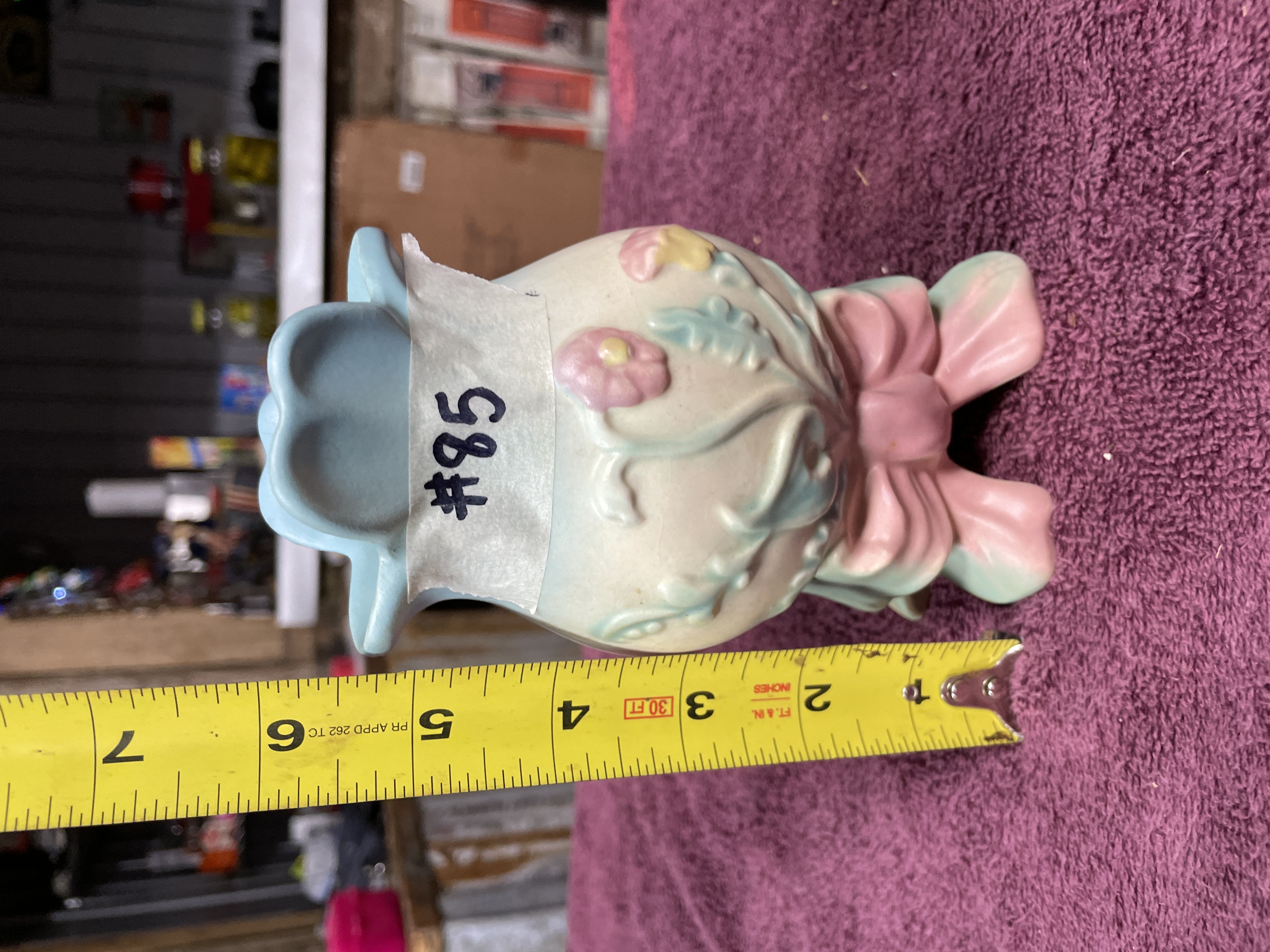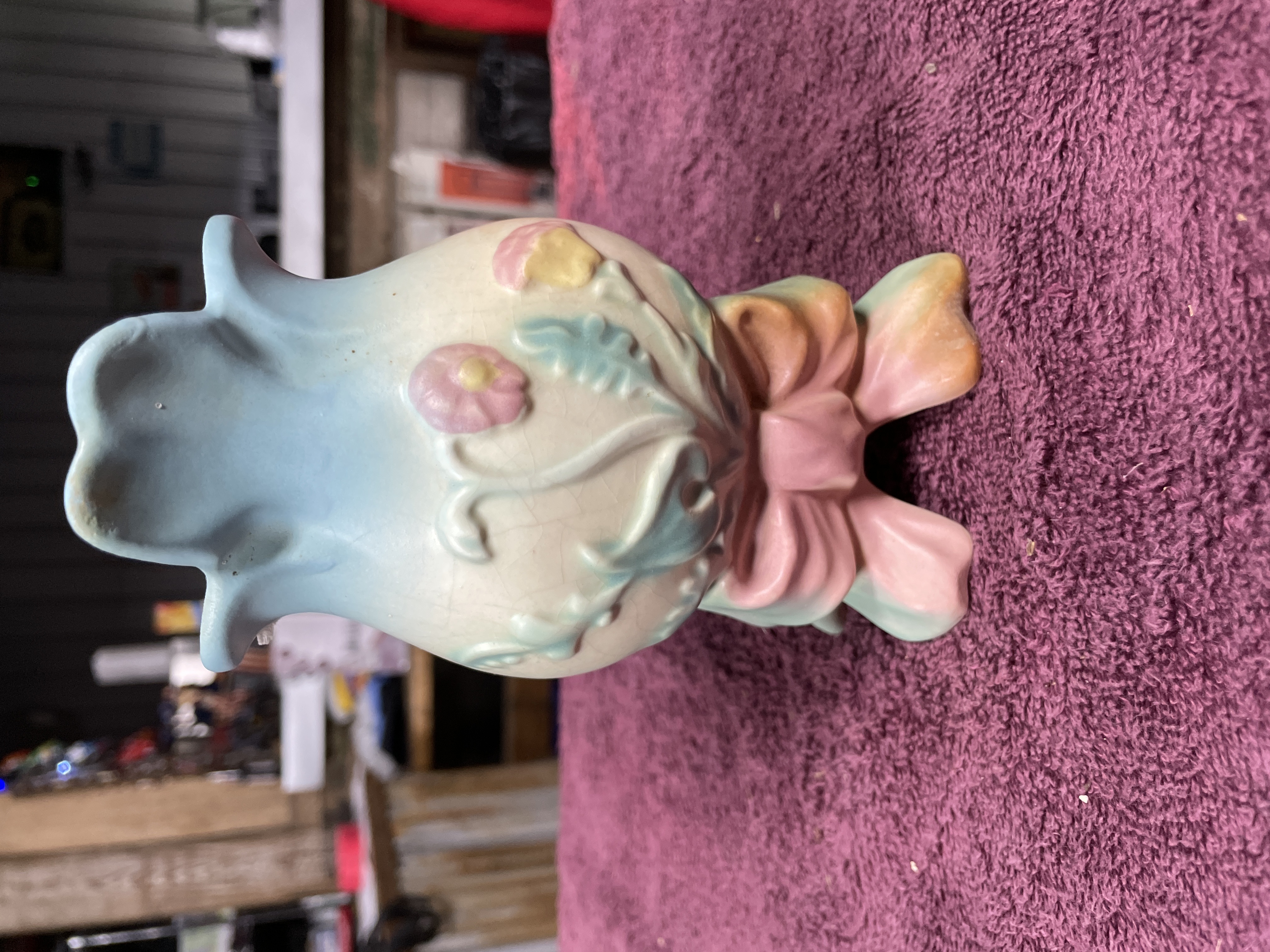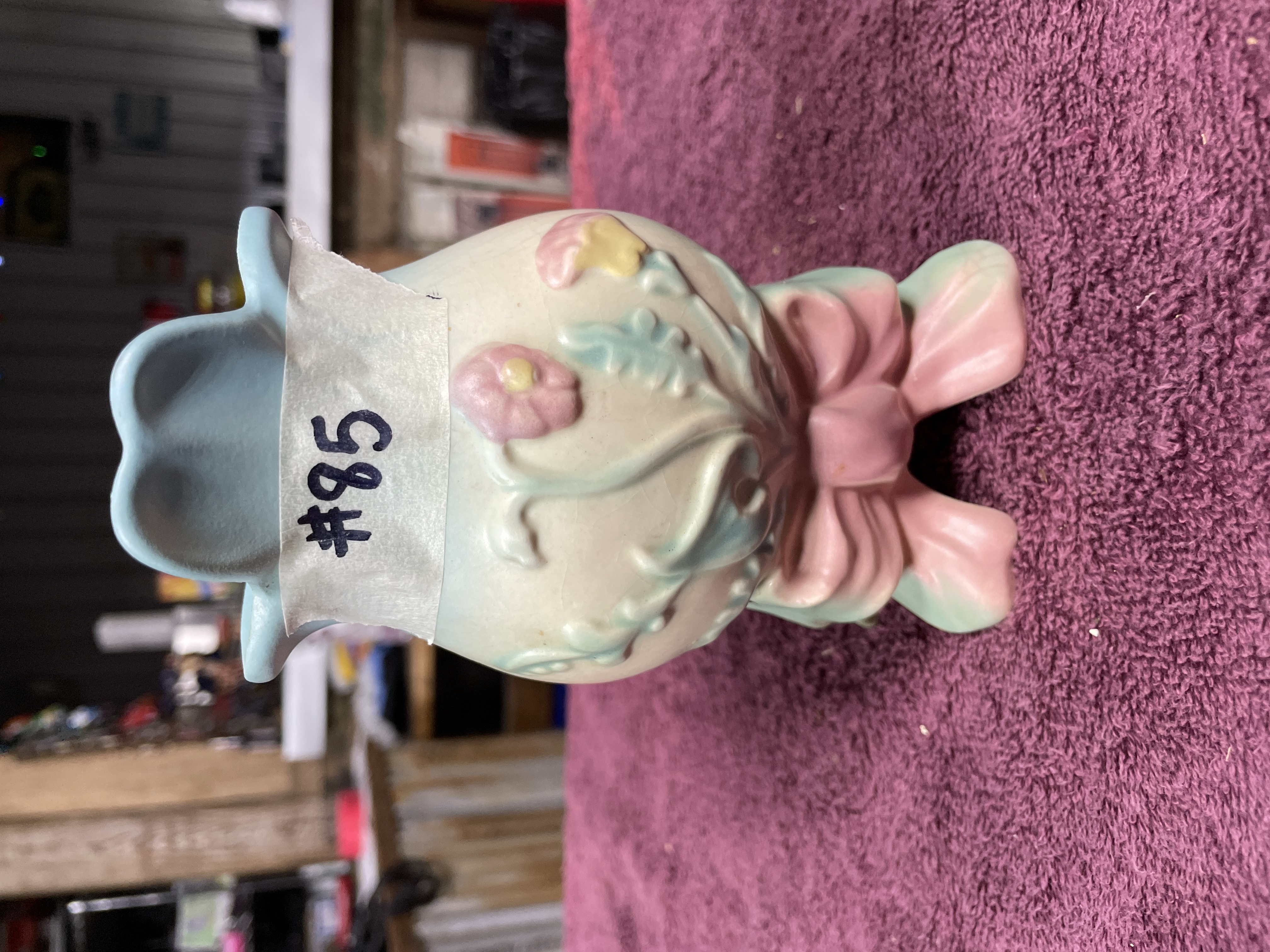 A single glazed earthenware vase attributed to Hull Pottery, featuring the popular Bowknot pattern. This mid-century style vessel has a bulbous body resting on four stylized feet connected by a prominent relief bow motif, primarily glazed in shades of pink and teal. The body is off-white, decorated with pastel relief flowers and foliage in pink, teal, and yellow. The flared, scalloped rim is glazed in pale blue. The item exhibits no visible manufacturer markings on the base.
