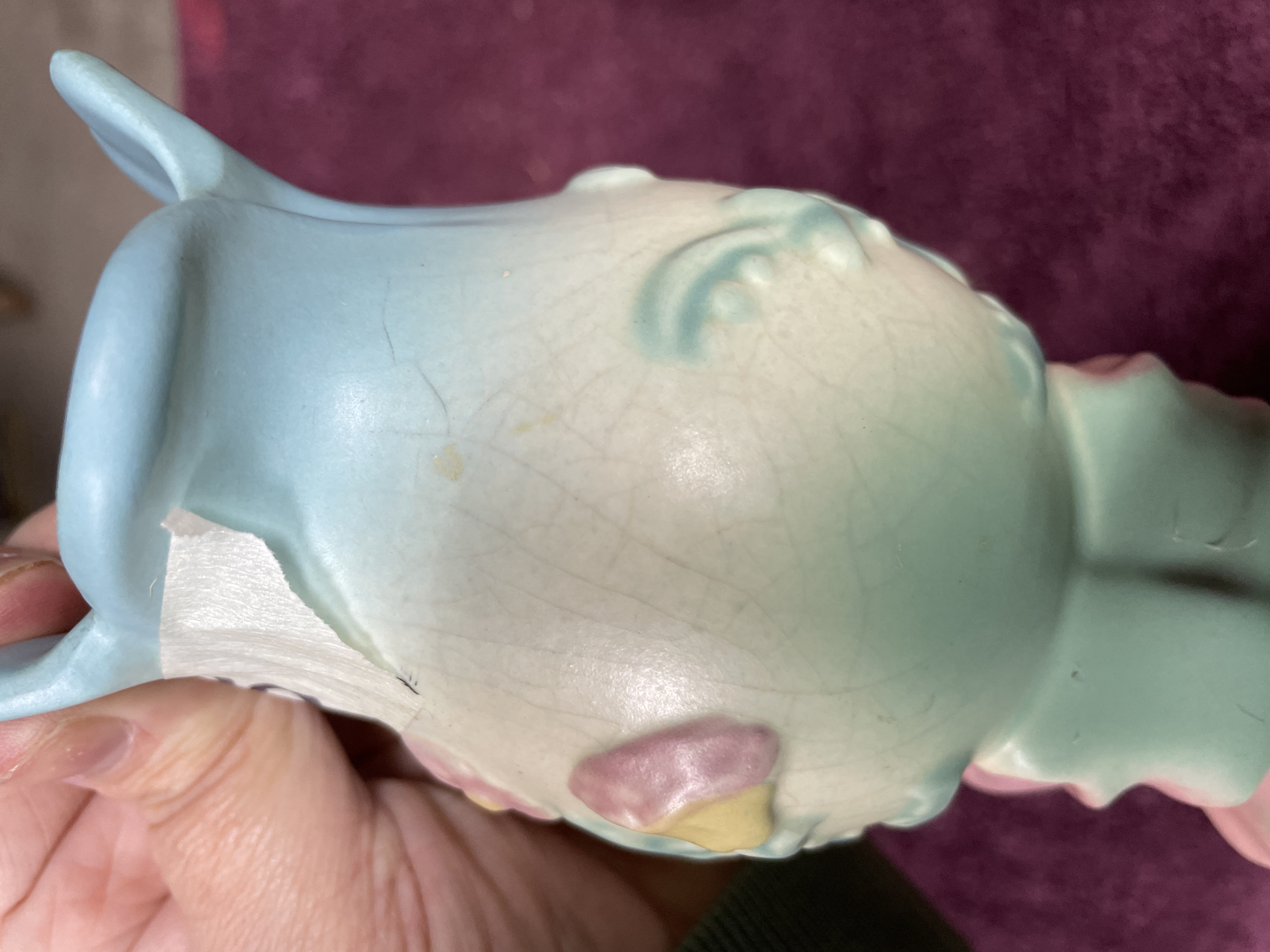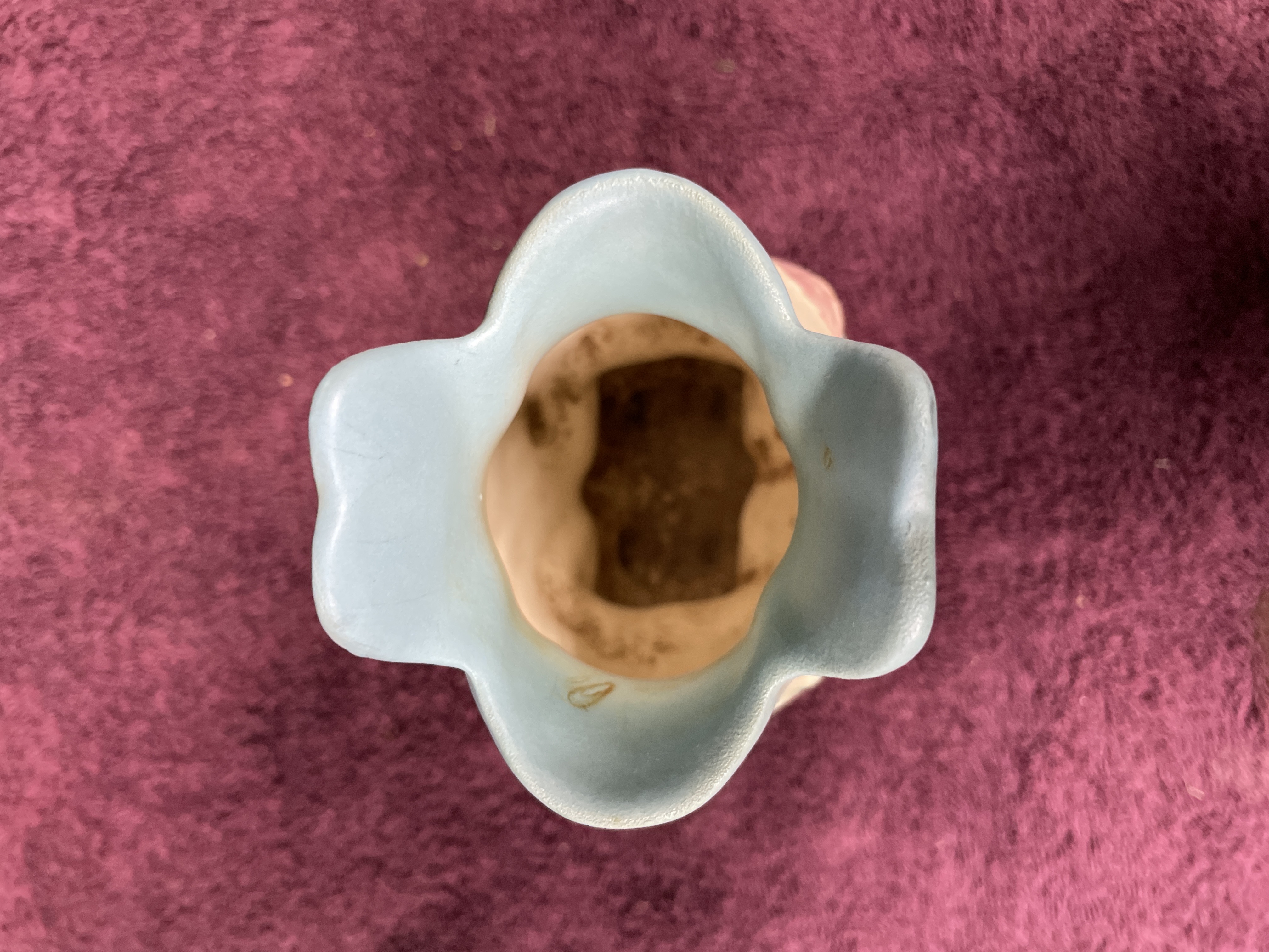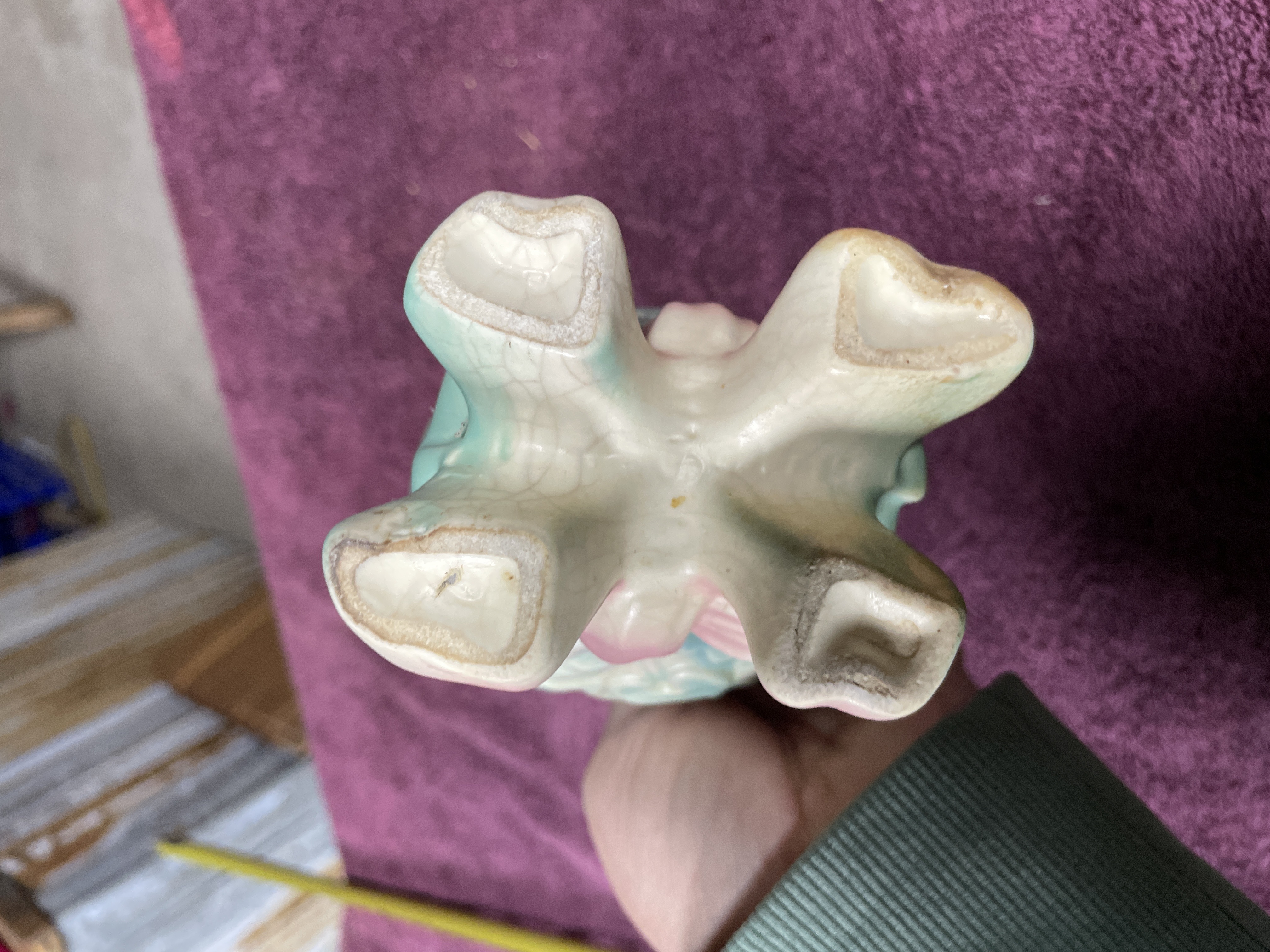 A single glazed earthenware vase attributed to Hull Pottery, featuring the popular Bowknot pattern. This mid-century style vessel has a bulbous body resting on four stylized feet connected by a prominent relief bow motif, primarily glazed in shades of pink and teal. The body is off-white, decorated with pastel relief flowers and foliage in pink, teal, and yellow. The flared, scalloped rim is glazed in pale blue. The item exhibits no visible manufacturer markings on the base.