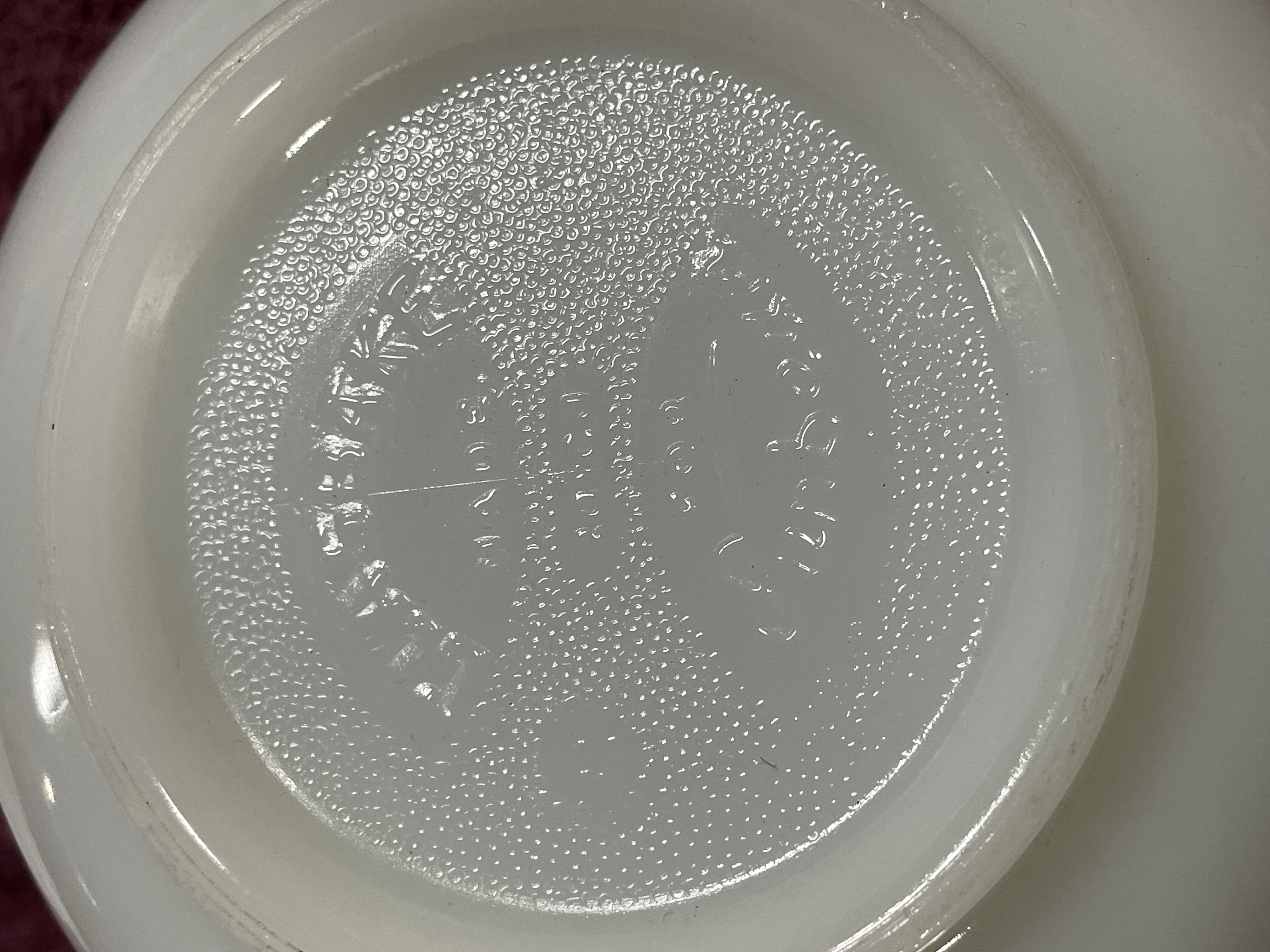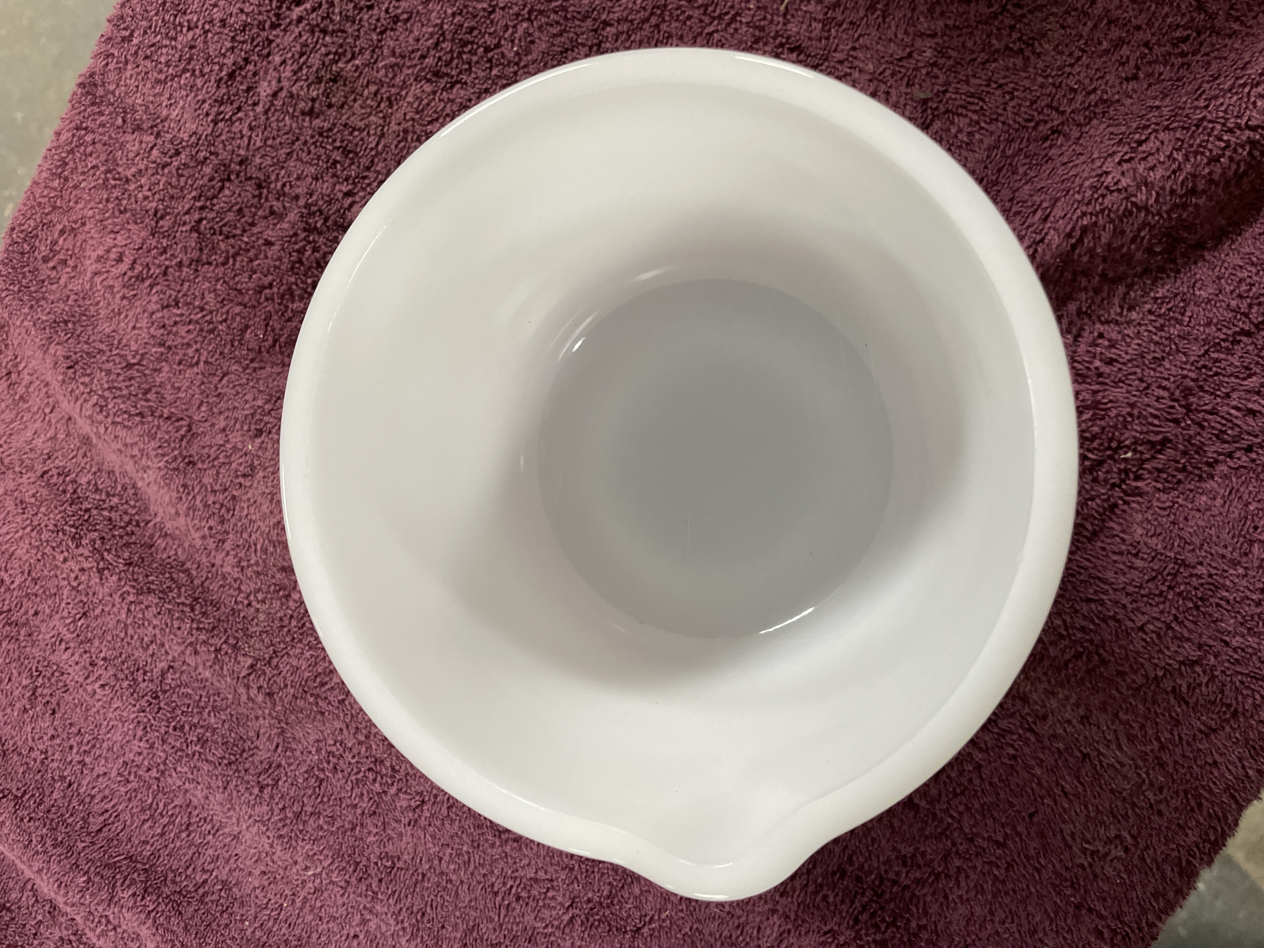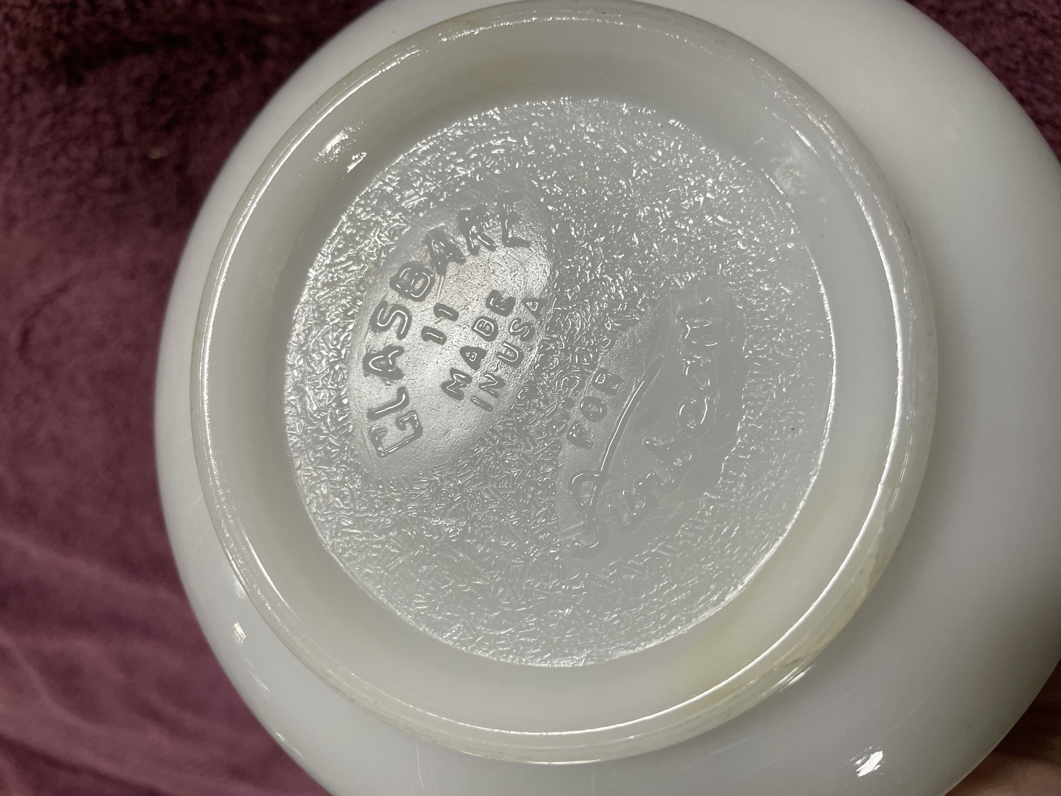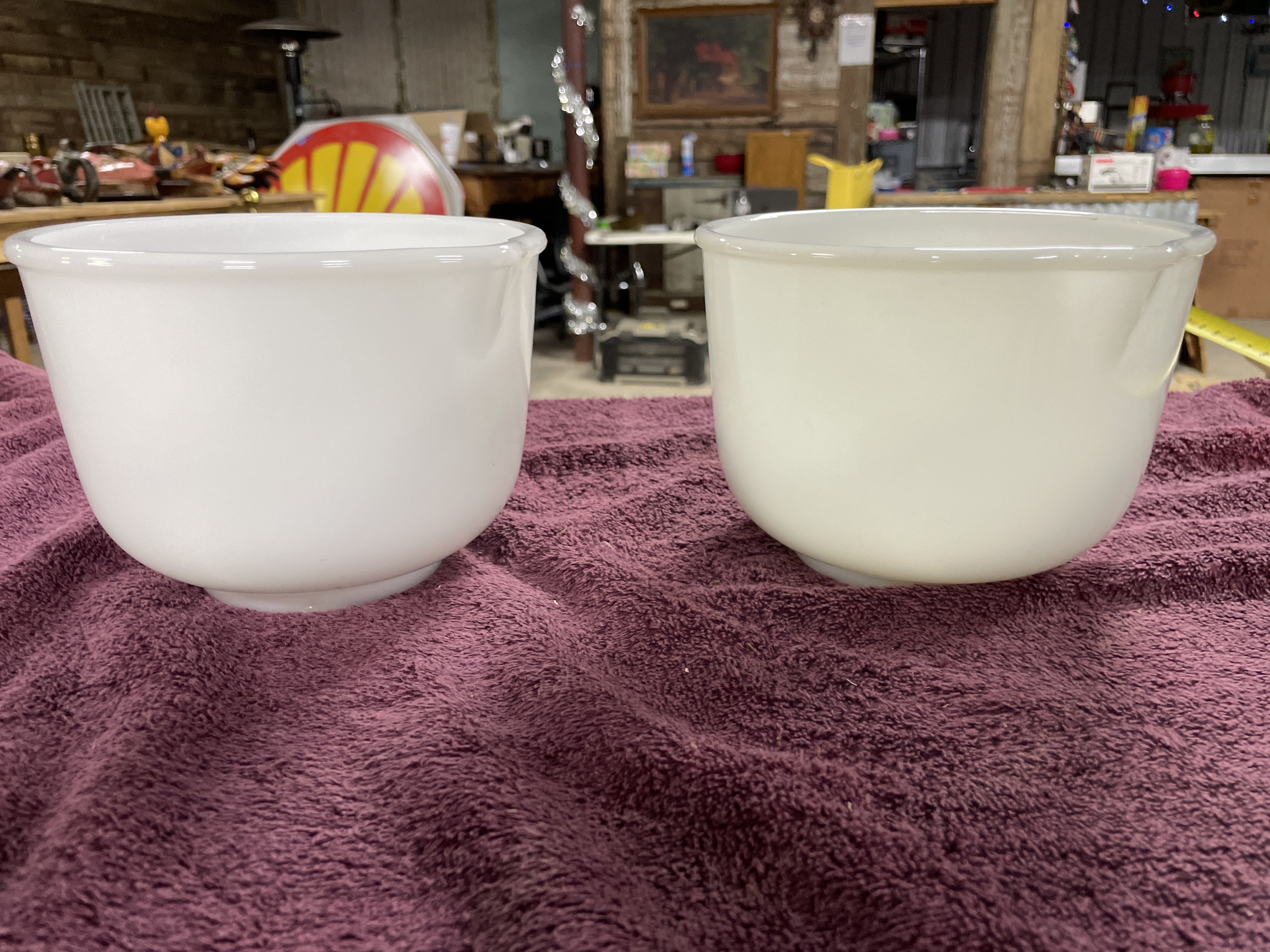 A pair of opaque white milk glass mixing bowls, typically manufactured for use with Sunbeam stand mixers. The bowls are deep and rounded, constructed from opalware. One bowl features a prominent pouring spout and is marked on the base with embossed text reading GLASBAKE, 11, and MADE IN USA. This bowl is consistent with the large 4-quart size associated with the manufacturer. The second bowl has a continuous, rounded rim and features a pebbled pattern on the base with partially legible manufacturer markings.