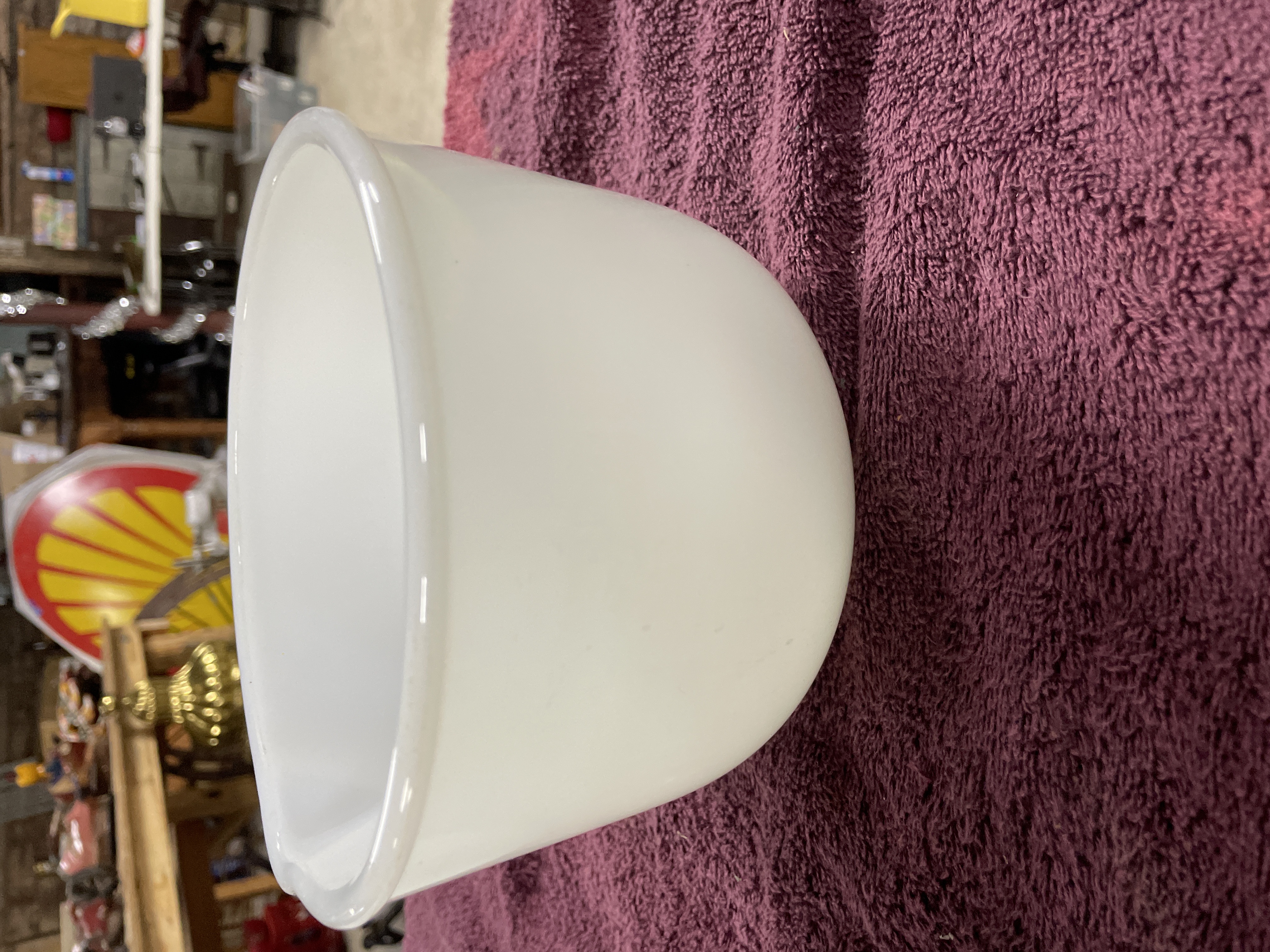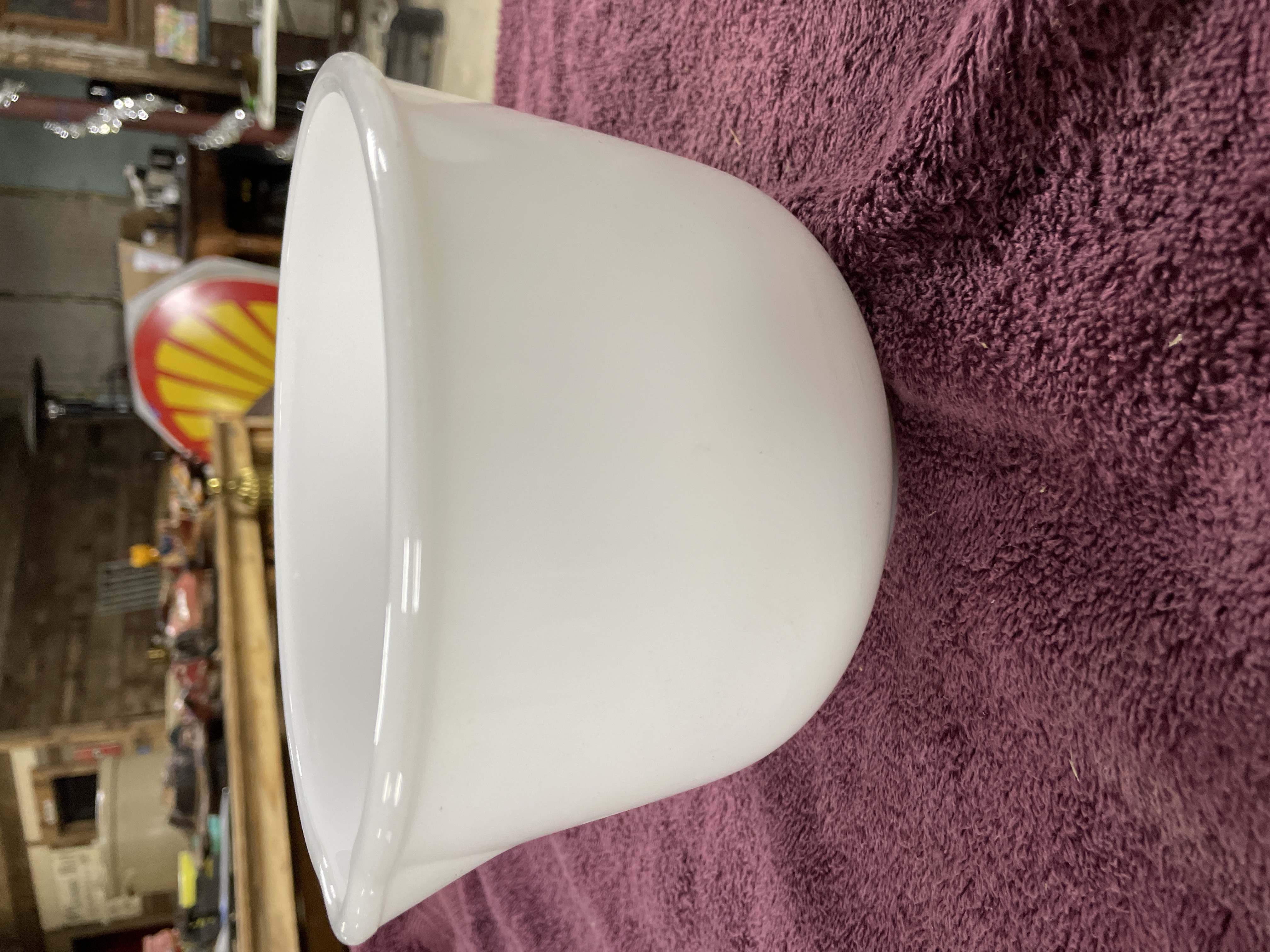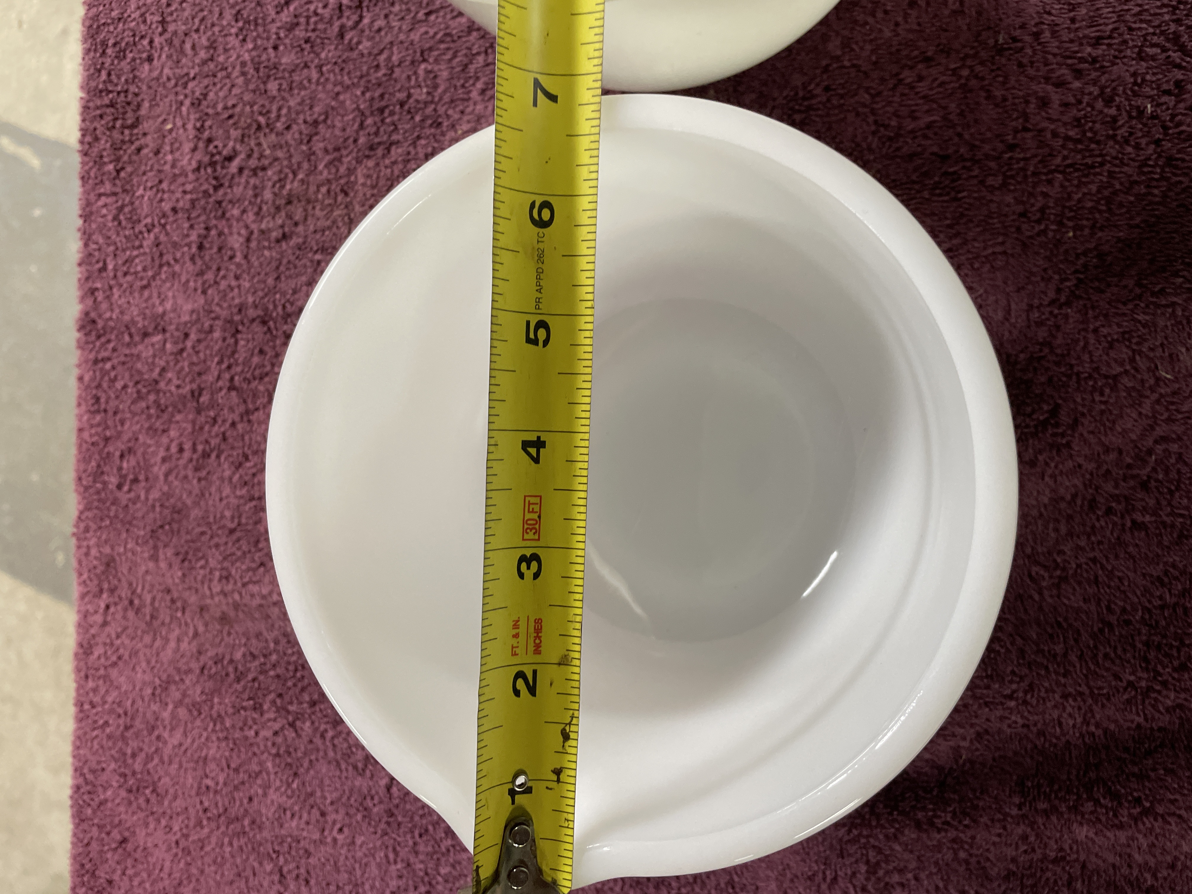 A pair of opaque white milk glass mixing bowls, typically manufactured for use with Sunbeam stand mixers. The bowls are deep and rounded, constructed from opalware. One bowl features a prominent pouring spout and is marked on the base with embossed text reading GLASBAKE, 11, and MADE IN USA. This bowl is consistent with the large 4-quart size associated with the manufacturer. The second bowl has a continuous, rounded rim and features a pebbled pattern on the base with partially legible manufacturer markings.