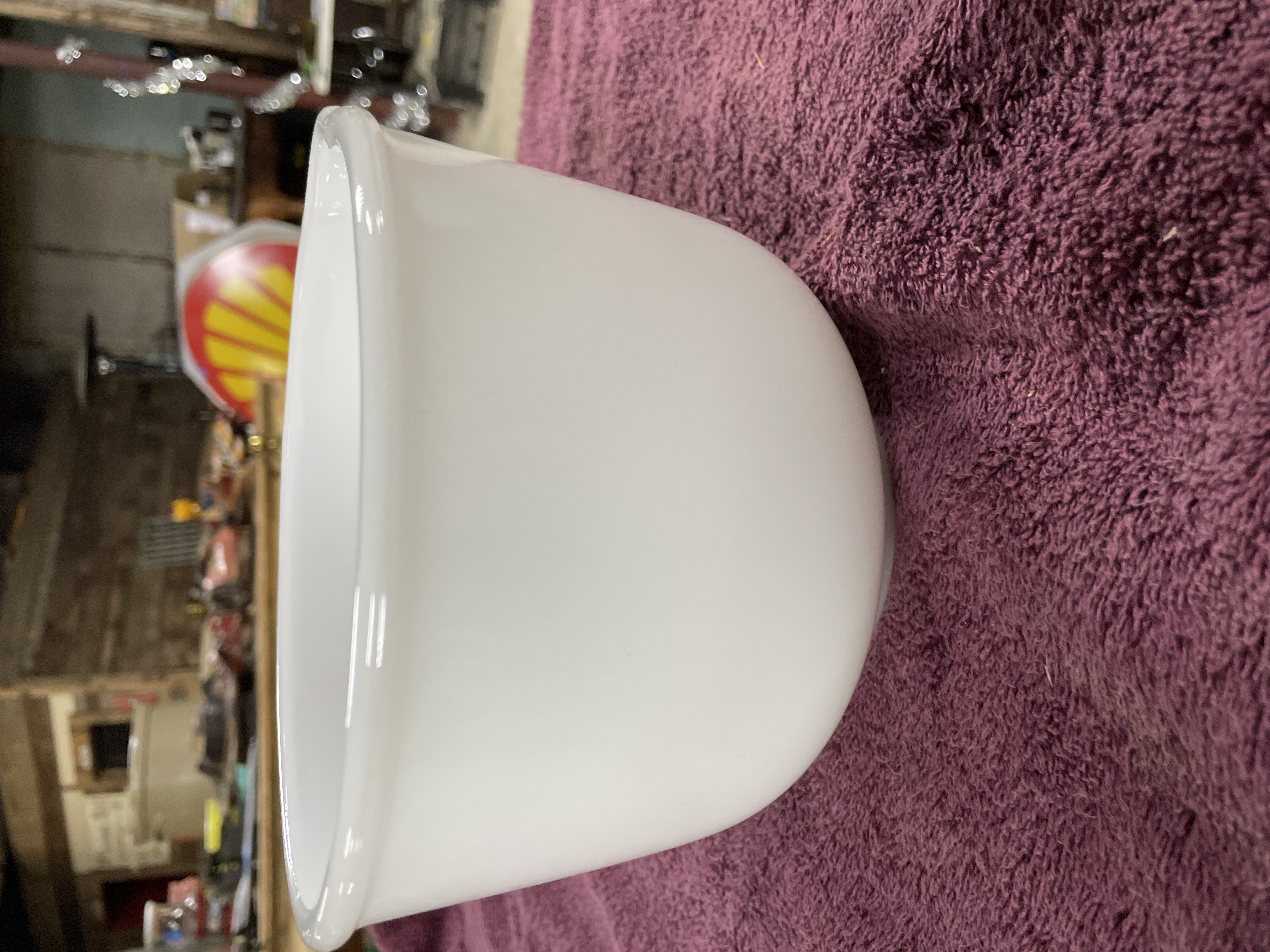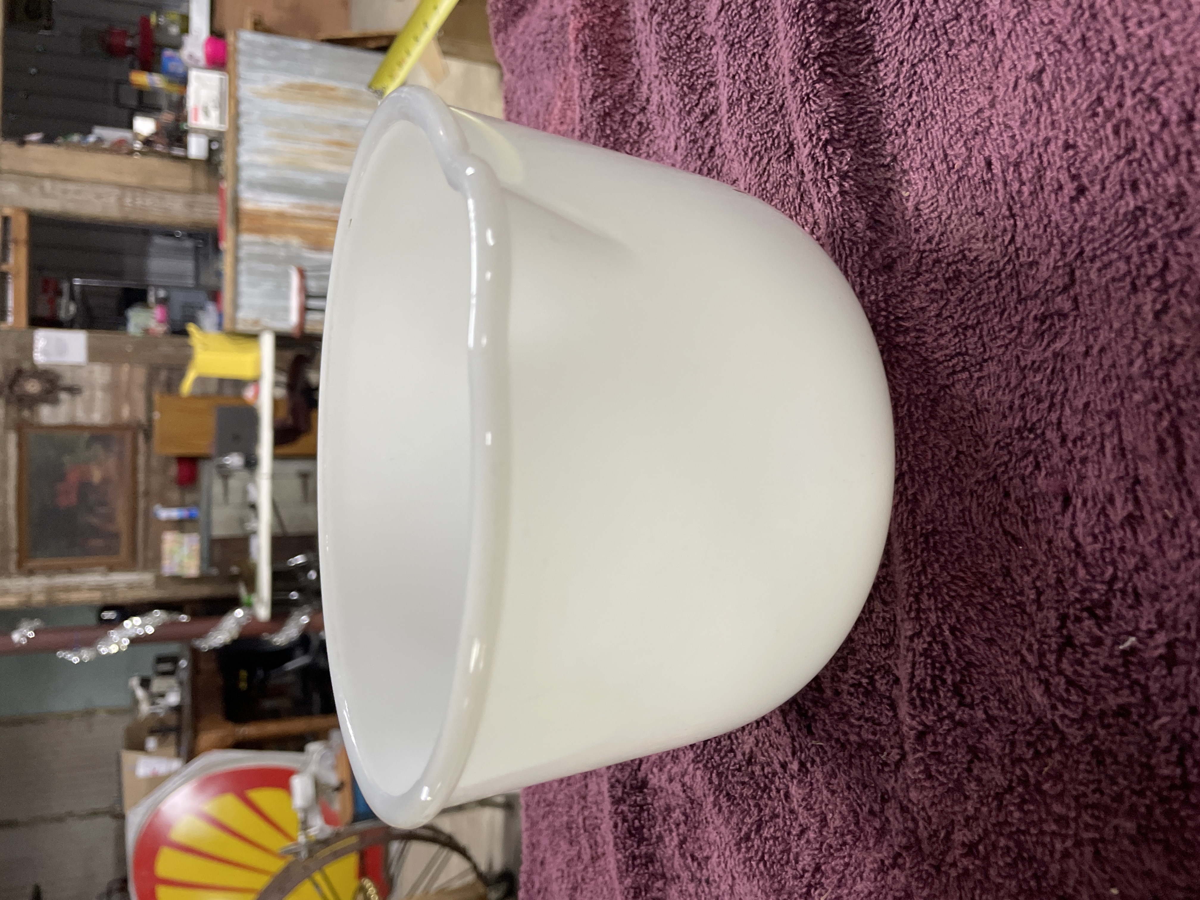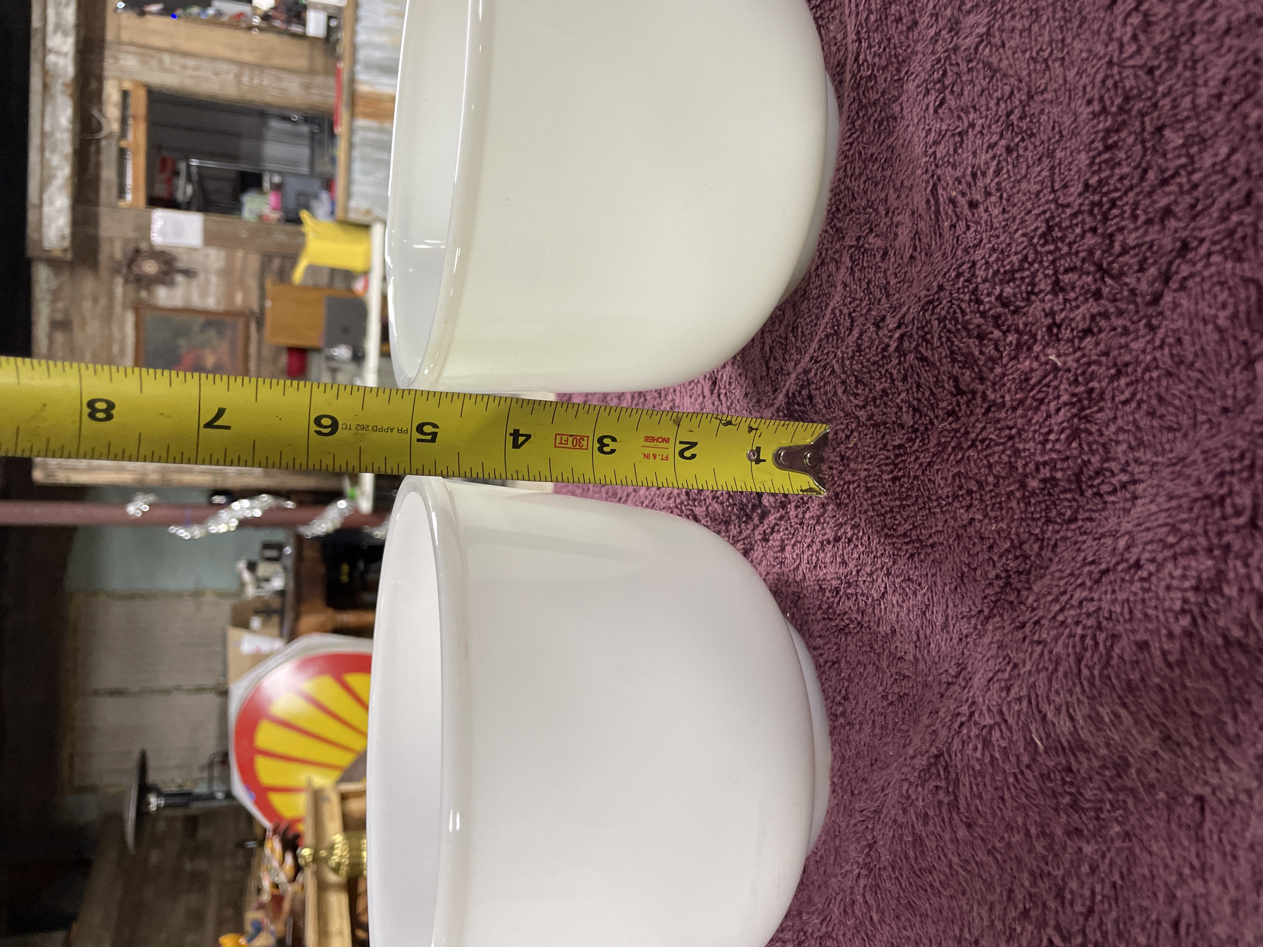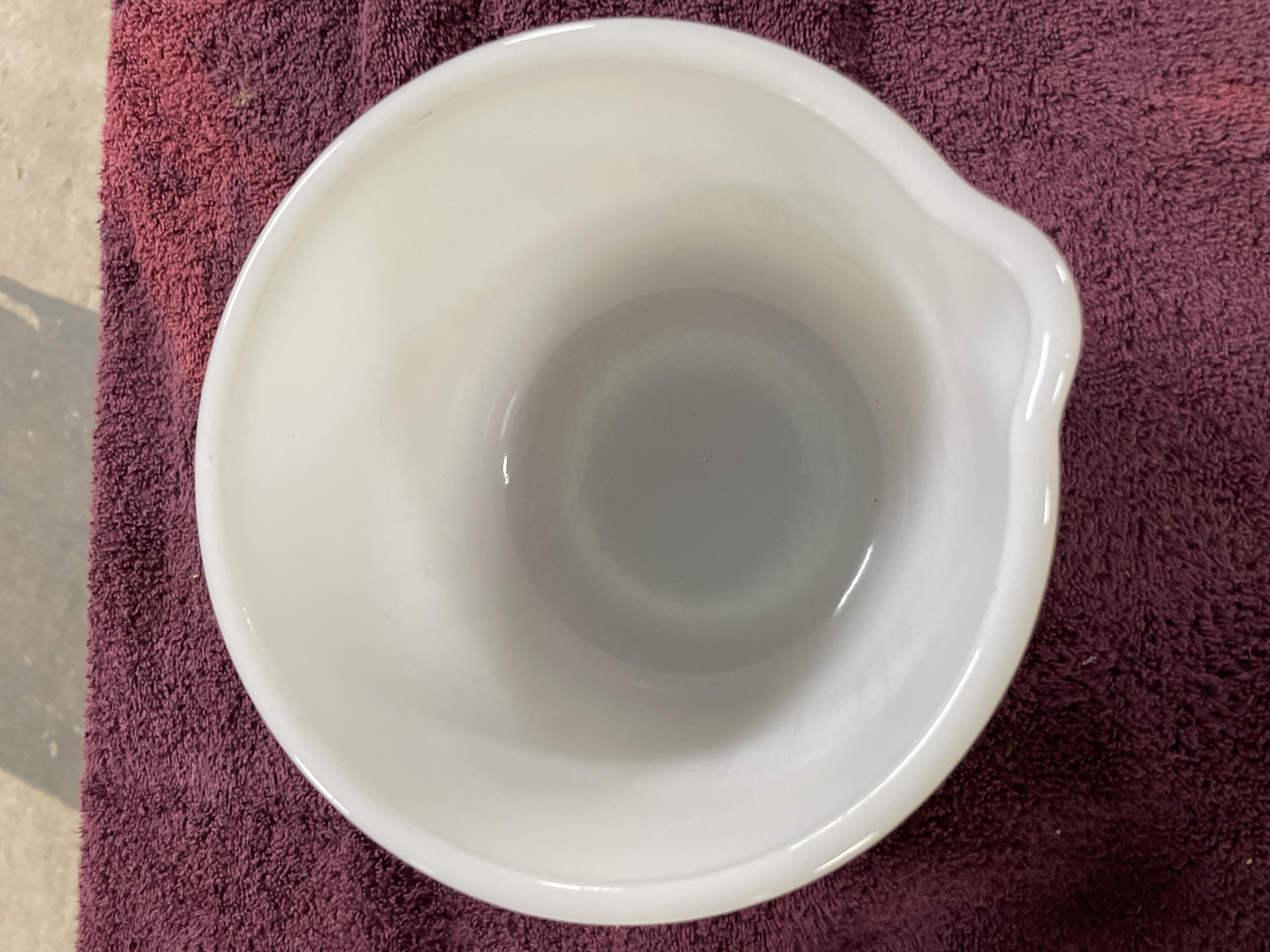 A pair of opaque white milk glass mixing bowls, typically manufactured for use with Sunbeam stand mixers. The bowls are deep and rounded, constructed from opalware. One bowl features a prominent pouring spout and is marked on the base with embossed text reading GLASBAKE, 11, and MADE IN USA. This bowl is consistent with the large 4-quart size associated with the manufacturer. The second bowl has a continuous, rounded rim and features a pebbled pattern on the base with partially legible manufacturer markings.