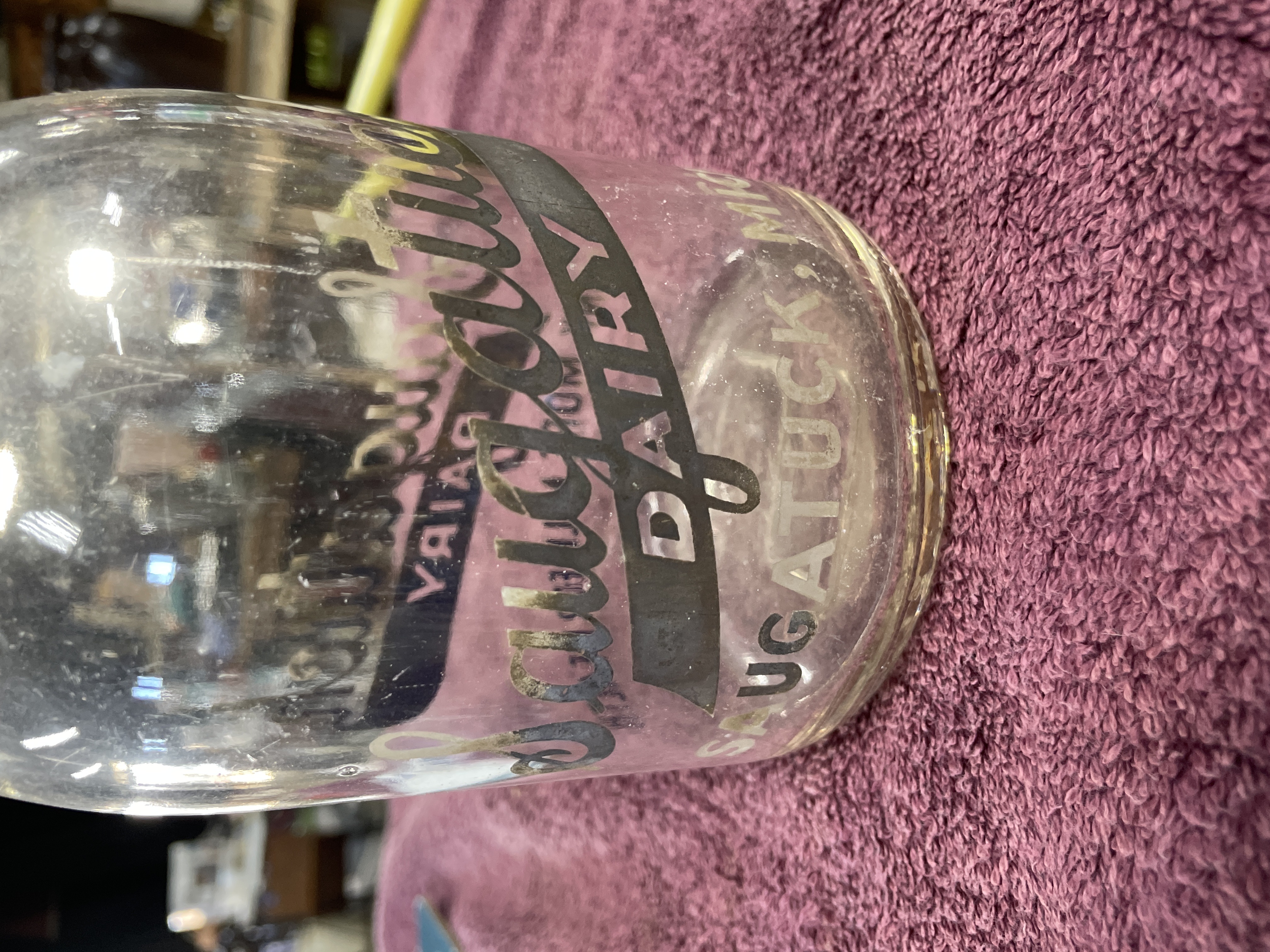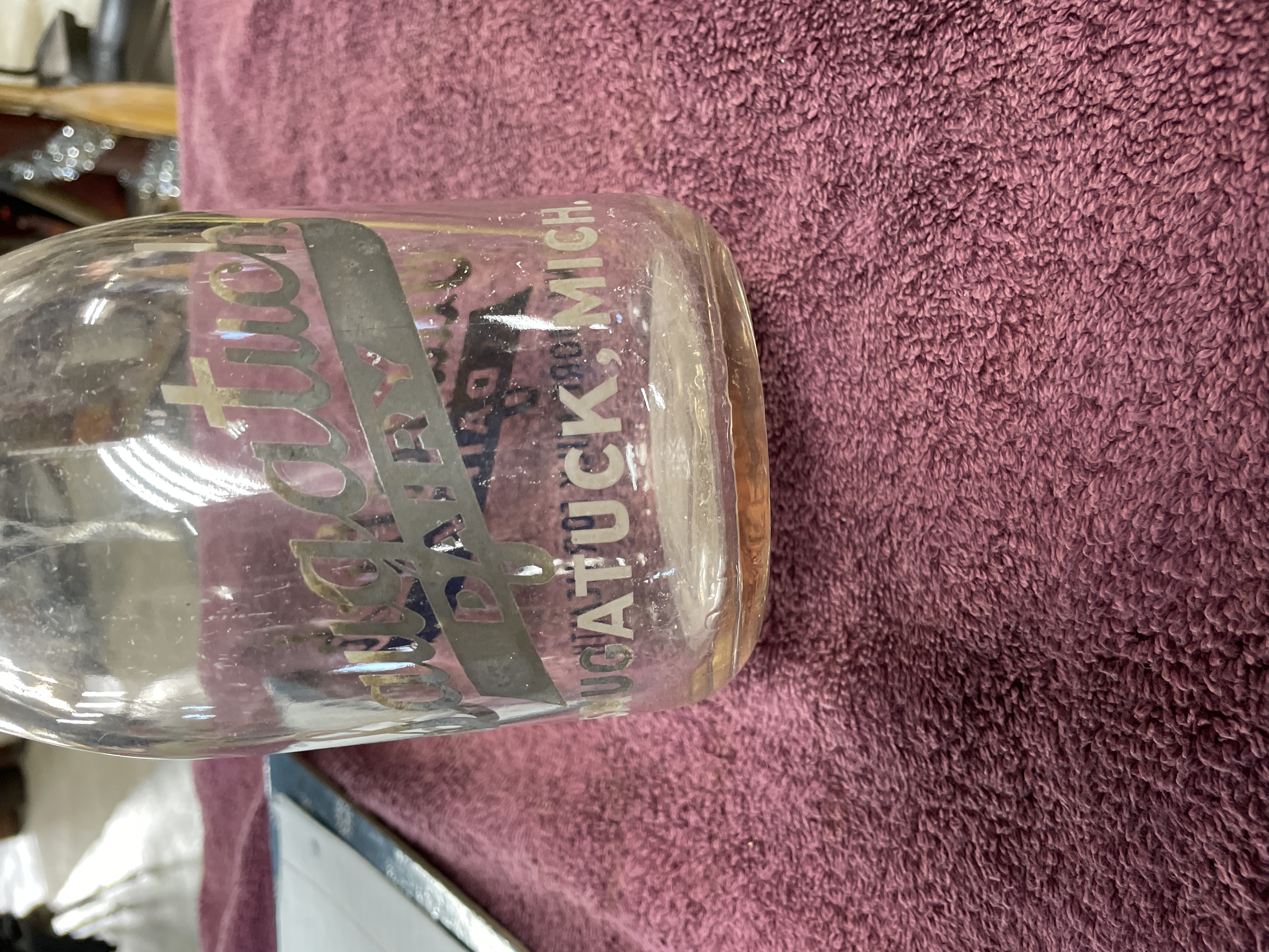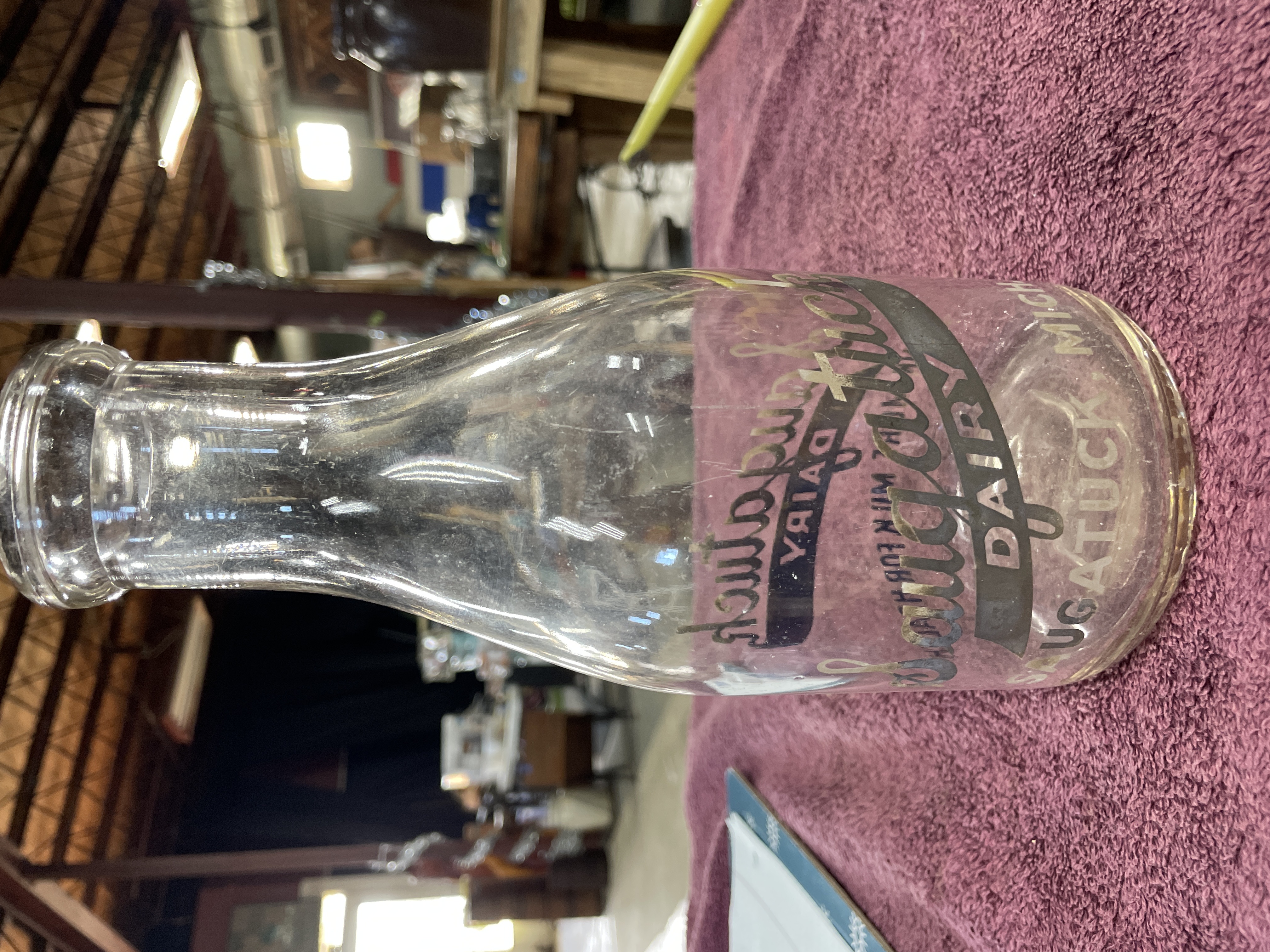 A single clear glass milk bottle featuring Applied Color Label (ACL) decoration. The bottle is decorated with enamel text in dark gray/black and light gray, advertising “Saugatuck DAIRY” across a horizontal banner. Additional text reads “DRINK MORE MILK FOR HEALTH” and “SAUGATUCK MICH.” near the base. The base of the bottle contains a large, molded capacity or manufacturer mark in the shape of the number “5.”