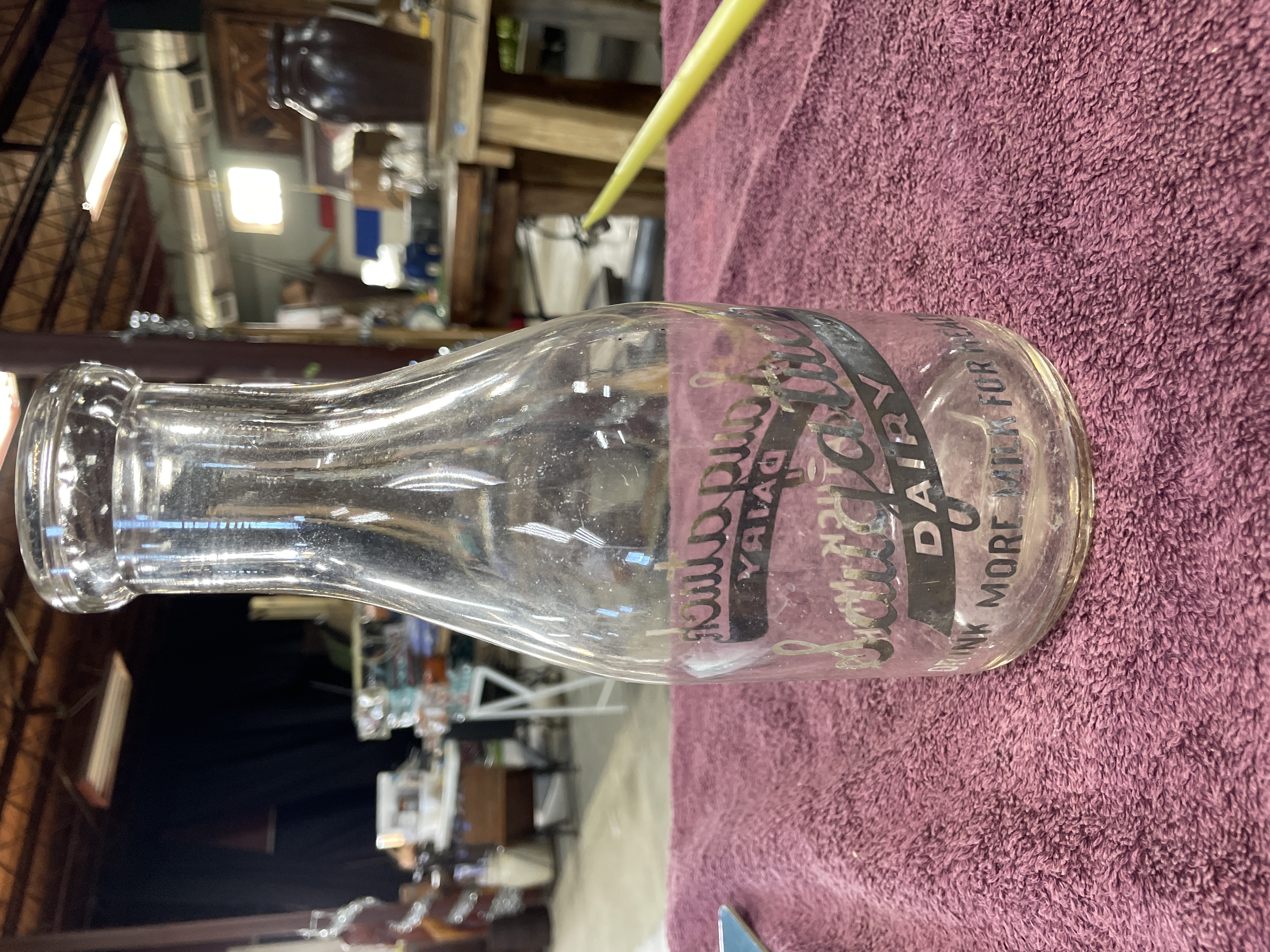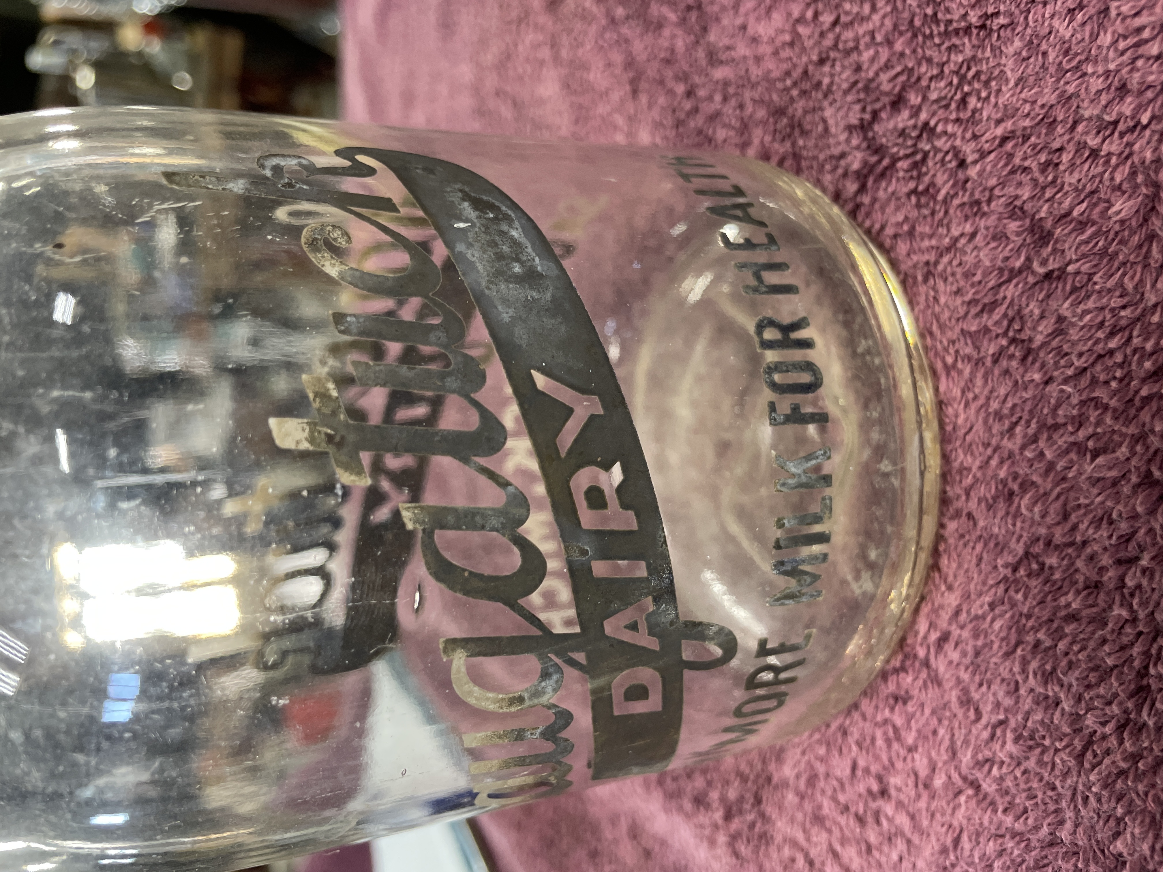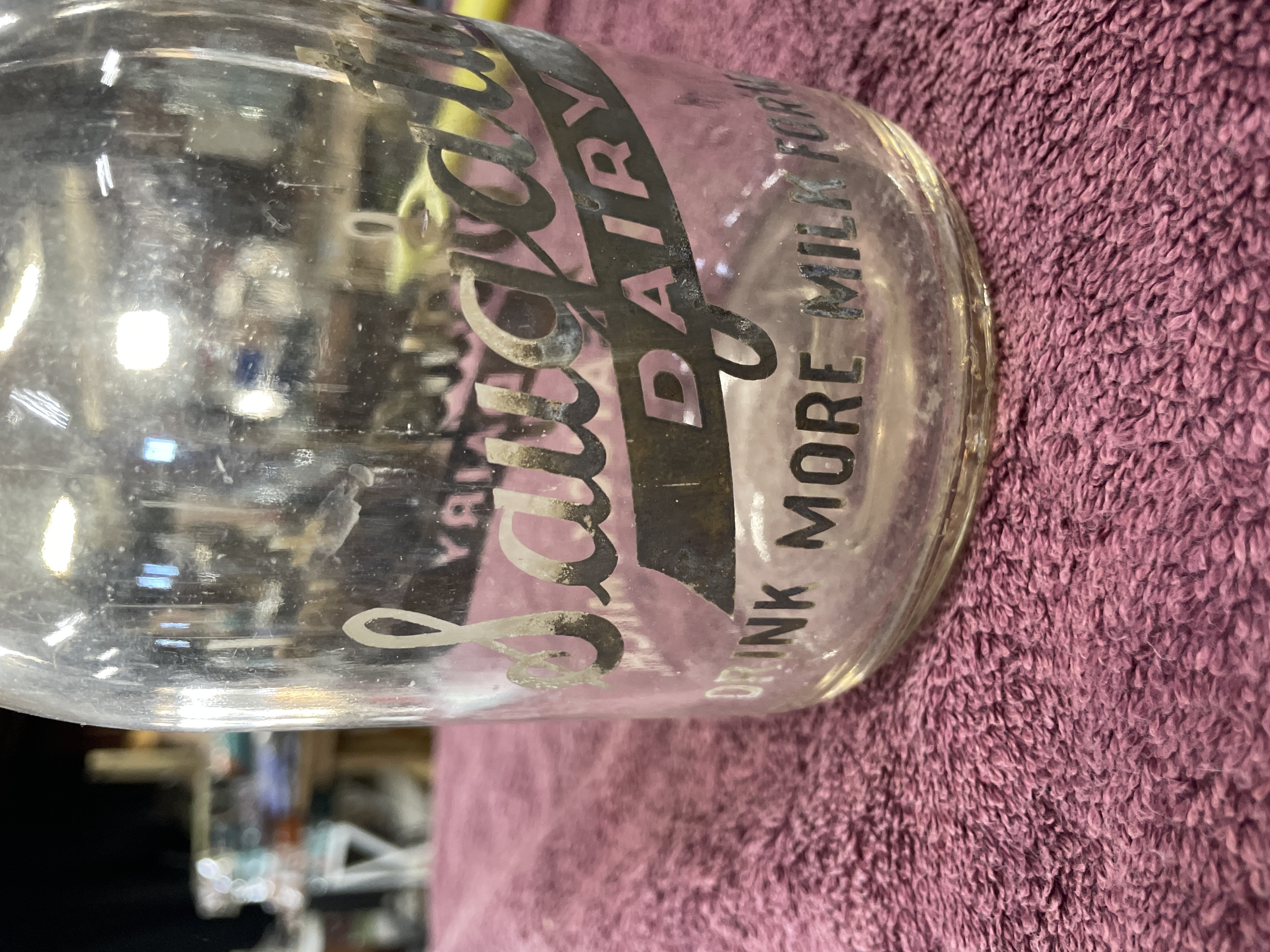 A single clear glass milk bottle featuring Applied Color Label (ACL) decoration. The bottle is decorated with enamel text in dark gray/black and light gray, advertising “Saugatuck DAIRY” across a horizontal banner. Additional text reads “DRINK MORE MILK FOR HEALTH” and “SAUGATUCK MICH.” near the base. The base of the bottle contains a large, molded capacity or manufacturer mark in the shape of the number “5.”