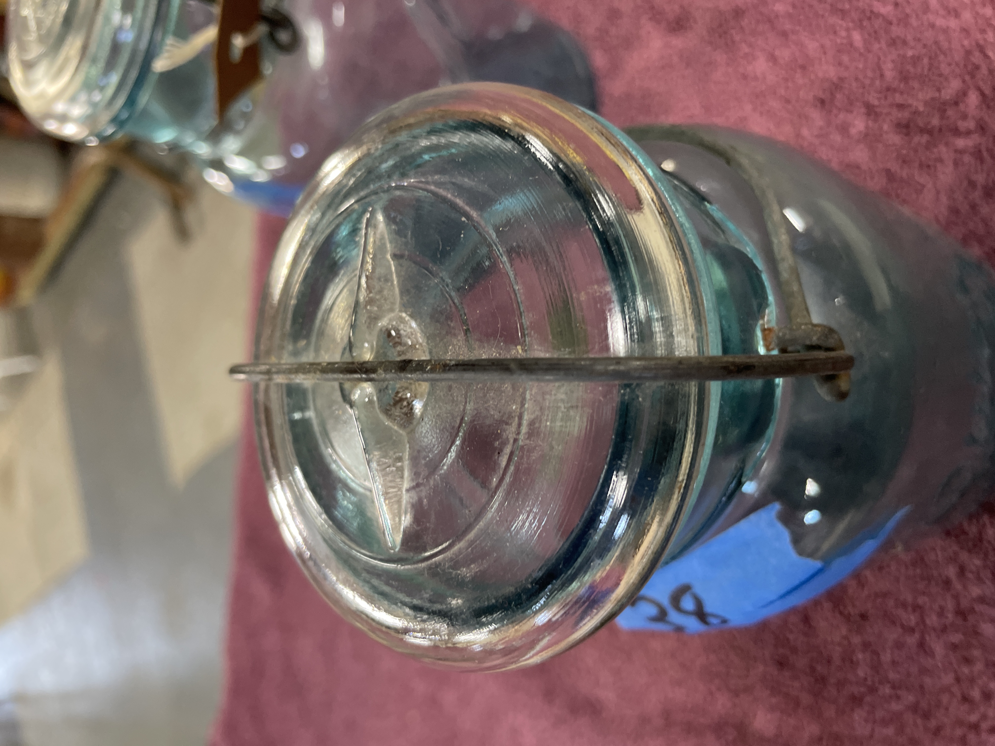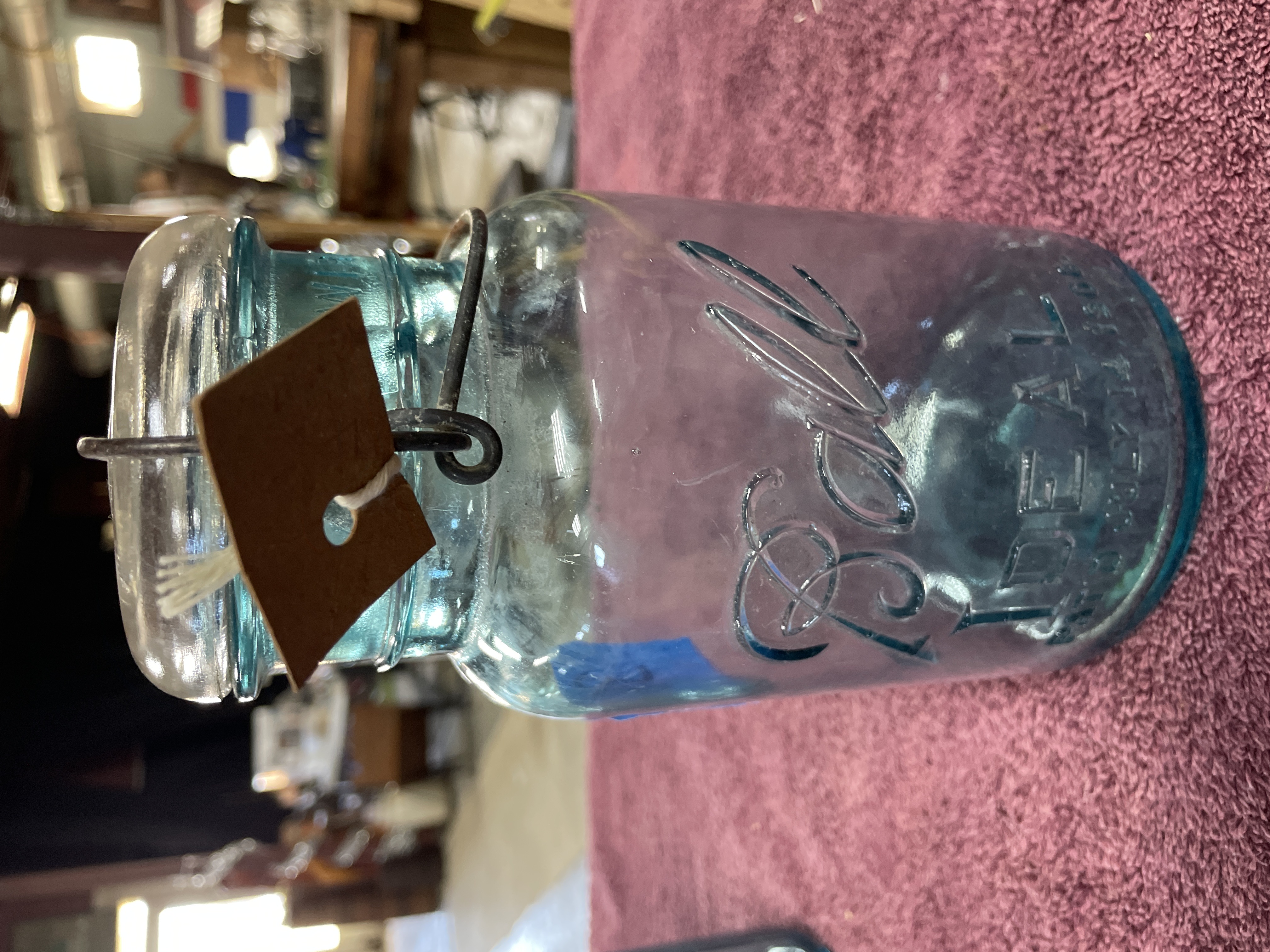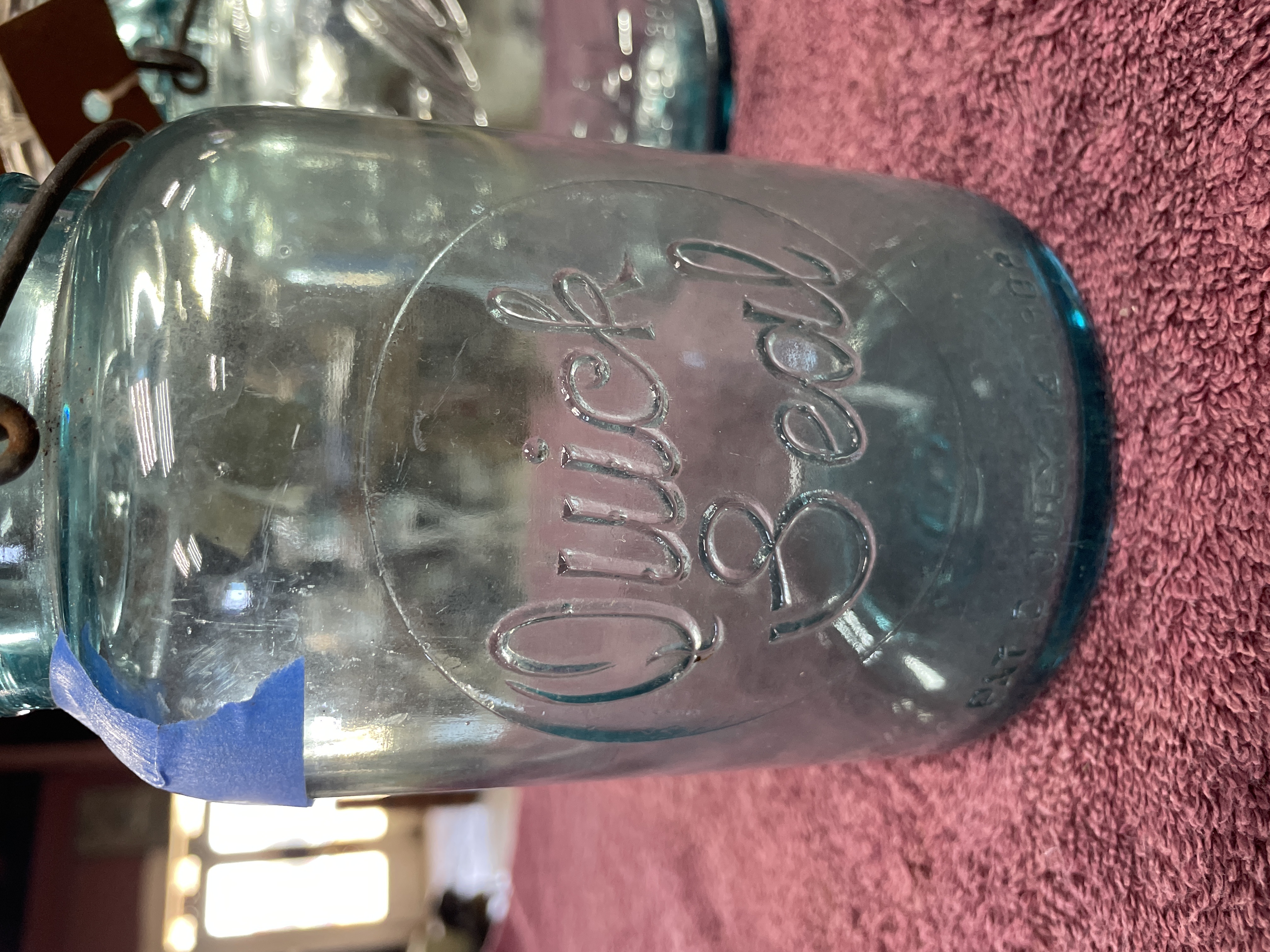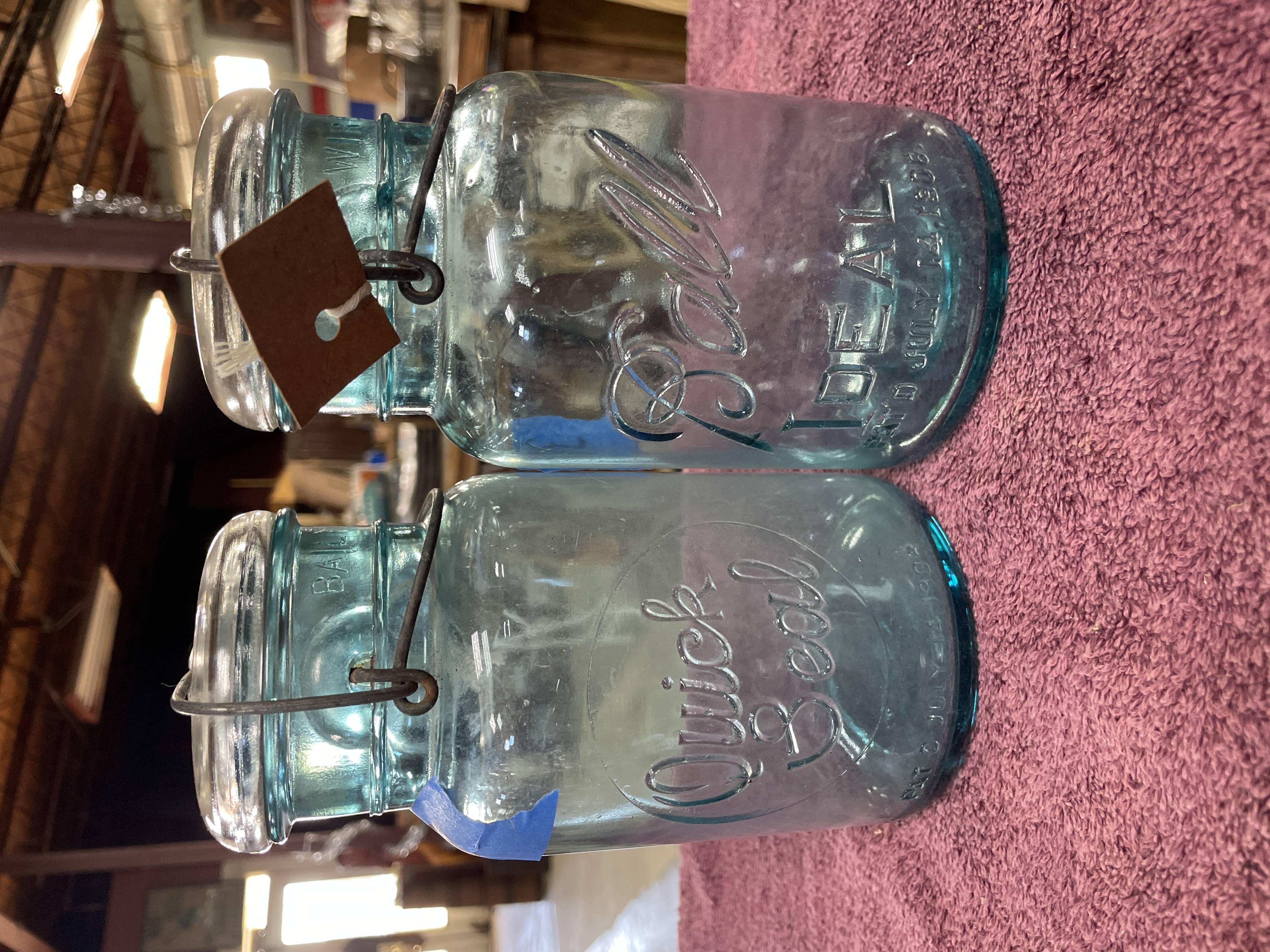A lot comprising two vintage aqua-tinted glass canning jars, manufactured by Ball, dating to the early 20th century. The jars are secured with clear glass caps utilizing a metal wire bail closure system. The jar on the left is mold-embossed with “Quick Seal” and “BALL” on the shoulder, and its base bears the mold number “3”. The jar on the right is mold-embossed with large script “Ball IDEAL” and “WIRE SIDE” on the neck, and its base bears the mold number “1”. Both jars feature the mold-embossed patent date “PAT’D JULY 14 1908” near the base.