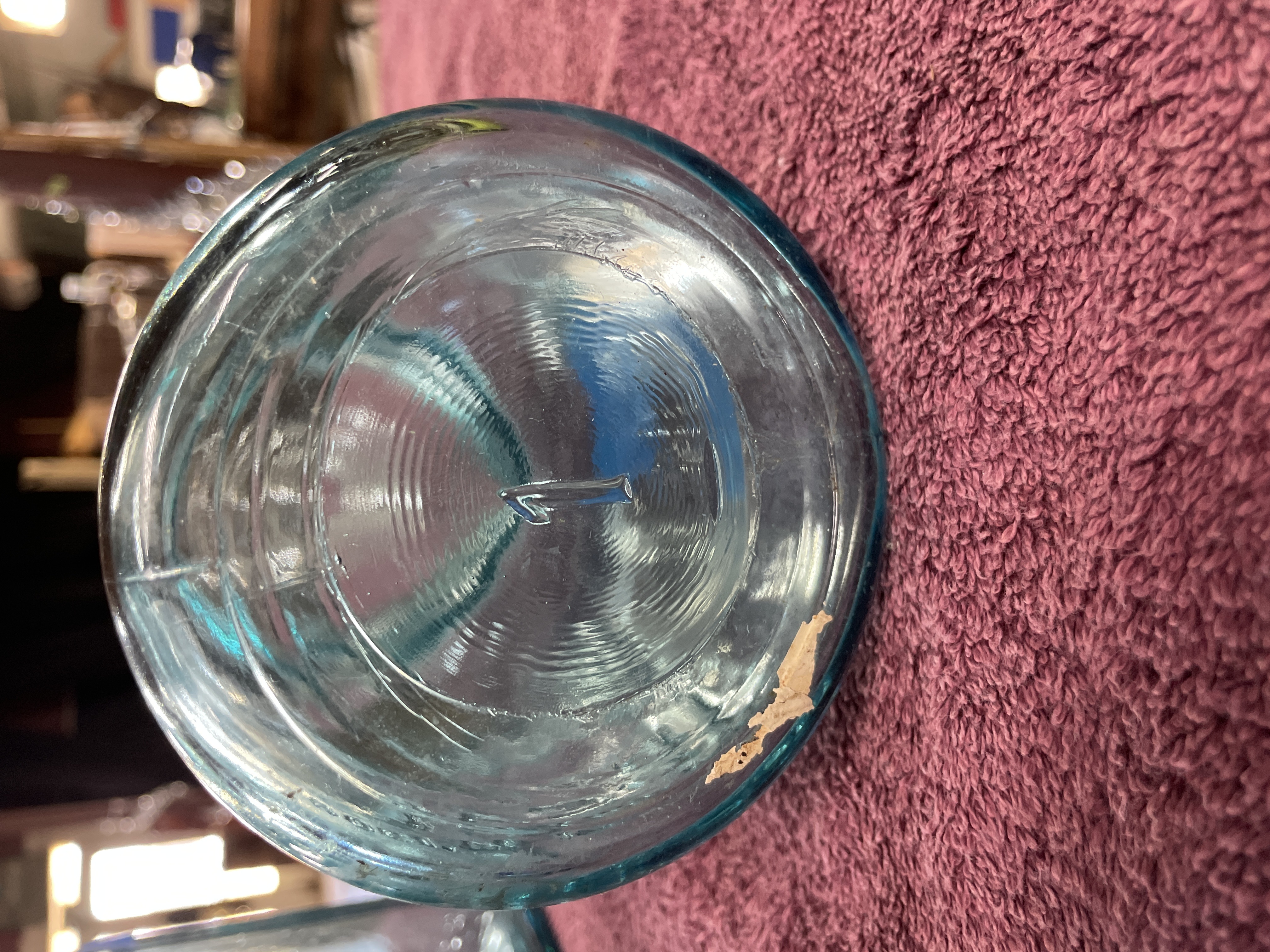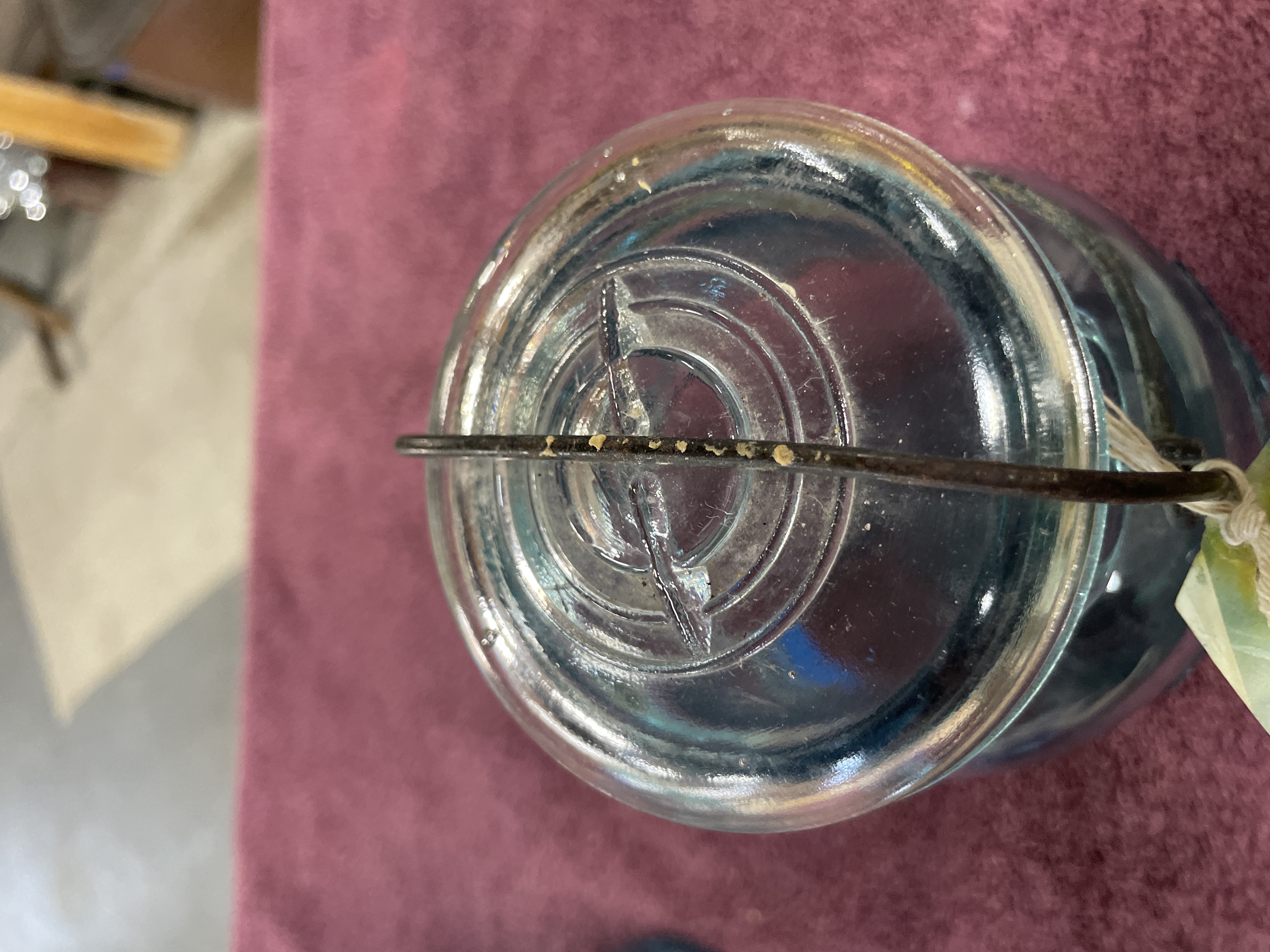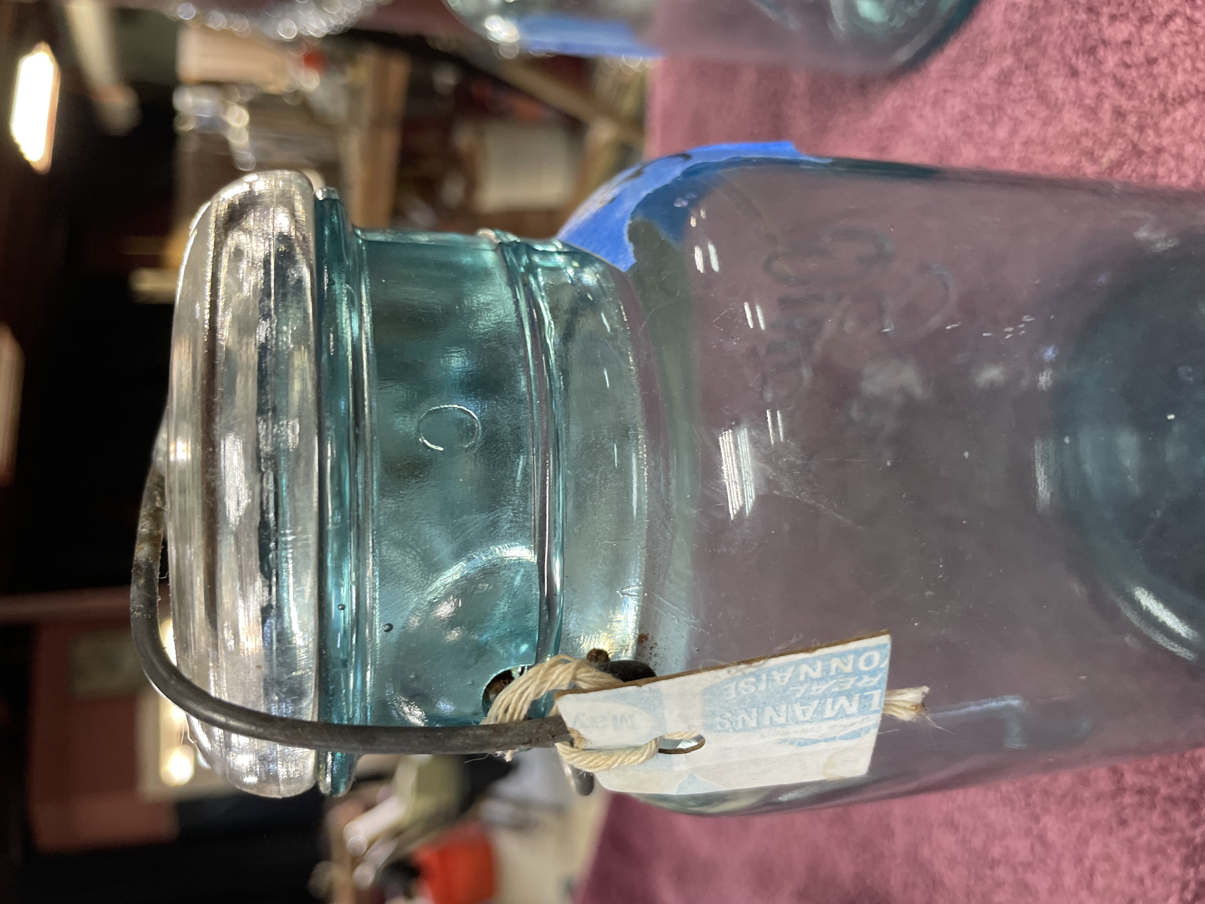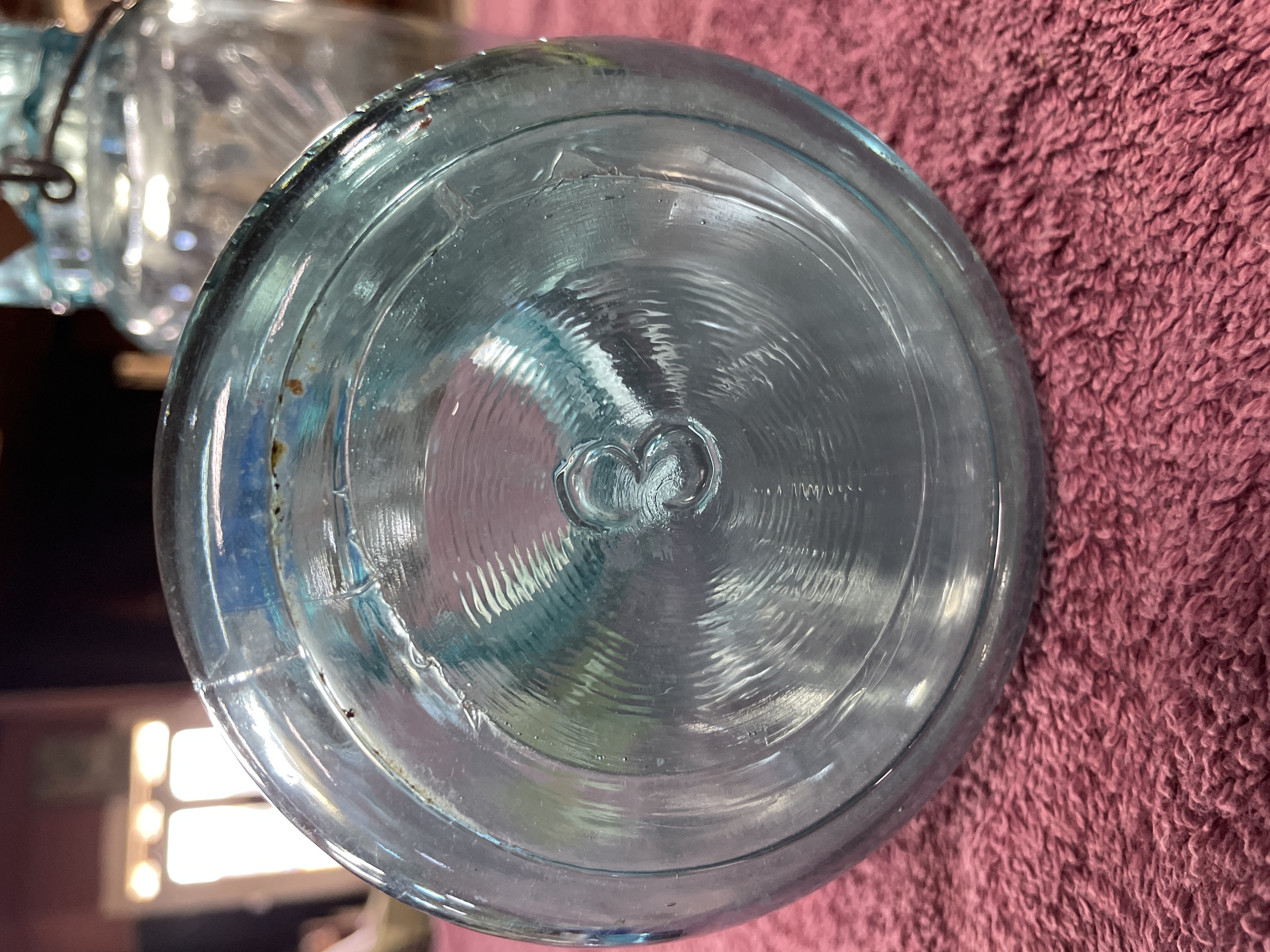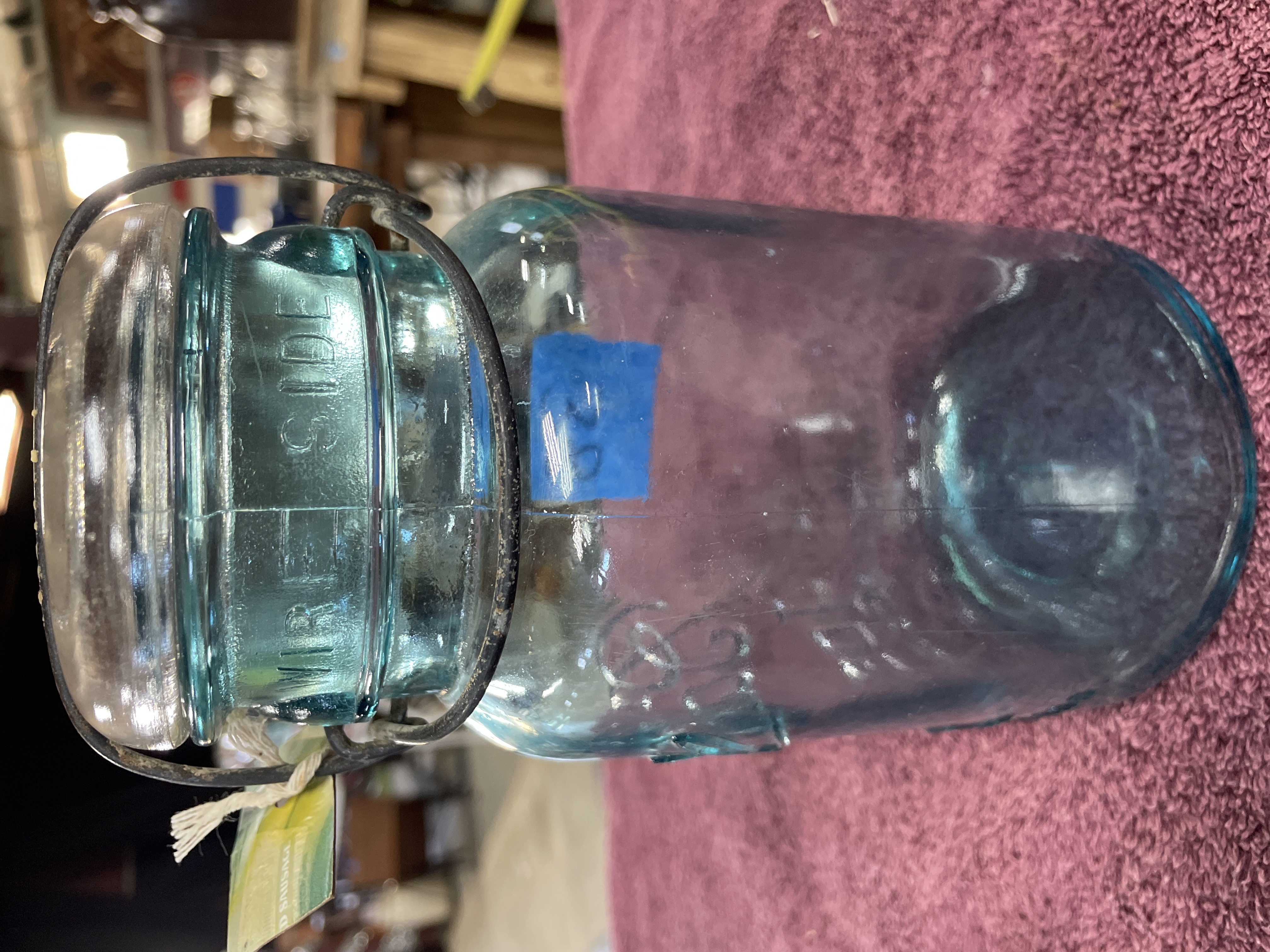 A lot comprising two vintage aqua-tinted glass canning jars, manufactured by Ball, dating to the early 20th century. The jars are secured with clear glass caps utilizing a metal wire bail closure system. The jar on the left is mold-embossed with “Quick Seal” and “BALL” on the shoulder, and its base bears the mold number “3”. The jar on the right is mold-embossed with large script “Ball IDEAL” and “WIRE SIDE” on the neck, and its base bears the mold number “1”. Both jars feature the mold-embossed patent date “PAT’D JULY 14 1908” near the base.