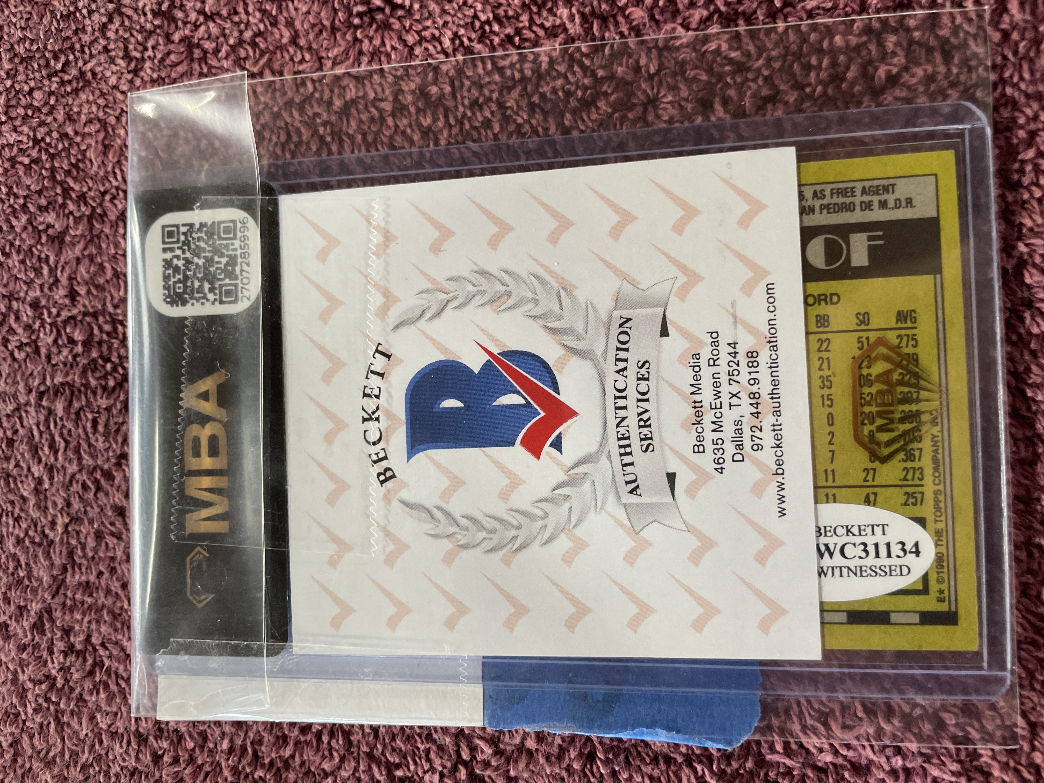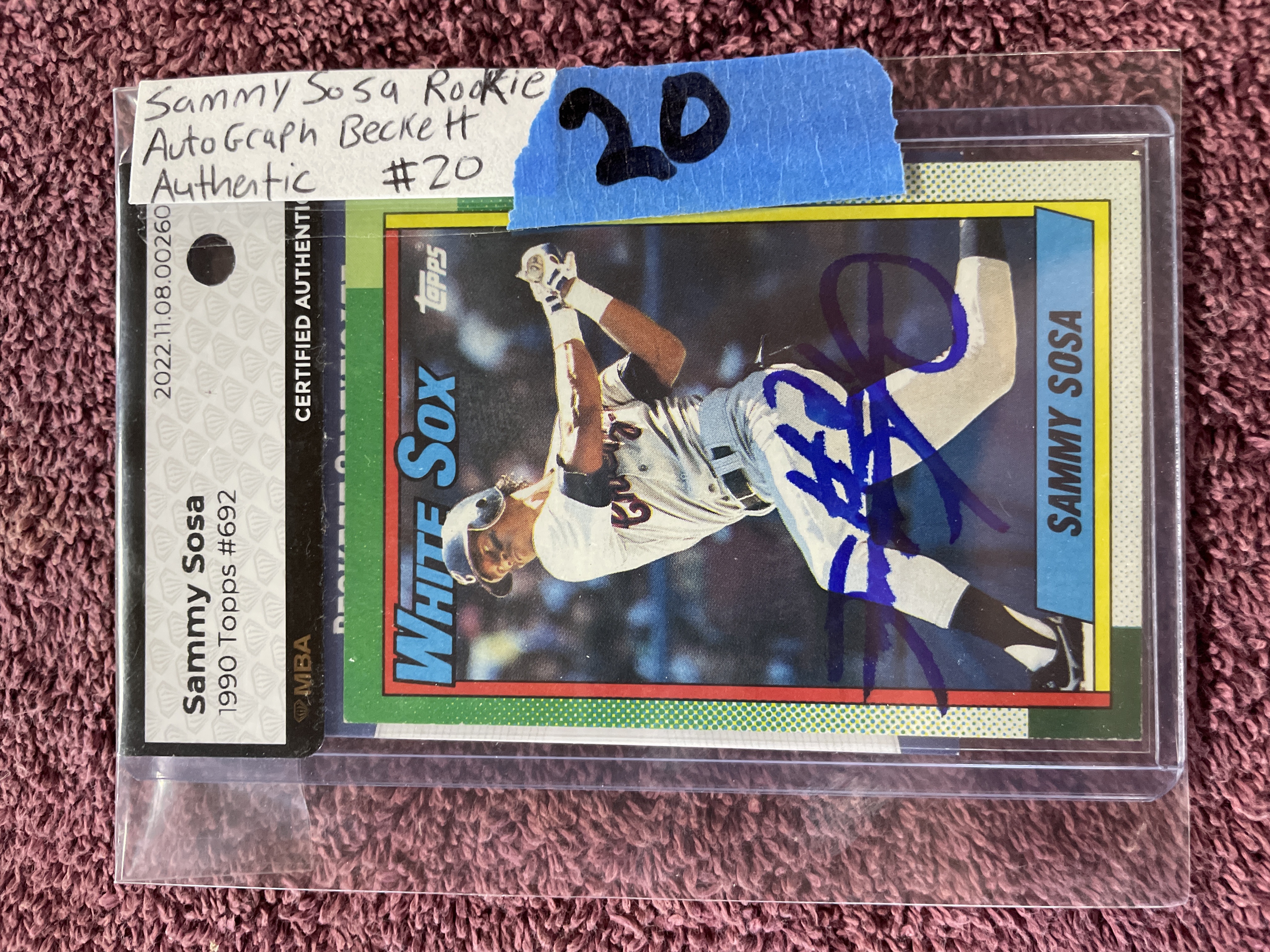 The item is a single autographed baseball trading card, identified as the 1990 Topps issue, card number 692, depicting player Sammy Sosa in a Chicago White Sox uniform. The card features a witnessed autograph signed in blue ink across the main image. The card is encased in a clear plastic protective holder. Authentication was provided by Beckett Authentication Services (BAS), evidenced by the included paperwork and security features. Visible BAS identifiers include an “MBA” security hologram, a QR code with Serial No. 2707285996, and the Witnessed Certification number WC1134 located on the card back. The card itself is marked E* ©1990 THE TOPPS COMPANY, INC. A piece of blue painter’s tape affixed to the protective holder is inscribed “SAMMY SOSA Rookie Auto Graph Beckett #20 Authentic” and marked “20.”
