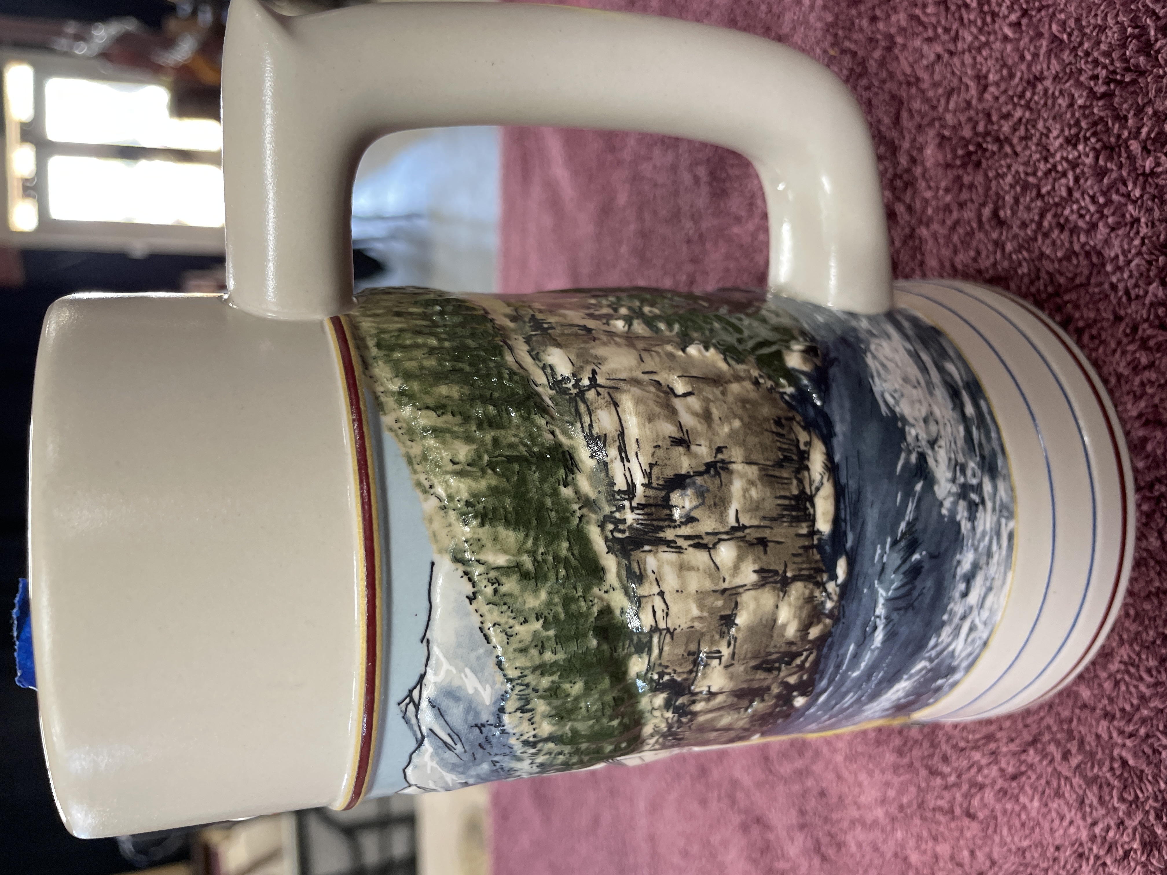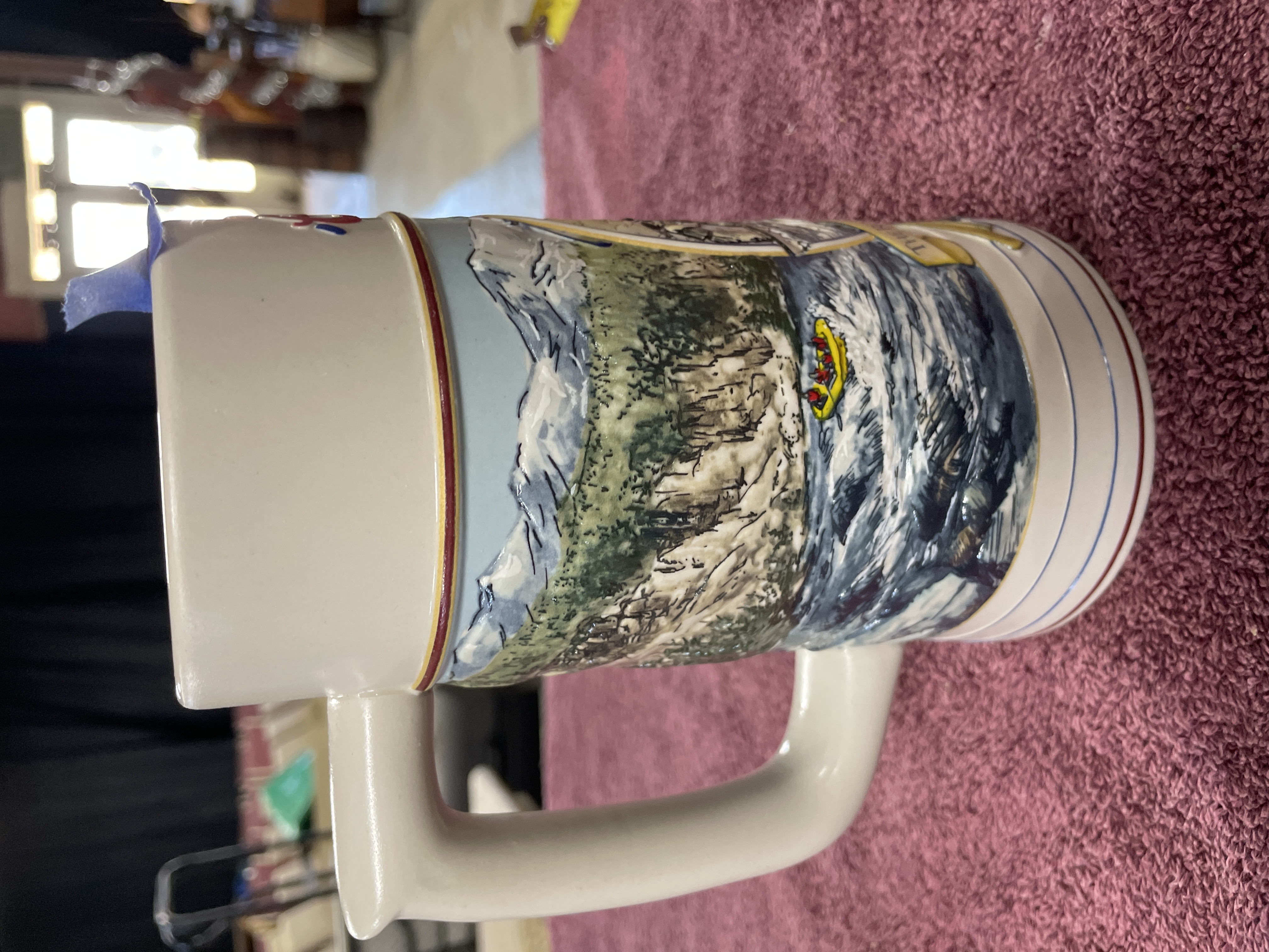 A single collectible beer stein from The Rocky Mountain Legend Series, produced for Coors Brewing Company. The stein is constructed of glazed stoneware in a cylindrical form with an applied handle. The body is decorated with a full-color decal transfer depicting a detailed mountain landscape and figures navigating river rapids in a central medallion. The upper band features the stylized text ORIGINAL Coors in red script. A lower banner reads THE ROCKY MOUNTAIN LEGEND. The base is marked THE ROCKY MOUNTAIN LEGEND SERIES, MADE IN BRAZIL for CUL, INC., and COORS BREWING COMPANY, GOLDEN, CO. The production date 19 92 is stamped on the base, along with the inventory number 128674 and an affixed barcode sticker.
