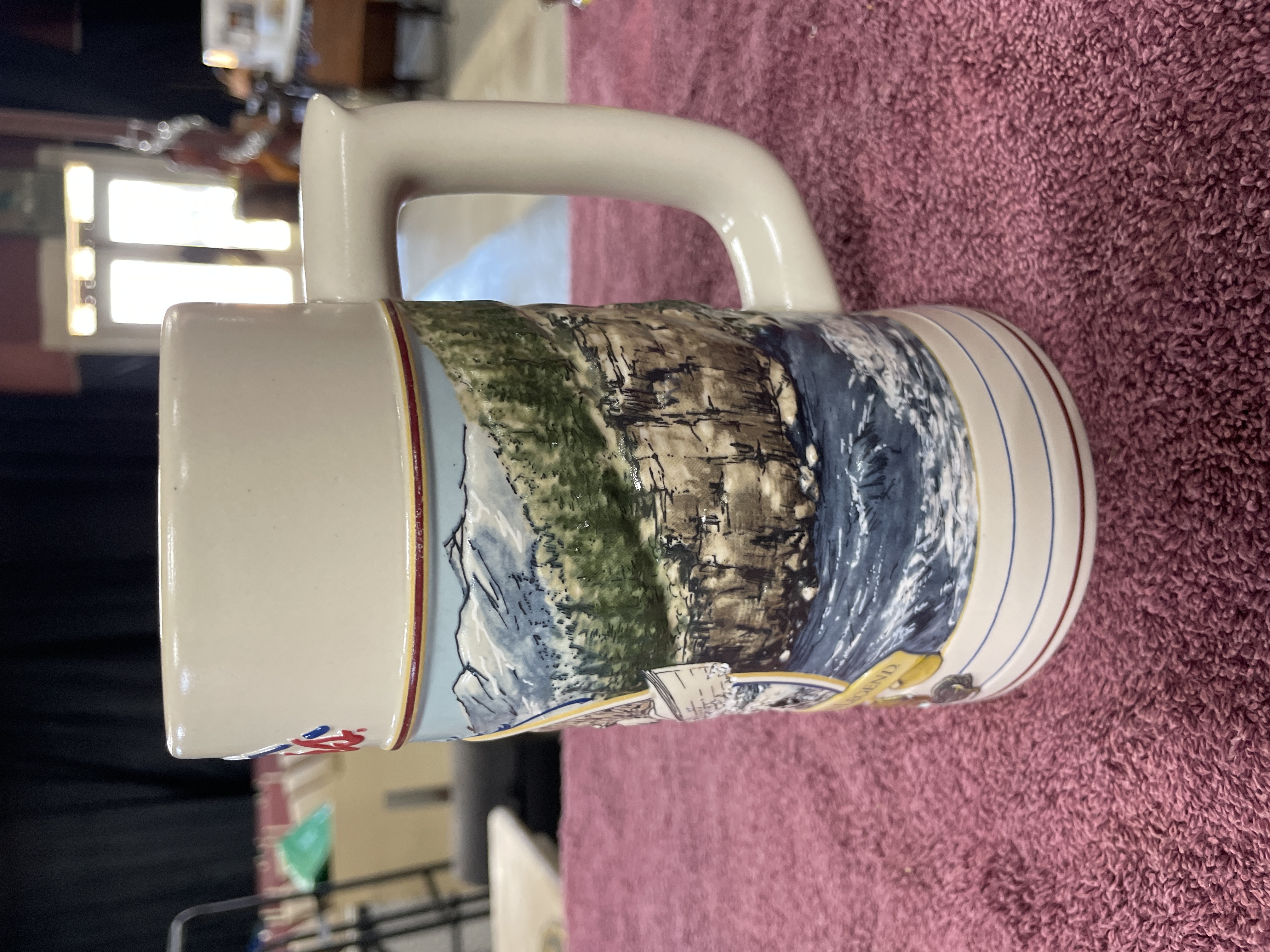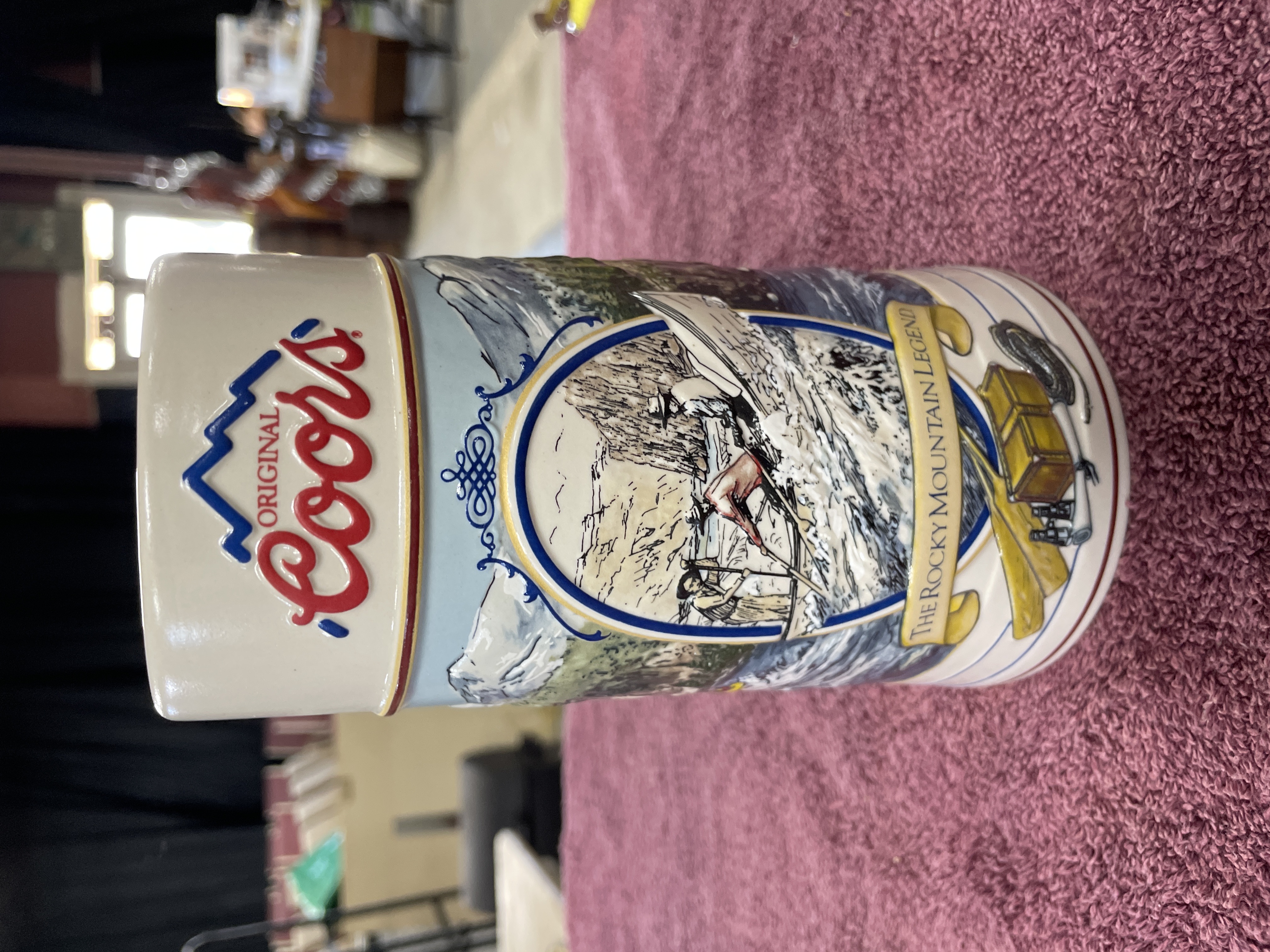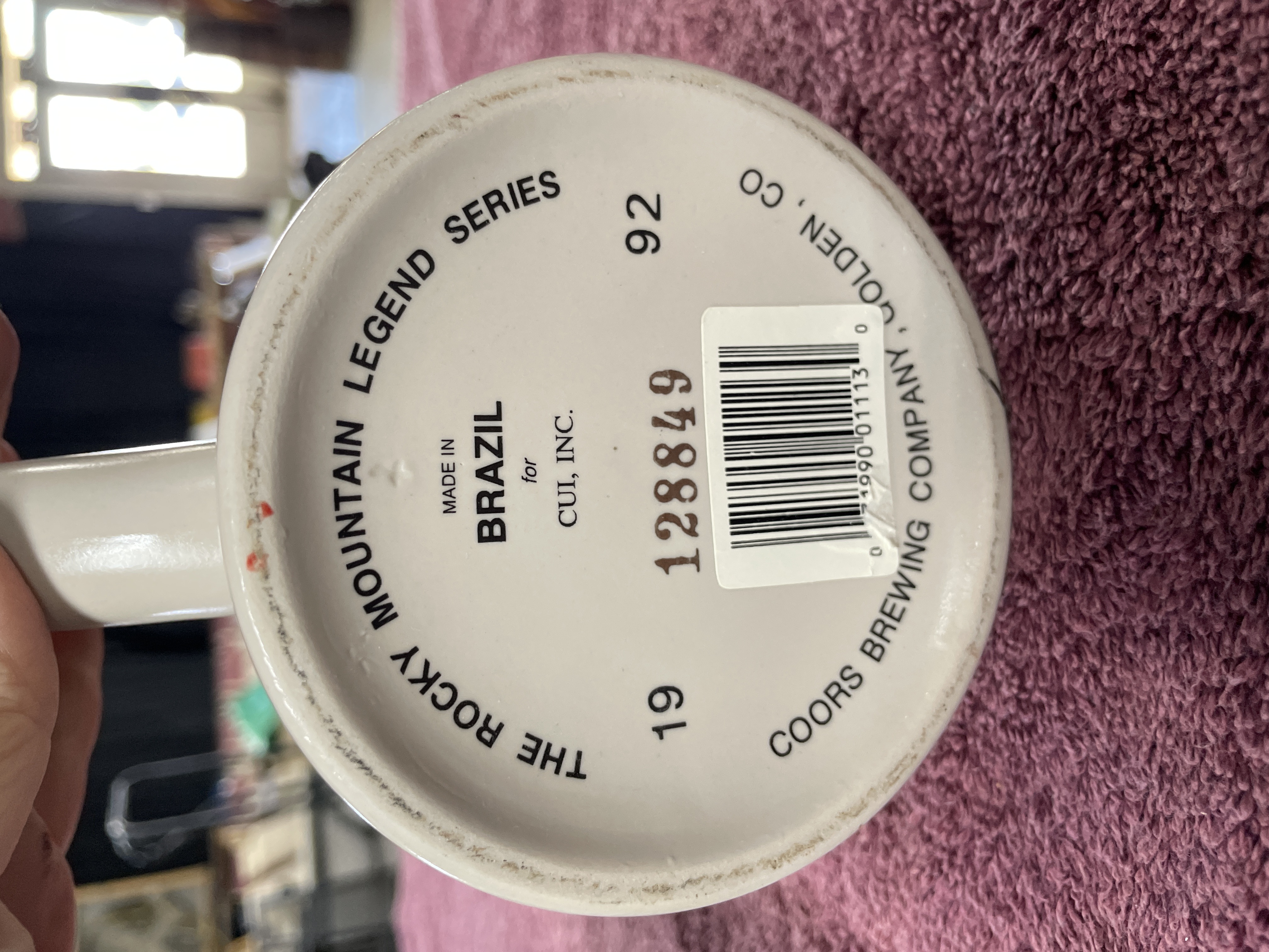 A single ceramic beer stein or tankard produced for the Coors Brewing Company as part of “THE ROCKY MOUNTAIN LEGEND SERIES.” The stein features a white glazed body and a heavy, multi-colored molded relief decoration depicting a dynamic Rocky Mountain scene, including river rapids and figures engaged in outdoor recreation. The upper register displays the “Original Coors” logo. The exterior body text reads “The Rocky Mountain Legend.” The base is stamped with manufacturer information: “THE ROCKY MOUNTAIN LEGEND SERIES, ” “MADE IN BRAZIL for CUI, INC., ” and “COORS BREWING COMPANY, GOLDEN, CO.” Date indicators “19” and “92” suggest a 1992 manufacture date. The base also features the hand-painted number “128849” and an affixed barcode sticker.