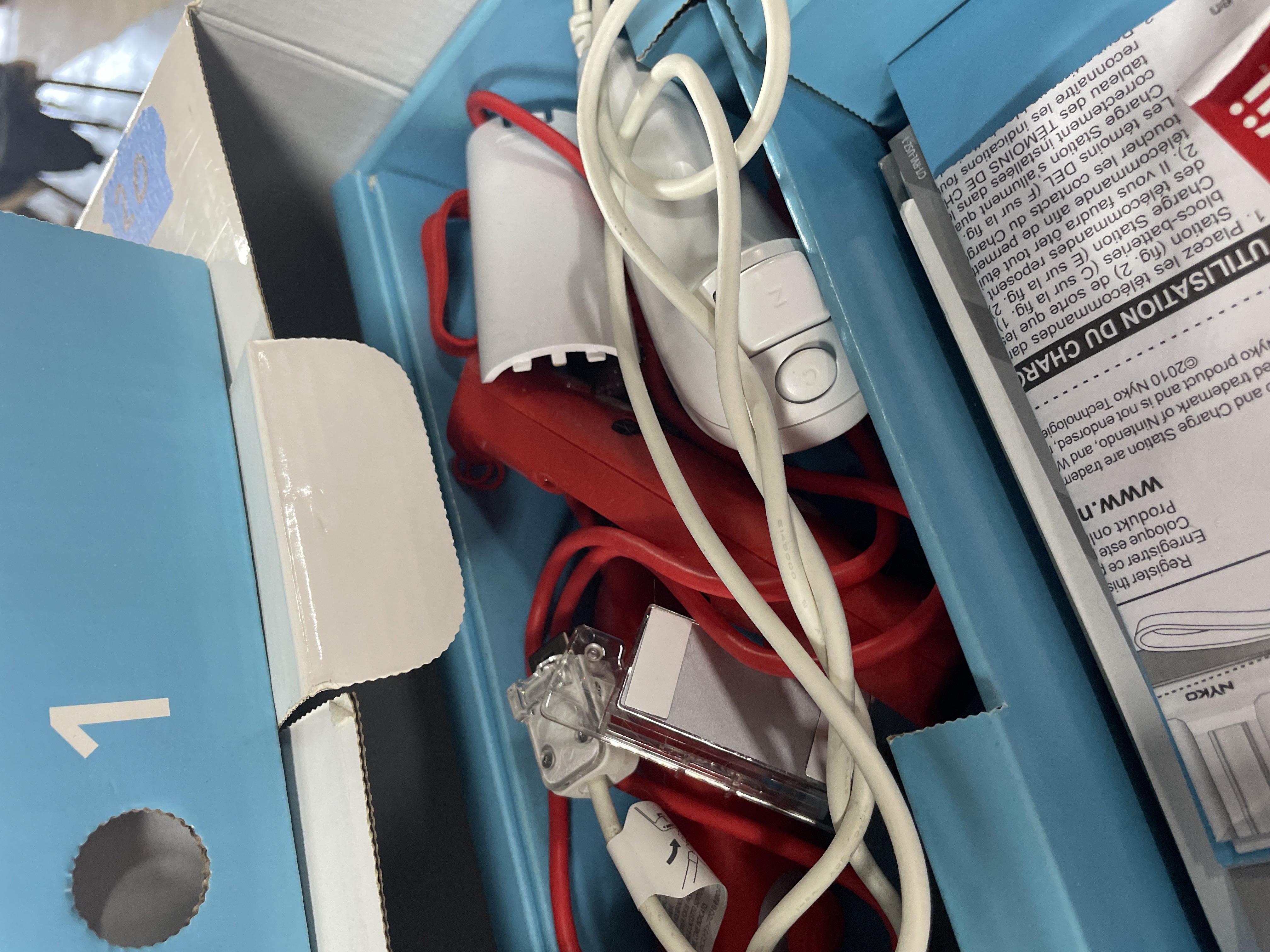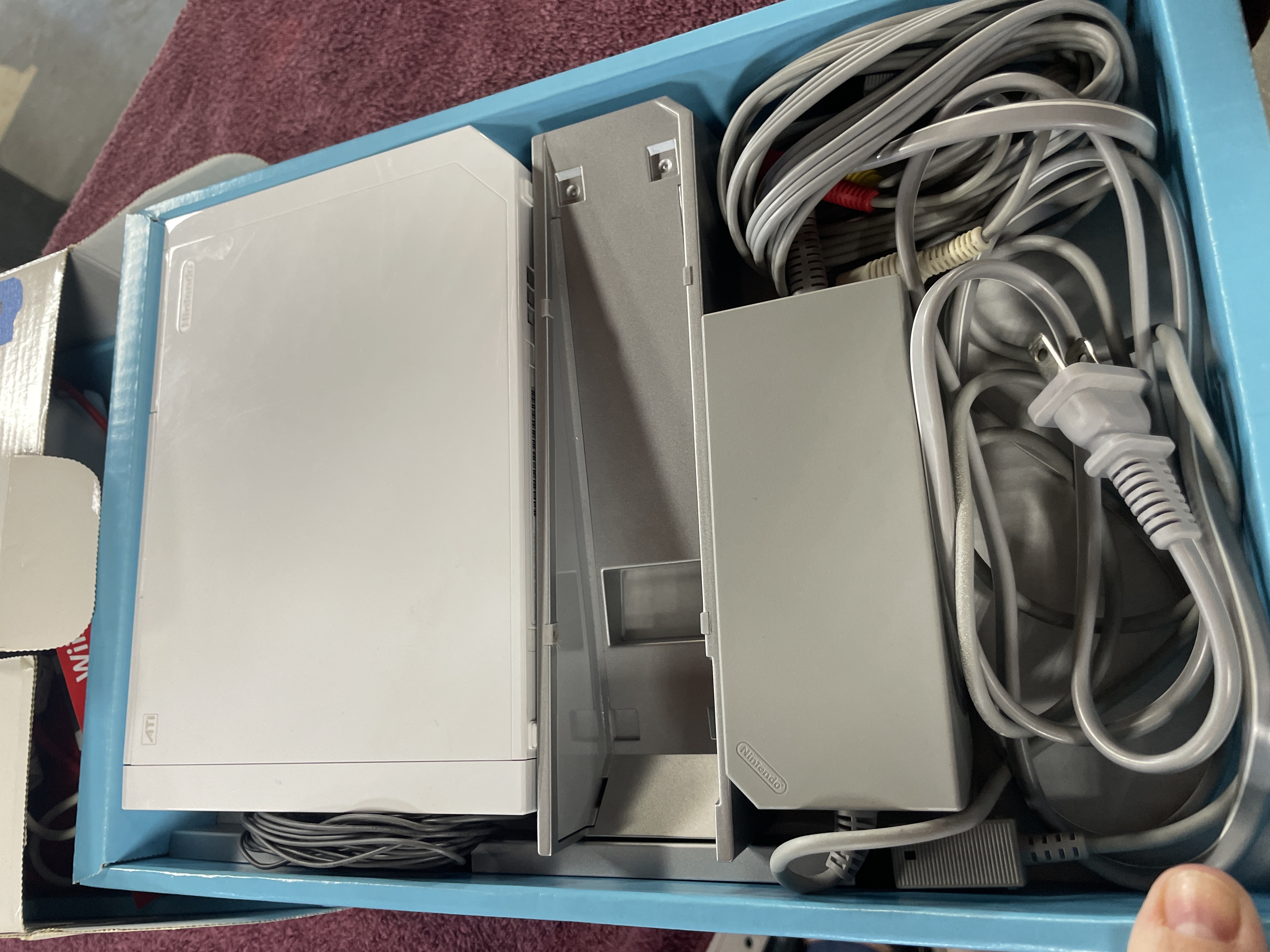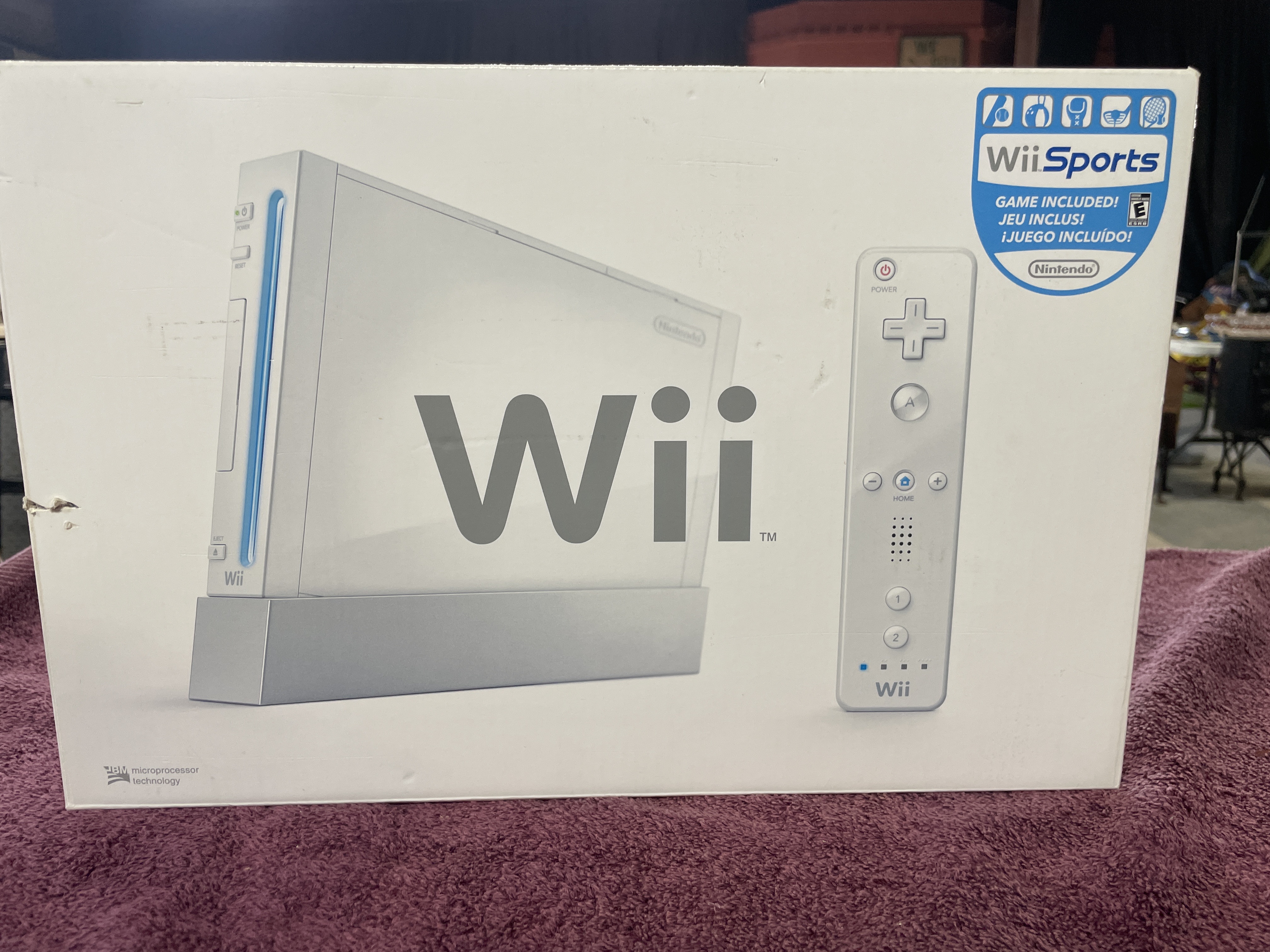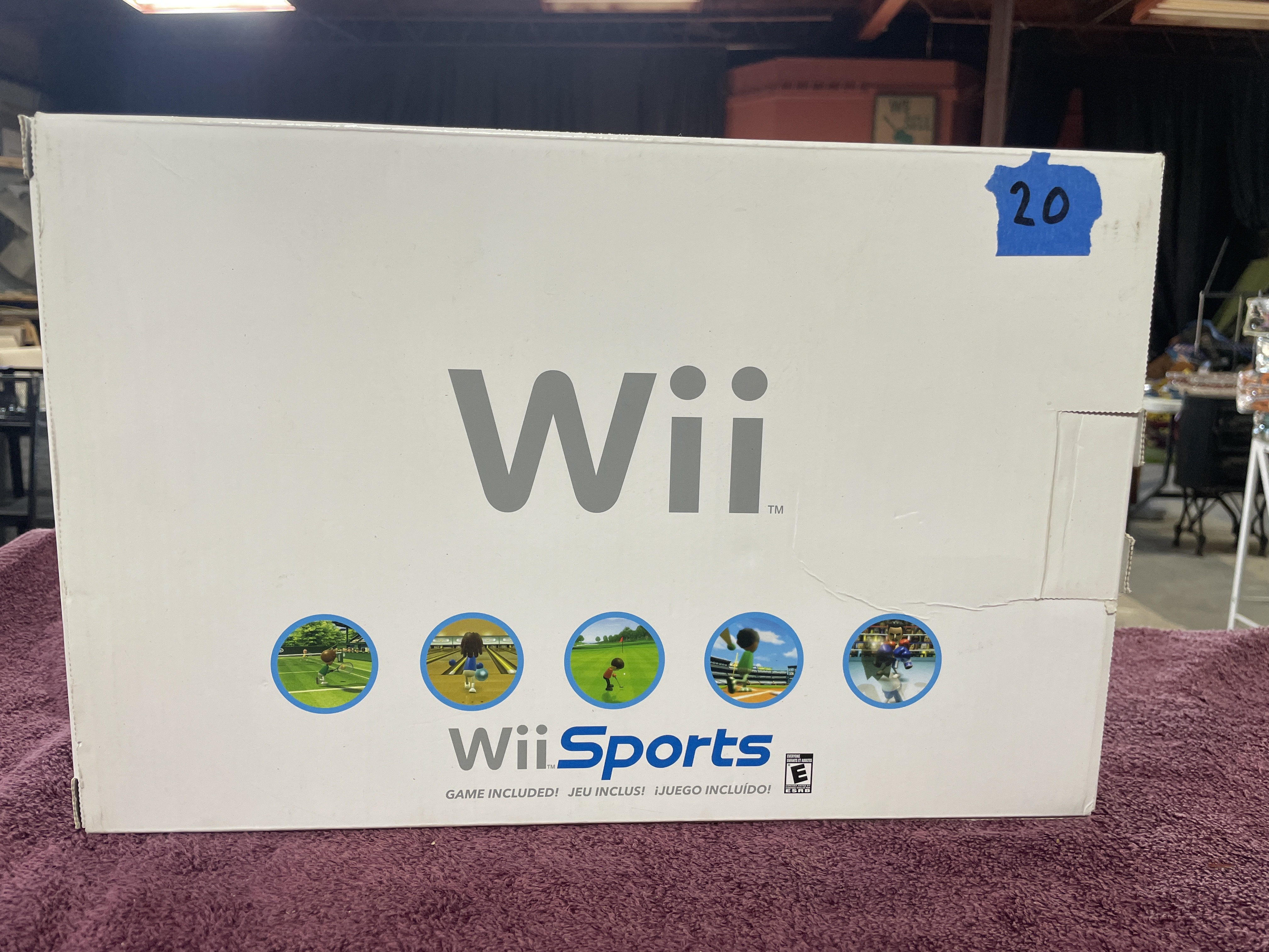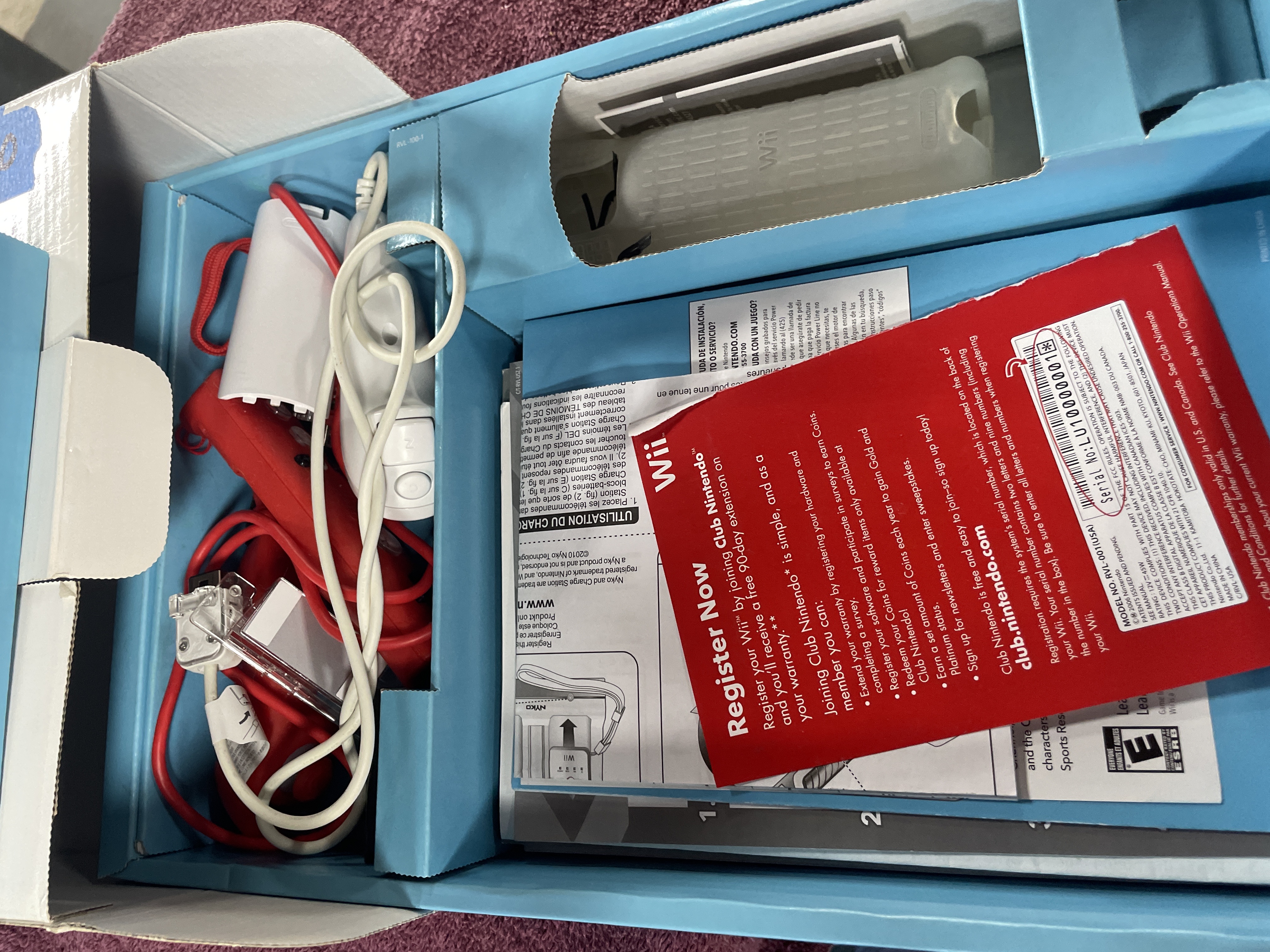 A complete-in-box Nintendo Wii video game console bundle, identified as the Wii Sports edition, manufactured by Nintendo. The system is housed in its original white and gray retail packaging, marked with the Wii logo, the ESRB “E” rating, and the multilingual text “GAME INCLUDED! JEU INCLUS! ¡JUEGO INCLUIDO!”. Documentation includes a red Club Nintendo card listing the model number RVL-001(USA) and a sample serial number LU10000018. The interior blue cardboard insert organizes the system components, which include the white Wii console unit, a gray console stand, one white Wii Remote controller paired with a Nunchuk accessory (fitted with a red silicone sleeve and red wrist strap), a white Sensor Bar, the gray power supply/AC adapter, a gray RCA AV cable, and the substantial stack of original documentation. The system is packaged as a complete retail set, including the implied Wii Sports game.