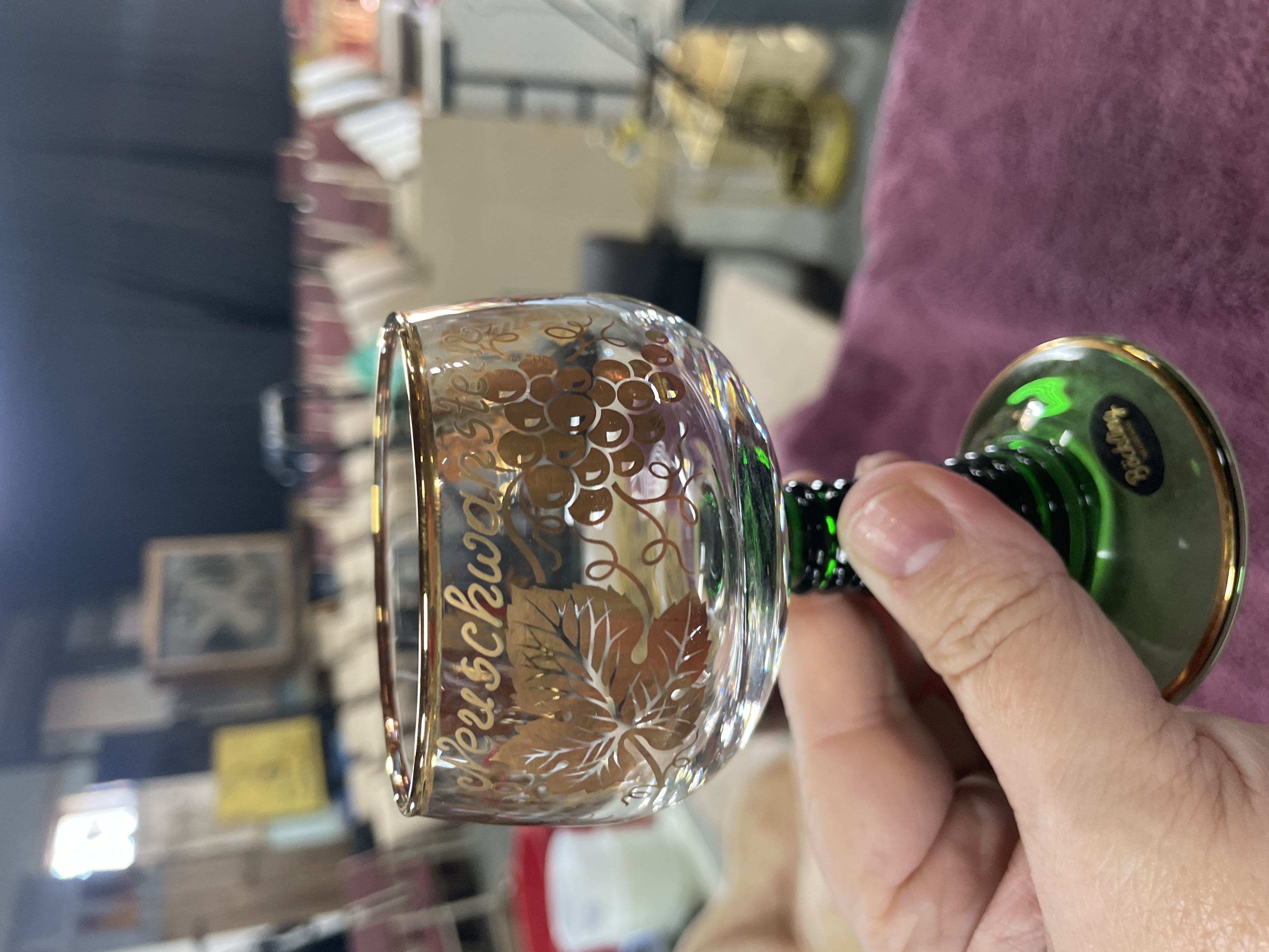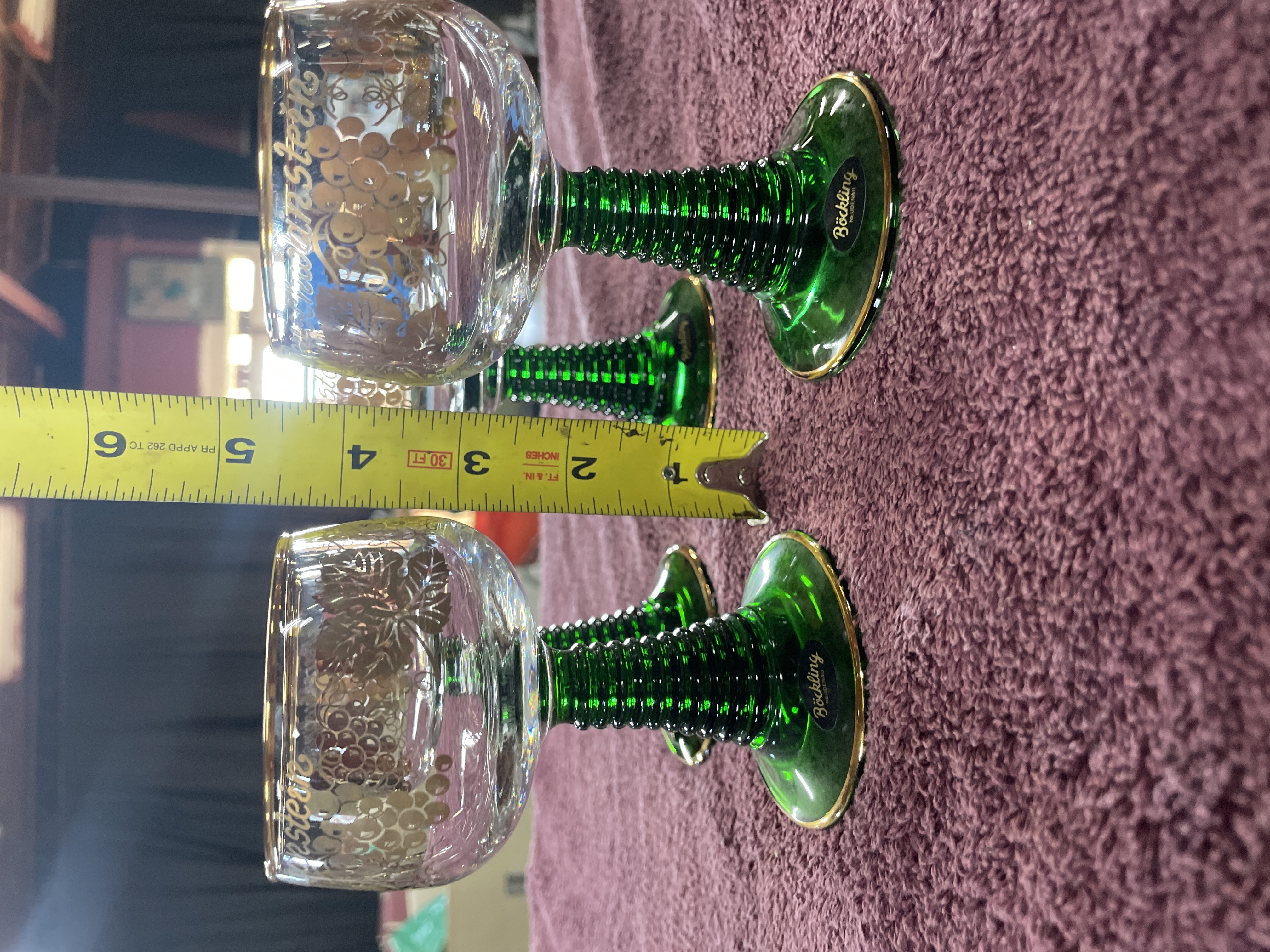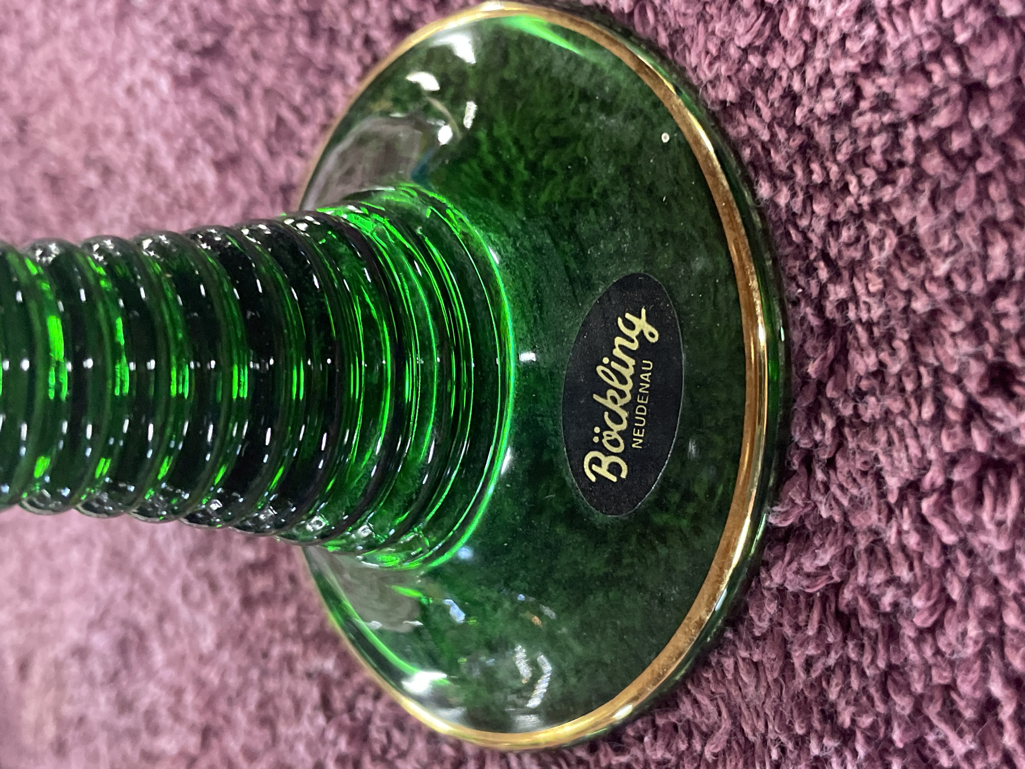 A collection of four matching Roemer-style wine glasses attributed to Böckling of Neudenau, Germany. Each glass features a clear bowl and a dark emerald green stemmed base. The stem is constructed with a distinctive ribbed or knopped design, characteristic of the Roemer style. The foot is circular and bordered in gilt. The clear bowl is decorated with extensive gilt enamel or transfer detailing depicting grape clusters and leaves, capped by a gilt rim. Visible gilt script text on the bowl reads "Deutschweinmeister." The foot of each glass retains the original manufacturer’s sticker reading "Böckling NEUDENAU."