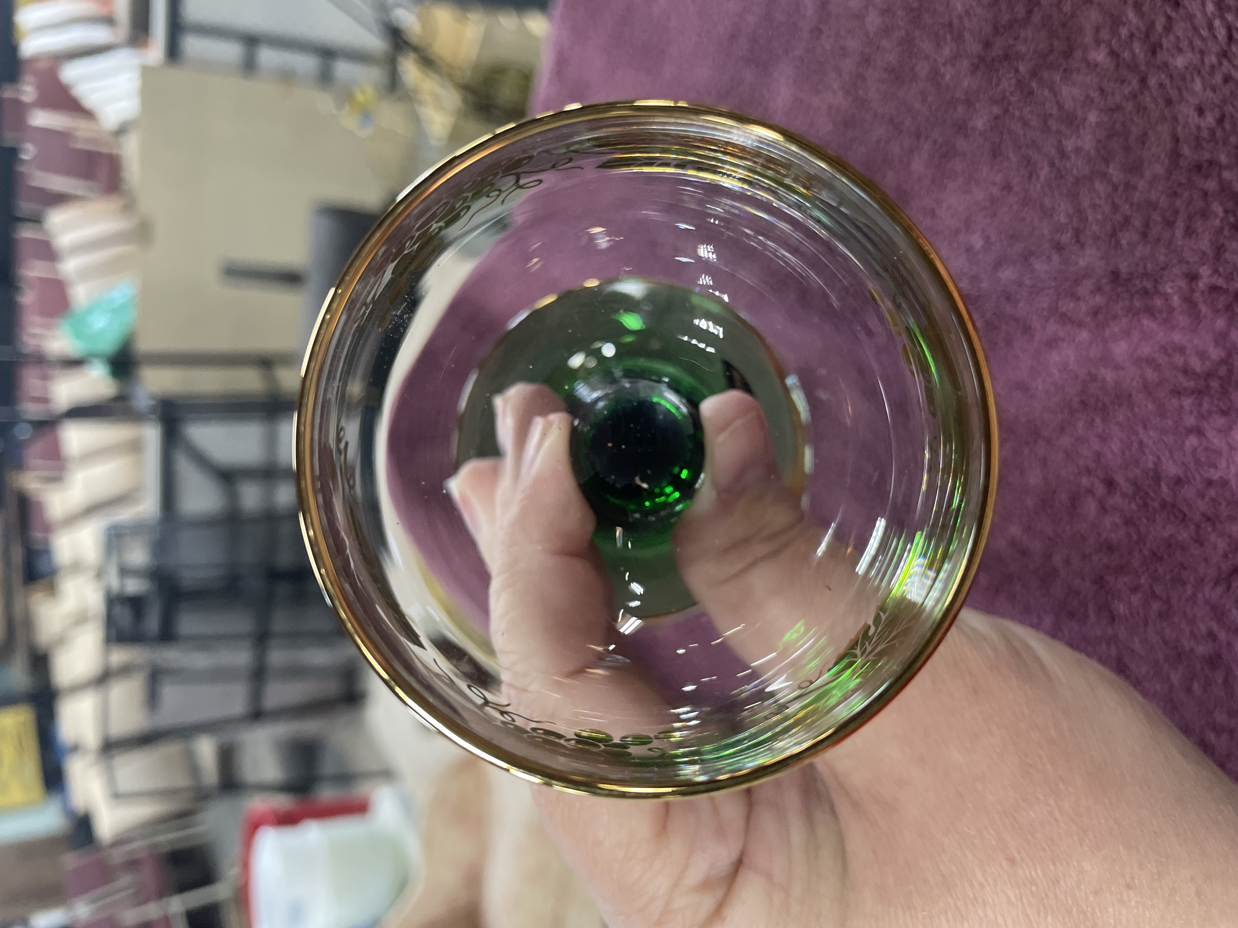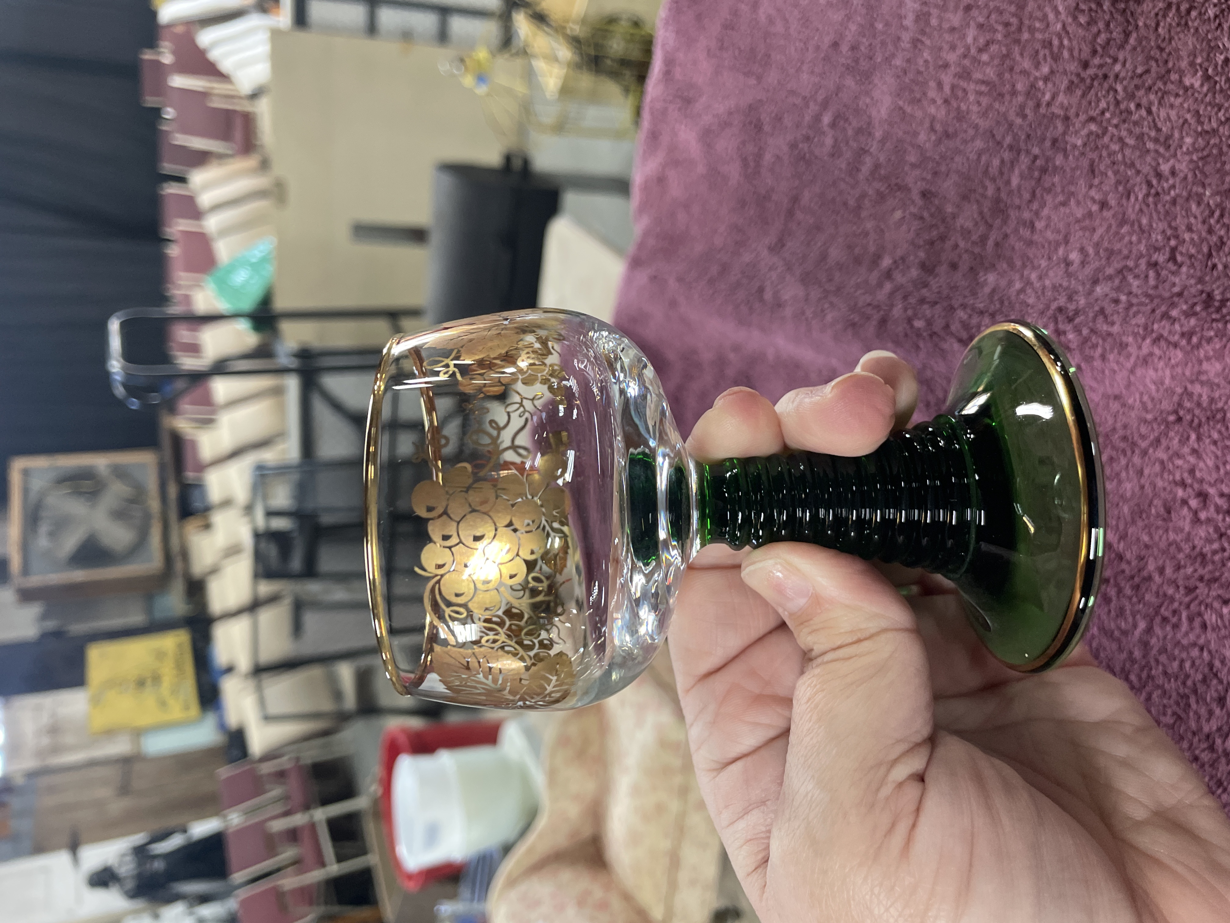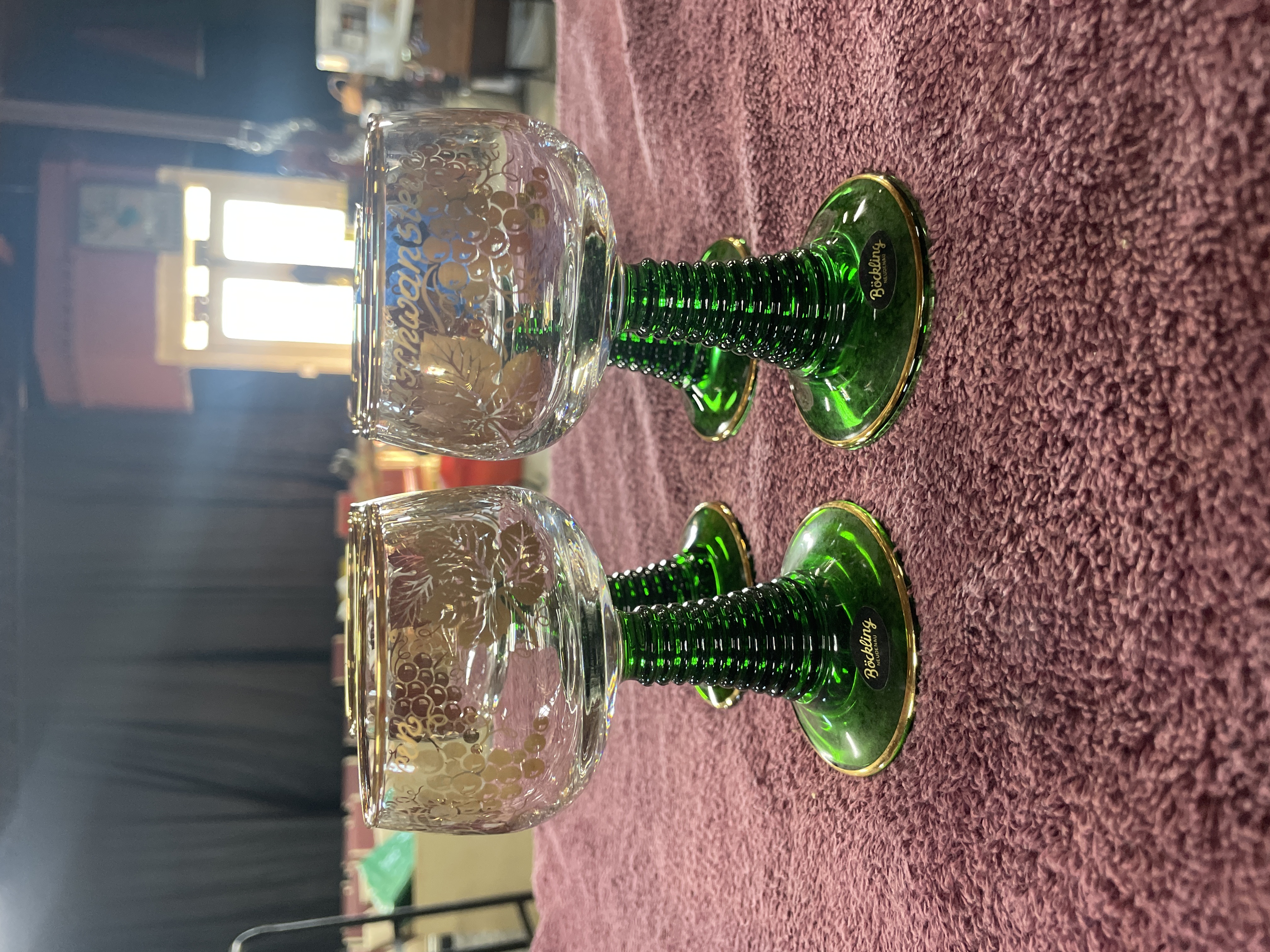 A collection of four matching Roemer-style wine glasses attributed to Böckling of Neudenau, Germany. Each glass features a clear bowl and a dark emerald green stemmed base. The stem is constructed with a distinctive ribbed or knopped design, characteristic of the Roemer style. The foot is circular and bordered in gilt. The clear bowl is decorated with extensive gilt enamel or transfer detailing depicting grape clusters and leaves, capped by a gilt rim. Visible gilt script text on the bowl reads "Deutschweinmeister." The foot of each glass retains the original manufacturer’s sticker reading "Böckling NEUDENAU."