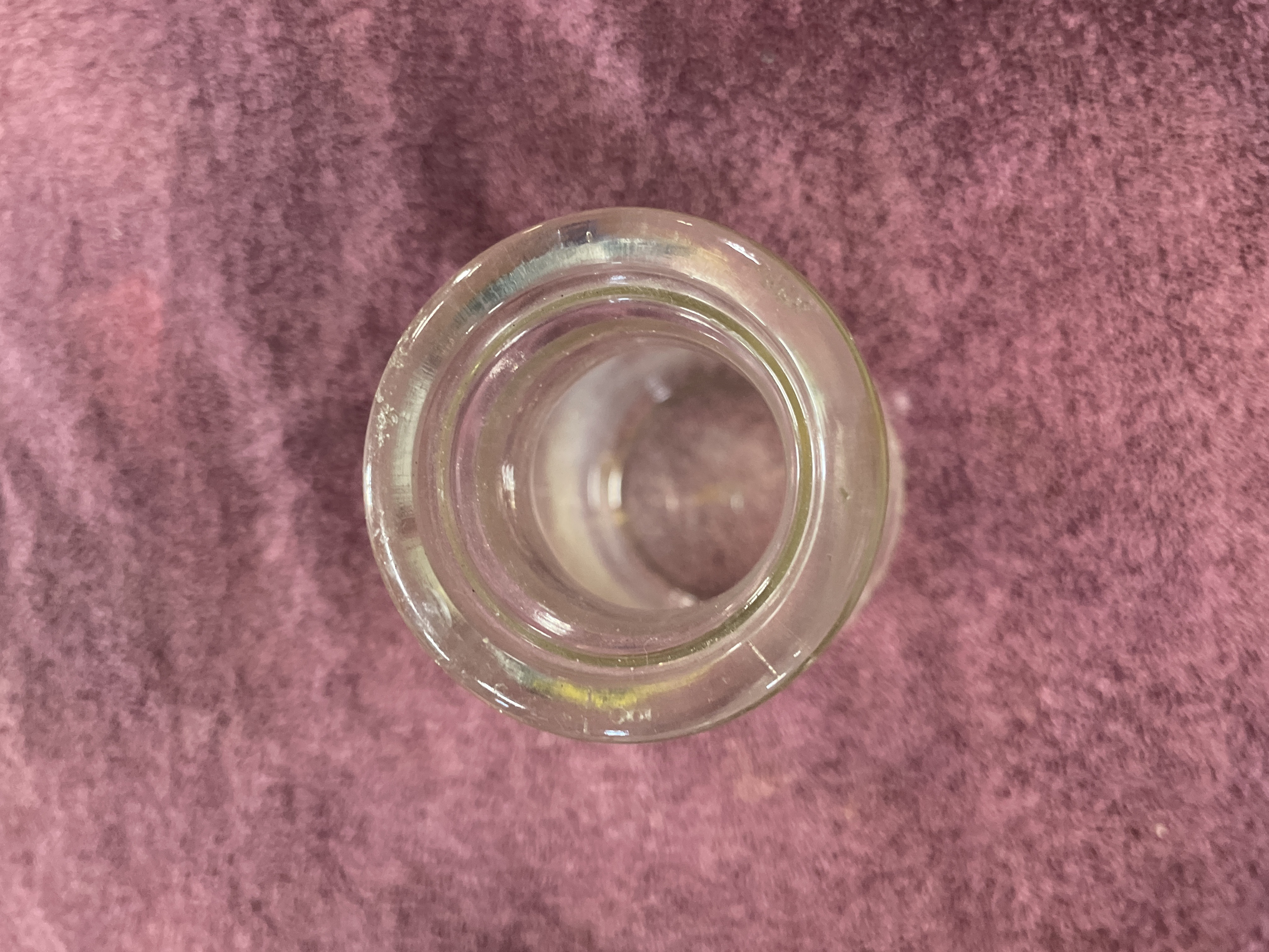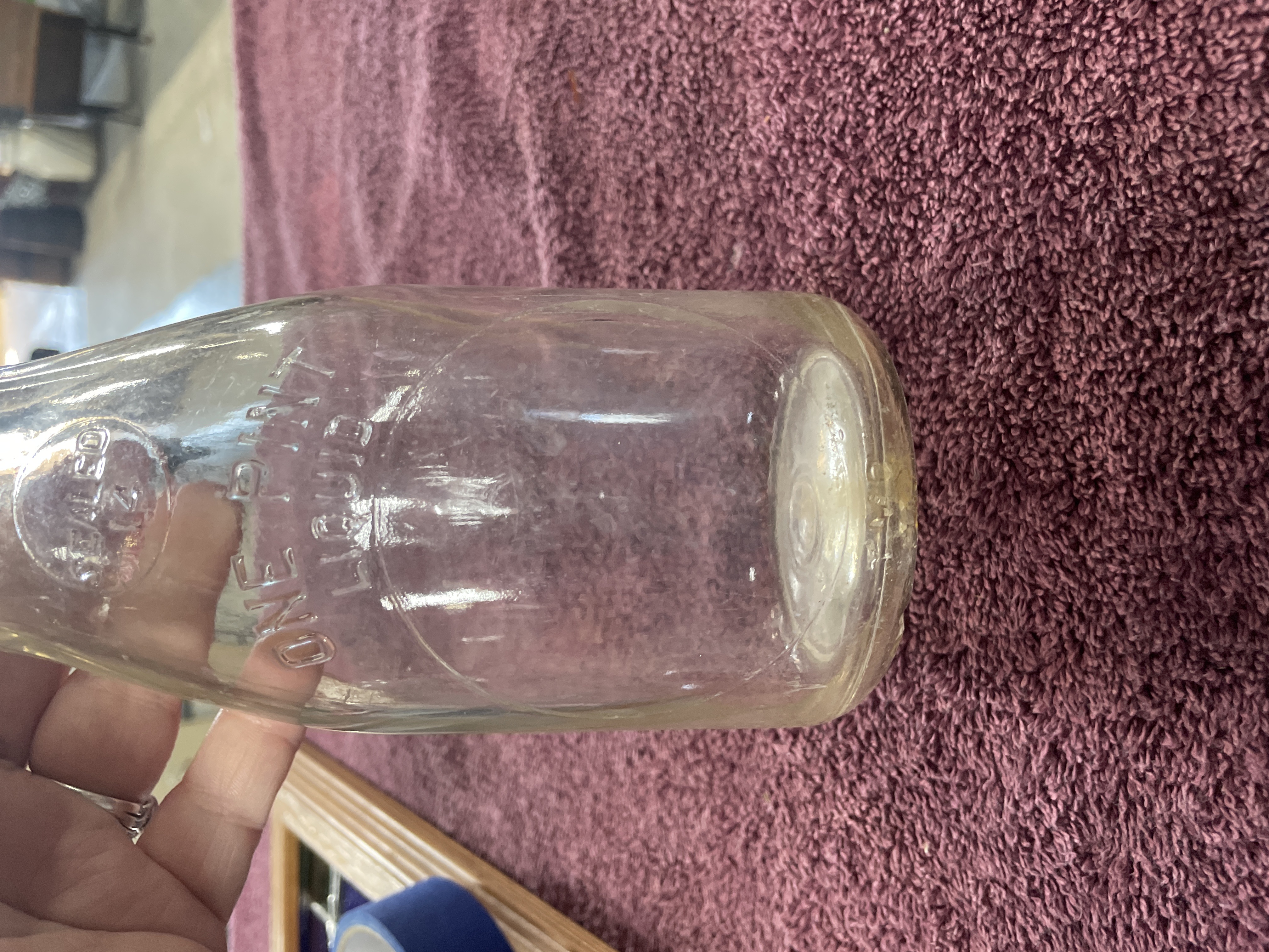 A single vintage clear glass milk bottle of standard dairy design. The vessel features heavy embossing across the body indicating the capacity as ONE PINT LIQUID. Near the neck, an official measurement seal is prominently marked with SEALED 14 within a circular cartouche. Additional manufacturer marks, T M C, are visible embossed near the base or heel. The bottle features a wide lip designed for a cap closure.