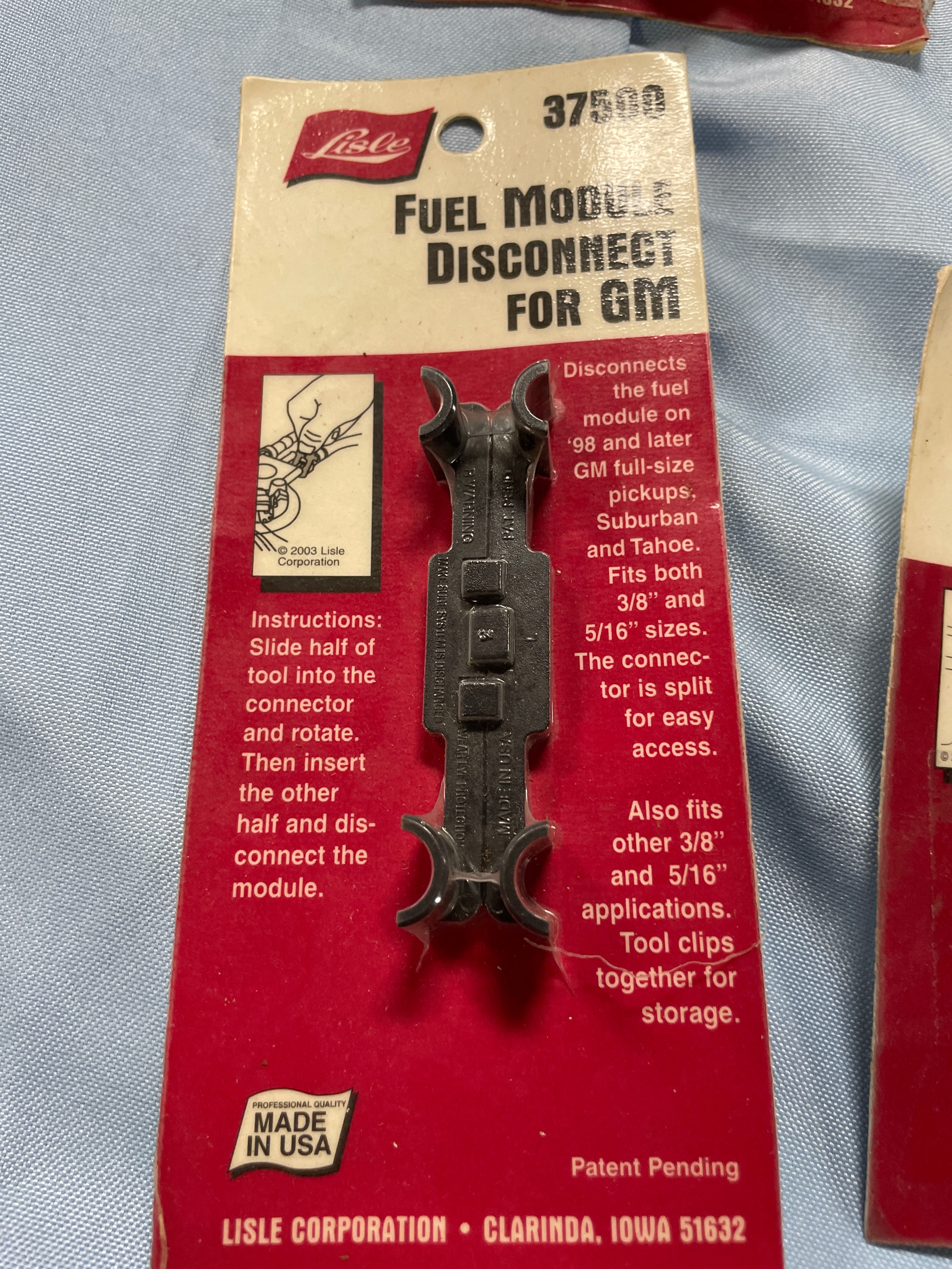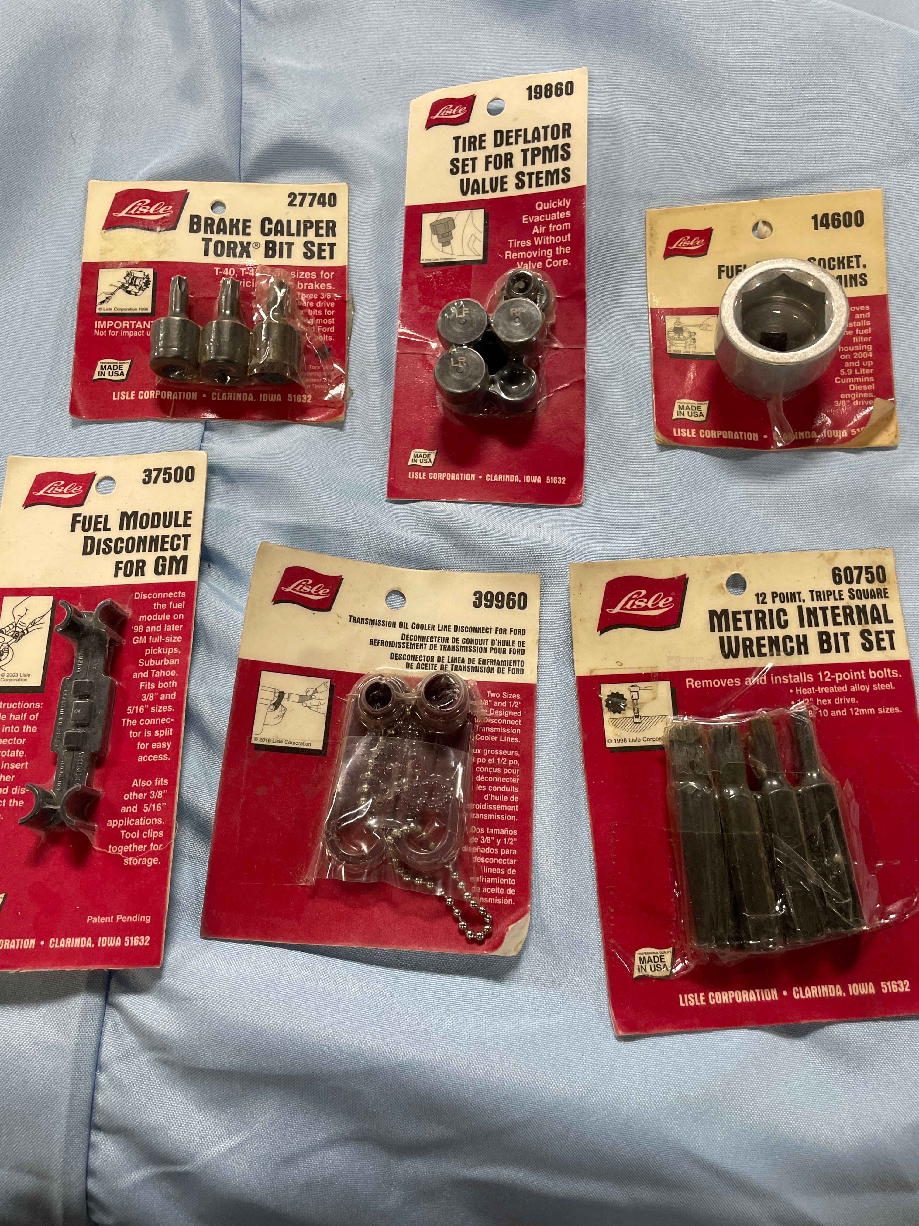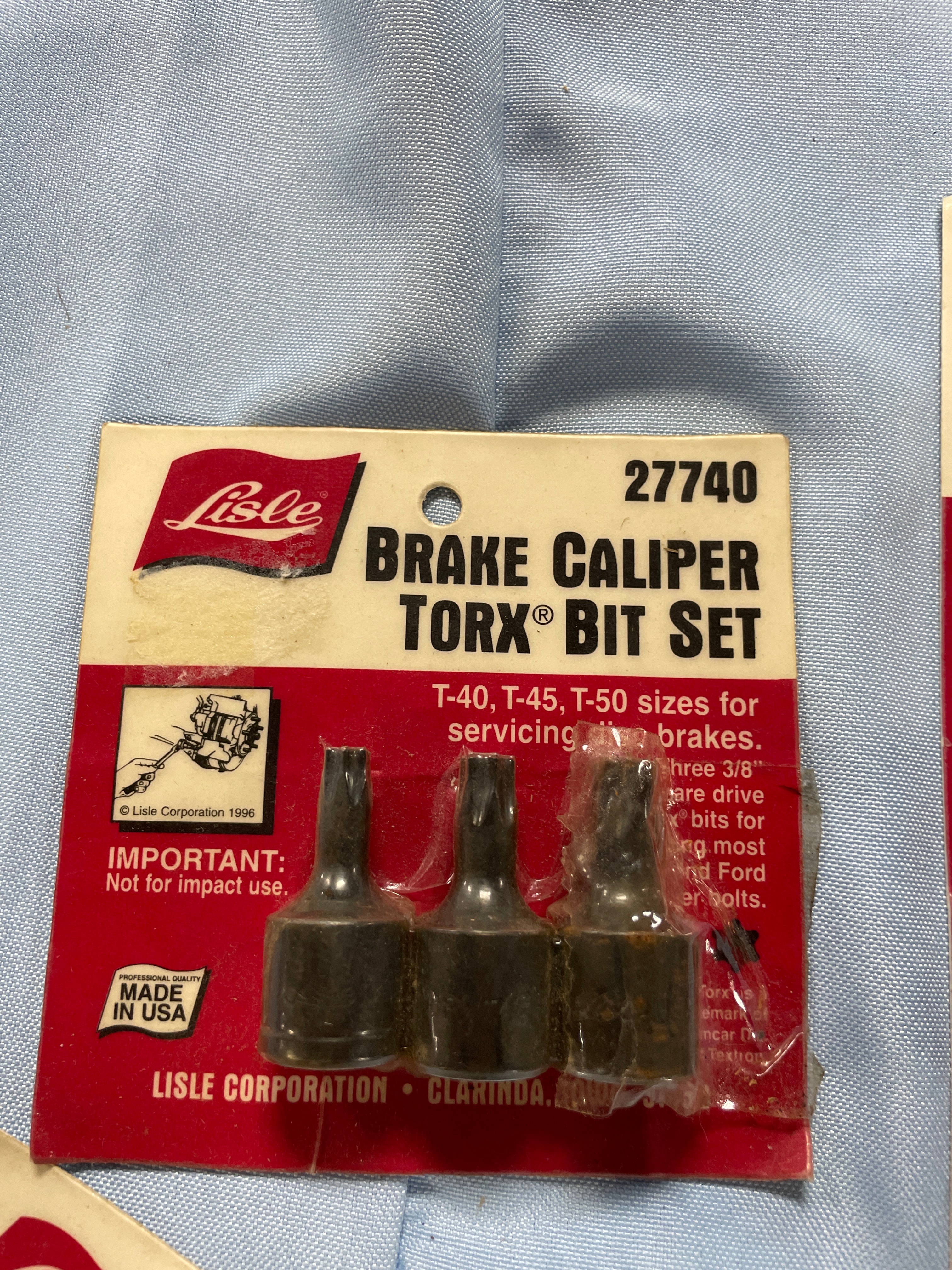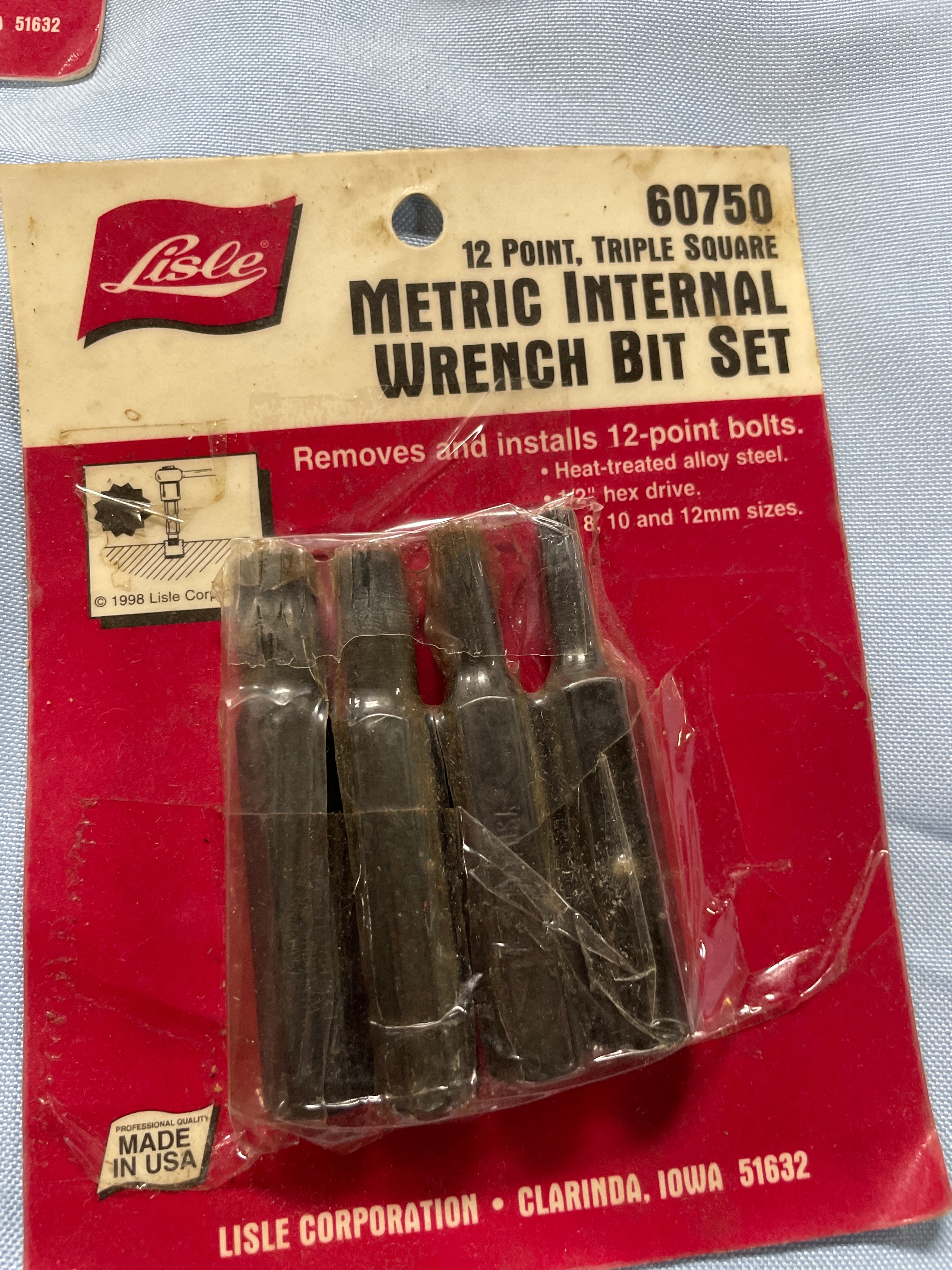 Four black Lisle 12 Point, Triple Square Metric Internal Wrench Bit Set tools, in 8, 10, and 12mm sizes for a 3/8″ hex drive, with “PROFESSIONAL QUALITY MADE IN USA” packaging dated 1998.