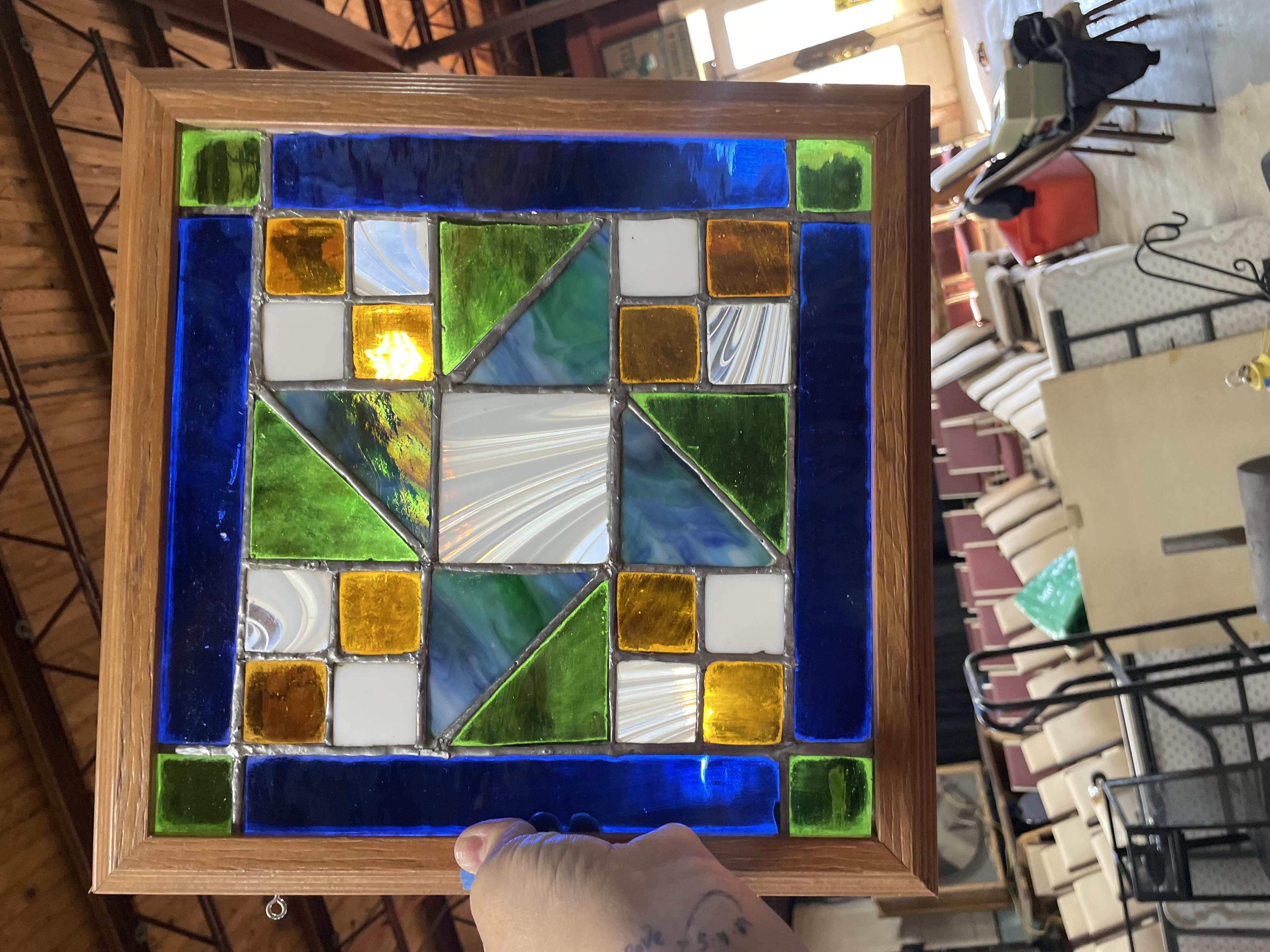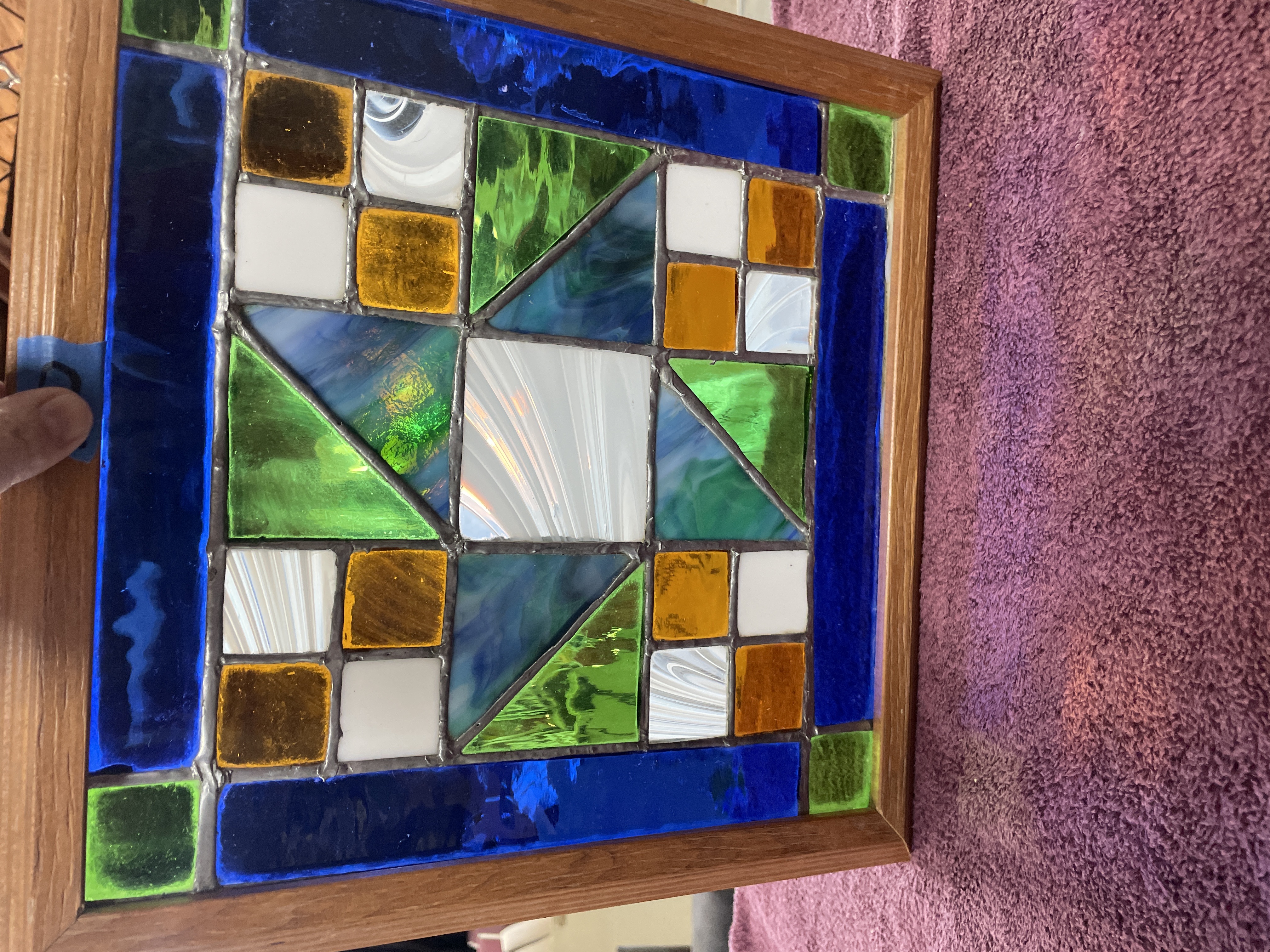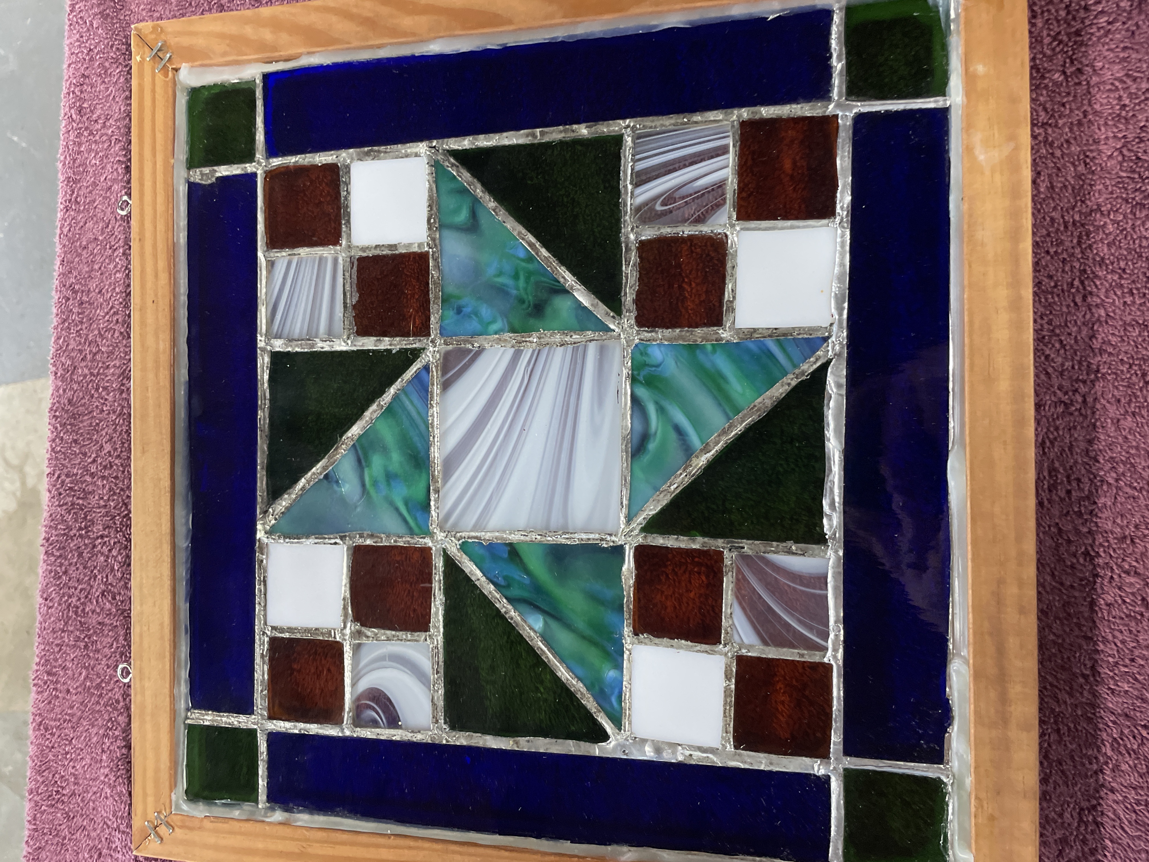 A single framed stained glass panel constructed using the copper foil (Tiffany) technique. The design is abstract and geometric, featuring a complex pattern of triangular and square glass pieces. The composition is defined by borders of deep cobalt blue and dark green glass. The central motif utilizes variegated opalescent glass (streaky white, blue, and teal), solid white squares, bright green triangles, and squares of translucent amber and deep reddish-brown glass. The glass surfaces exhibit varied textures, joined by visibly thick silver solder lines. The panel is housed within a light-toned natural wood frame and is fitted with two metal hanging loops for display.