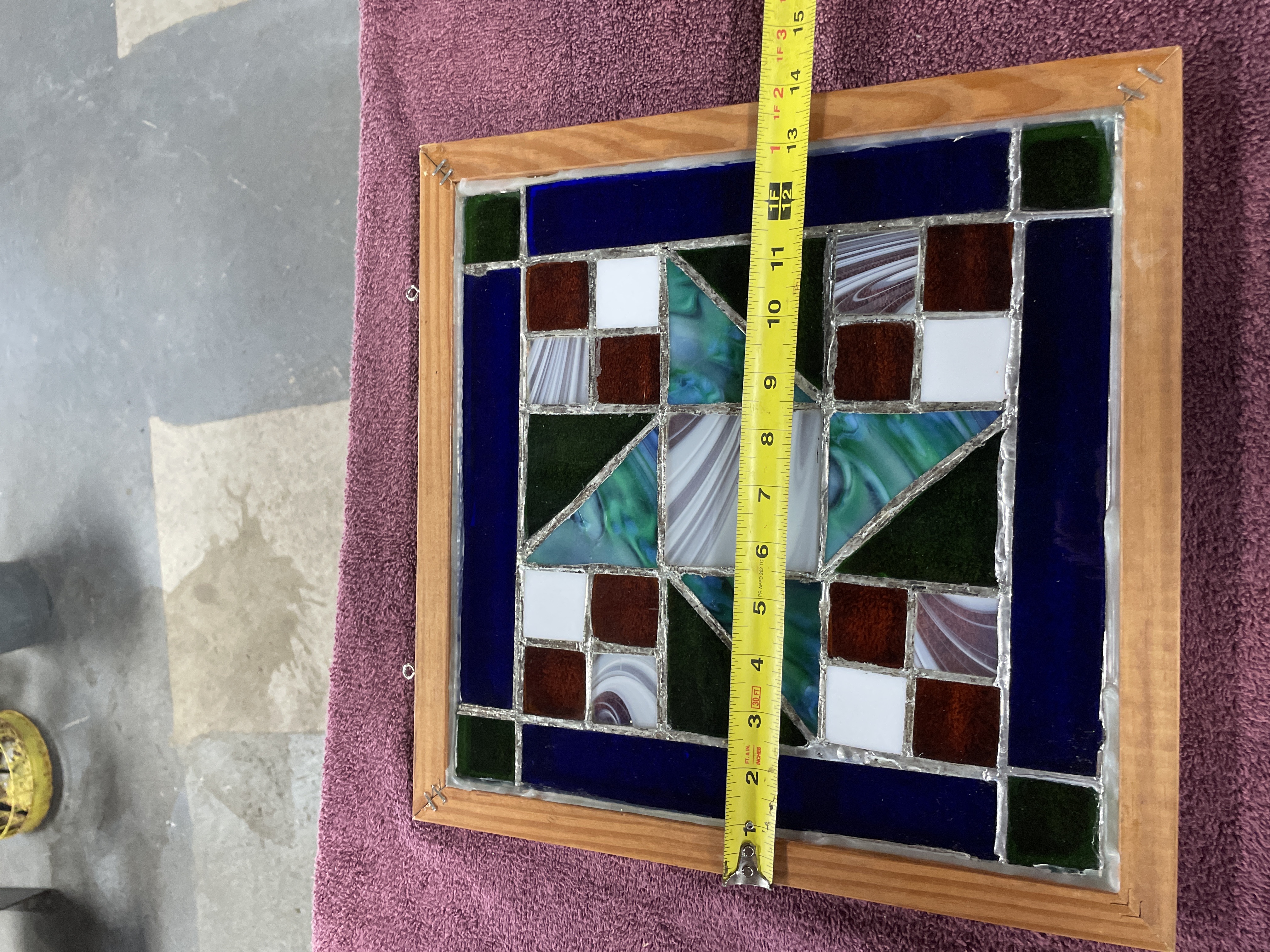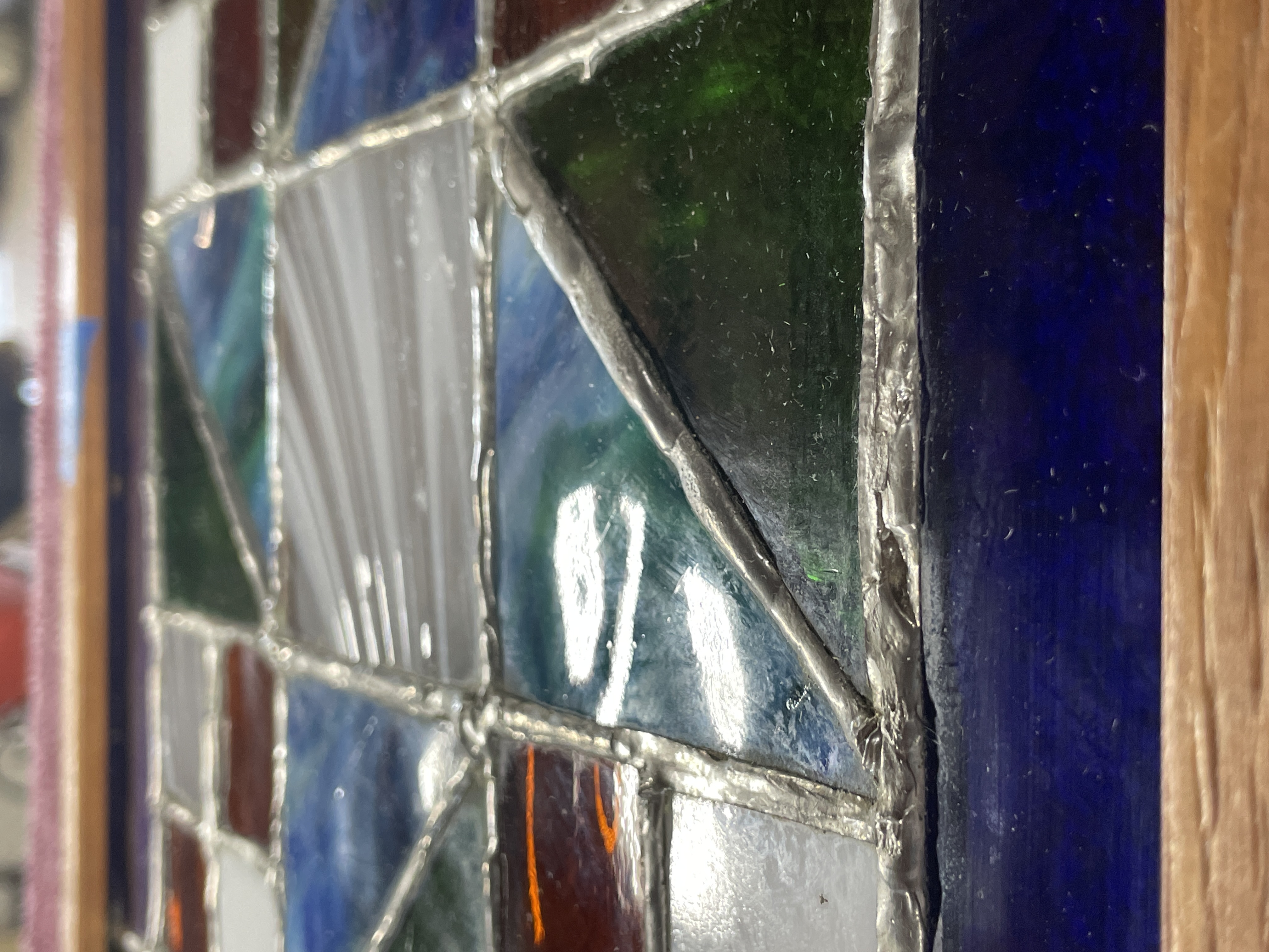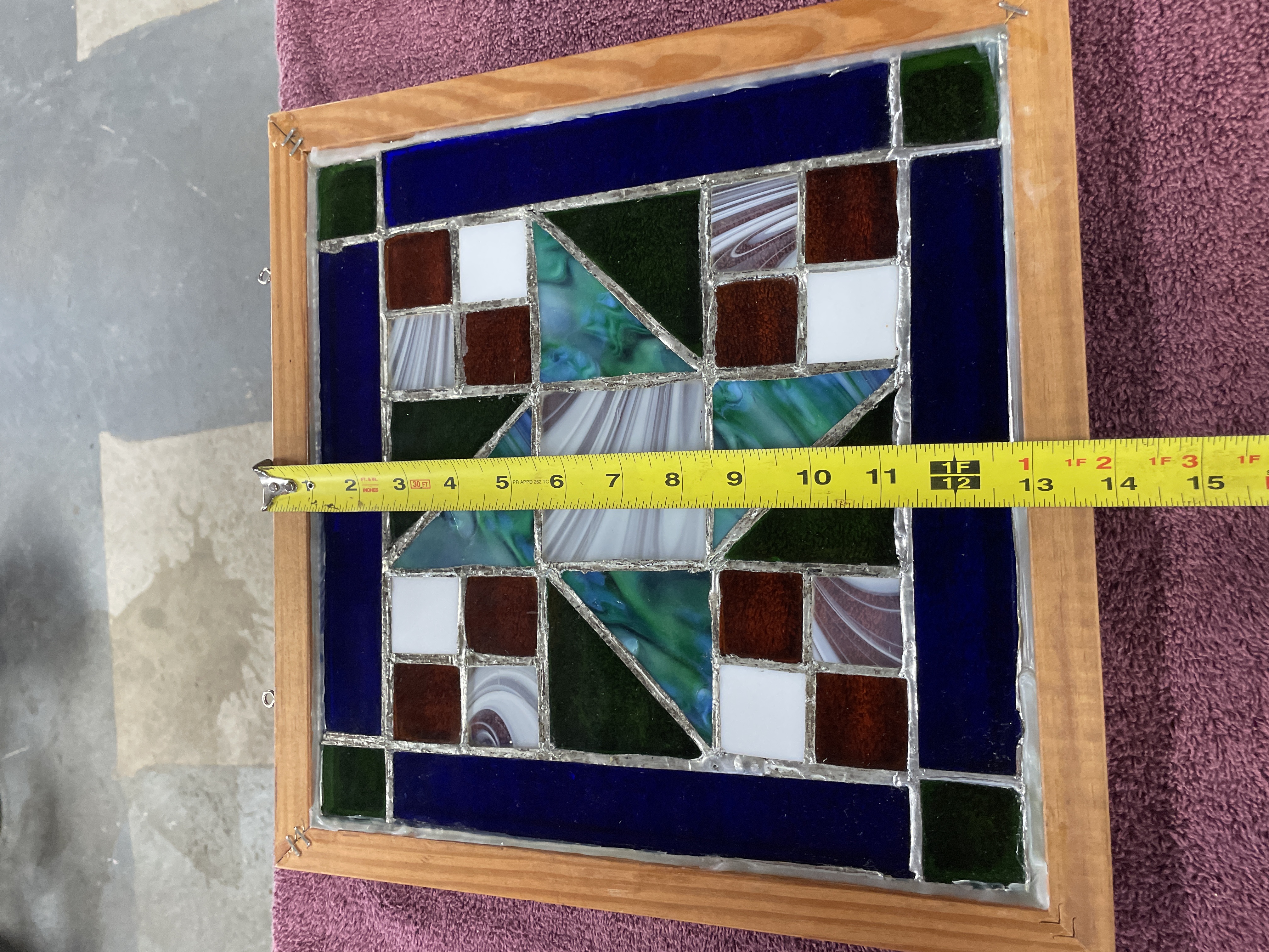 A single framed stained glass panel constructed using the copper foil (Tiffany) technique. The design is abstract and geometric, featuring a complex pattern of triangular and square glass pieces. The composition is defined by borders of deep cobalt blue and dark green glass. The central motif utilizes variegated opalescent glass (streaky white, blue, and teal), solid white squares, bright green triangles, and squares of translucent amber and deep reddish-brown glass. The glass surfaces exhibit varied textures, joined by visibly thick silver solder lines. The panel is housed within a light-toned natural wood frame and is fitted with two metal hanging loops for display.